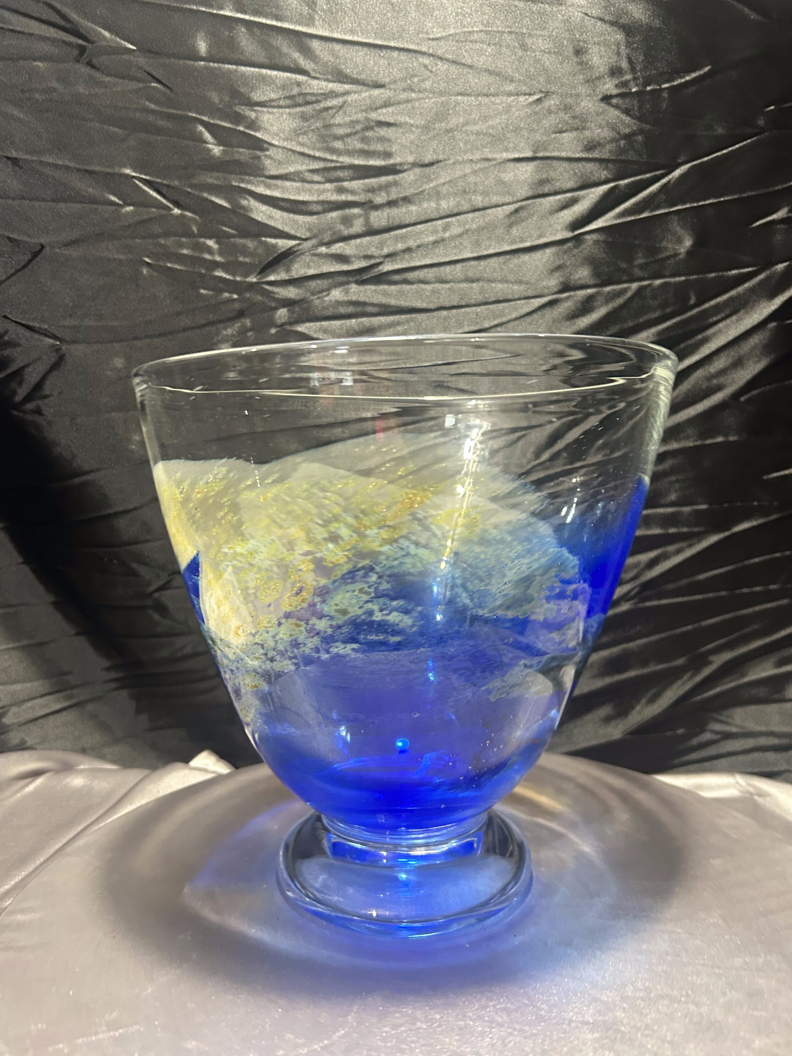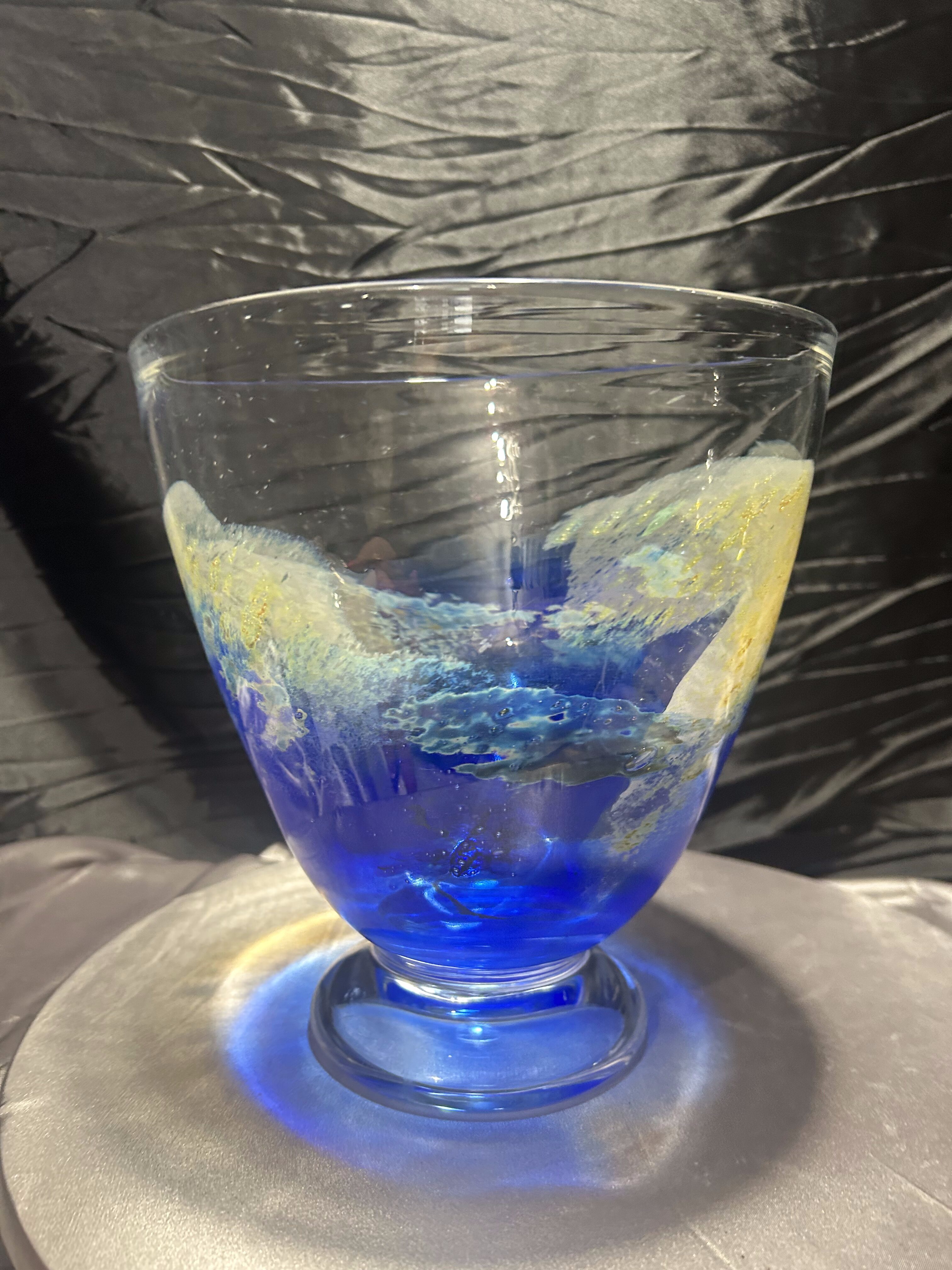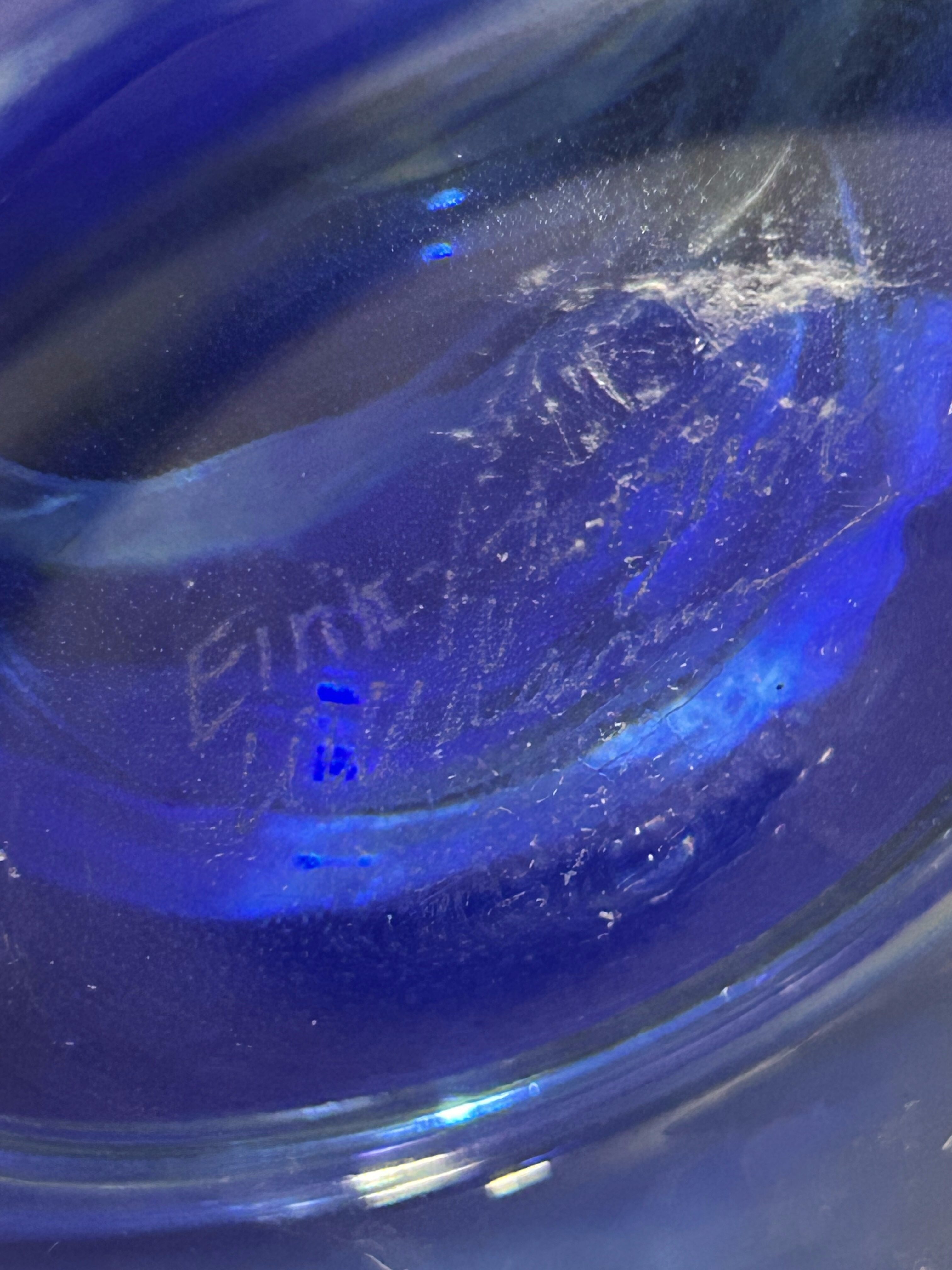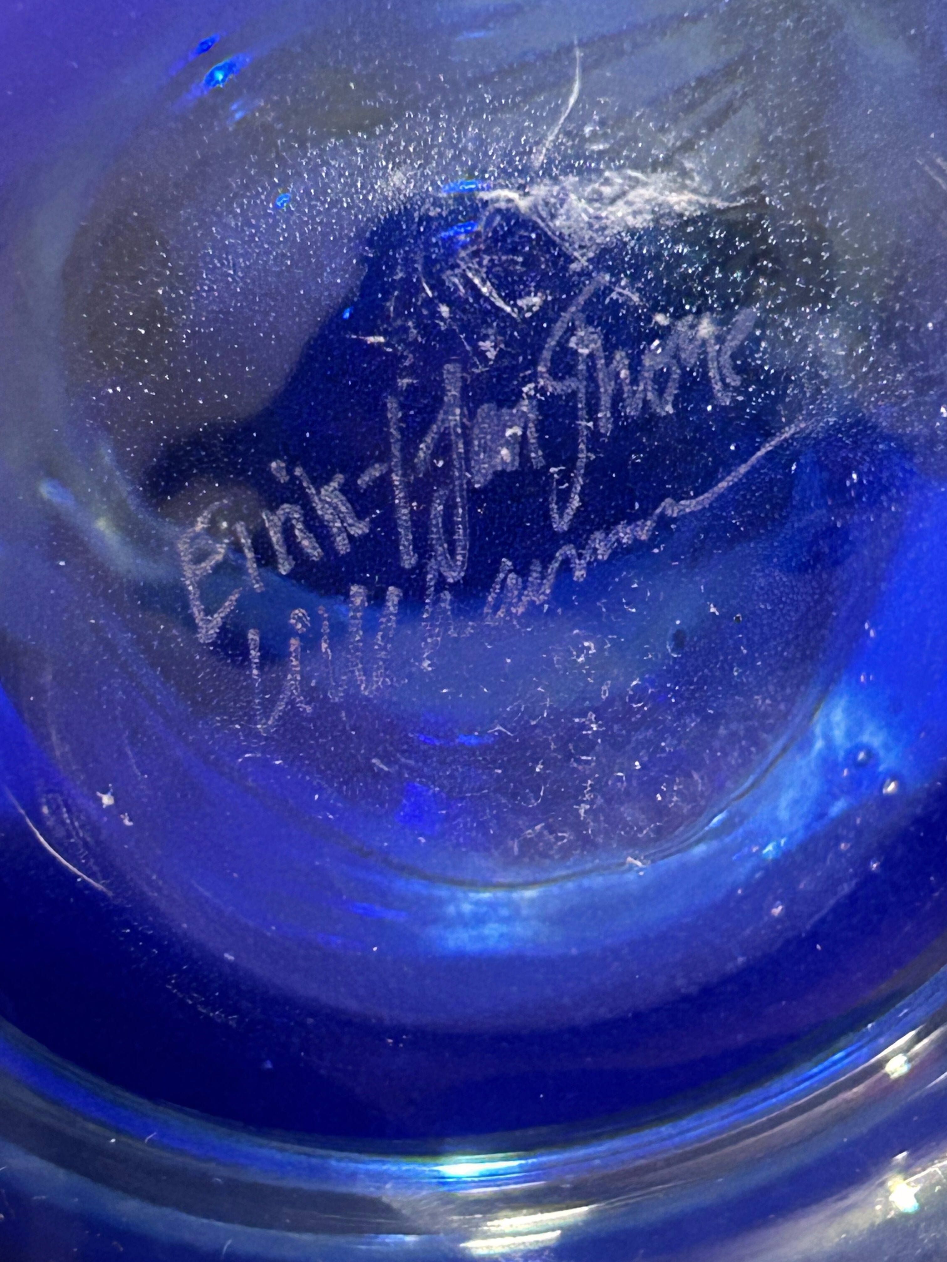 Ręcznie formowana misa artystyczna wykonana przez norweskiego twórcę Eirik Jan Thore z pracowni Lillehammer Kunstglass. Sygnowana diamentem na spodzie: Eirik Jan Thore – Lillehammer. Wykonana ze szkła barwionego w masie w odcieniach kobaltu, błękitu i żółci, z subtelnymi przejściami kolorystycznymi i efektem zatopionych pęcherzyków powietrza (technika bullicante). To wyjątkowy przykład skandynawskiego szkła studyjnego, w którym tradycja rzemiosła spotyka się z artystycznym wyrazem.