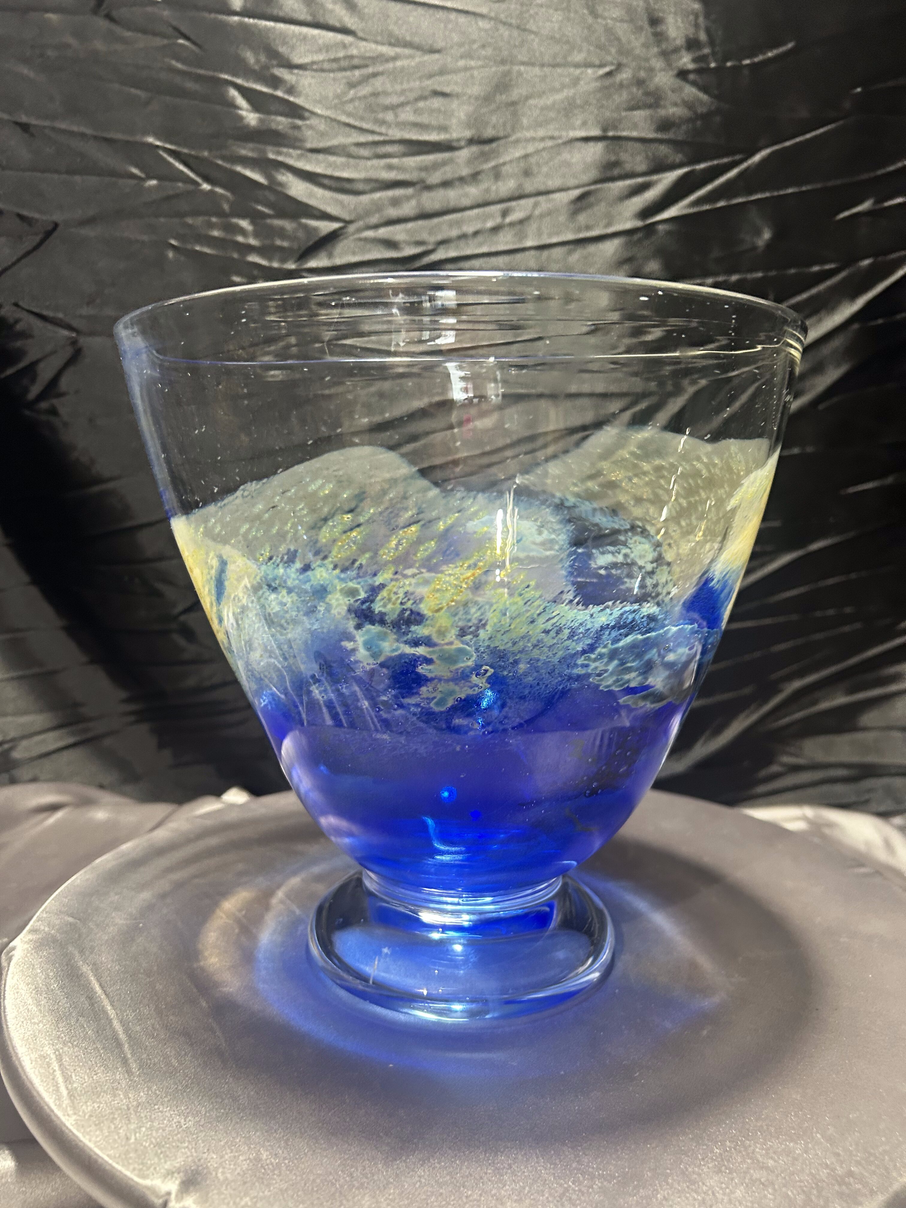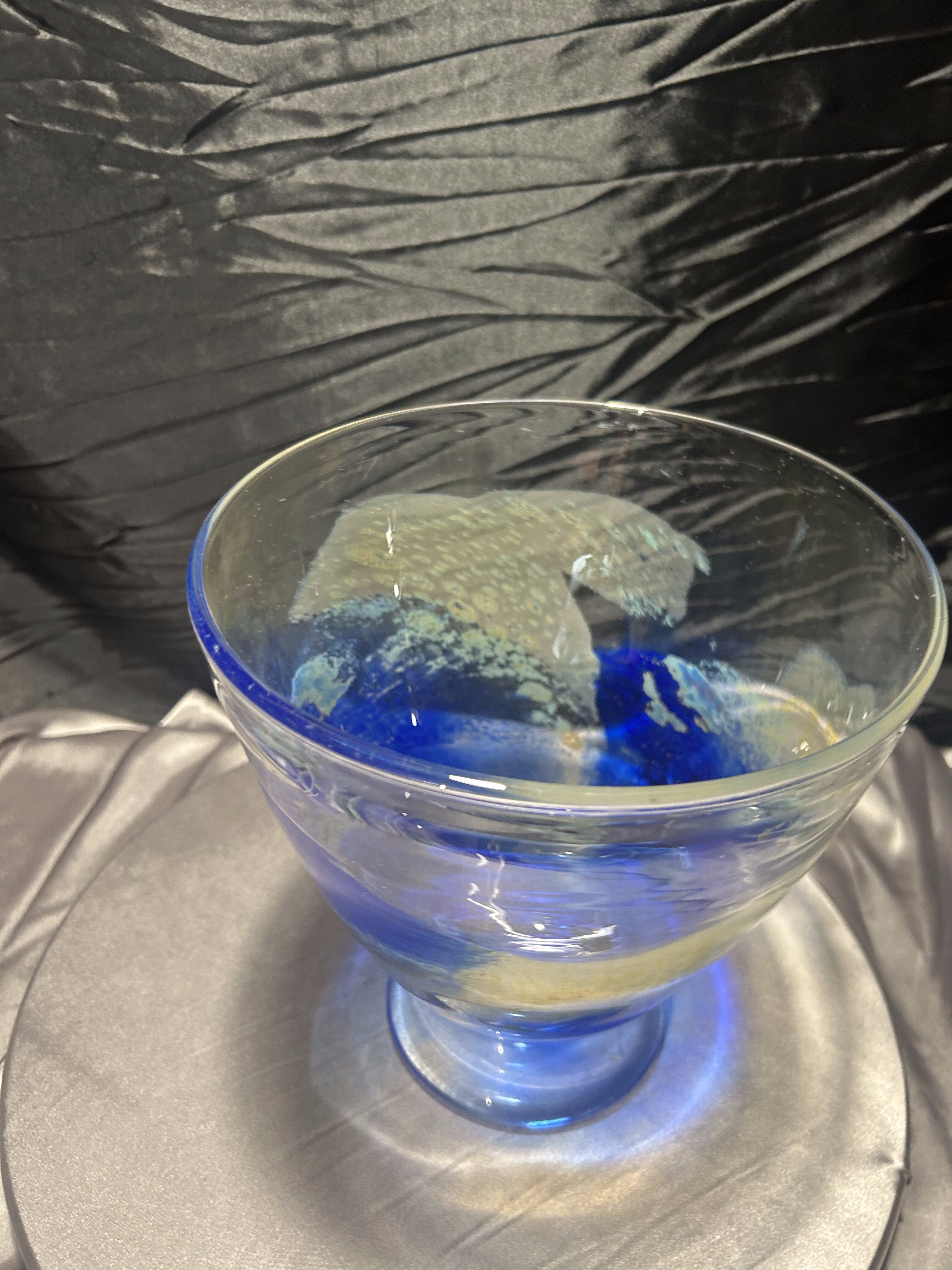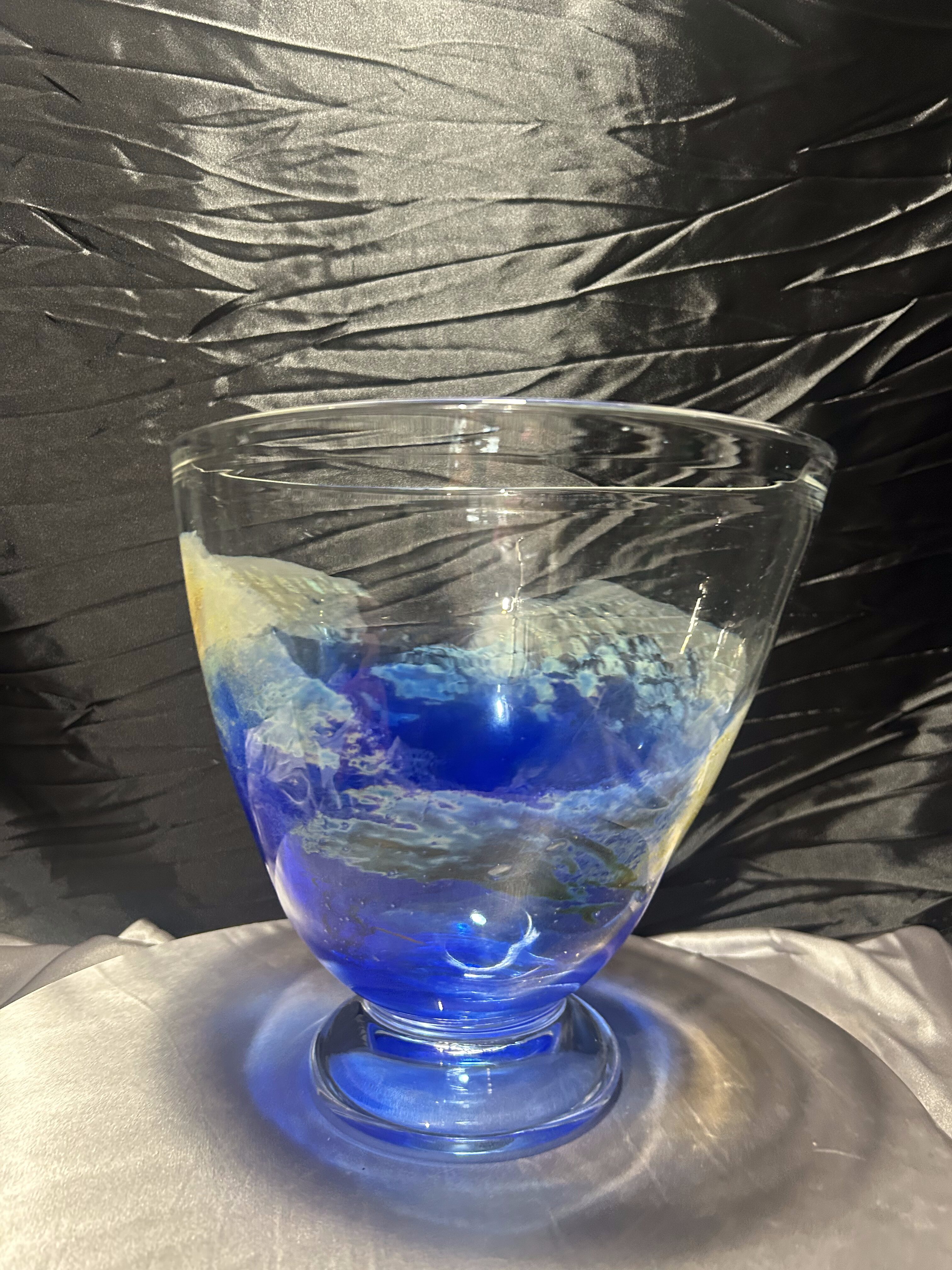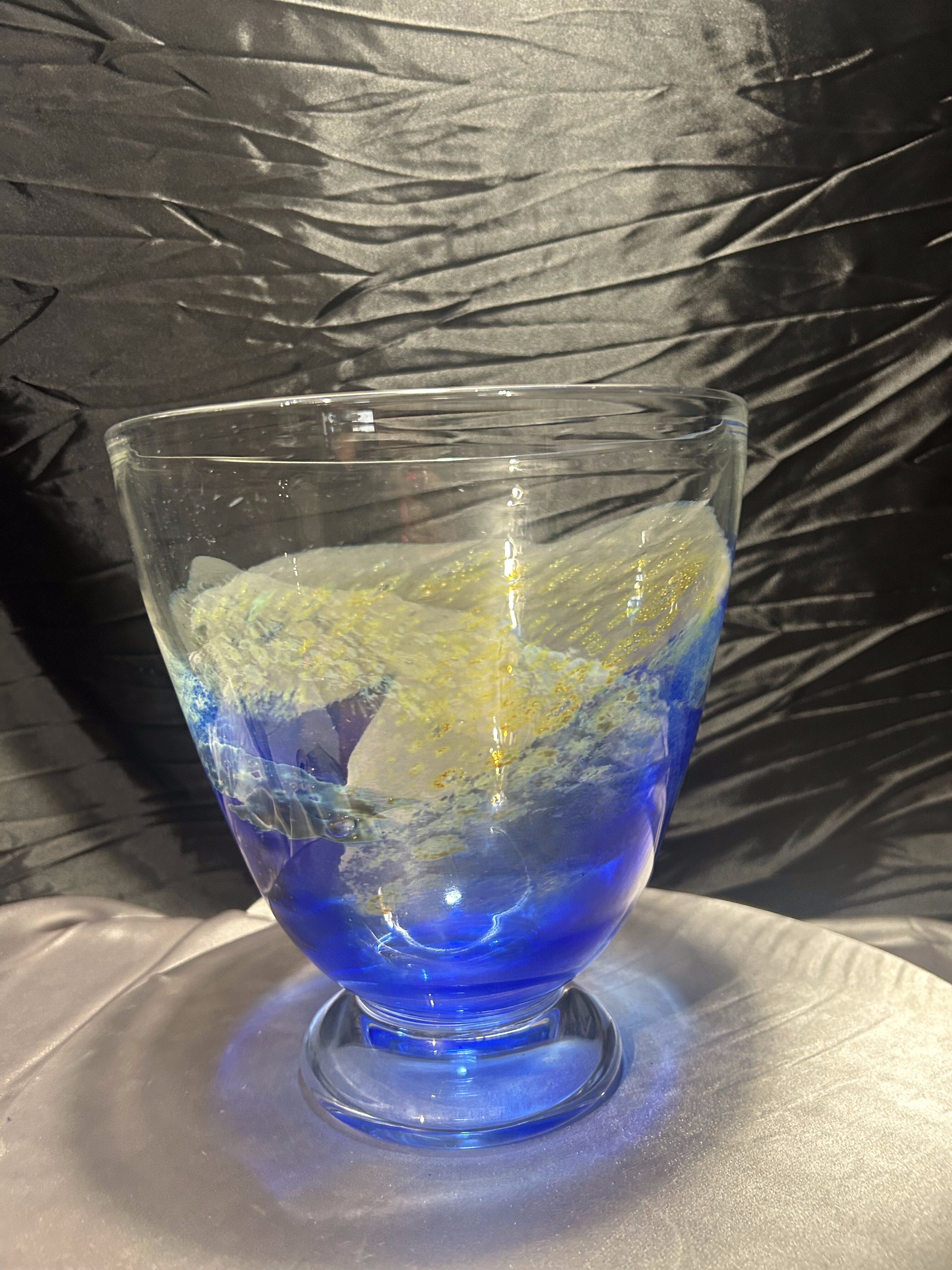 Ręcznie formowana misa artystyczna wykonana przez norweskiego twórcę Eirik Jan Thore z pracowni Lillehammer Kunstglass. Sygnowana diamentem na spodzie: Eirik Jan Thore – Lillehammer. Wykonana ze szkła barwionego w masie w odcieniach kobaltu, błękitu i żółci, z subtelnymi przejściami kolorystycznymi i efektem zatopionych pęcherzyków powietrza (technika bullicante). To wyjątkowy przykład skandynawskiego szkła studyjnego, w którym tradycja rzemiosła spotyka się z artystycznym wyrazem.