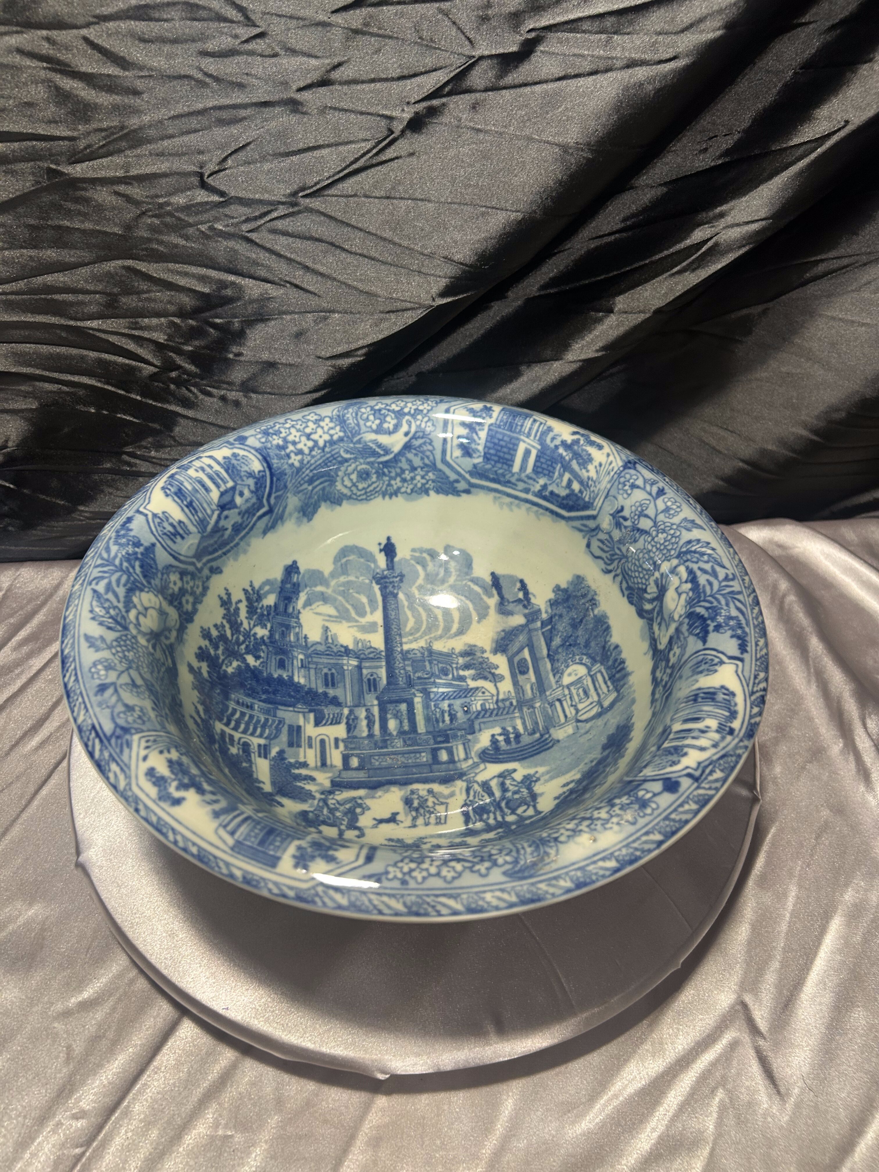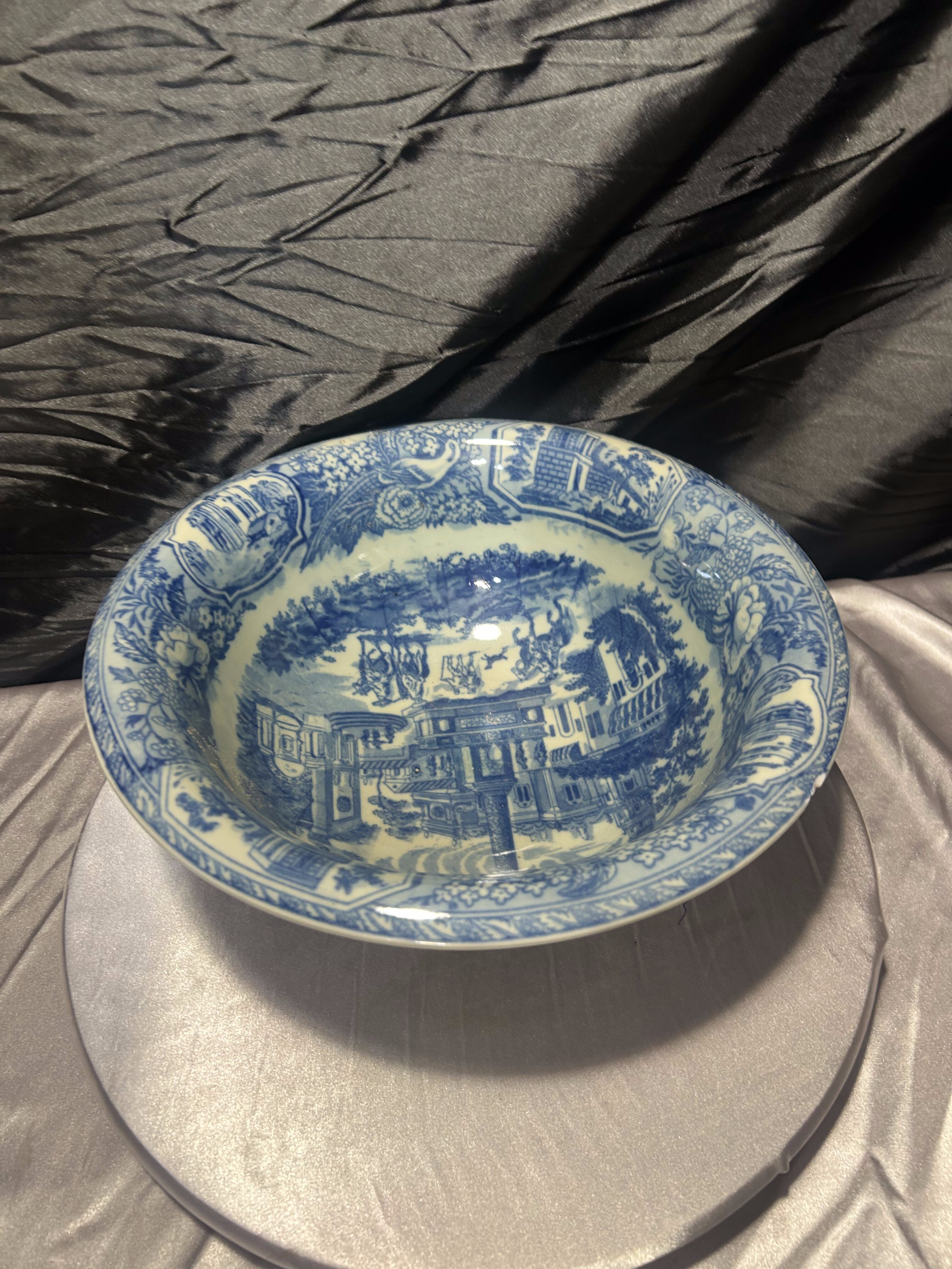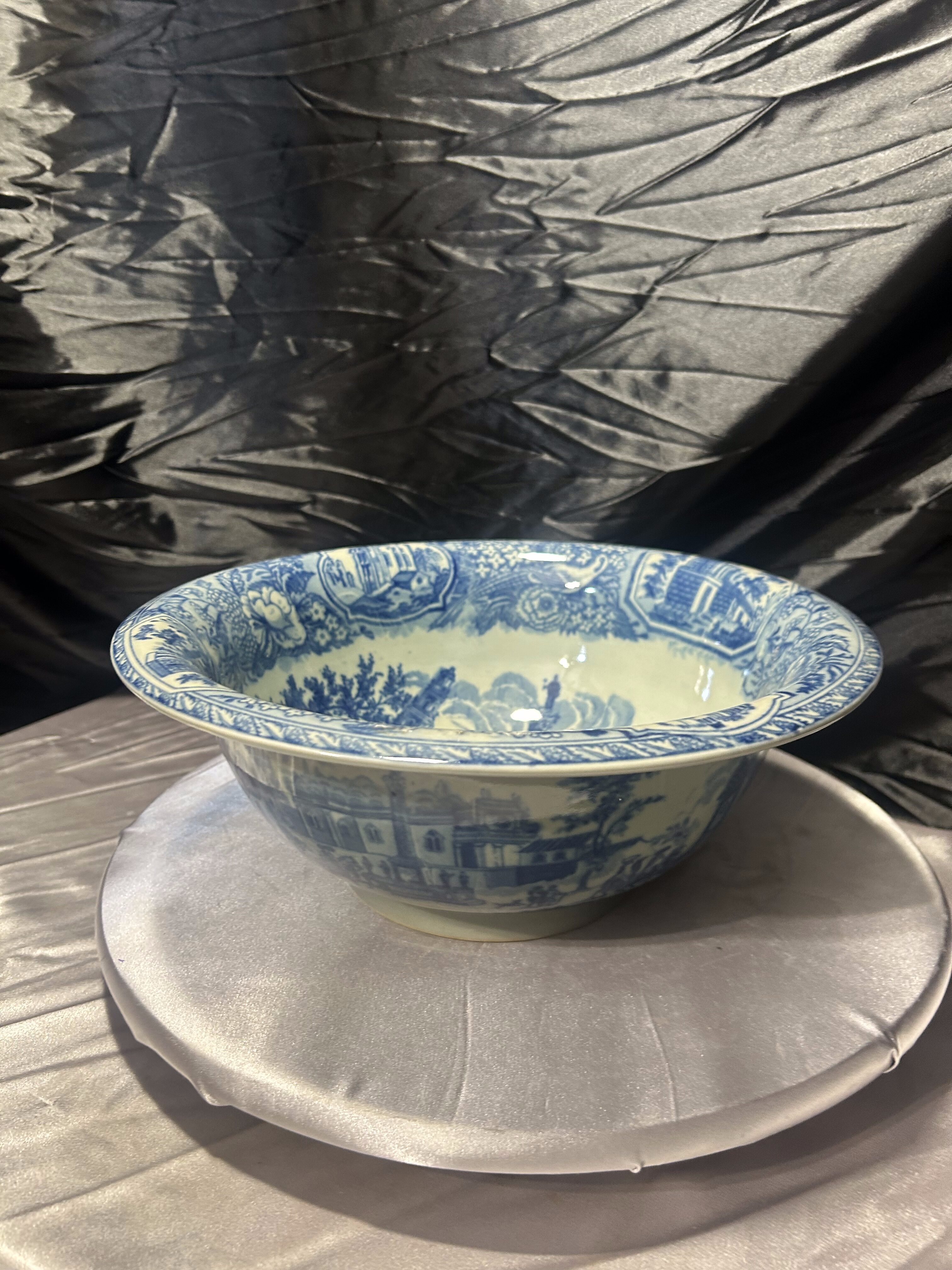 Piękna, klasyczna misa w odcieniach niebieskiego, która zachwyca bogactwem detali. Delikatne uszczerbienie nie odbiera jej uroku – nadal pozostaje wyjątkowym elementem dekoracyjnym, doskonałym dla miłośników angielskiej ceramiki i stylu vintage.