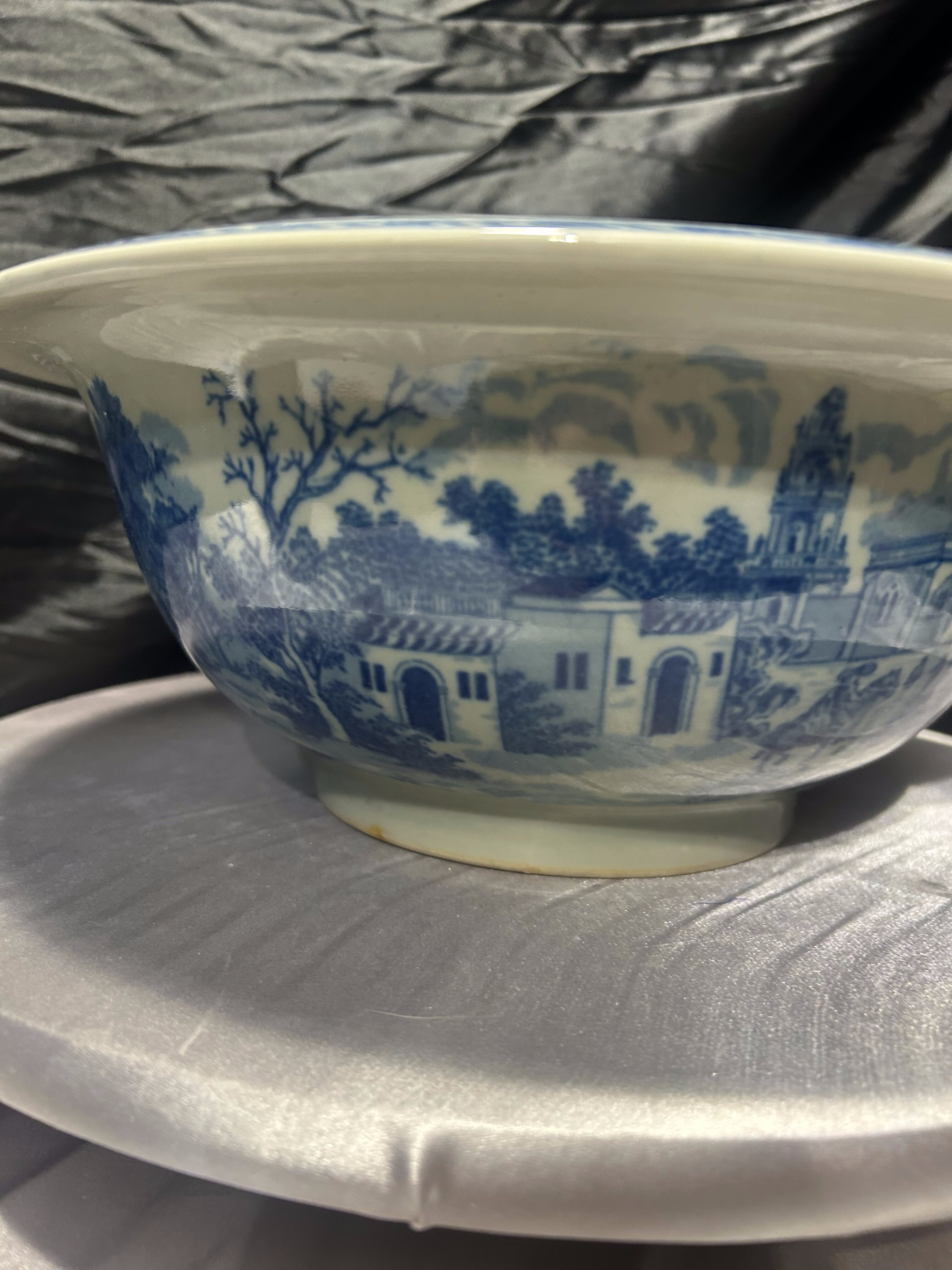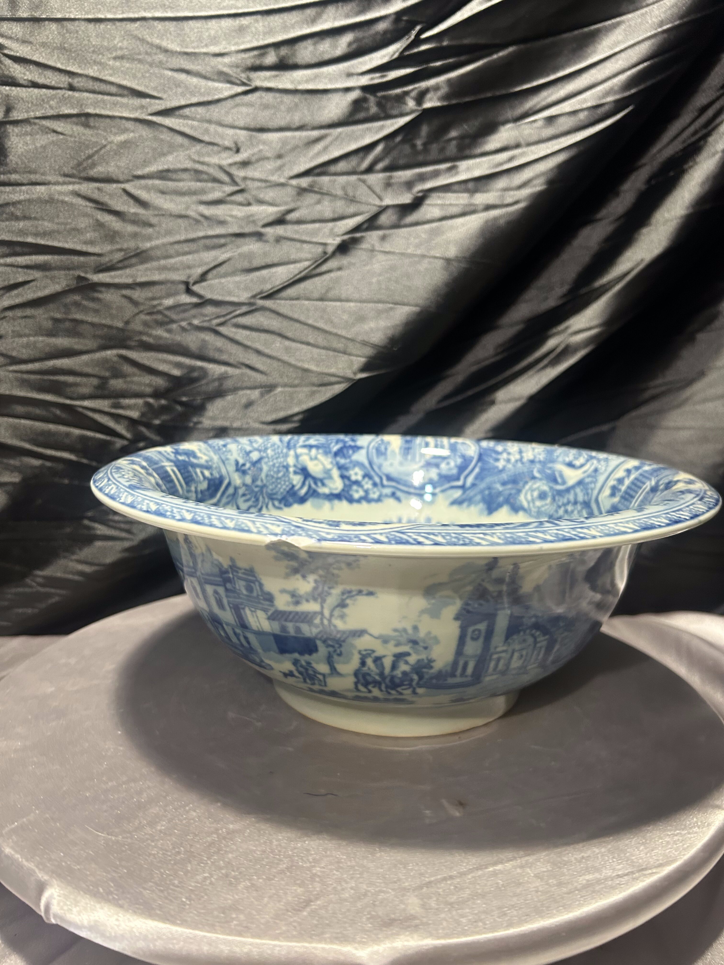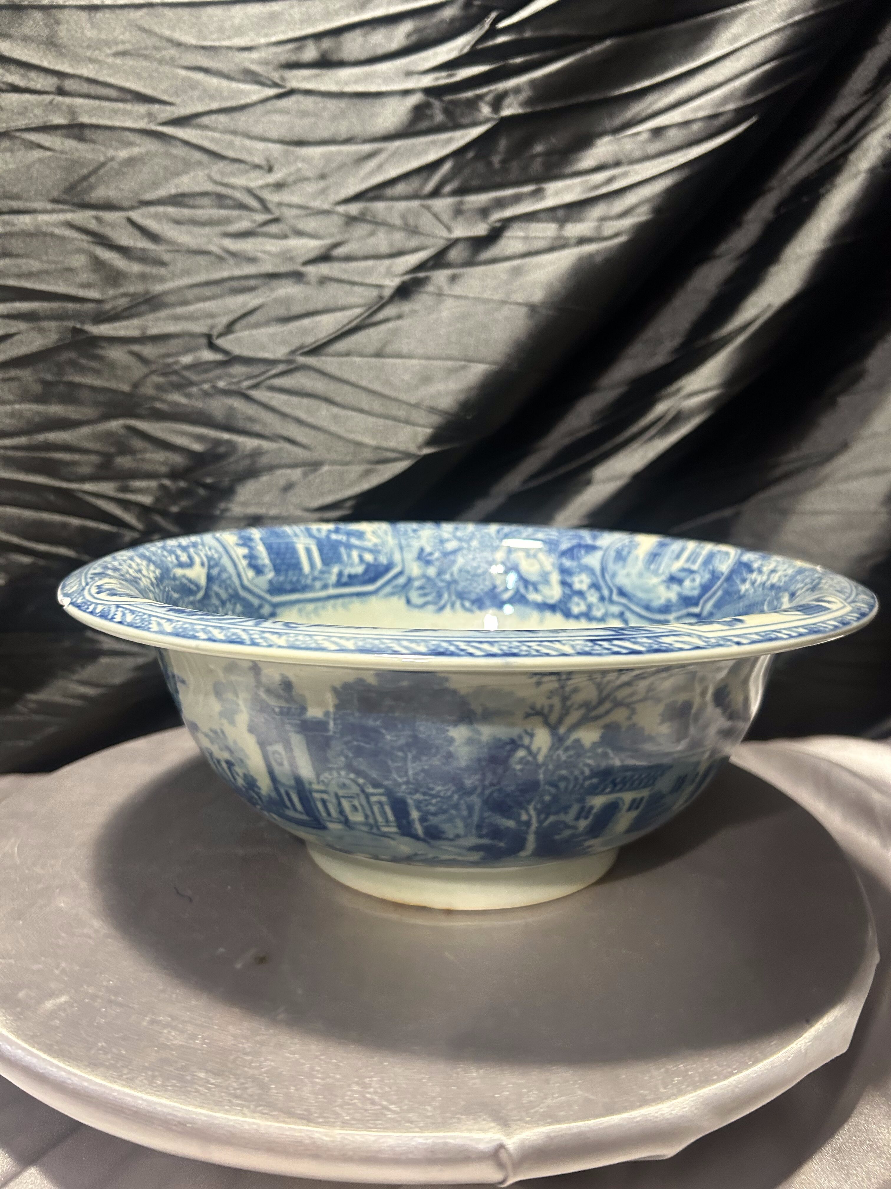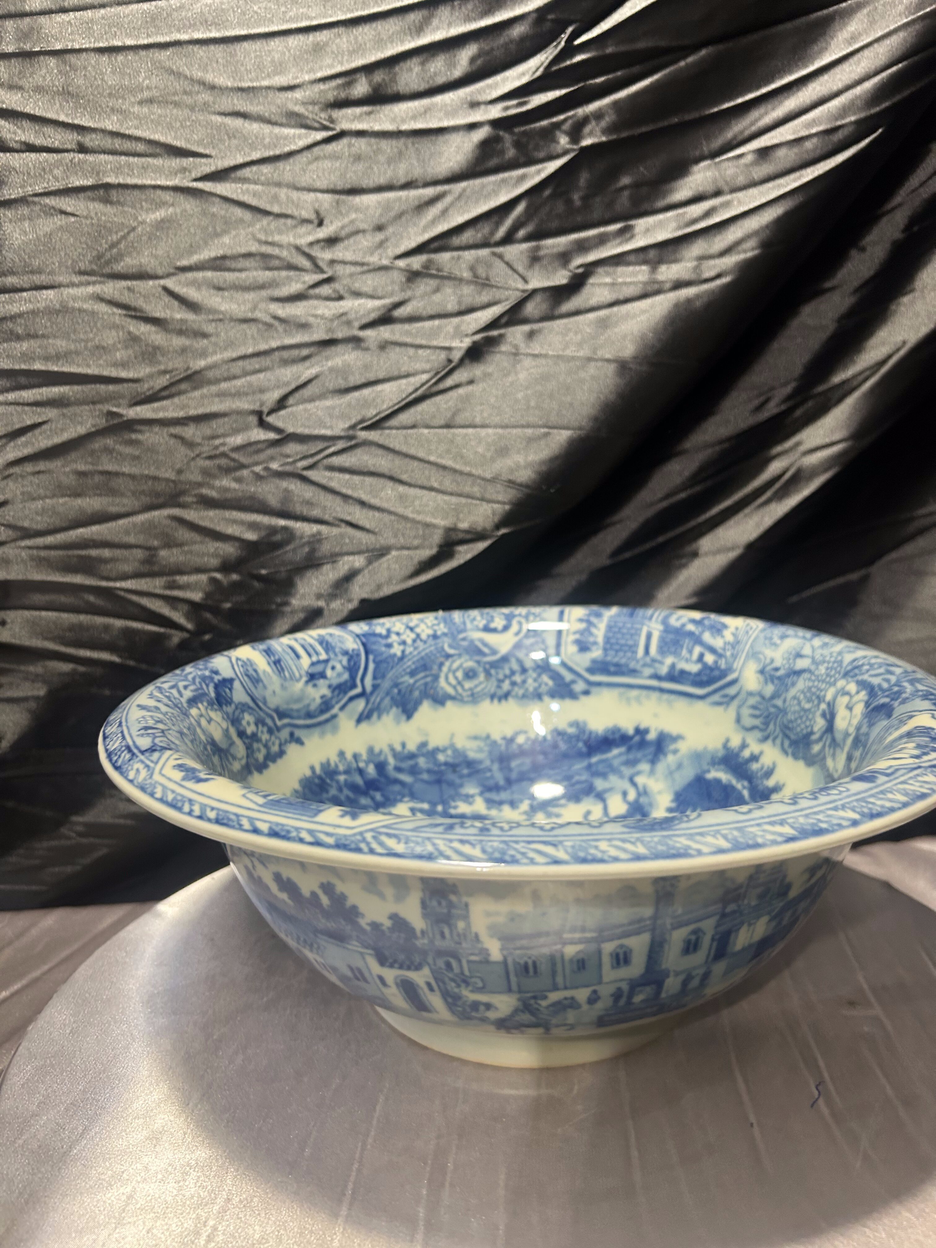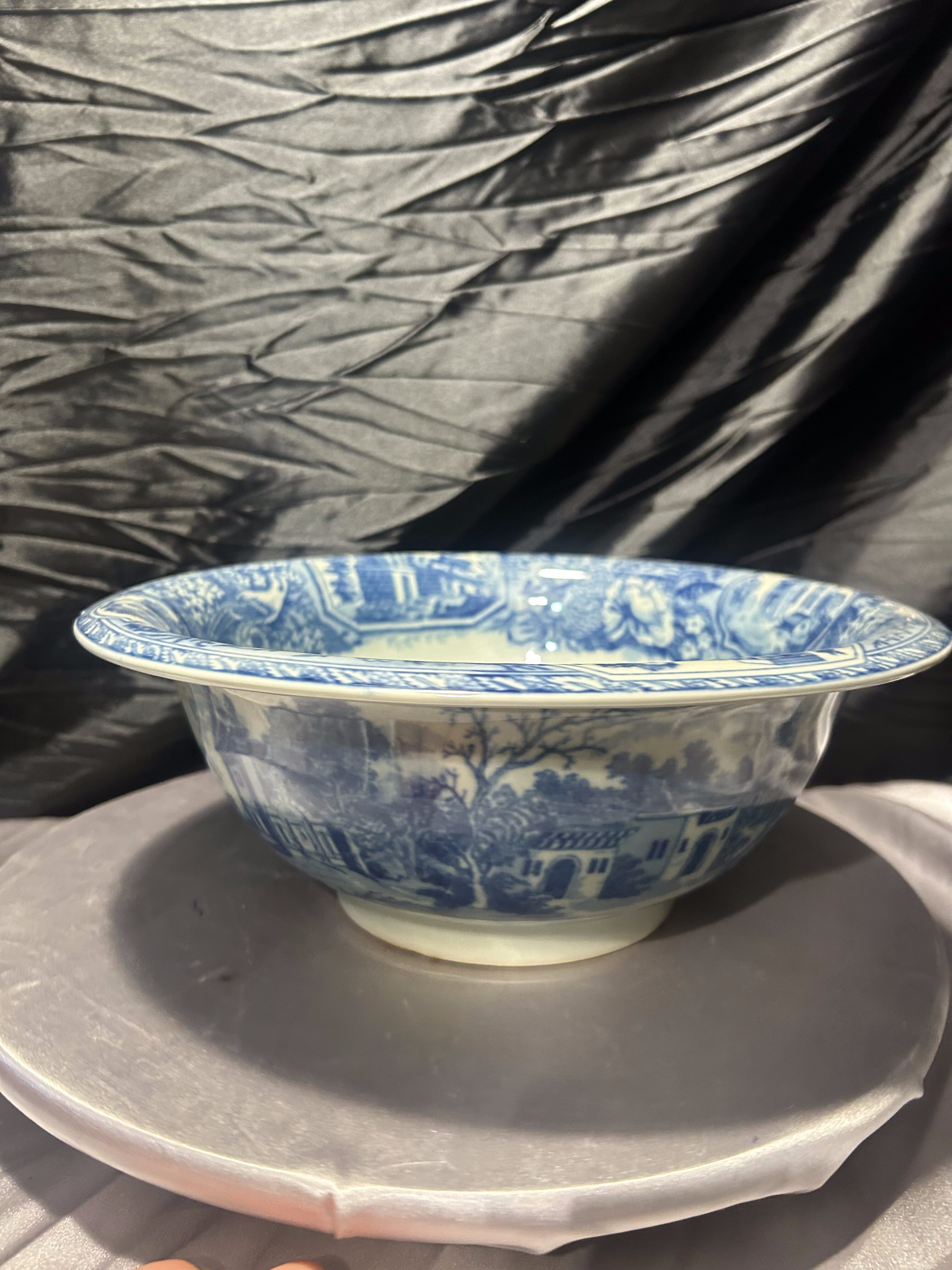 Okazała, dekoracyjna misa sygnowana Victoria Ware Ironstone, utrzymana w klasycznym niebiesko–białym stylu „flow blue”. Zdobiona zarówno wewnątrz, jak i na zewnątrz malowniczą sceną miejską z architekturą, kolumnami i bujną roślinnością – charakterystycznym motywem dla naczyń inspirowanych angielską ceramiką transferware.