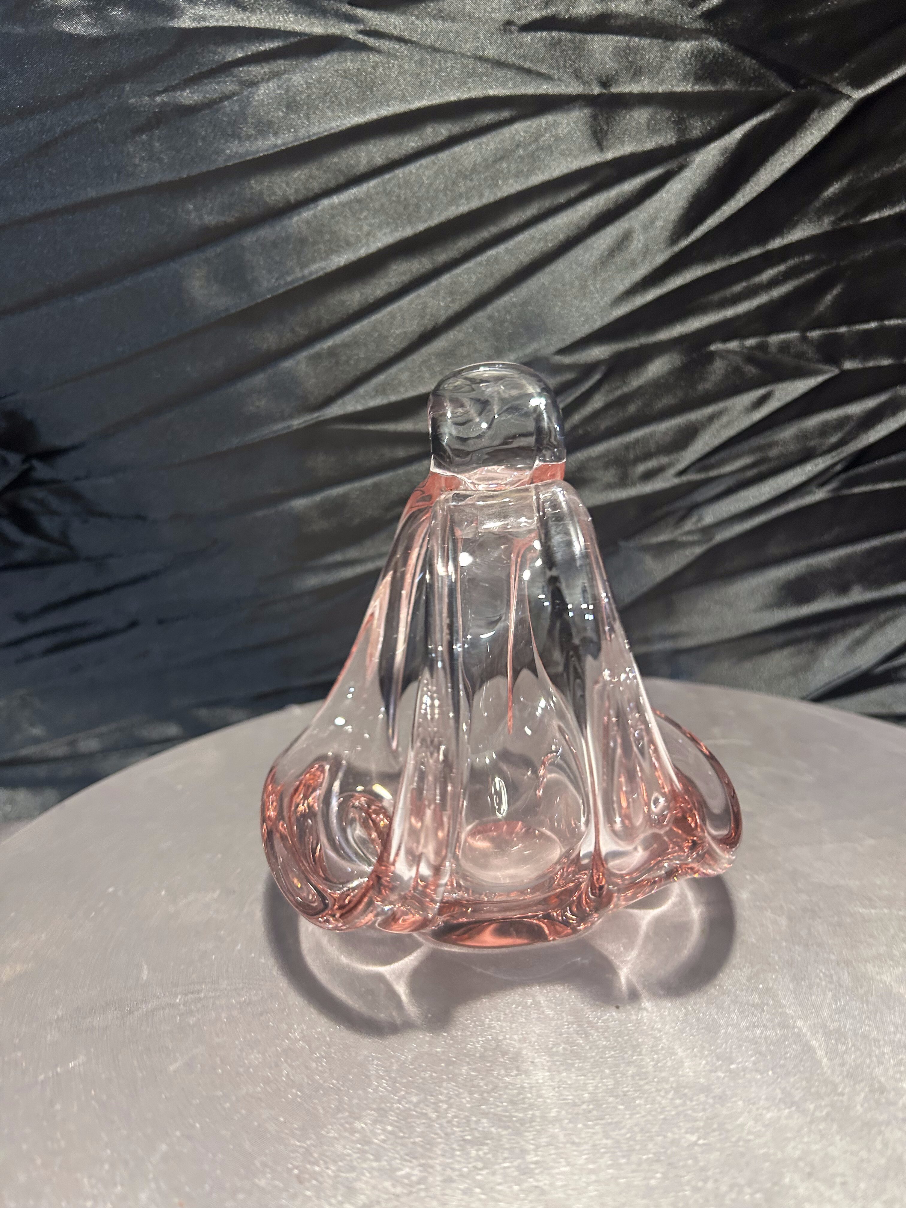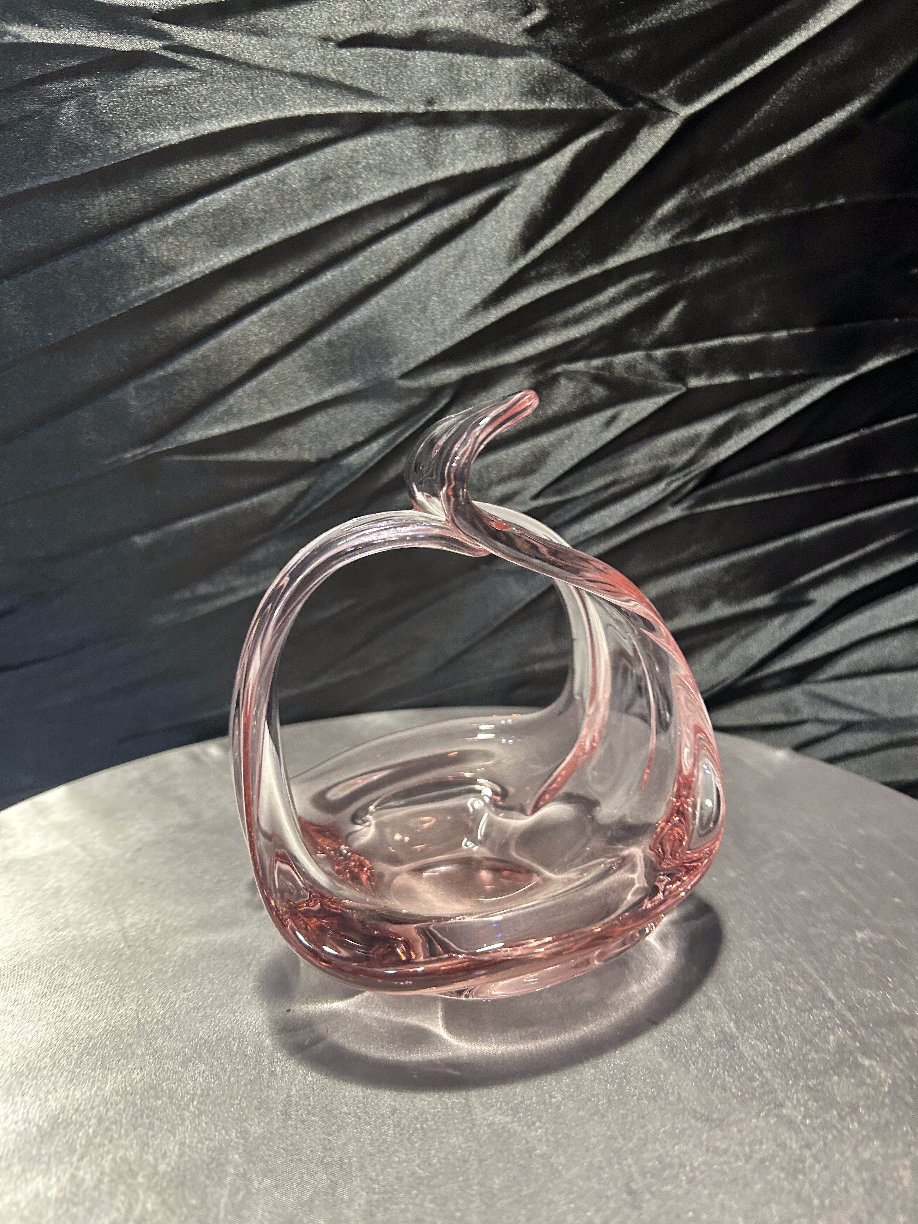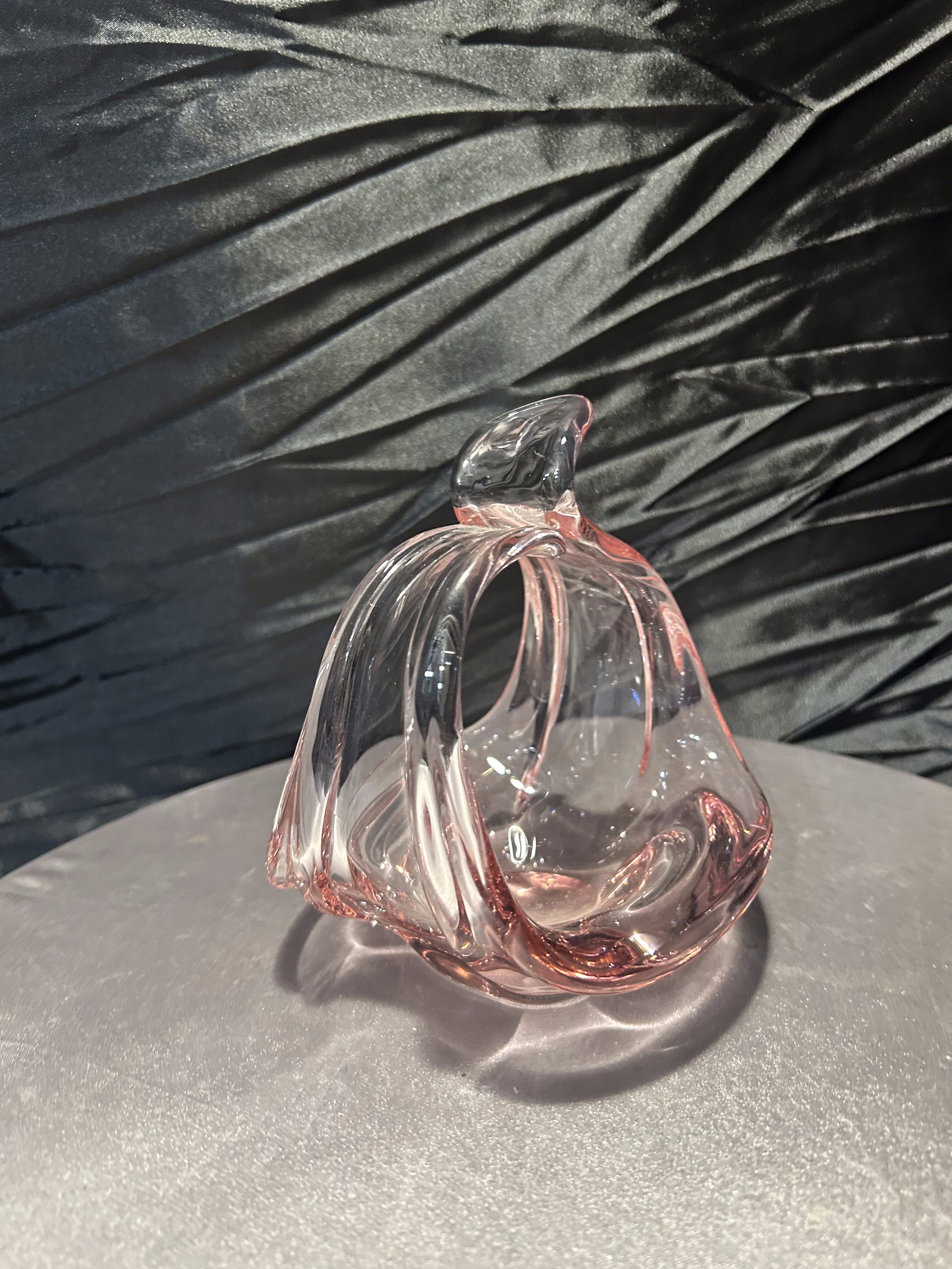 Delikatna misa w formie koszyczka wykonana ze szkła artystycznego w bladoróżowej tonacji. Jej płynna, organiczna forma i subtelny kolor nadają jej romantycznego charakteru. Idealna jako dekoracyjny detal, który doda wnętrzu lekkości i kobiecego wdzięku. Doskonale sprawdzi się samodzielnie lub jako naczynie ozdobne — elegancja vintage w najlepszym wydaniu.