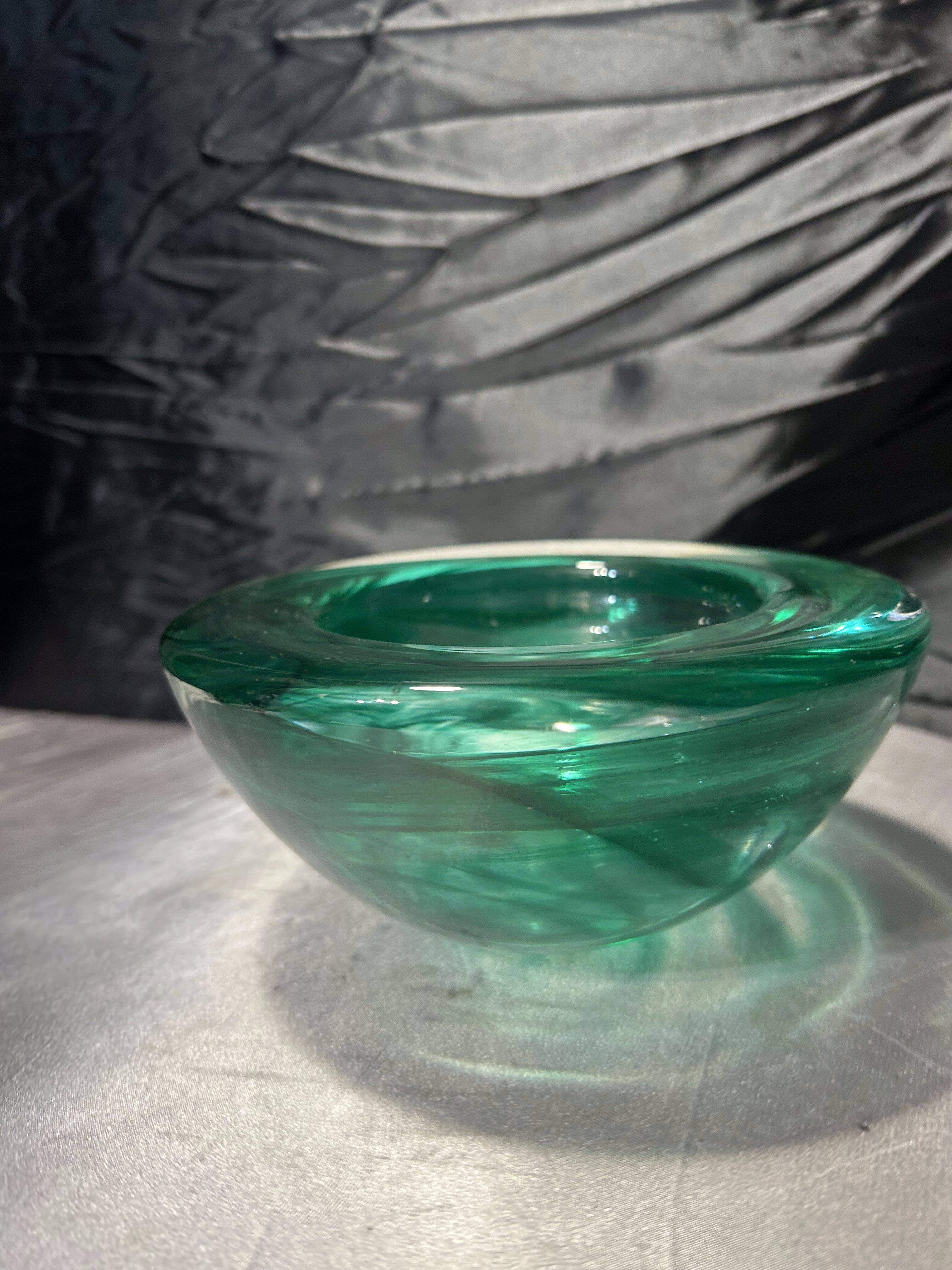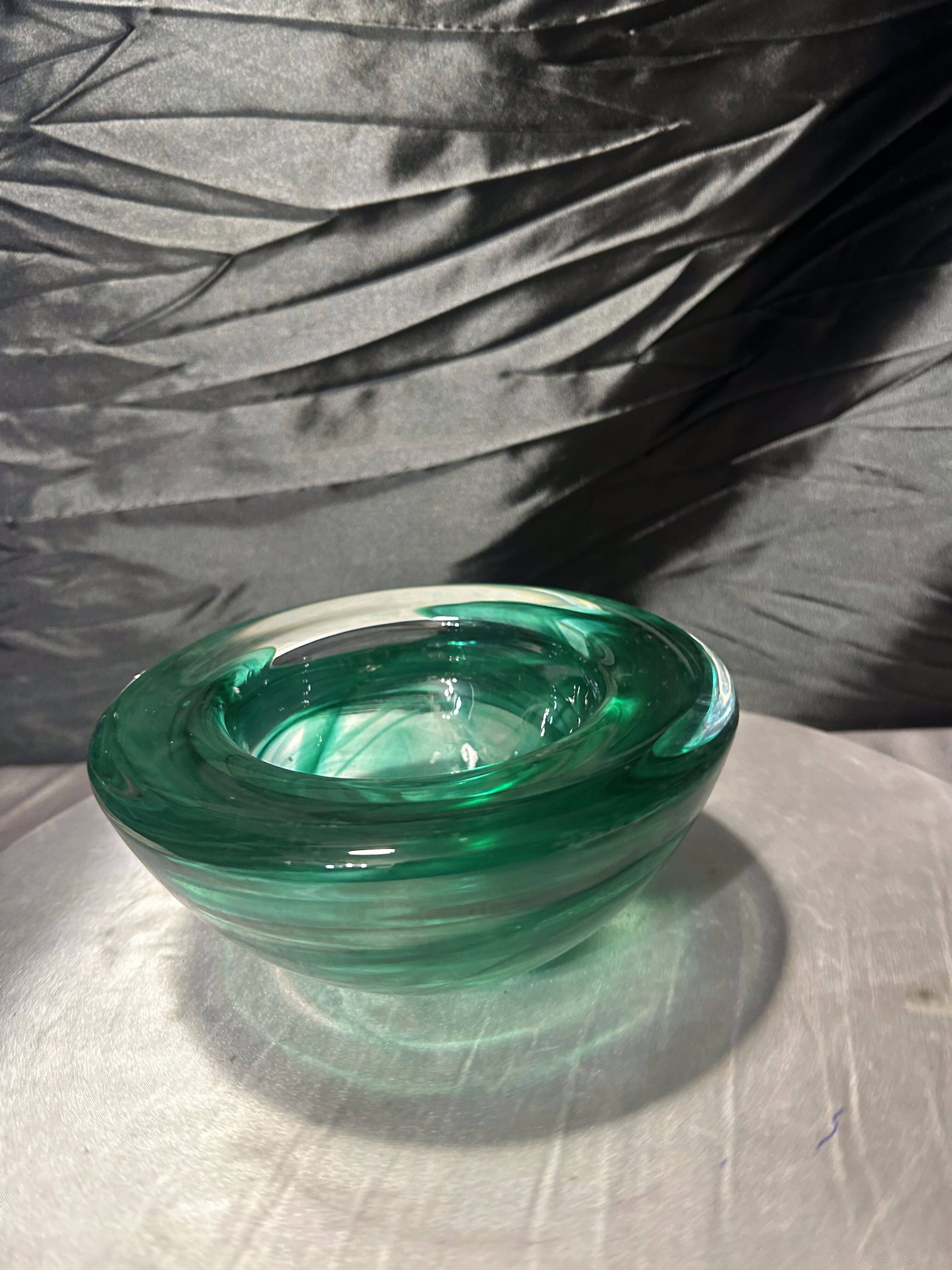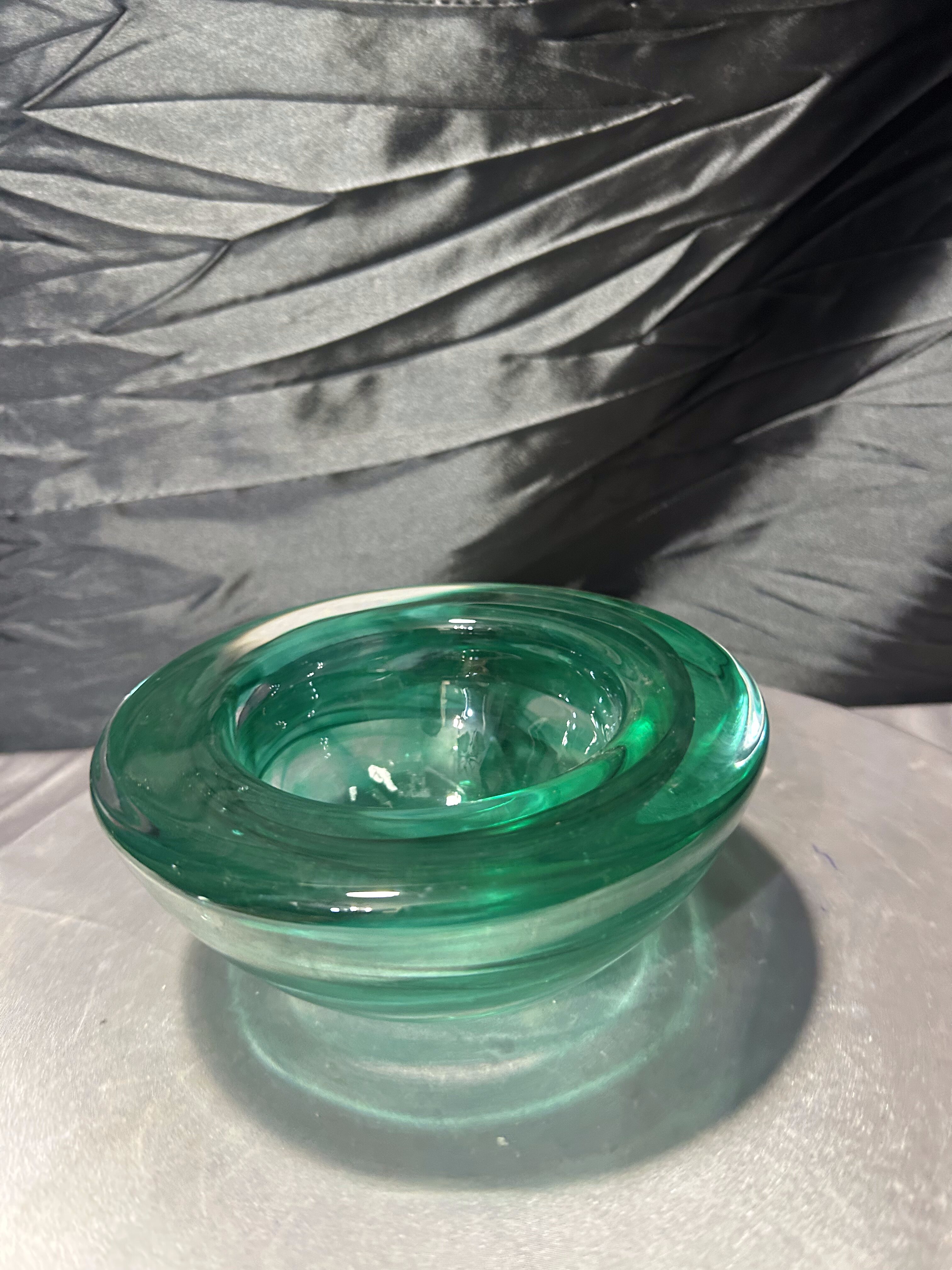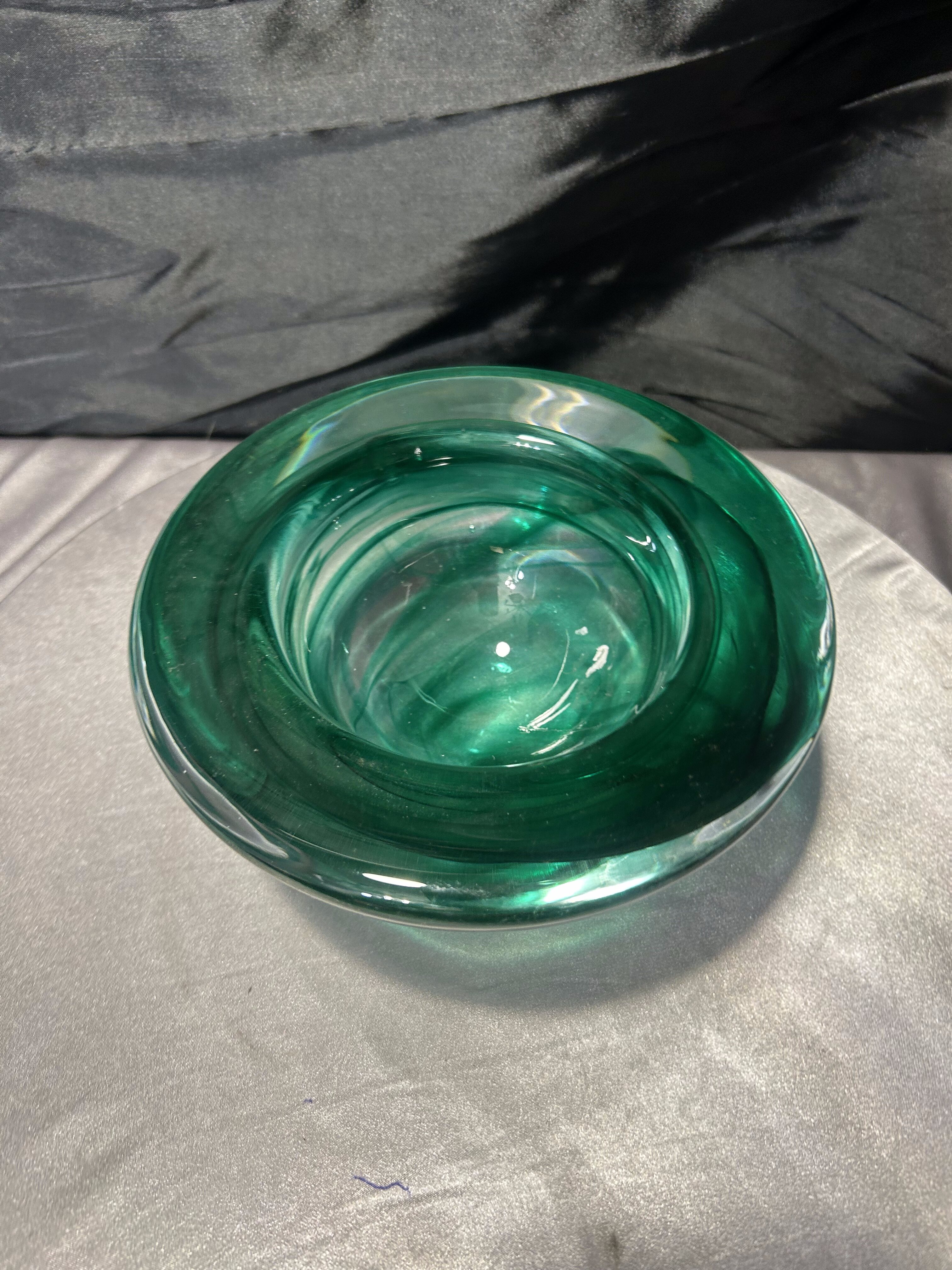 Efektowna misa ze szkła artystycznego w stylu Murano, wykonana w pięknym, przydymionym zielonym odcieniu. Grube, masywne szkło oraz płynna, spiralna forma nadają jej rzeźbiarski charakter. To przedmiot, który sam w sobie stanowi dekorację – przyciąga światło, kolor i uwagę, niezależnie od miejsca ekspozycji.