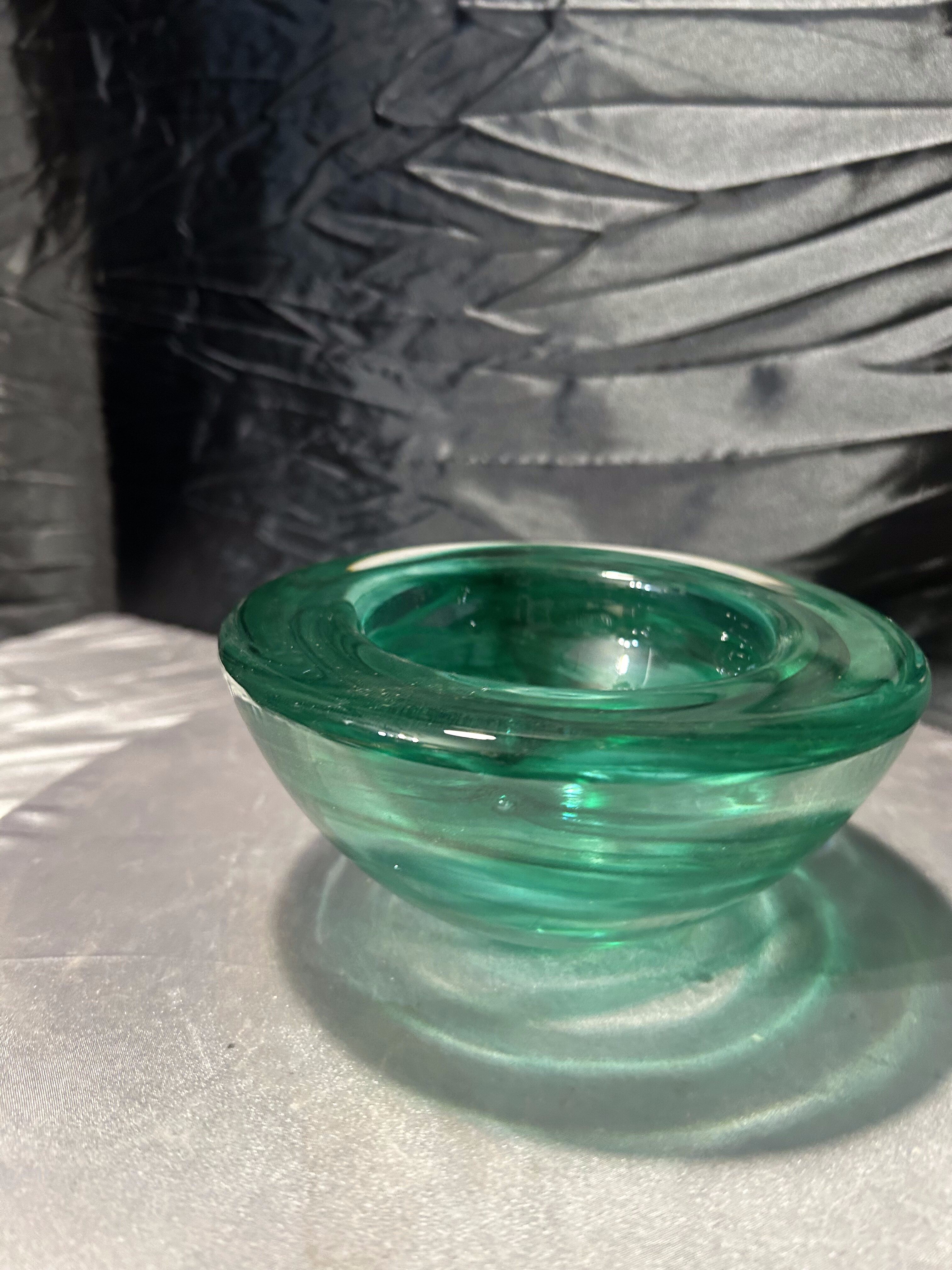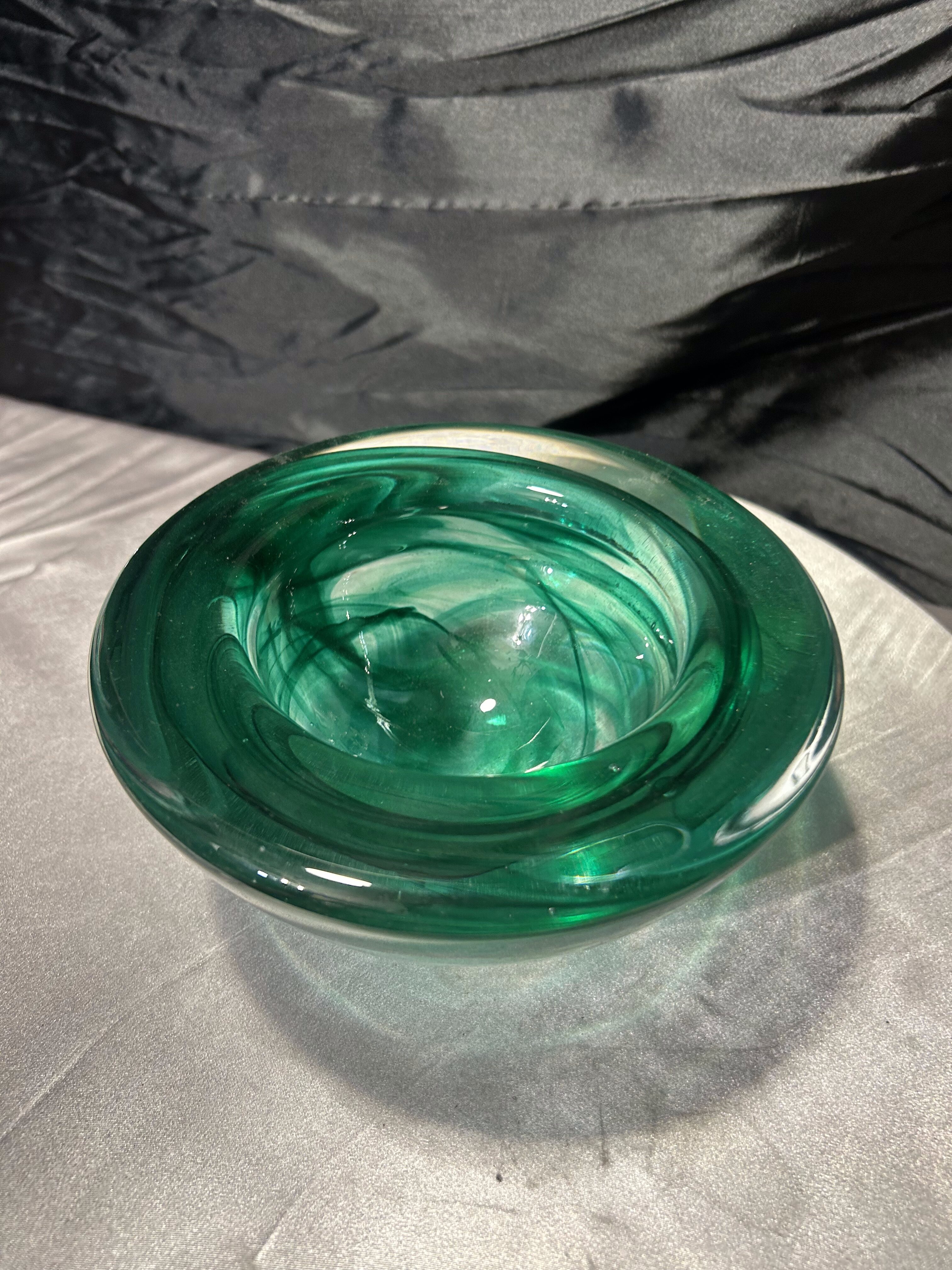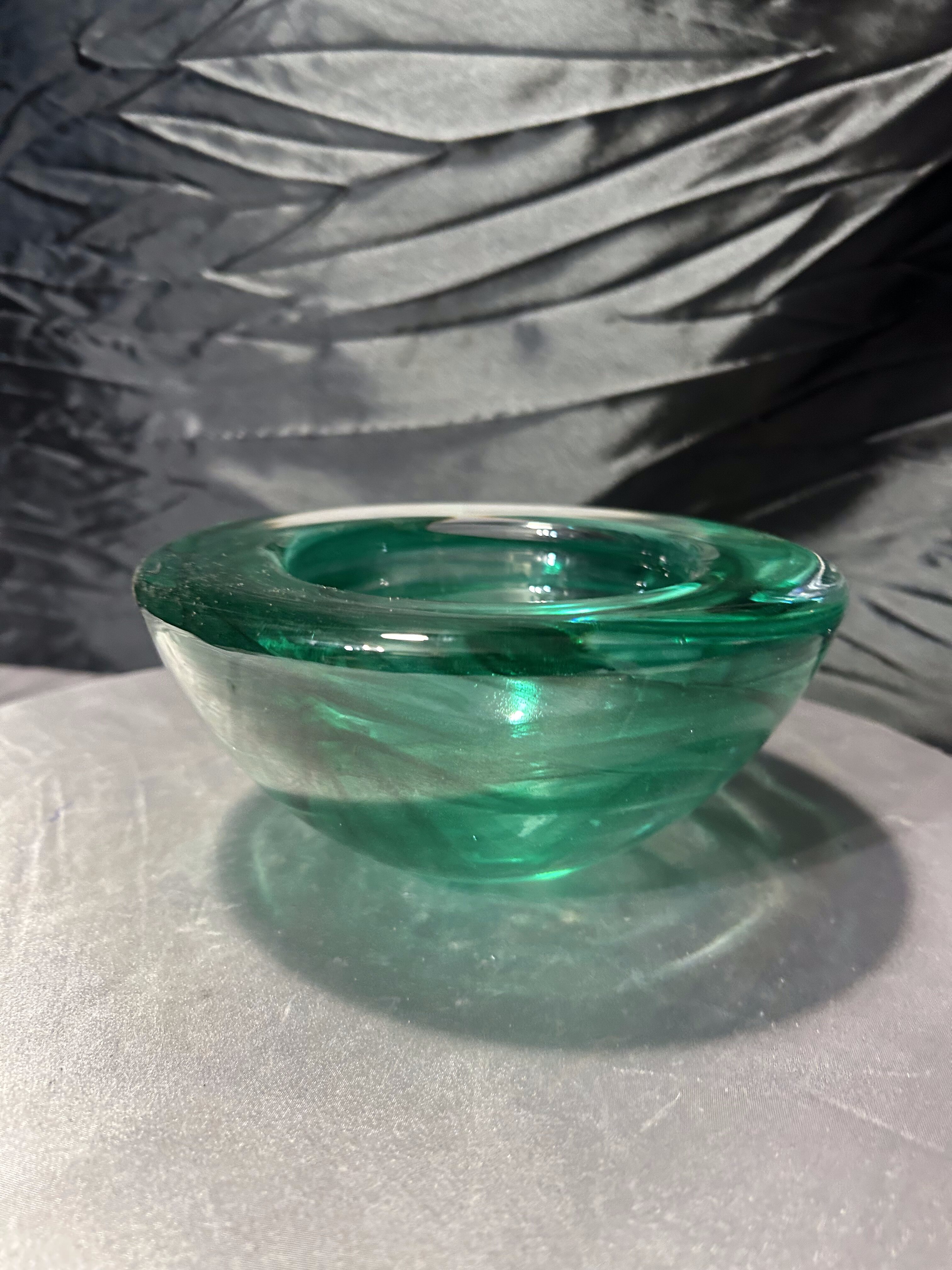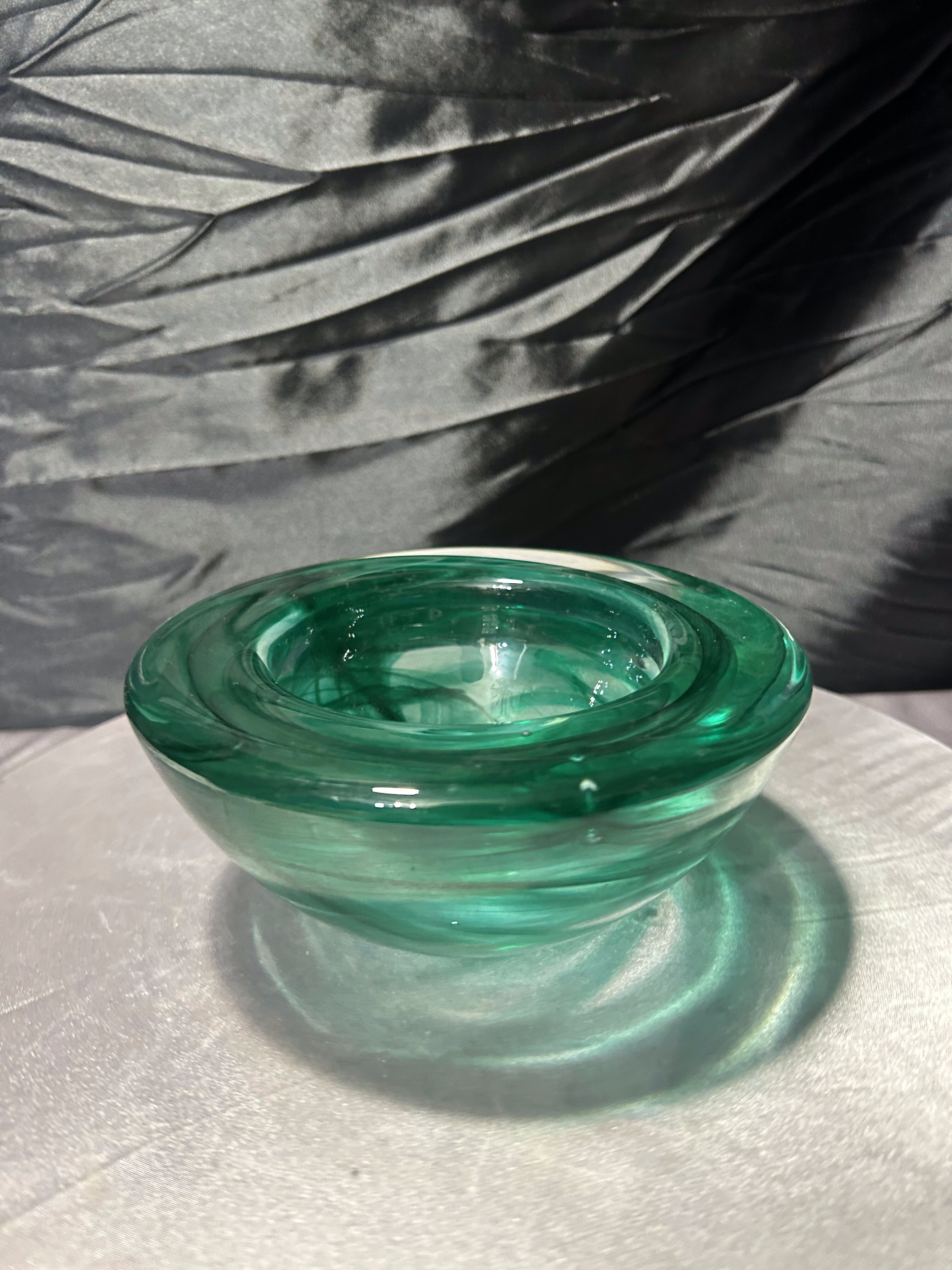 Efektowna misa ze szkła artystycznego w stylu Murano, wykonana w pięknym, przydymionym zielonym odcieniu. Grube, masywne szkło oraz płynna, spiralna forma nadają jej rzeźbiarski charakter. To przedmiot, który sam w sobie stanowi dekorację – przyciąga światło, kolor i uwagę, niezależnie od miejsca ekspozycji.