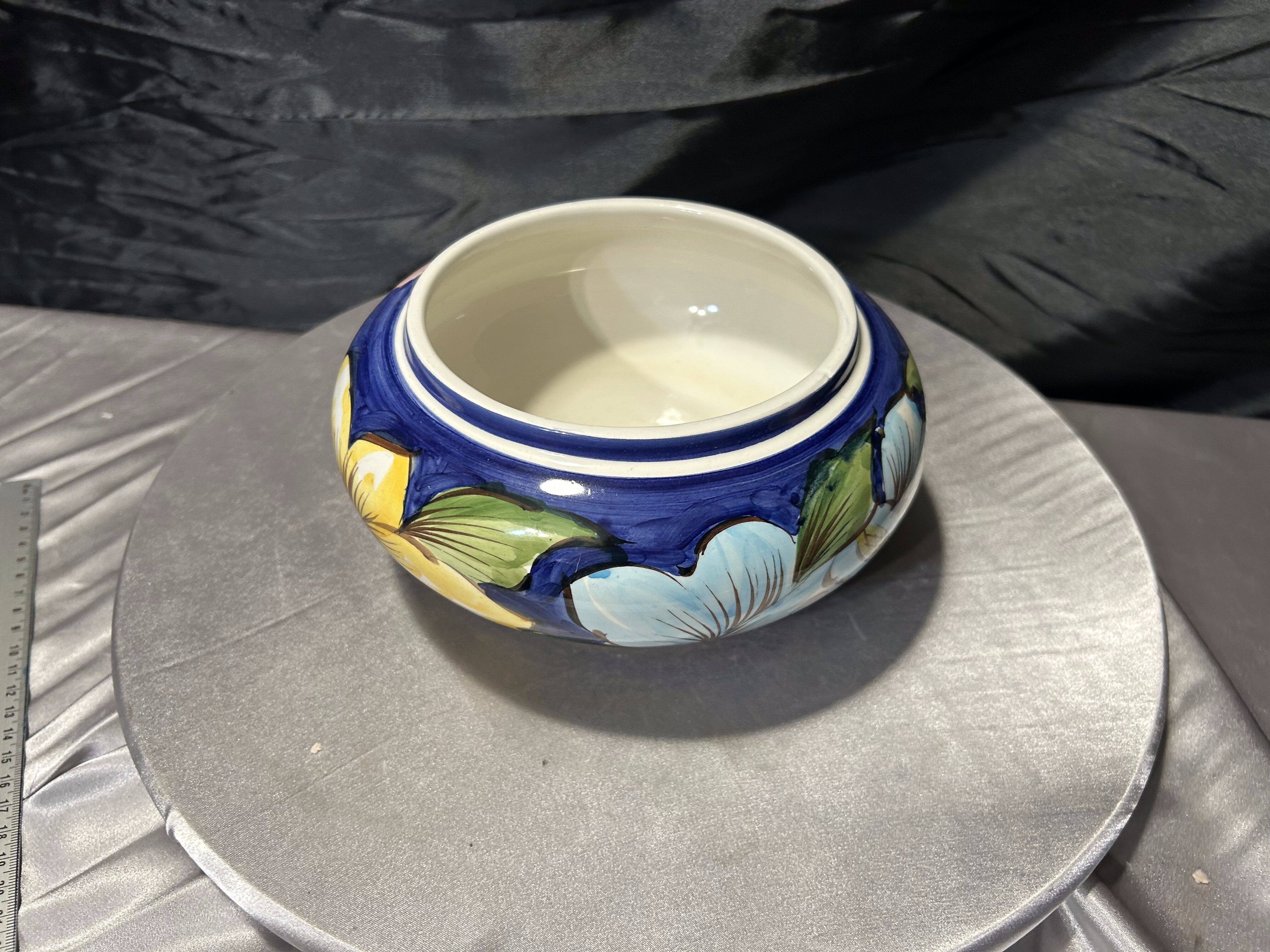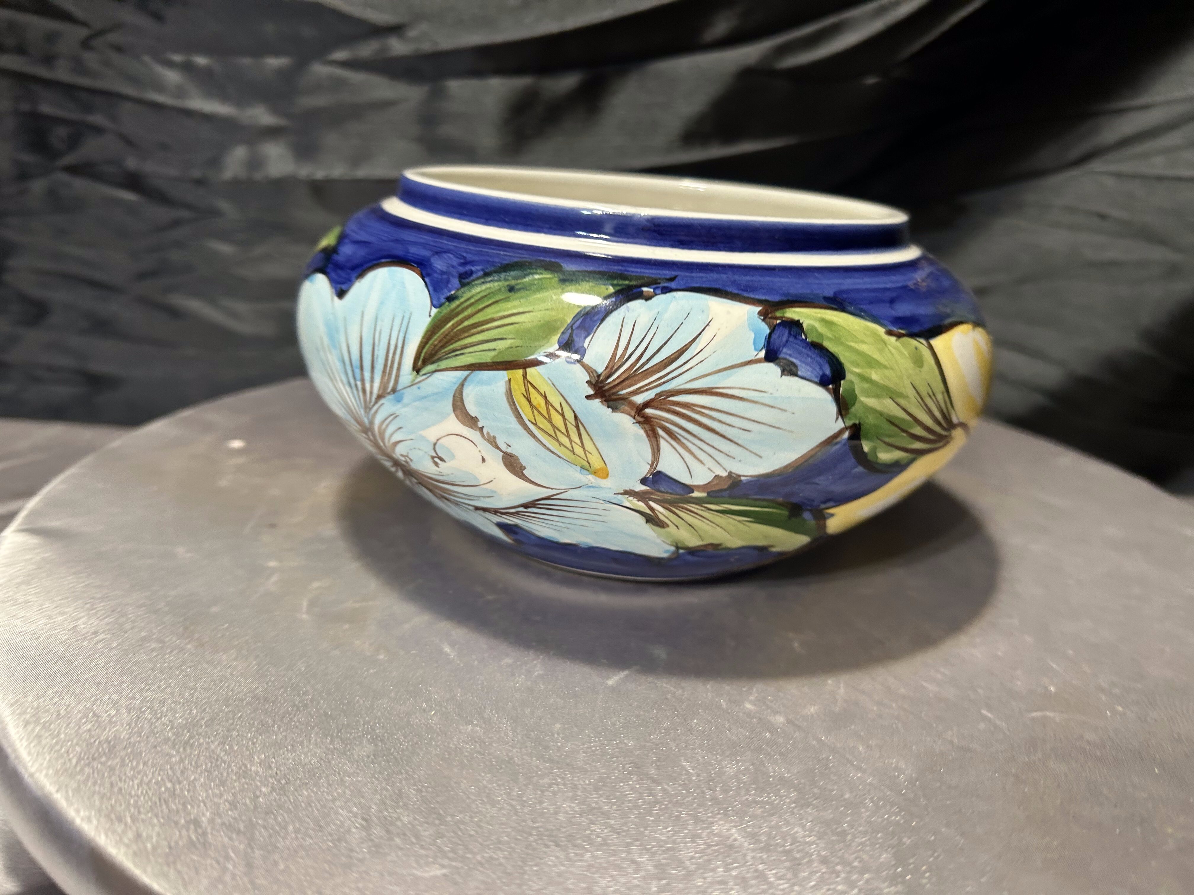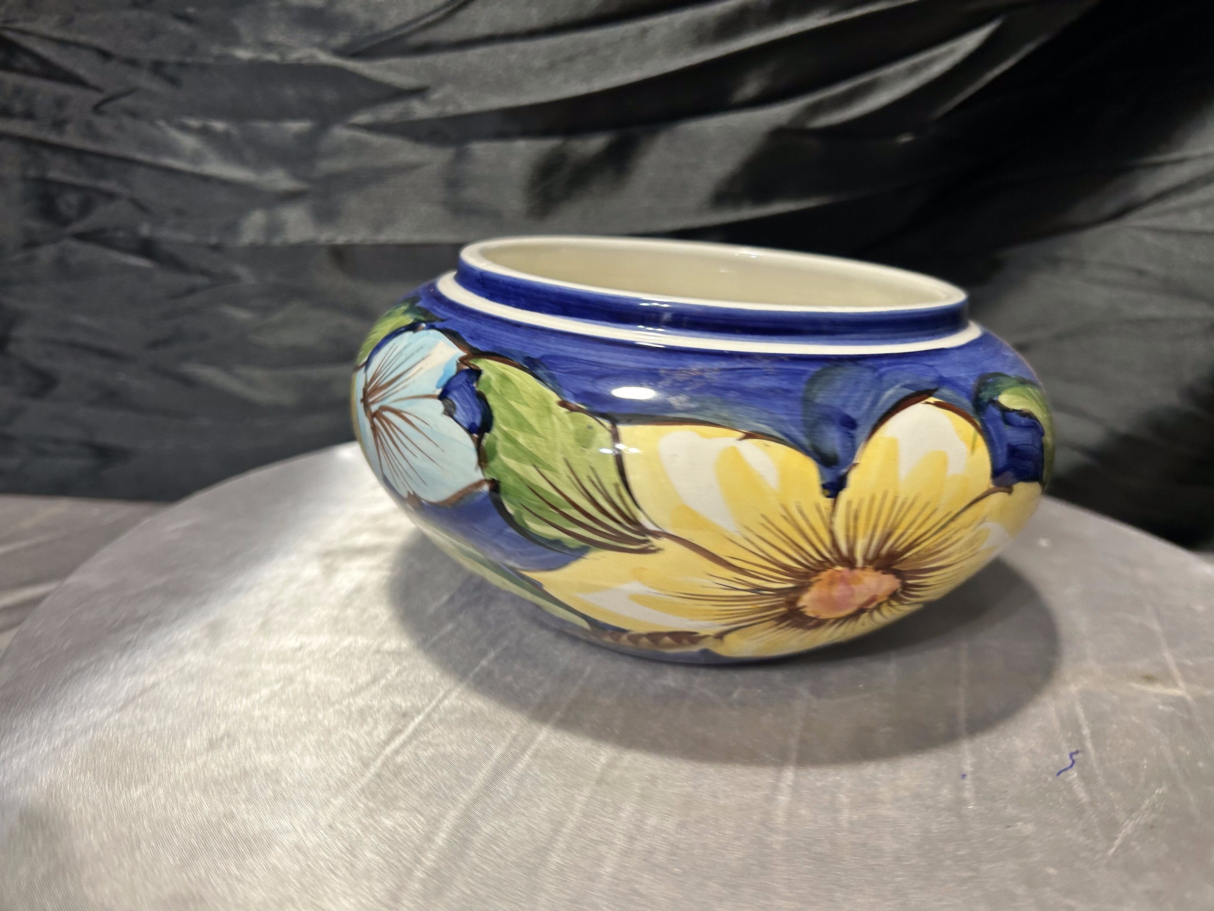 Ceramiczna misa dekoracyjna wykonana w Portugalii, ozdobiona pięknym, ręcznie malowanym motywem kwiatowym. Intensywne kolory – głęboki kobalt, zieleń oraz jasne odcienie błękitu – tworzą charakterystyczną dla portugalskiej ceramiki kompozycję inspirowaną naturą. Duże, stylizowane kwiaty nadają naczyniu świeży, wiosenny charakter i sprawiają, że misa przyciąga wzrok.