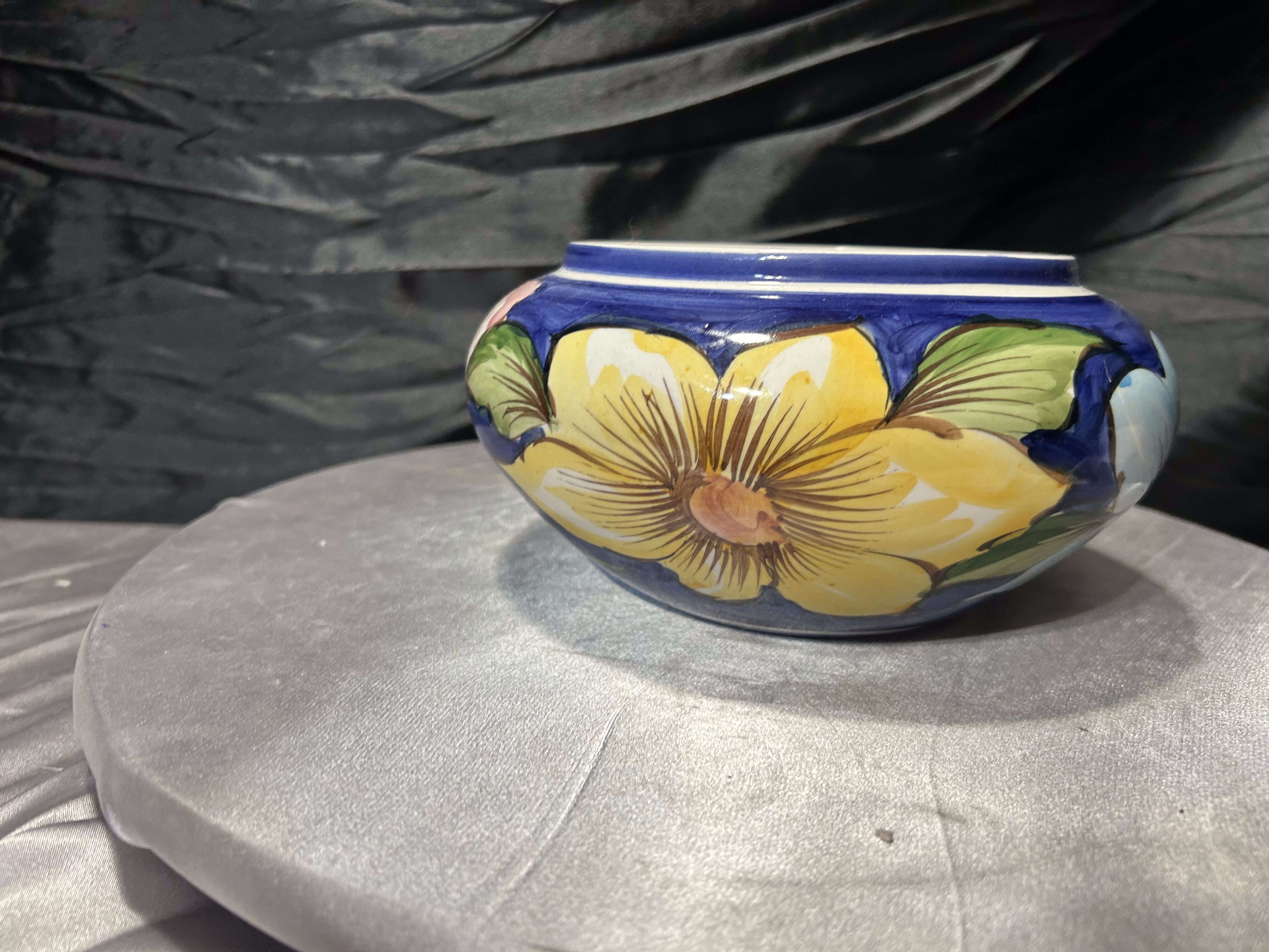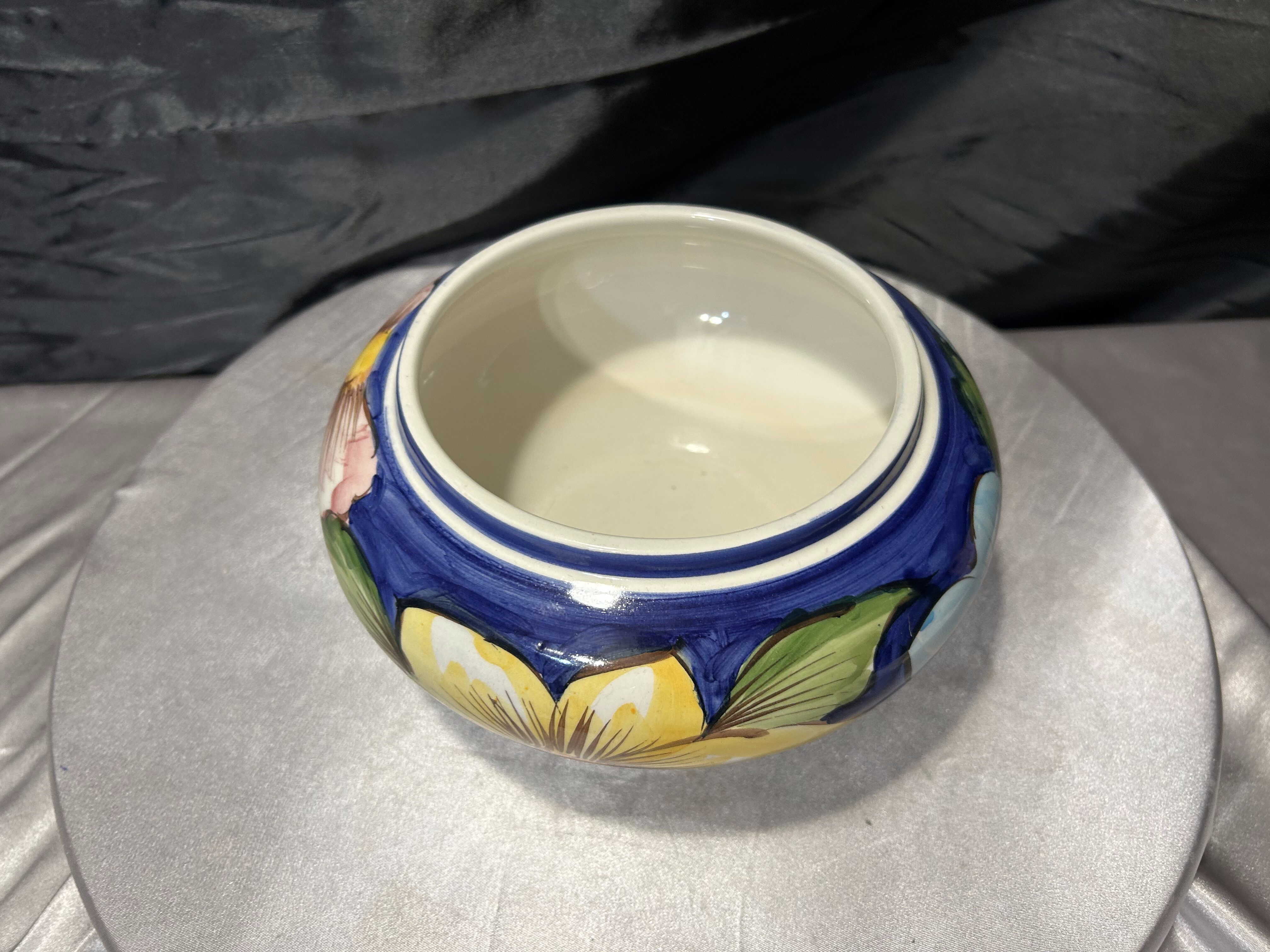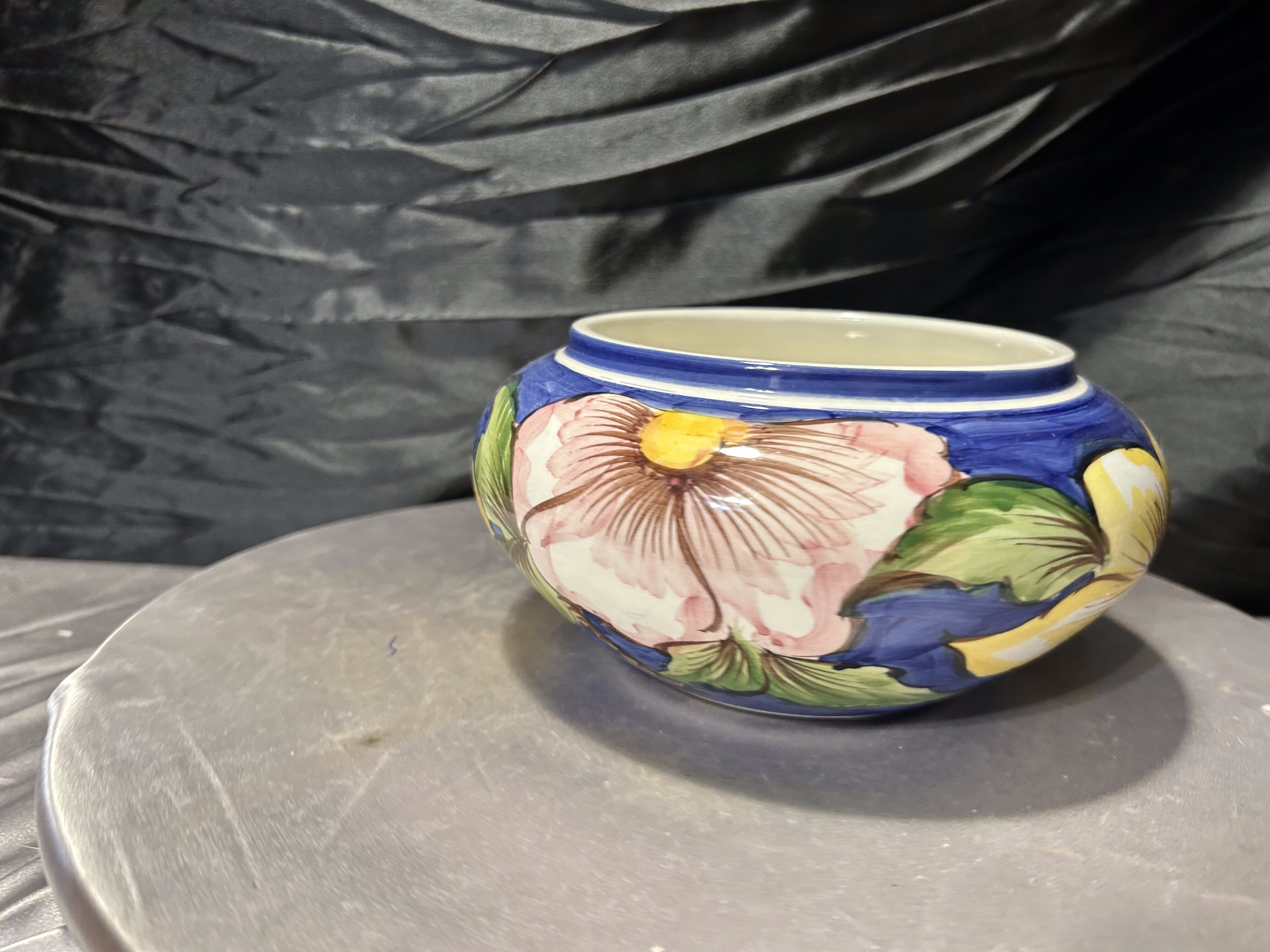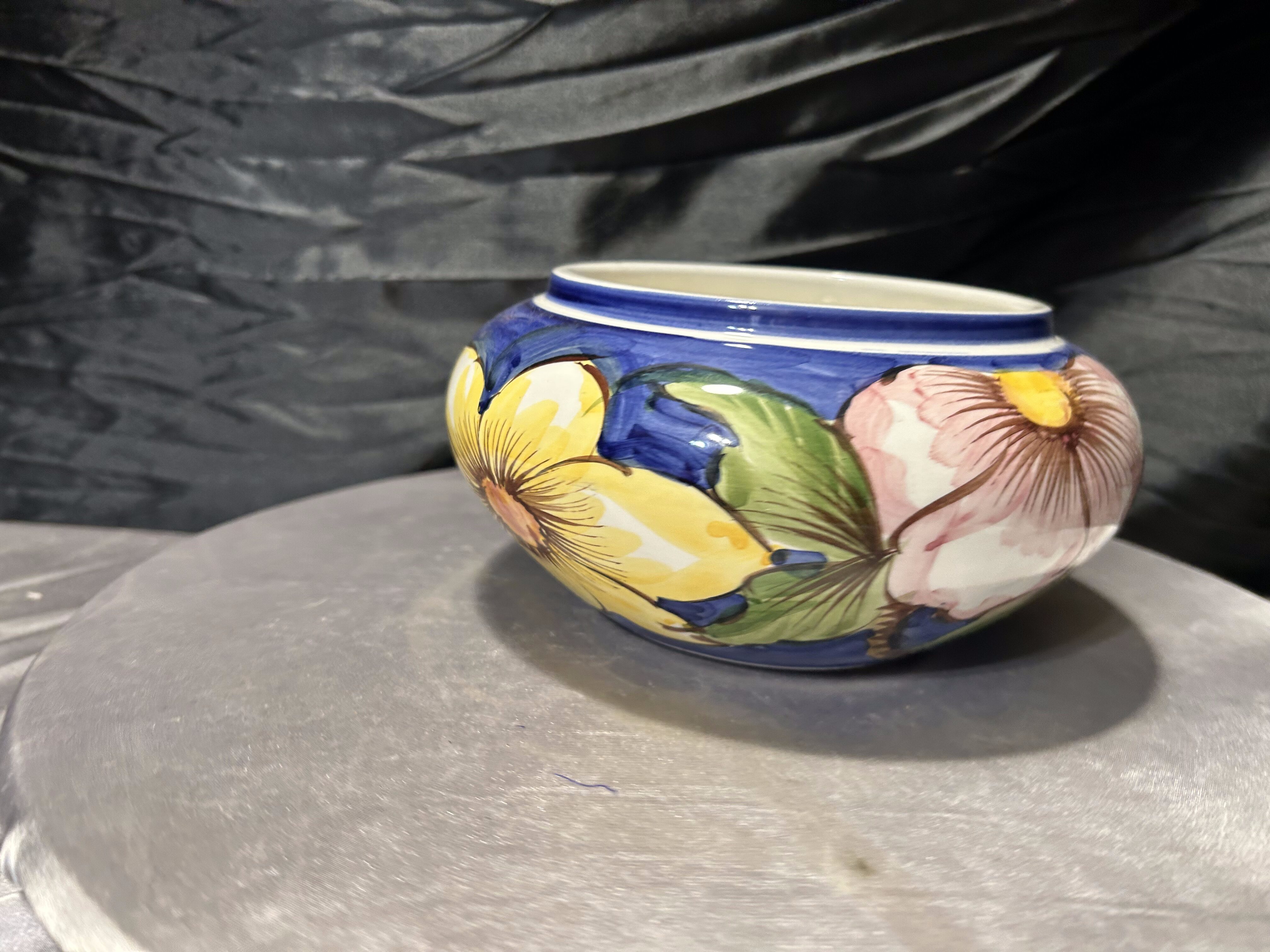 Ceramiczna misa dekoracyjna wykonana w Portugalii, ozdobiona pięknym, ręcznie malowanym motywem kwiatowym. Intensywne kolory – głęboki kobalt, zieleń oraz jasne odcienie błękitu – tworzą charakterystyczną dla portugalskiej ceramiki kompozycję inspirowaną naturą. Duże, stylizowane kwiaty nadają naczyniu świeży, wiosenny charakter i sprawiają, że misa przyciąga wzrok.
