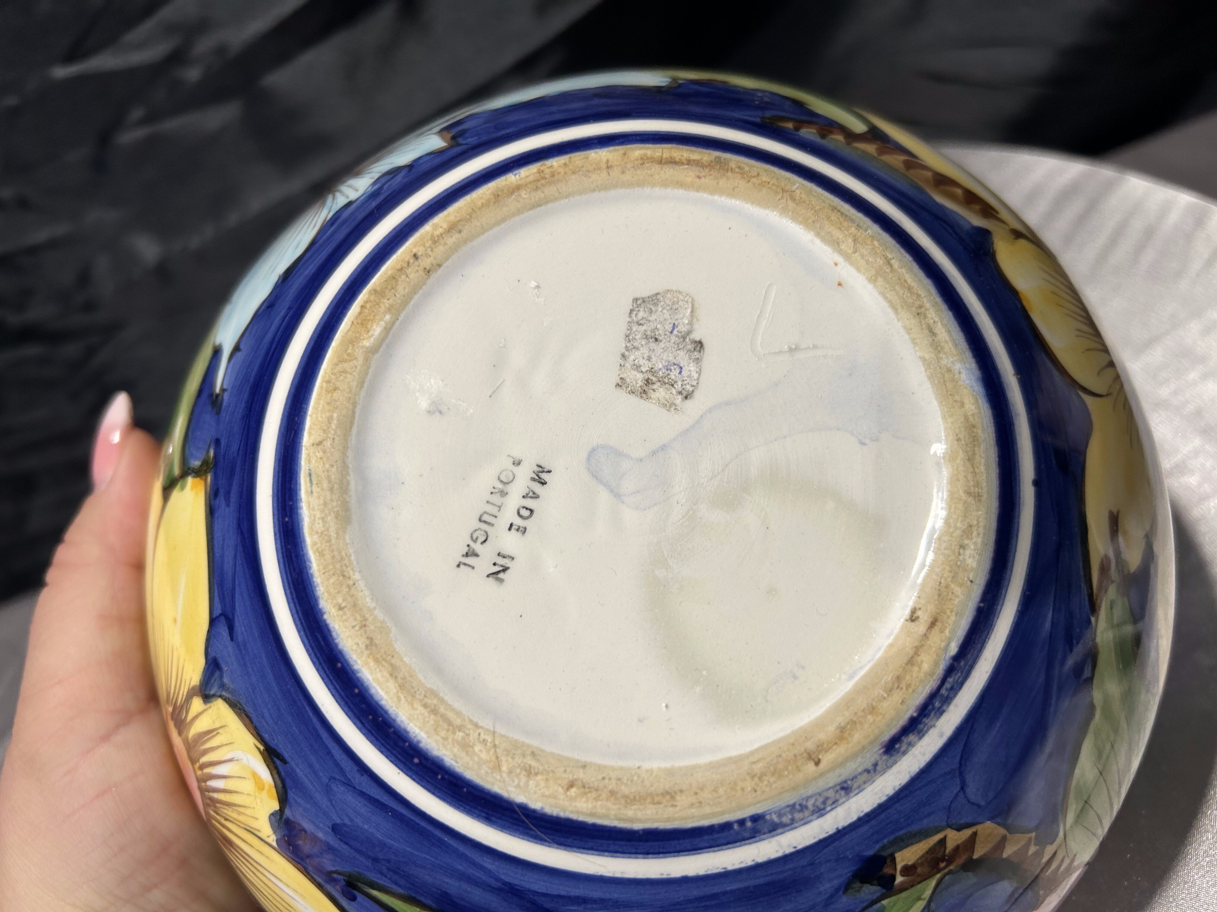 Na spodzie znajduje się sygnatura Made in Portugal, która wskazuje na produkcję w jednej z portugalskich manufaktur ceramicznych. Portugalia od wielu lat słynie z tradycji ręcznego zdobienia ceramiki – naczynia powstają często w niewielkich warsztatach, gdzie każdy egzemplarz jest malowany indywidualnie, dzięki czemu wzory mogą się delikatnie różnić.