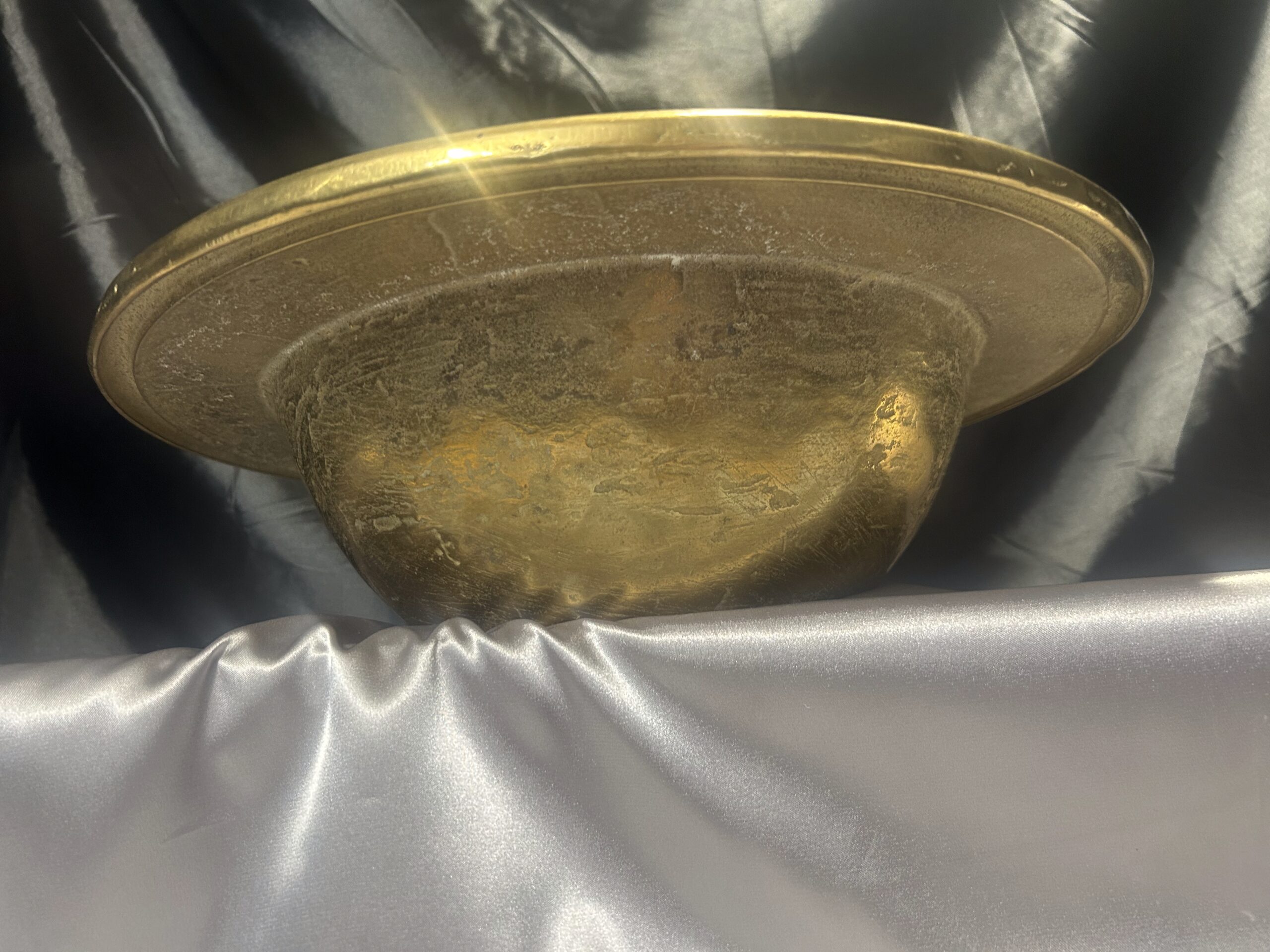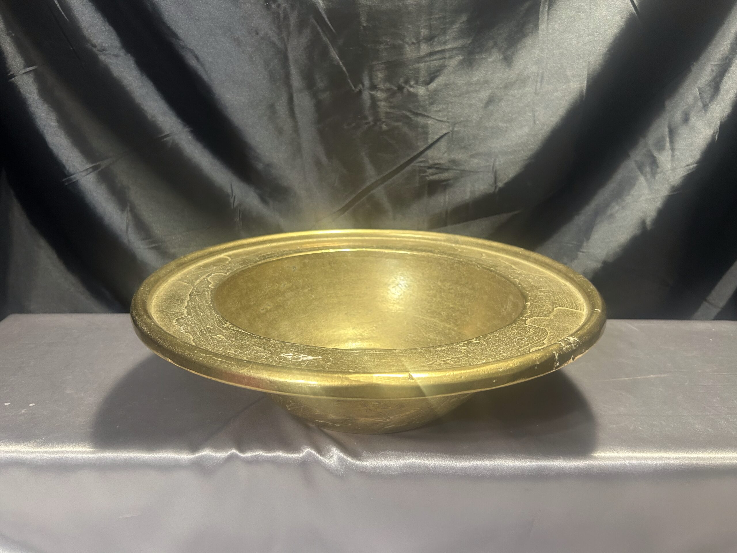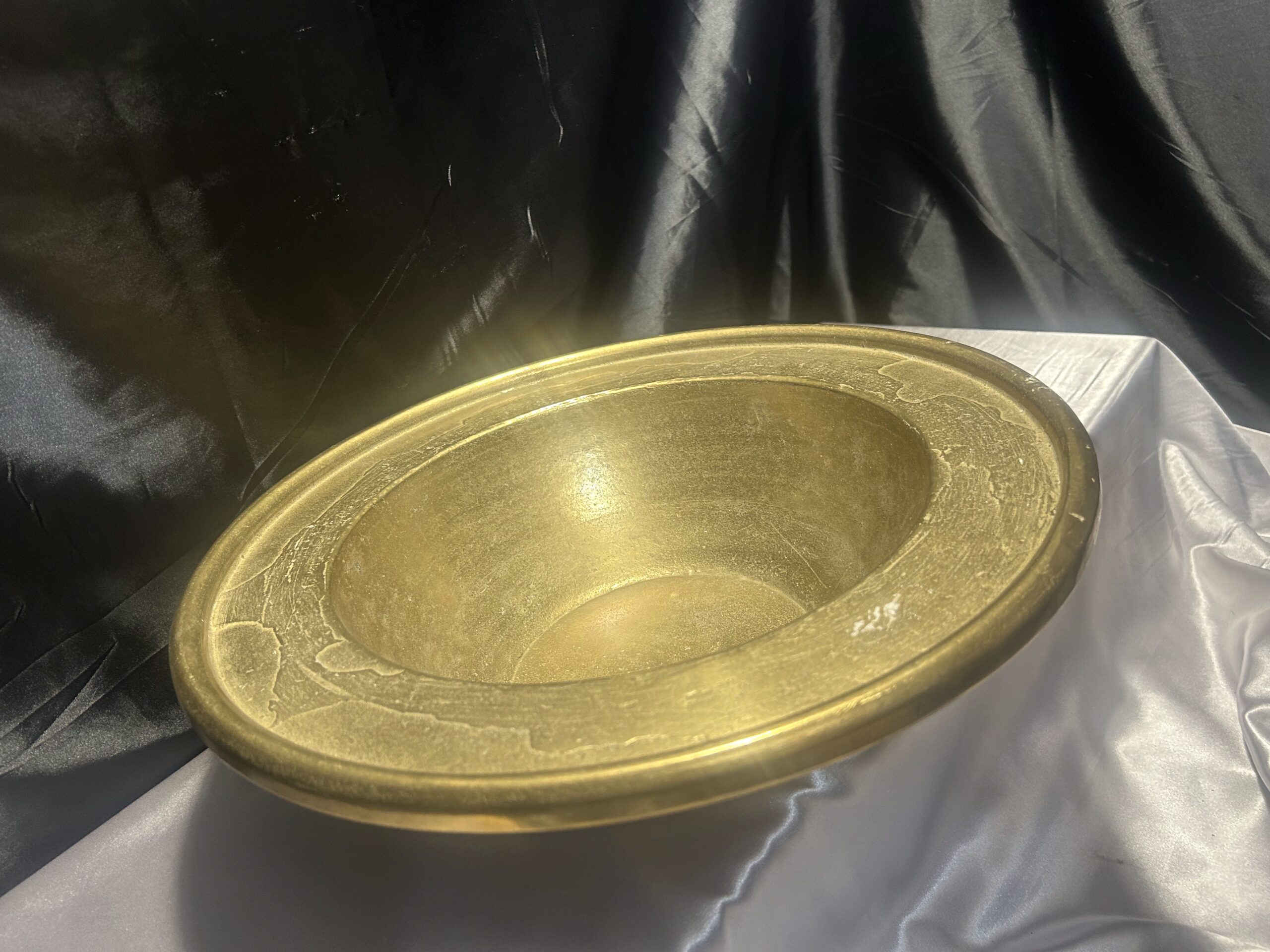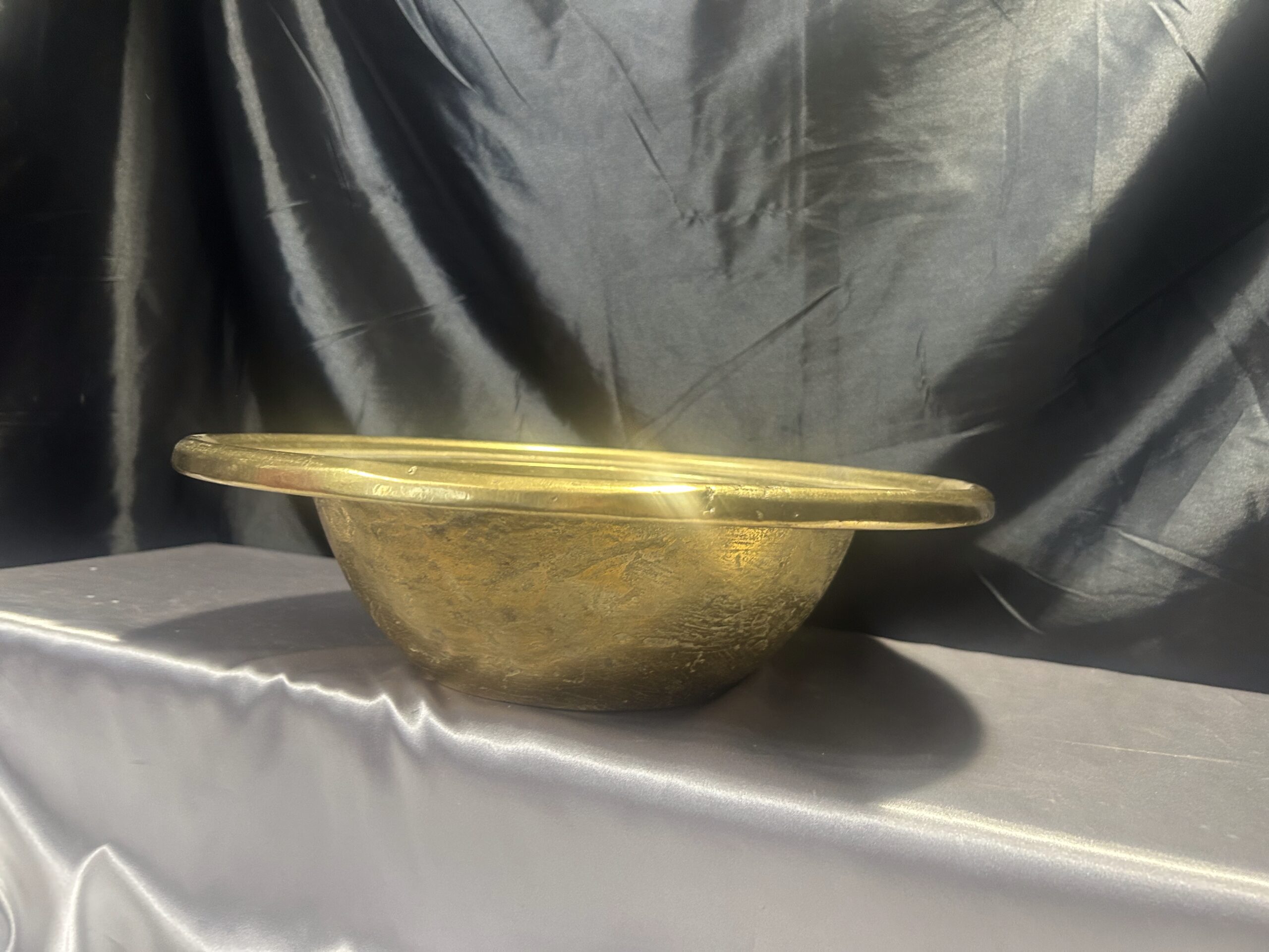 Niepowtarzalna i wyjątkowa misa patera wykonana z wysokiej jakości mosiądzu. Charakteryzuje się masywną konstrukcją (waga 5,8 kg), szerokim zdobionym rantem oraz głębokim, eleganckim kształtem. Idealna jako element dekoracyjny lub funkcjonalny do przechowywania.