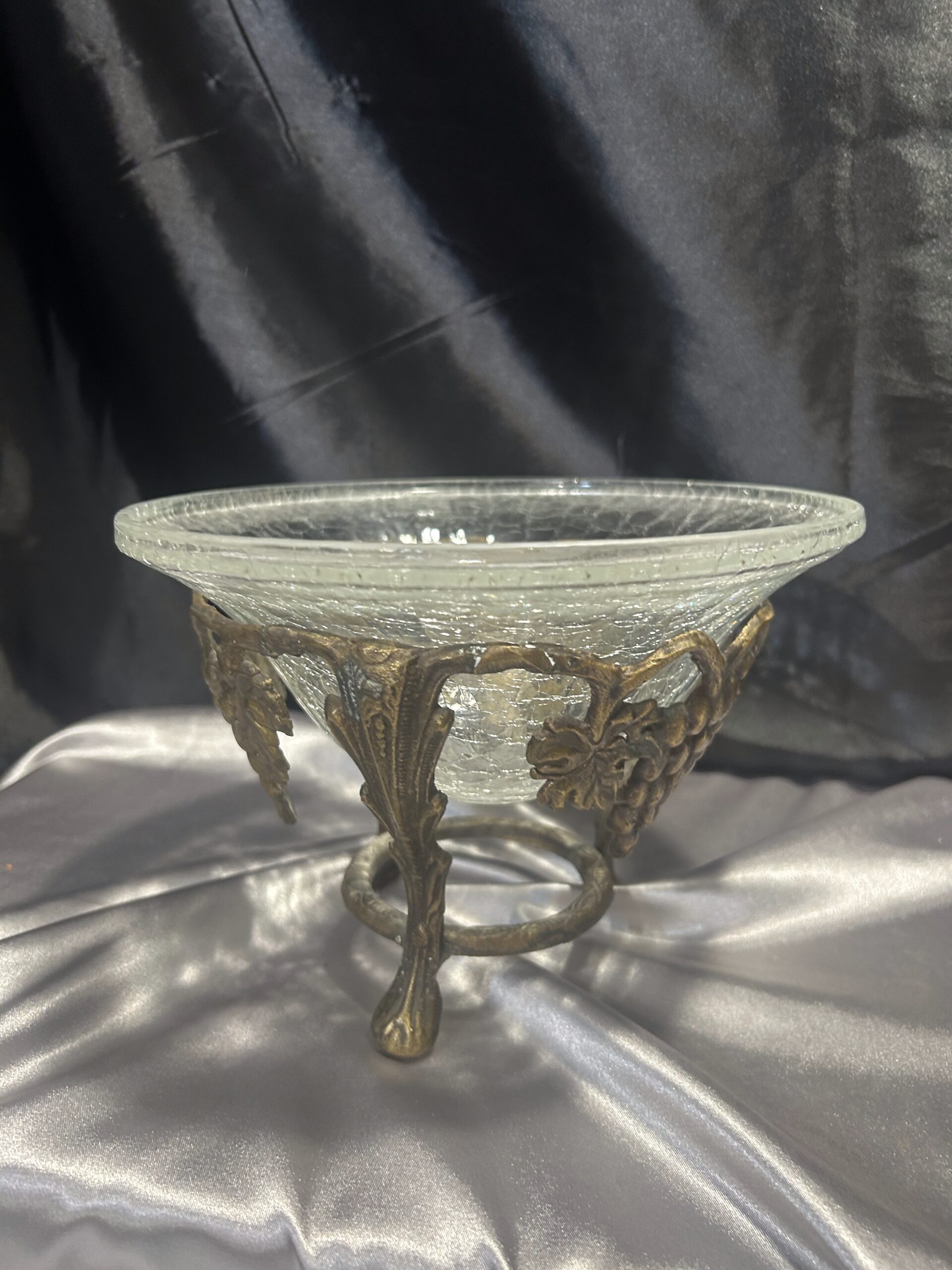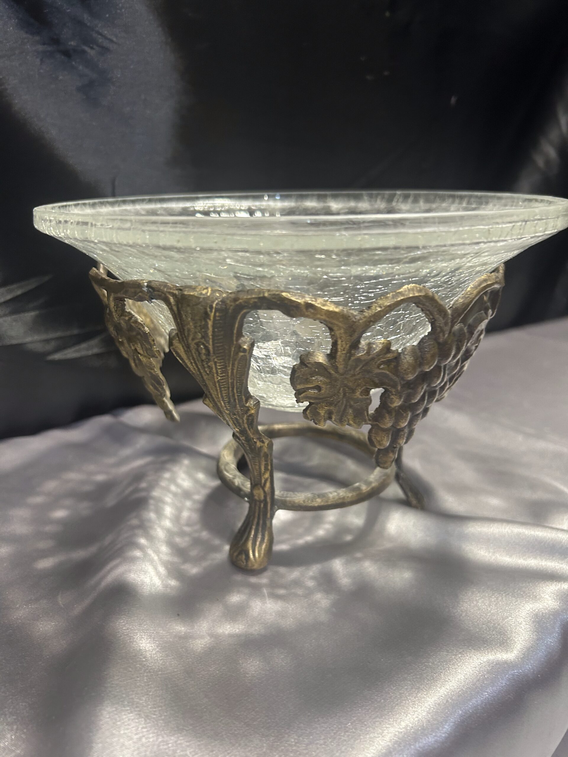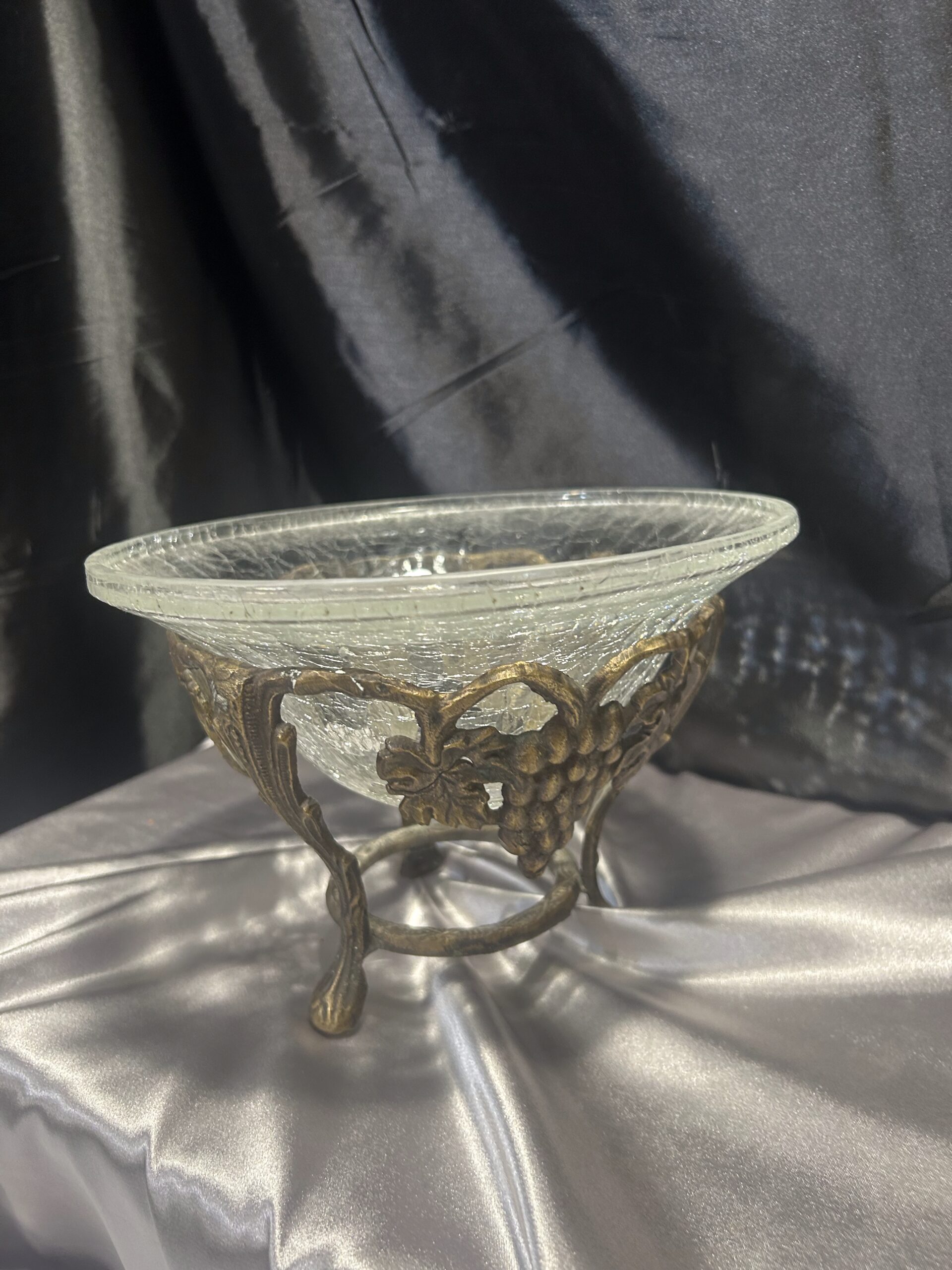 Wyjątkowa dekoracyjna misa / patera, będąca połączeniem efektownego popękanego szkła i bogato zdobionego mosiądzu. Eleganckie zdobienia z motywem winogron i liści winorośli nadają jej klasyczny i luksusowy charakter. Stojąca na ozdobnych nogach, stanowi zarówno praktyczny element użytkowy, jak i piękną ozdobę wnętrza.