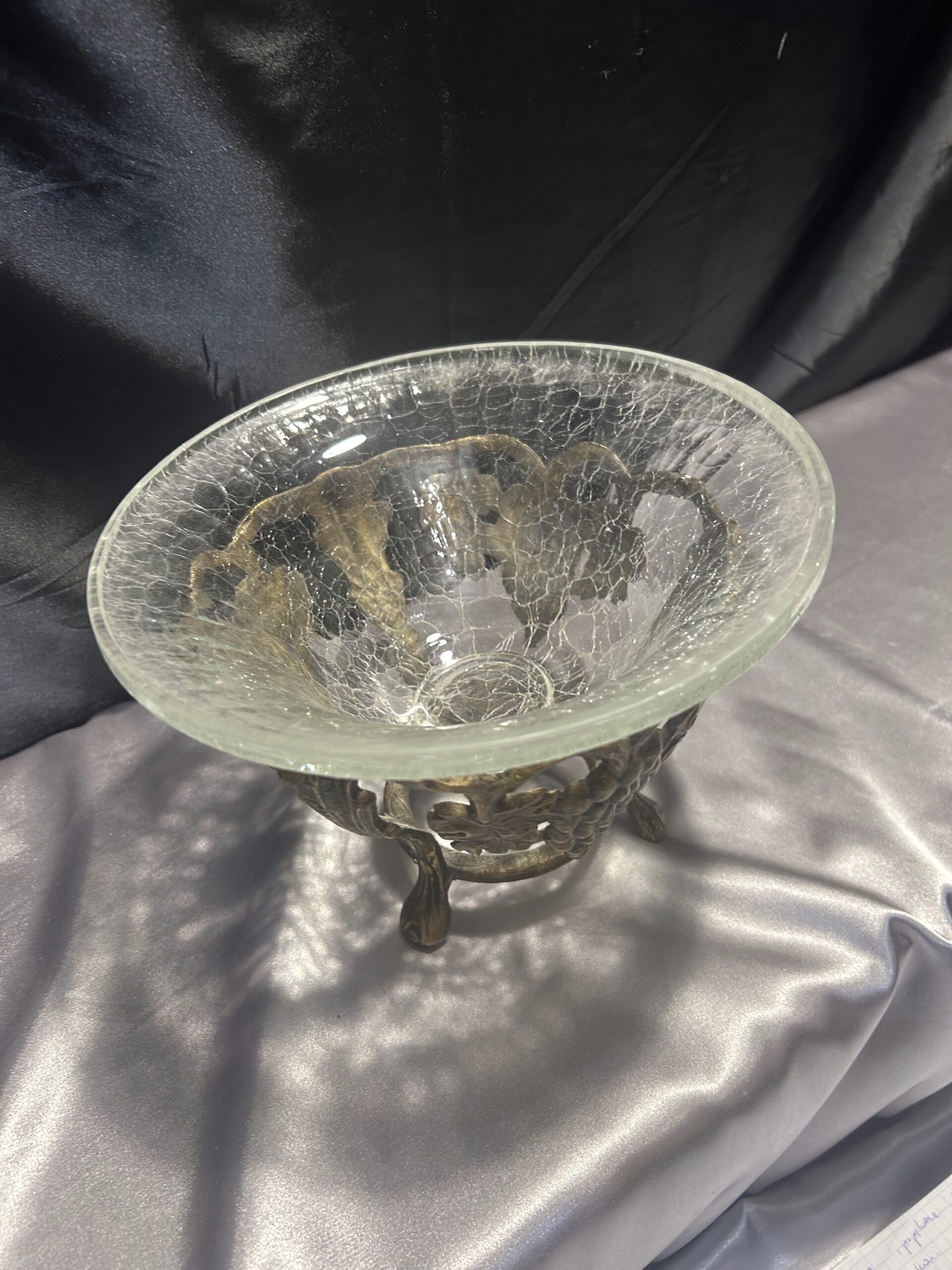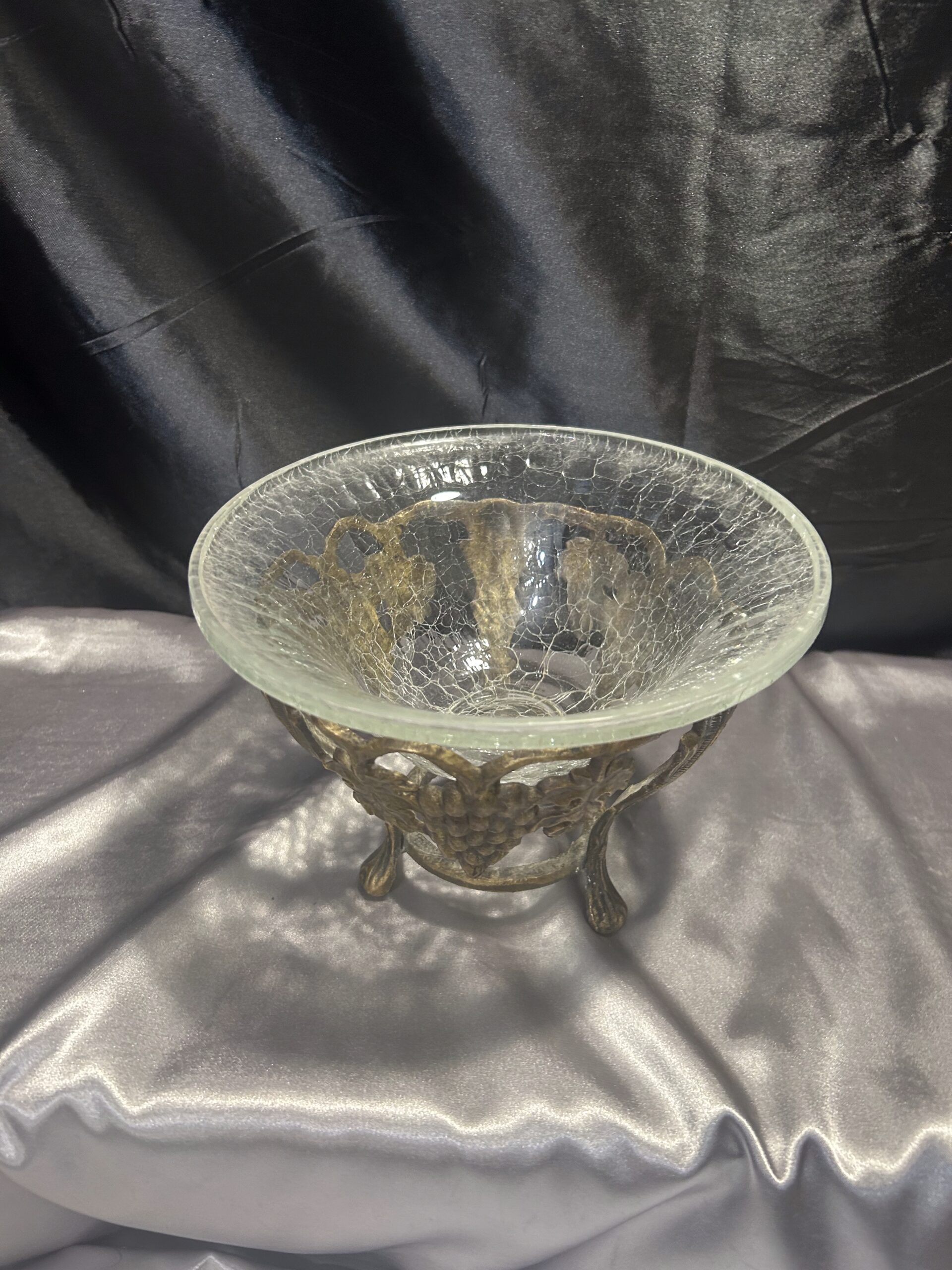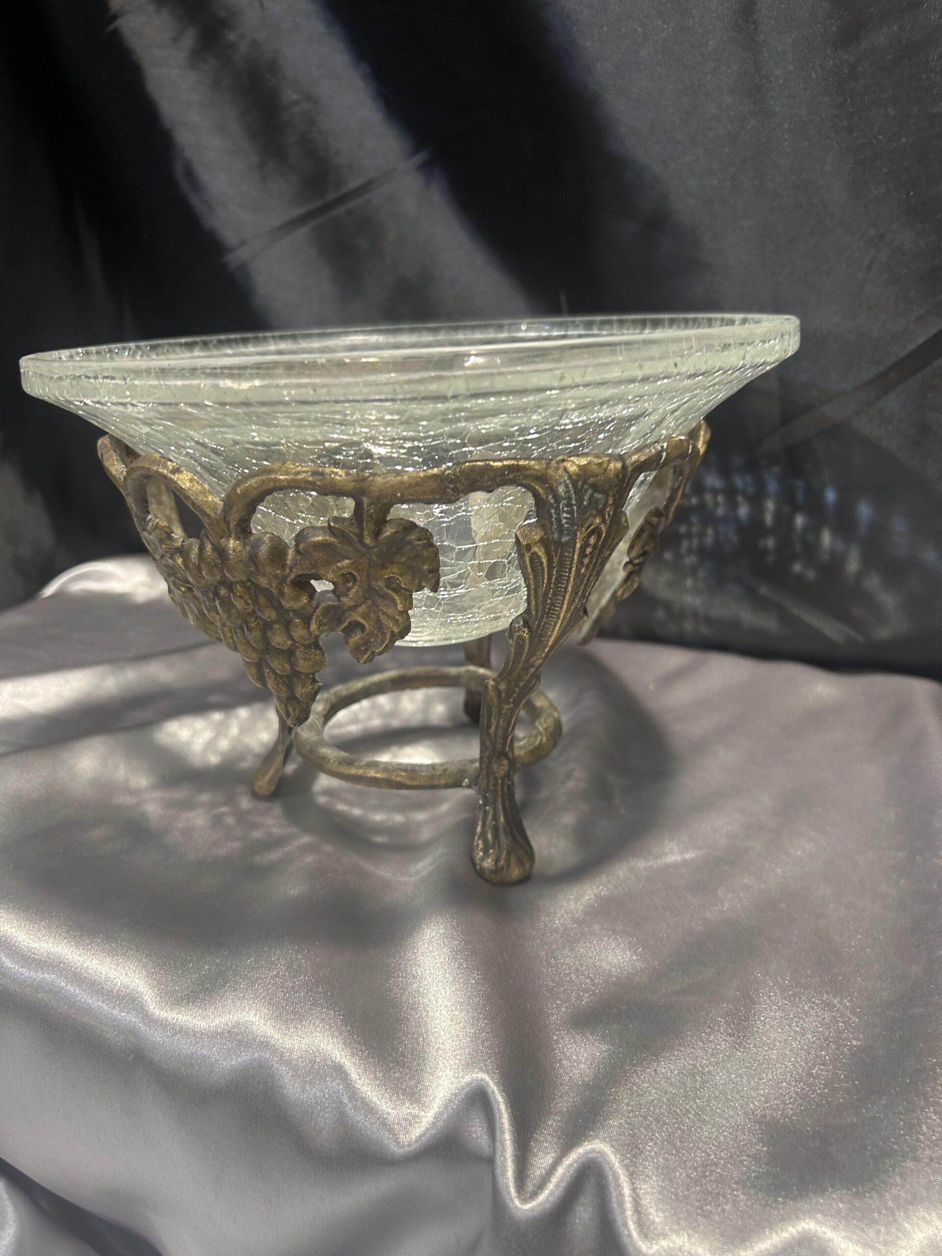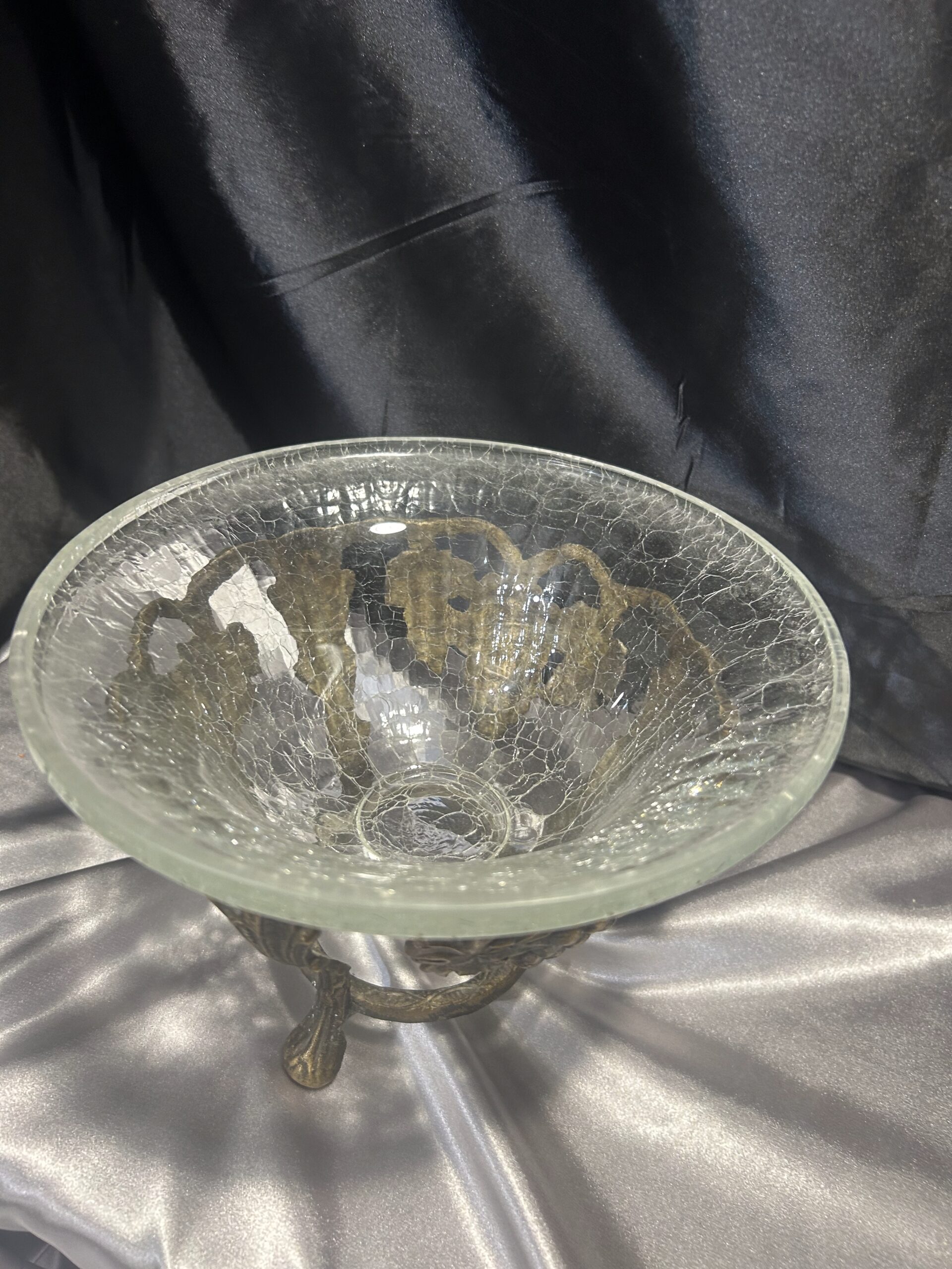 Wyjątkowa dekoracyjna misa / patera, będąca połączeniem efektownego popękanego szkła i bogato zdobionego mosiądzu. Eleganckie zdobienia z motywem winogron i liści winorośli nadają jej klasyczny i luksusowy charakter. Stojąca na ozdobnych nogach, stanowi zarówno praktyczny element użytkowy, jak i piękną ozdobę wnętrza.