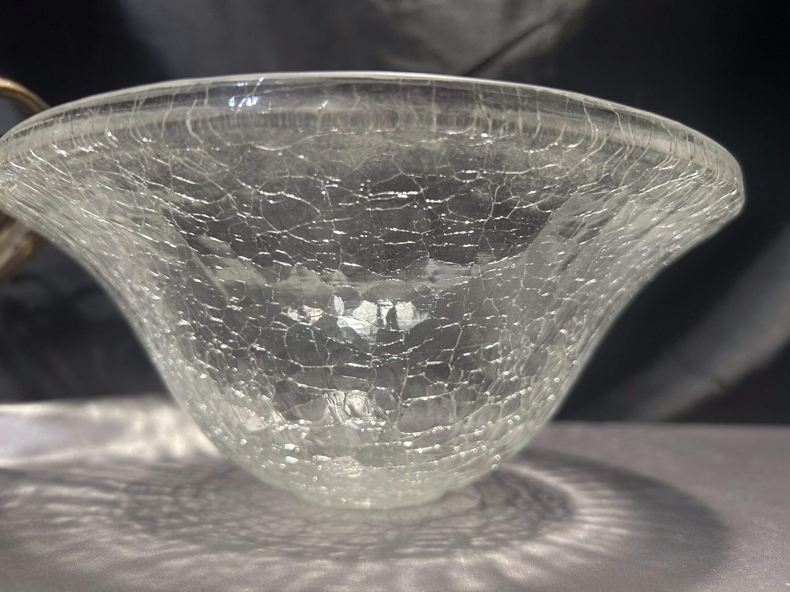Ta elegancka misa z popękanego szkła i zdobionego mosiądzu to doskonały dodatek do wnętrz w stylu klasycznym, vintage oraz glamour. Jej wyjątkowy design sprawia, że pięknie prezentuje się na stole, komodzie czy w witrynie. Doskonała jako element dekoracyjny lub użytkowy, przyciąga wzrok i podkreśla elegancję wnętrza.
