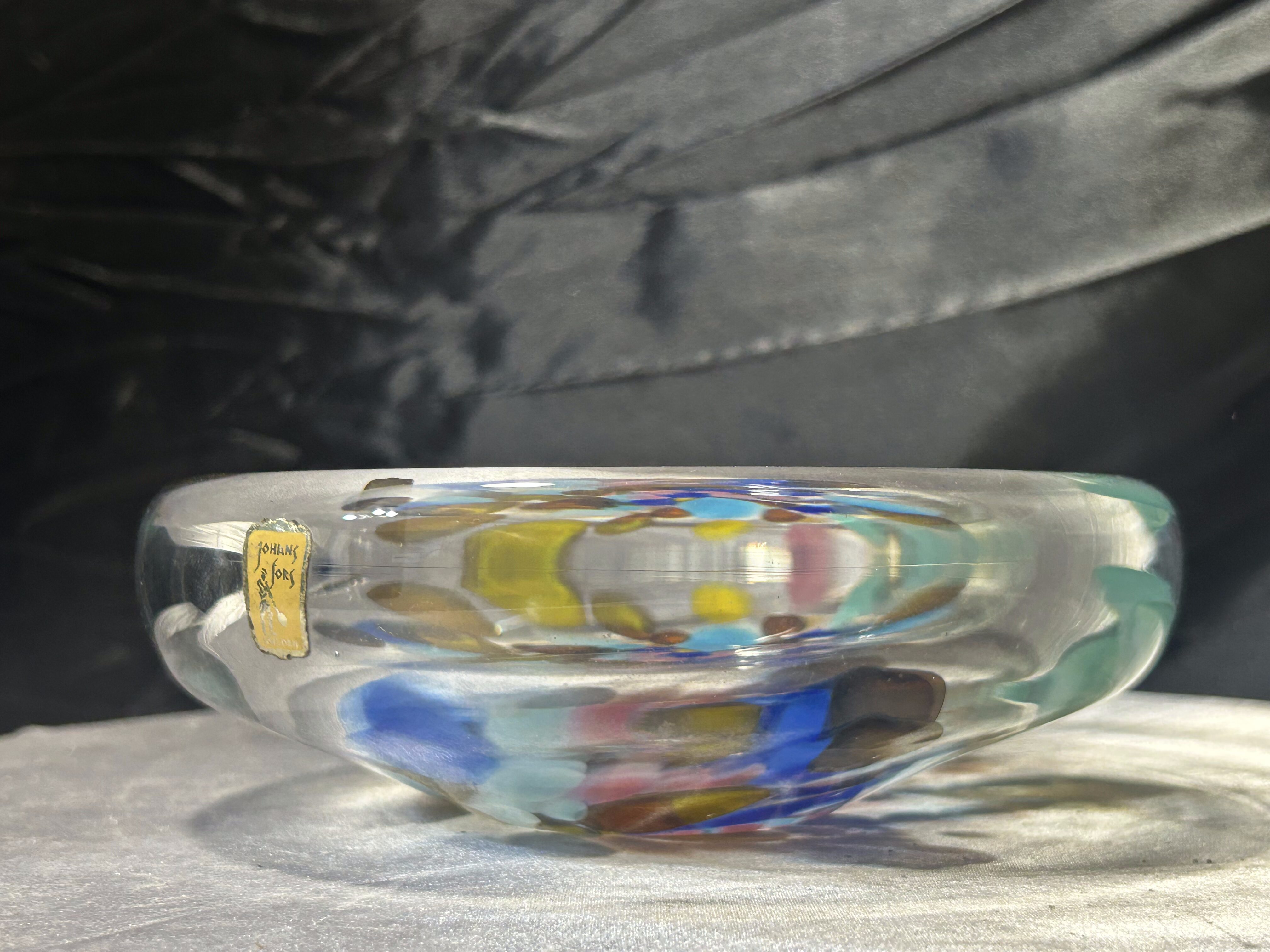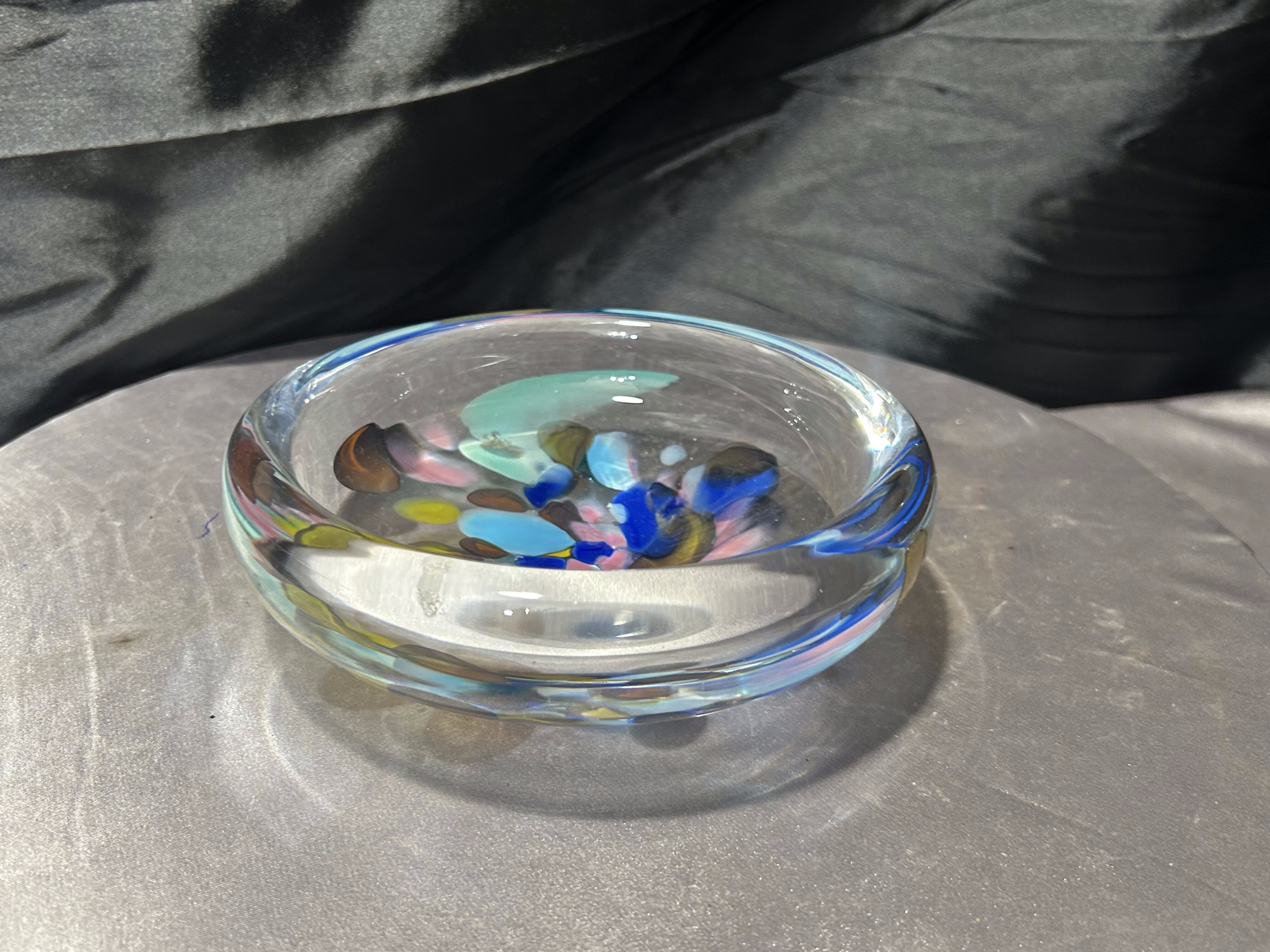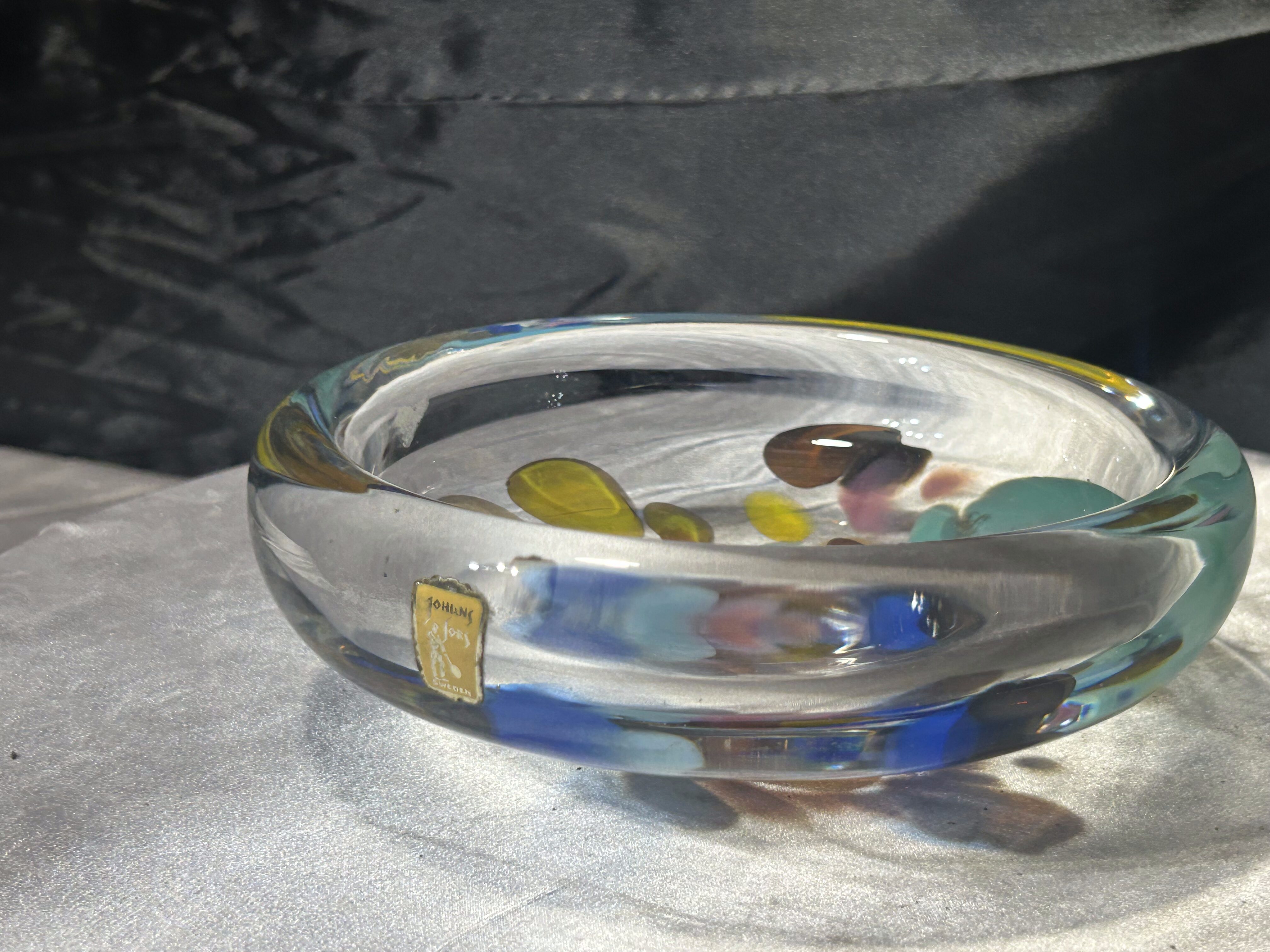 Efektowna misa typu puzderko wykonana z artystycznego szkła szwedzkiego. Transparentna forma została wzbogacona barwnymi wstawkami w odcieniach błękitu, granatu, zieleni i bursztynu, które tworzą dynamiczną, niemal malarską kompozycję. Całość ma nowoczesny, rzeźbiarski charakter i pięknie pracuje ze światłem.