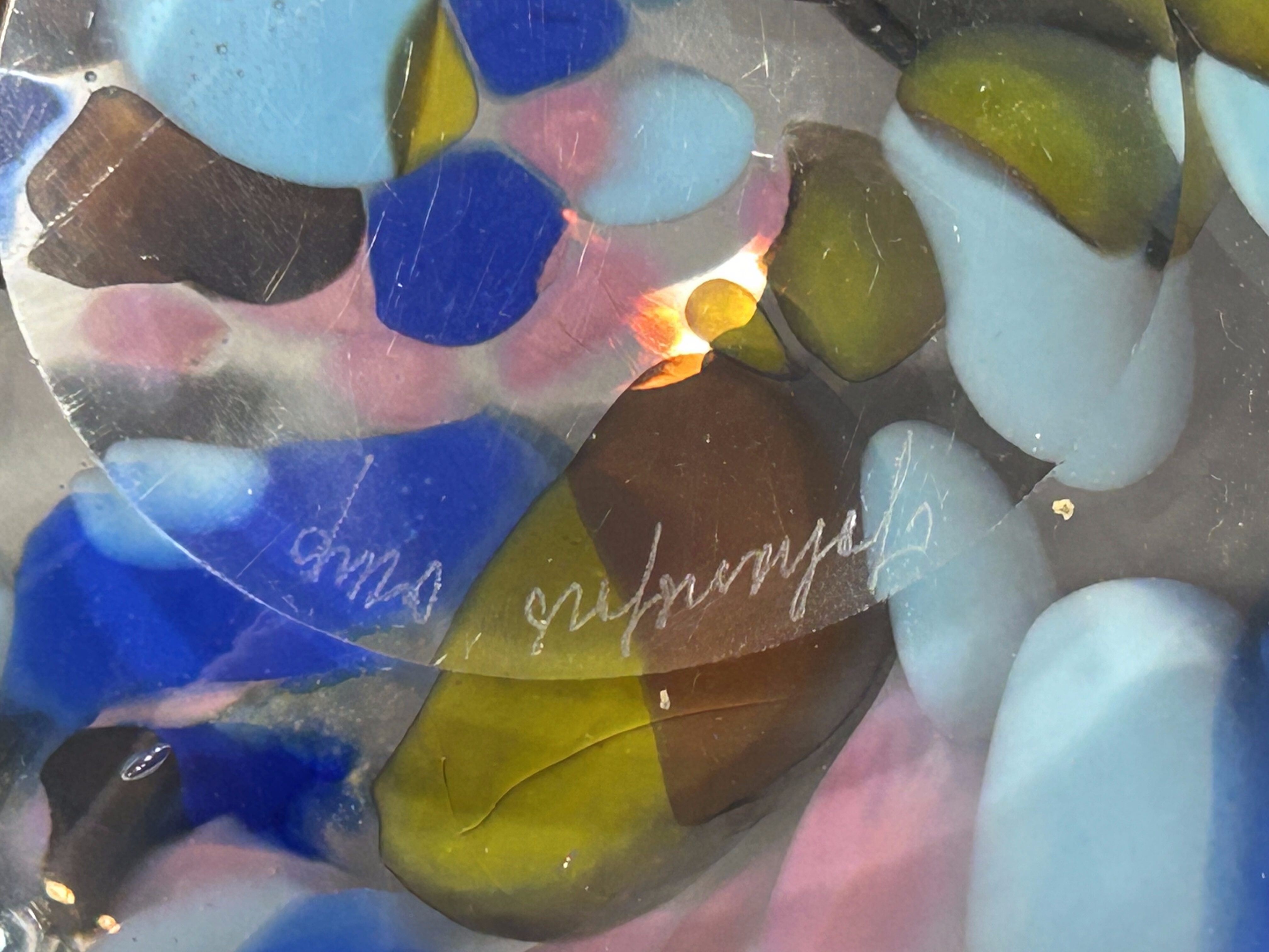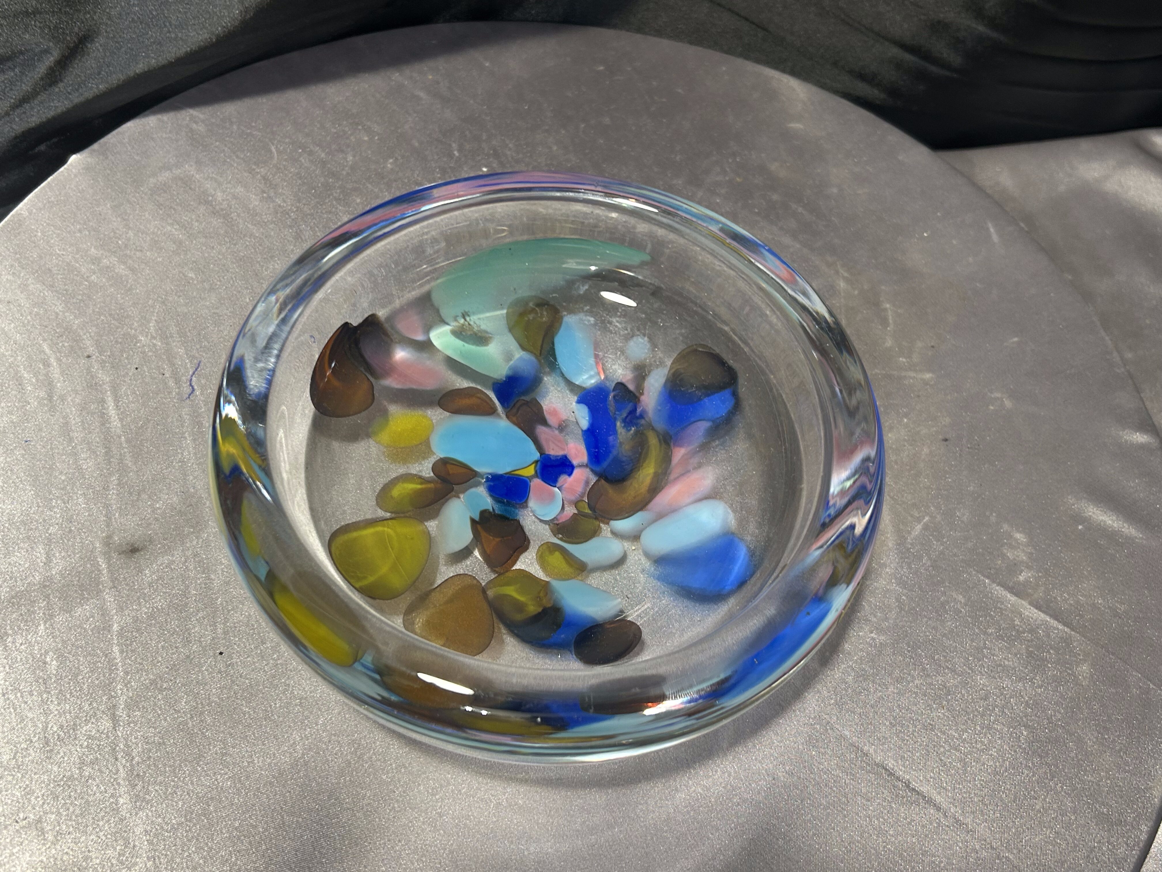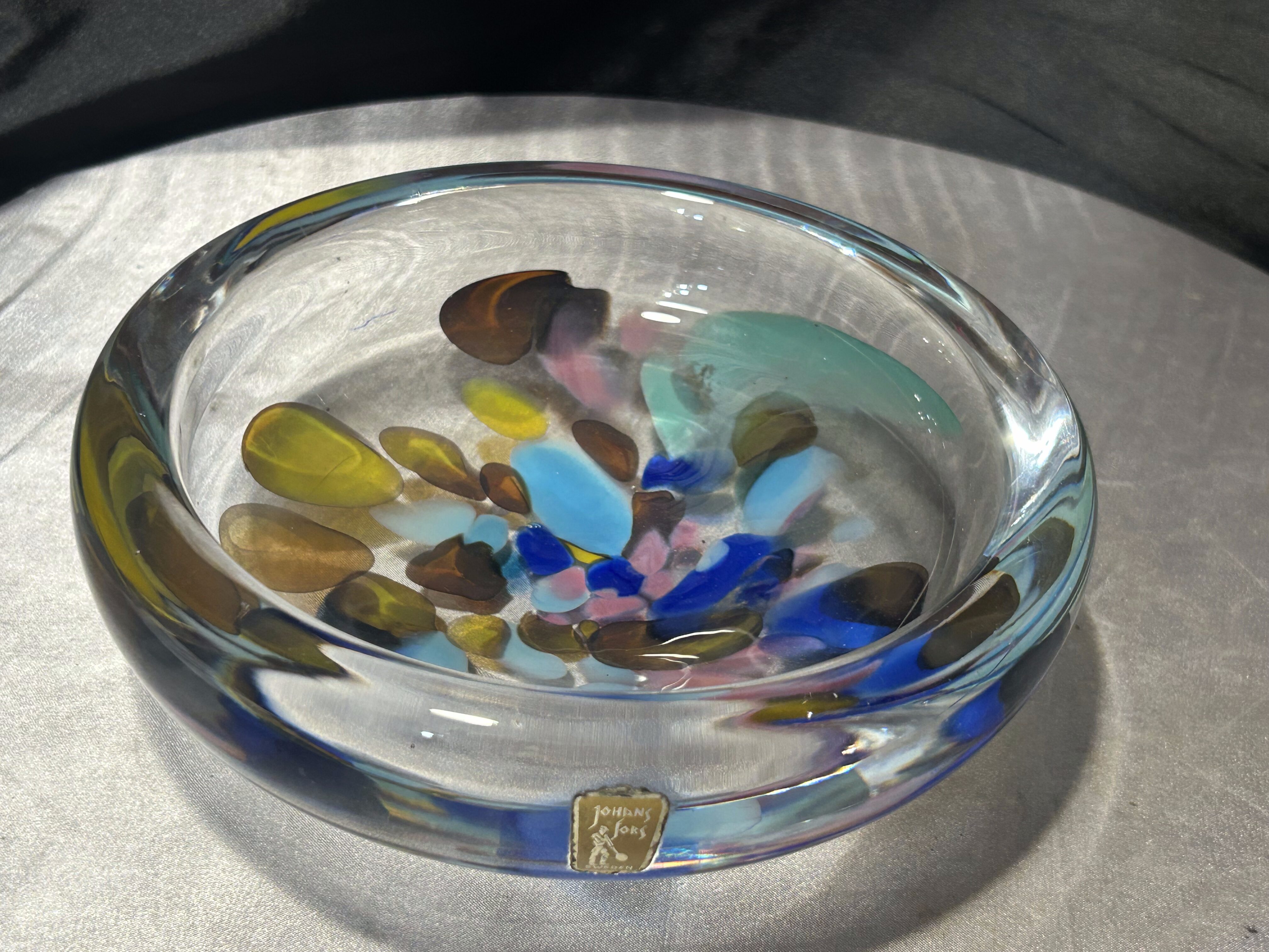 Efektowna misa typu puzderko wykonana z artystycznego szkła szwedzkiego. Transparentna forma została wzbogacona barwnymi wstawkami w odcieniach błękitu, granatu, zieleni i bursztynu, które tworzą dynamiczną, niemal malarską kompozycję. Całość ma nowoczesny, rzeźbiarski charakter i pięknie pracuje ze światłem.