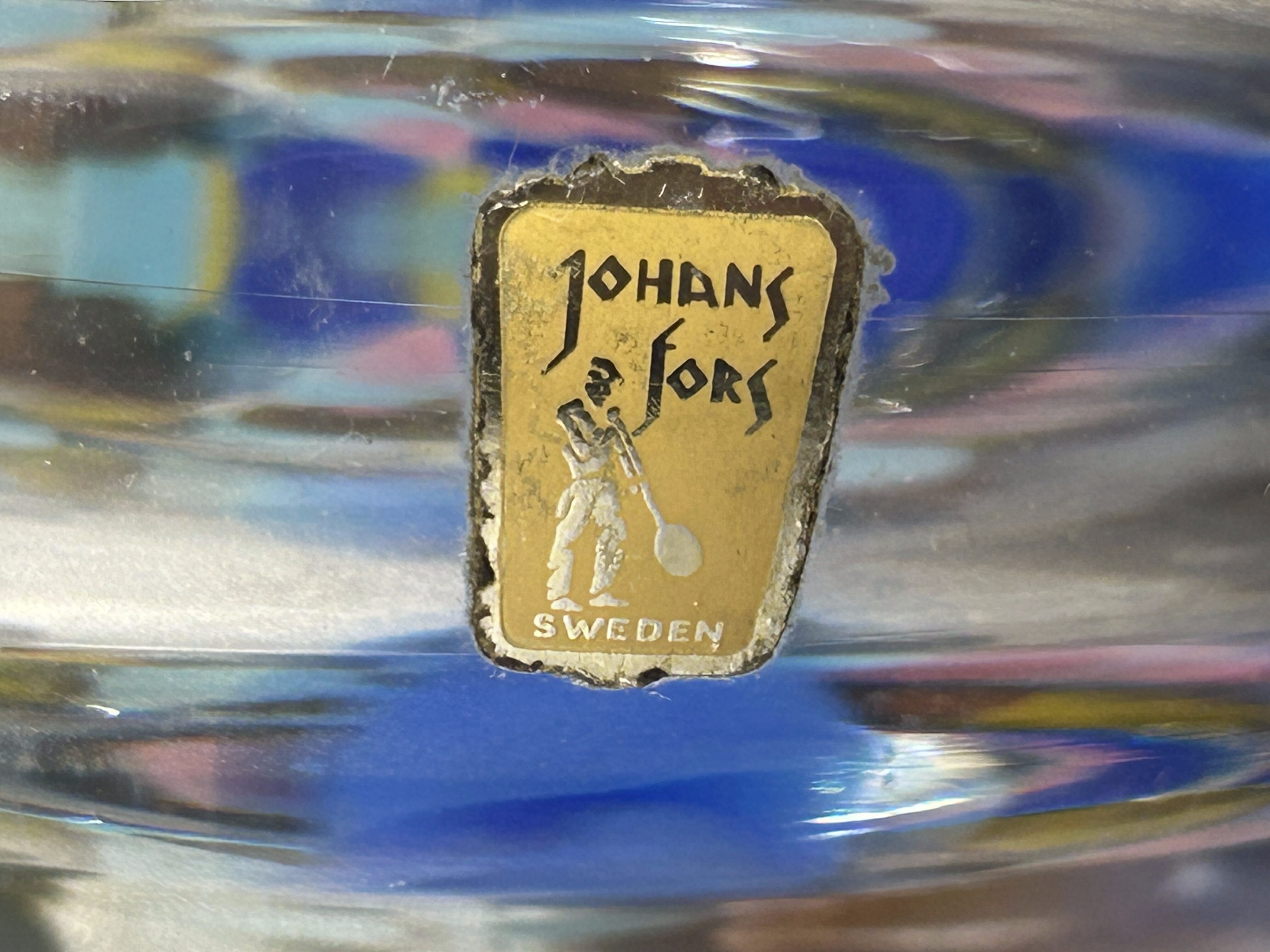 Egzemplarz sygnowany zarówno oryginalną naklejką huty Johansfors, jak i odręcznym podpisem projektanta od spodu, co potwierdza jego autentyczność i kolekcjonerską wartość.