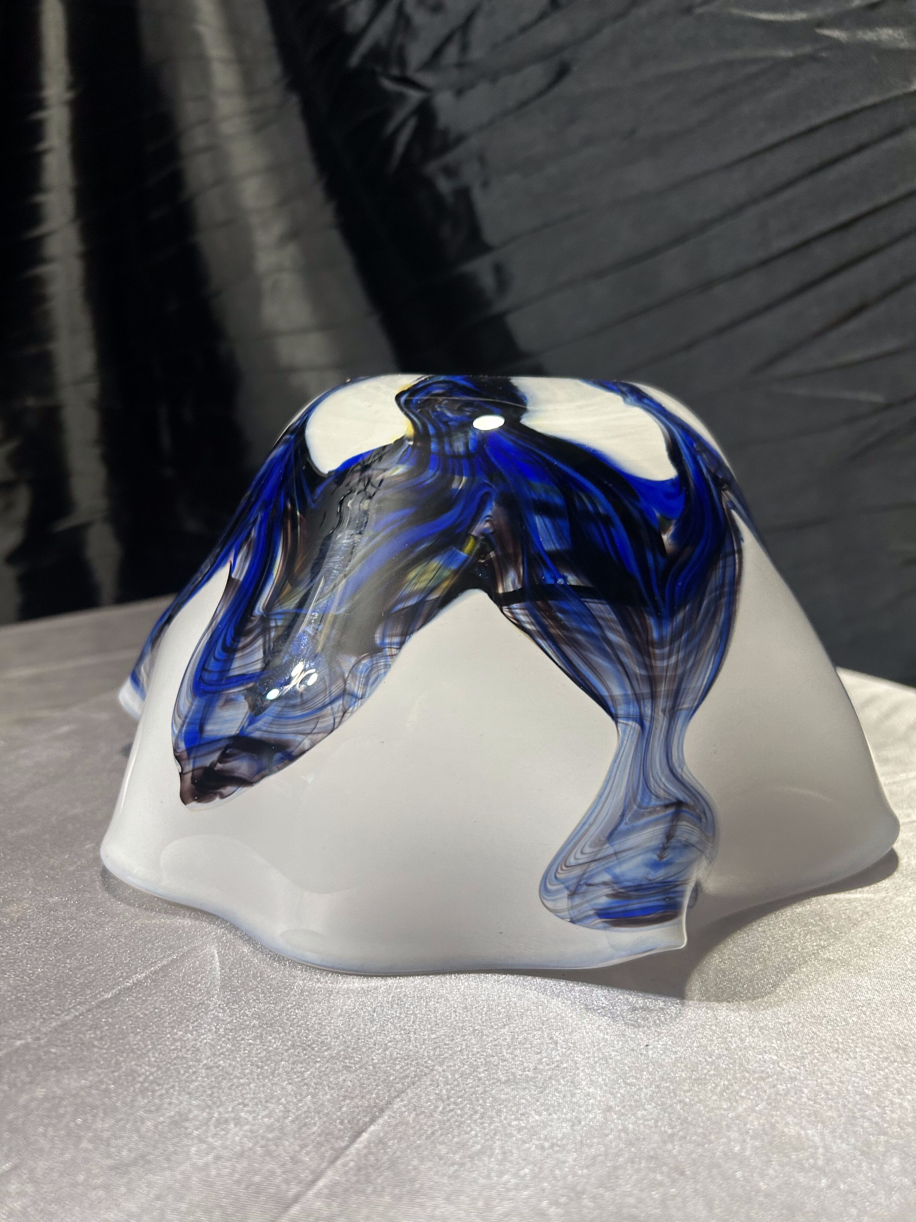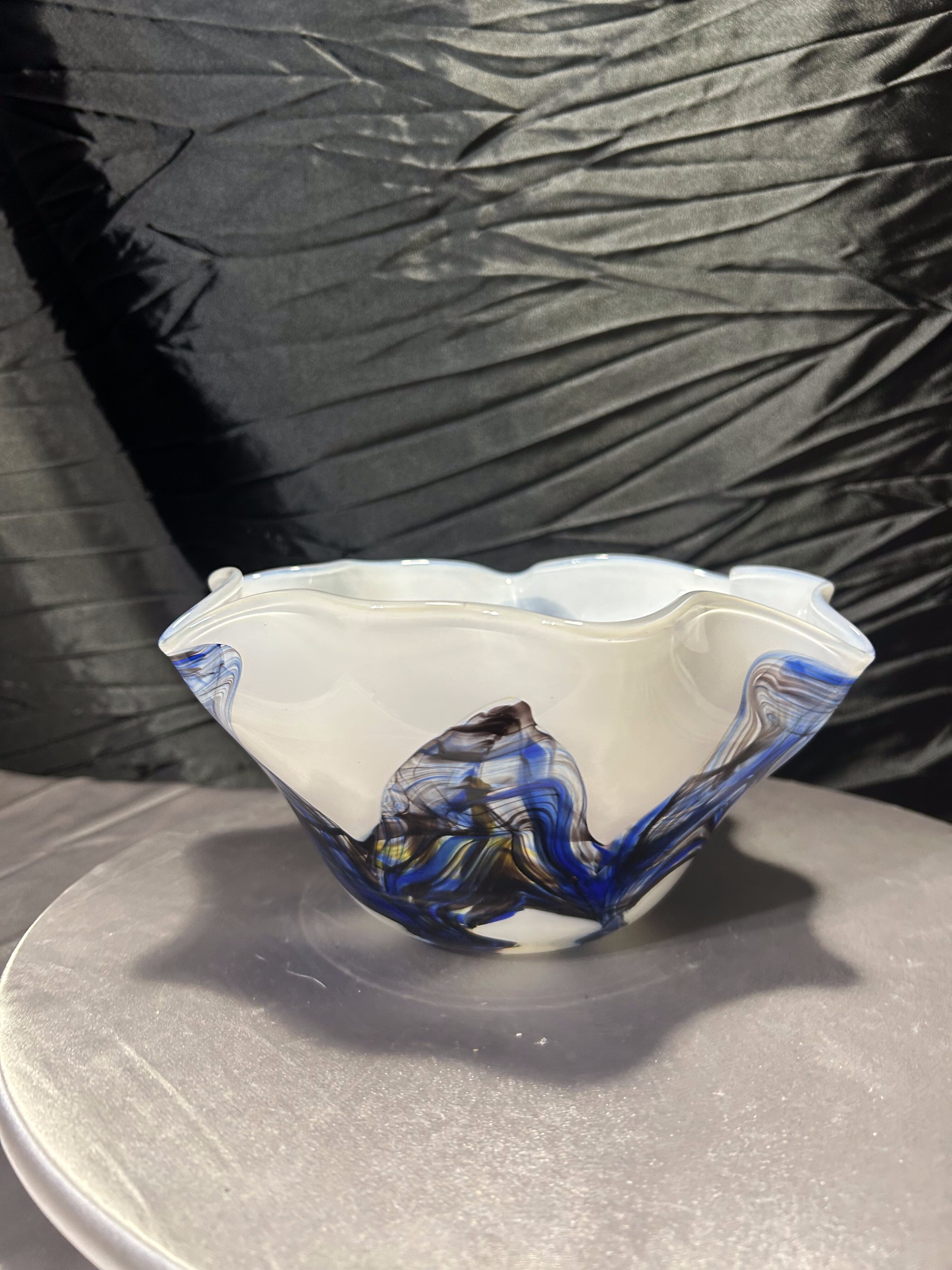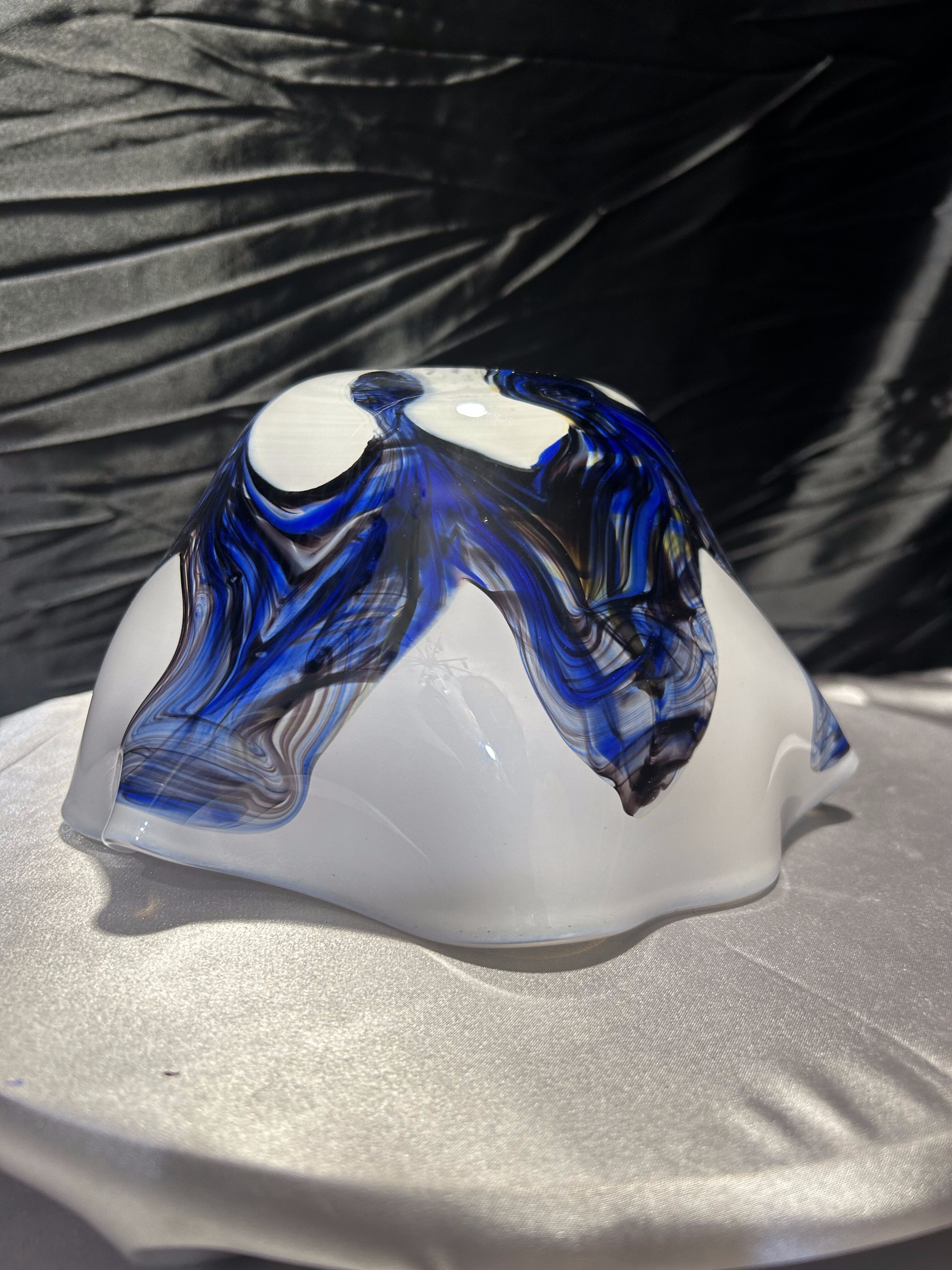 Artystyczna misa wykonana ze szkła w stylu Murano, zachwycająca organiczną formą i subtelnym połączeniem kolorów. Dominujący odcień mlecznego szkła kontrastuje z ekspresyjnymi smugami błękitu, brązu i bursztynu, tworząc wyjątkowy efekt przypominający fale w ruchu. Każdy detal tej miski jest unikalny – to przykład rzemieślniczego kunsztu i wyczucia estetyki charakterystycznego dla szkła murano. Cięższa niż typowe misy szklane, doskonale prezentuje się jako samodzielna dekoracja, a także jako centralny element eleganckiego stołu.