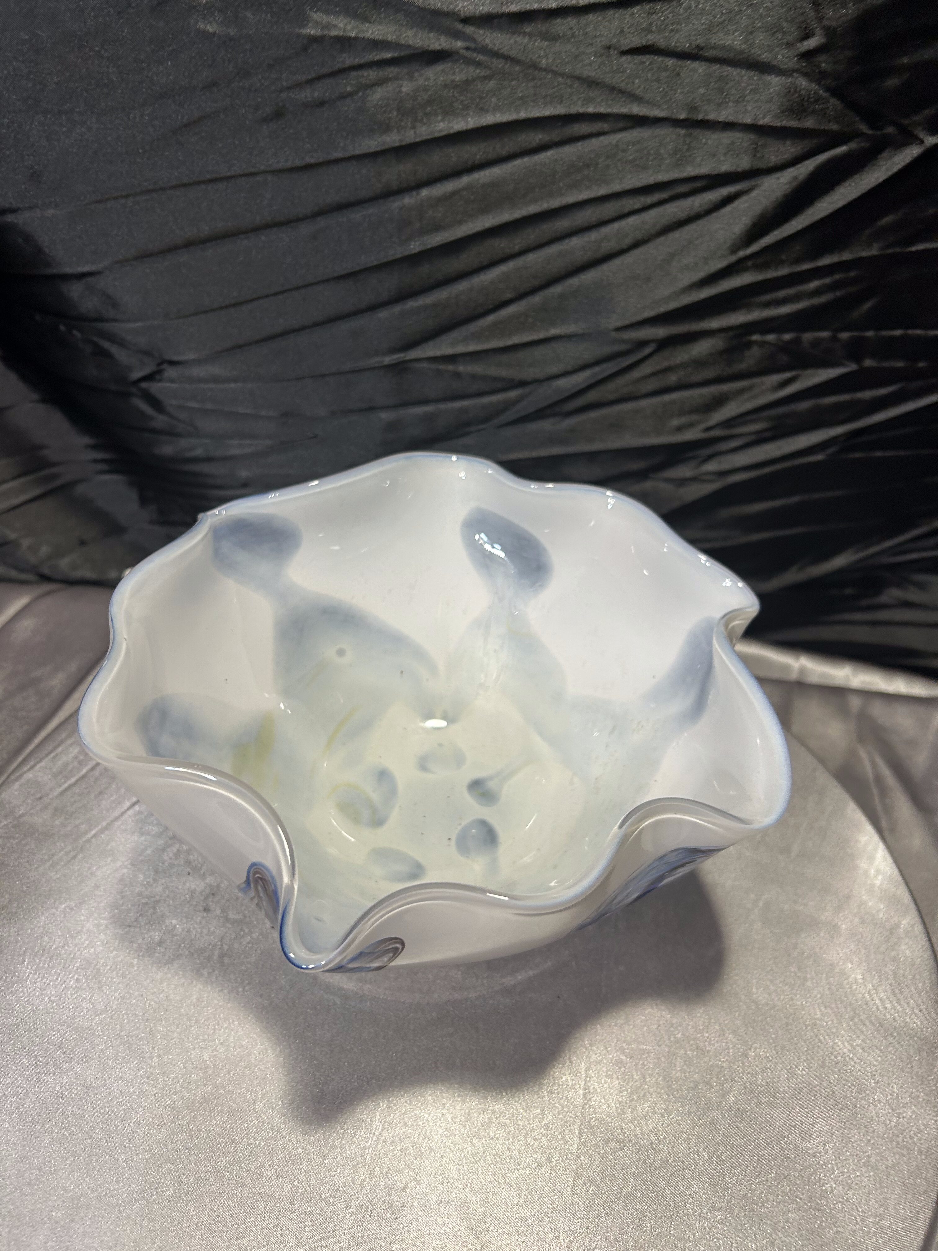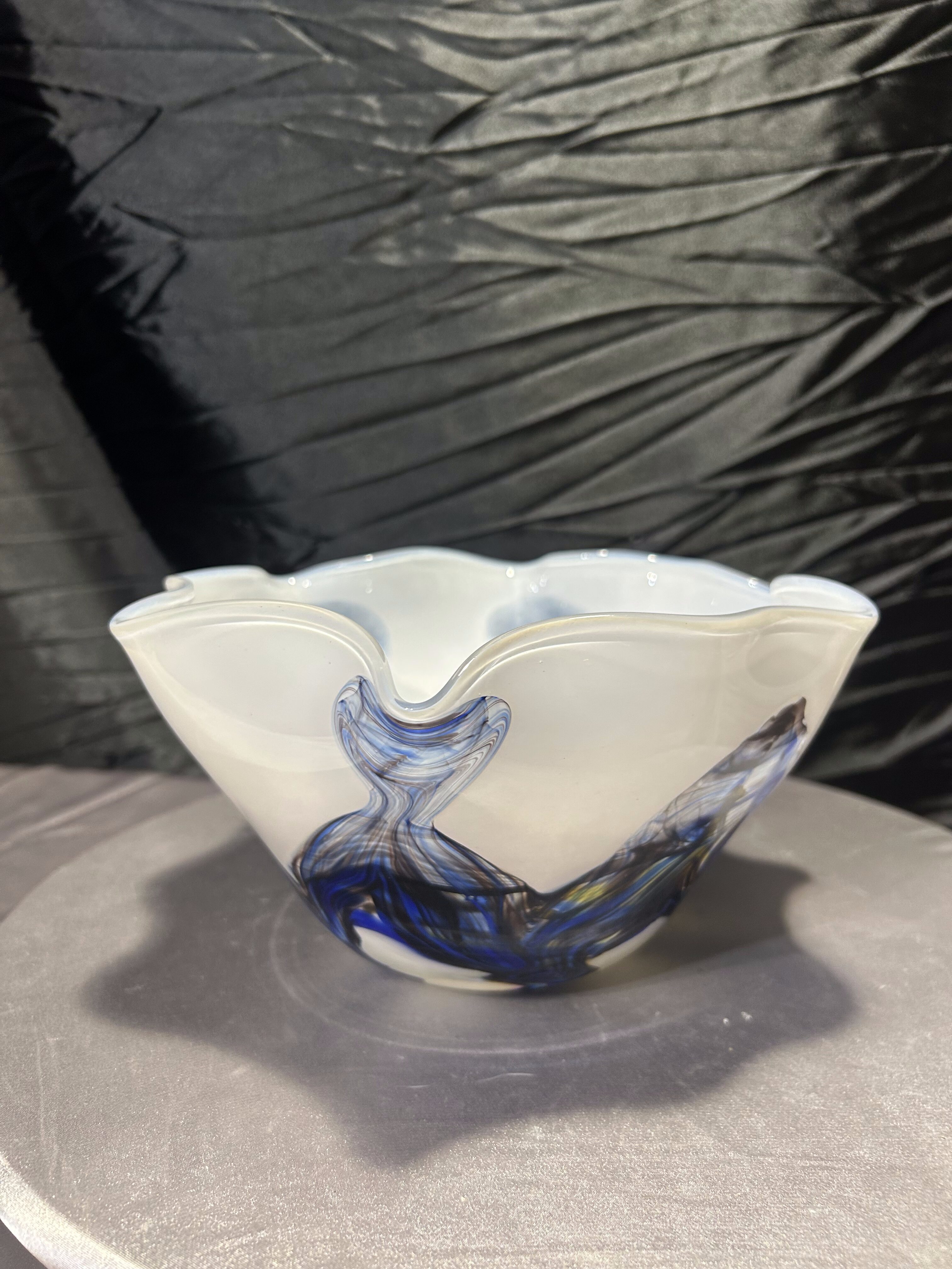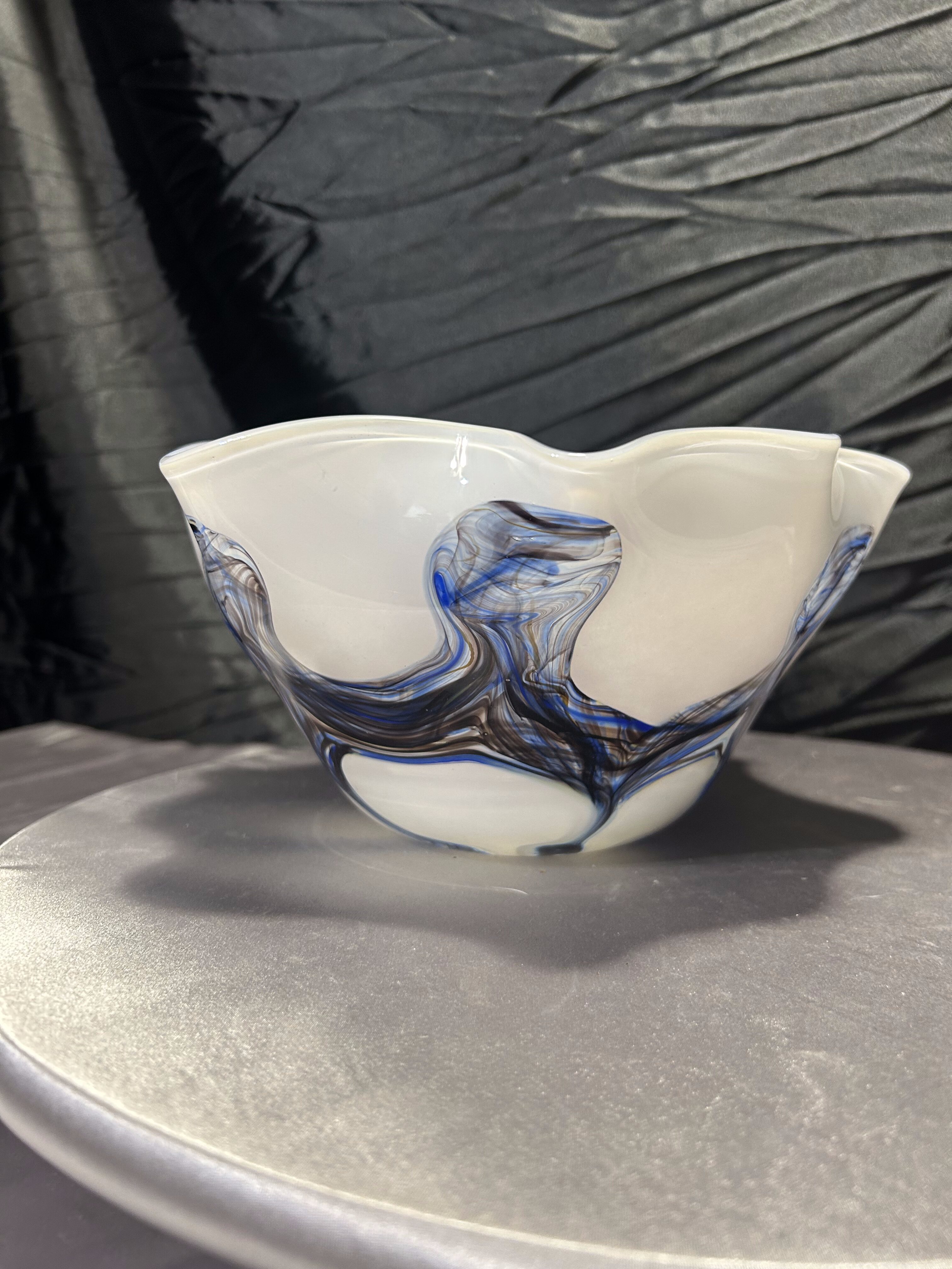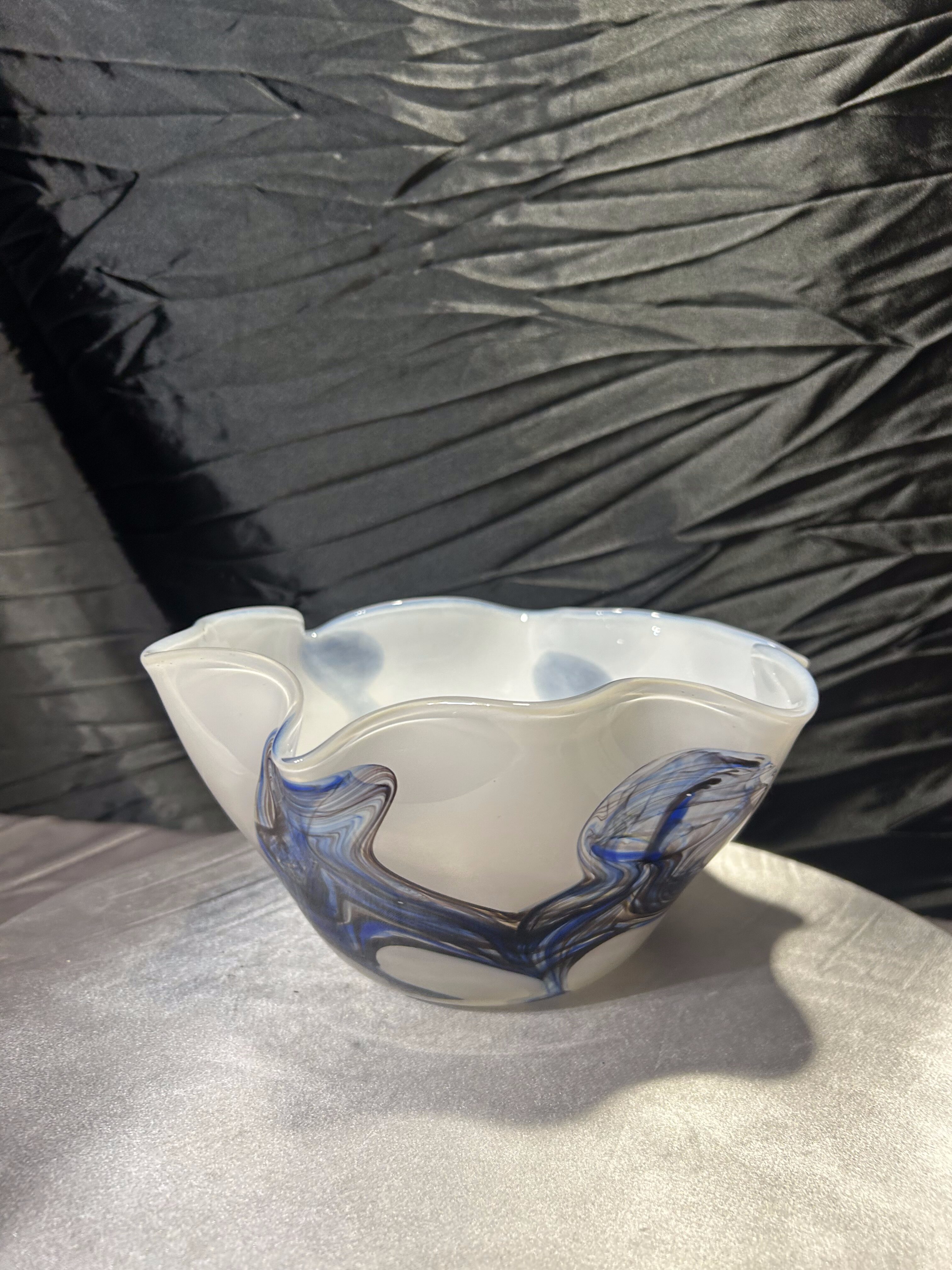 Artystyczna misa wykonana ze szkła w stylu Murano, zachwycająca organiczną formą i subtelnym połączeniem kolorów. Dominujący odcień mlecznego szkła kontrastuje z ekspresyjnymi smugami błękitu, brązu i bursztynu, tworząc wyjątkowy efekt przypominający fale w ruchu. Każdy detal tej miski jest unikalny – to przykład rzemieślniczego kunsztu i wyczucia estetyki charakterystycznego dla szkła murano. Cięższa niż typowe misy szklane, doskonale prezentuje się jako samodzielna dekoracja, a także jako centralny element eleganckiego stołu.