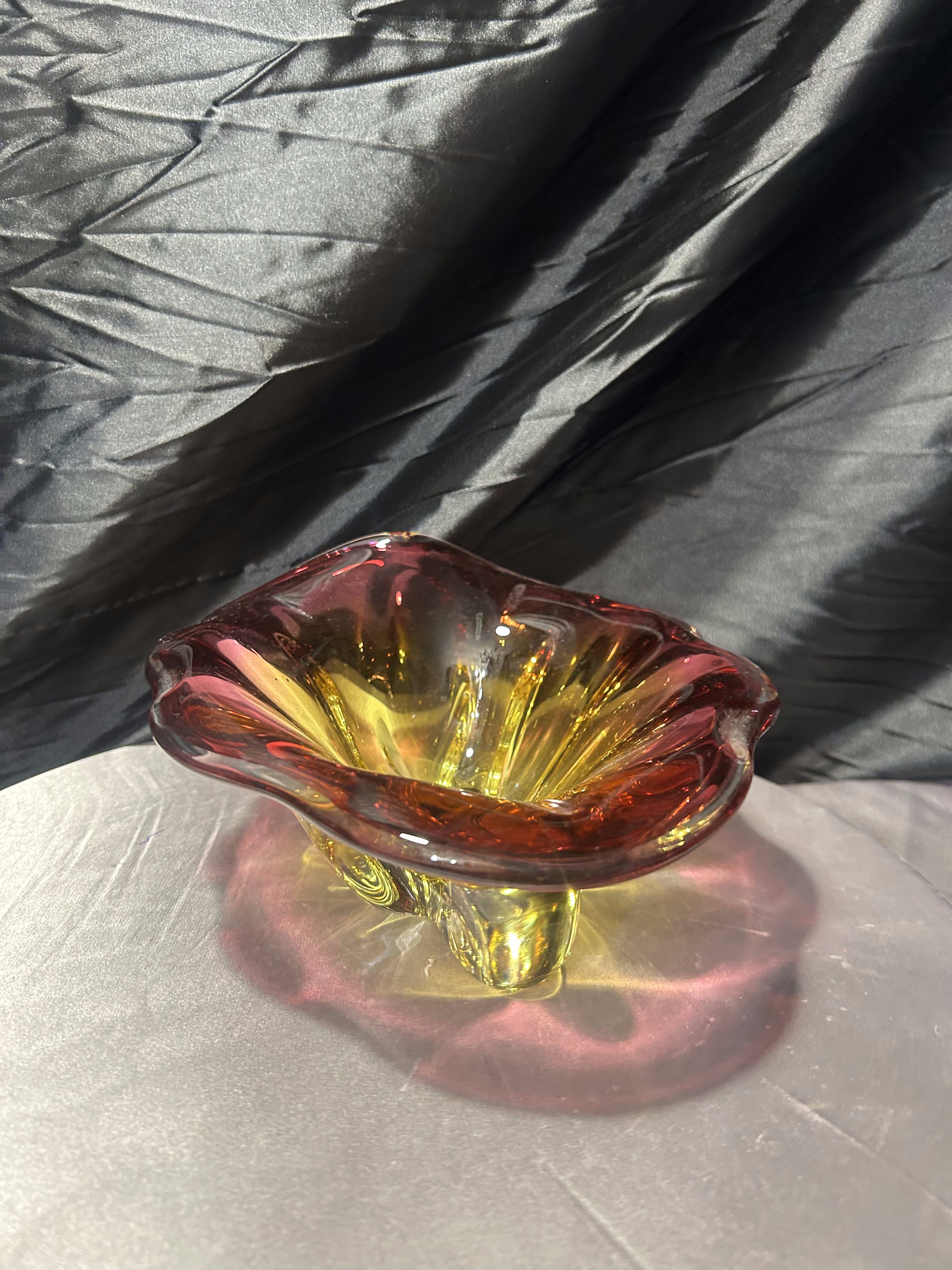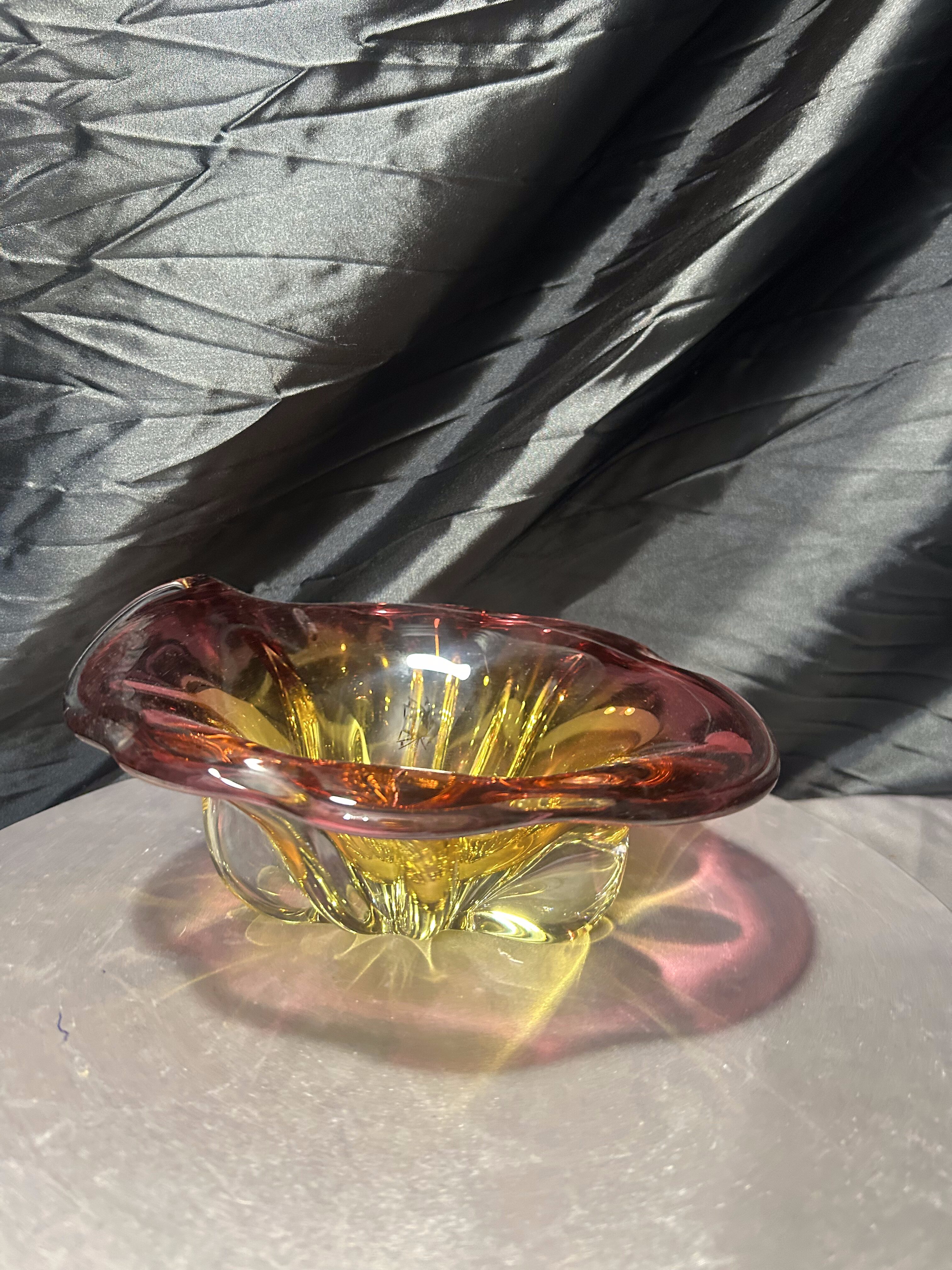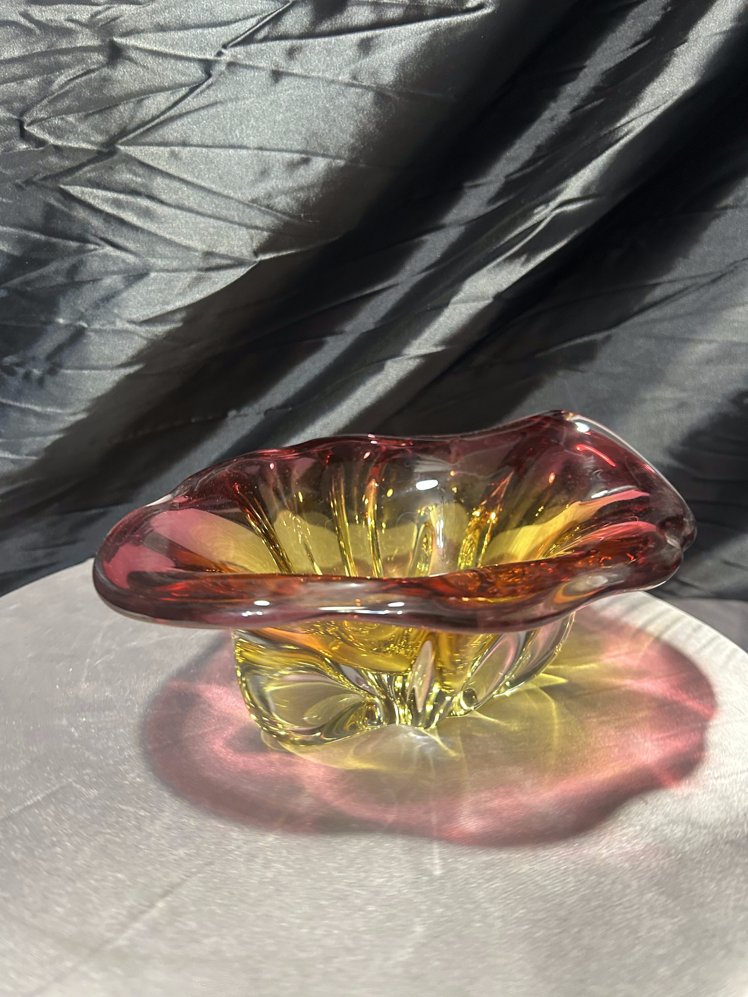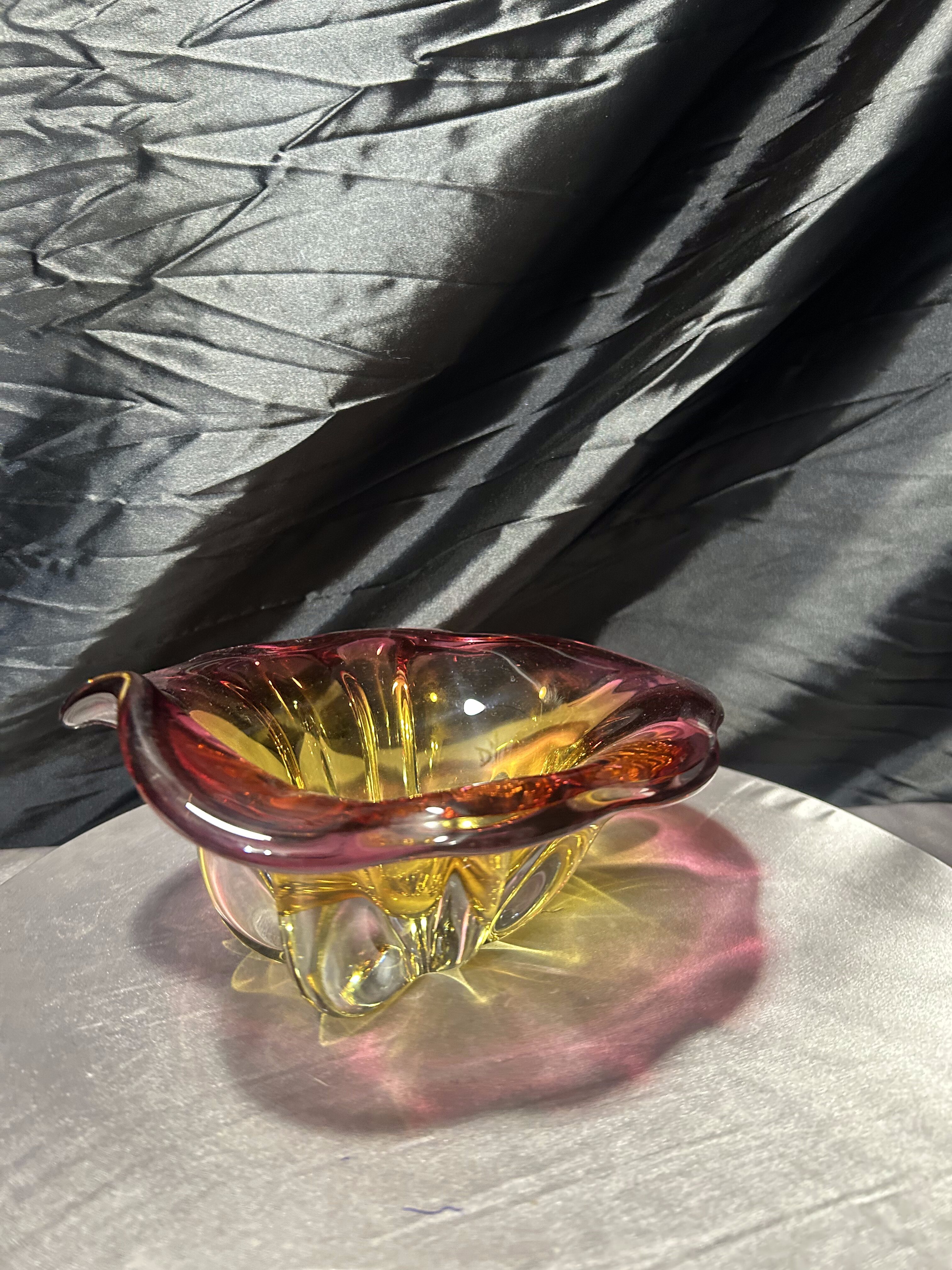 Oferuję wyjątkową misę artystyczną ze szkła Bohemia, zaprojektowaną w stylu charakterystycznym dla twórczości Józefa Hospodki – jednego z najbardziej rozpoznawalnych projektantów szkła w Czechosłowacji. Szkło Bohemia słynęło z ręcznej produkcji, intensywnych barw i tzw. „tłustego szkła”, czyli masywnego, ciężkiego szkła o dużej przejrzystości i wyrazistych załamaniach światła.