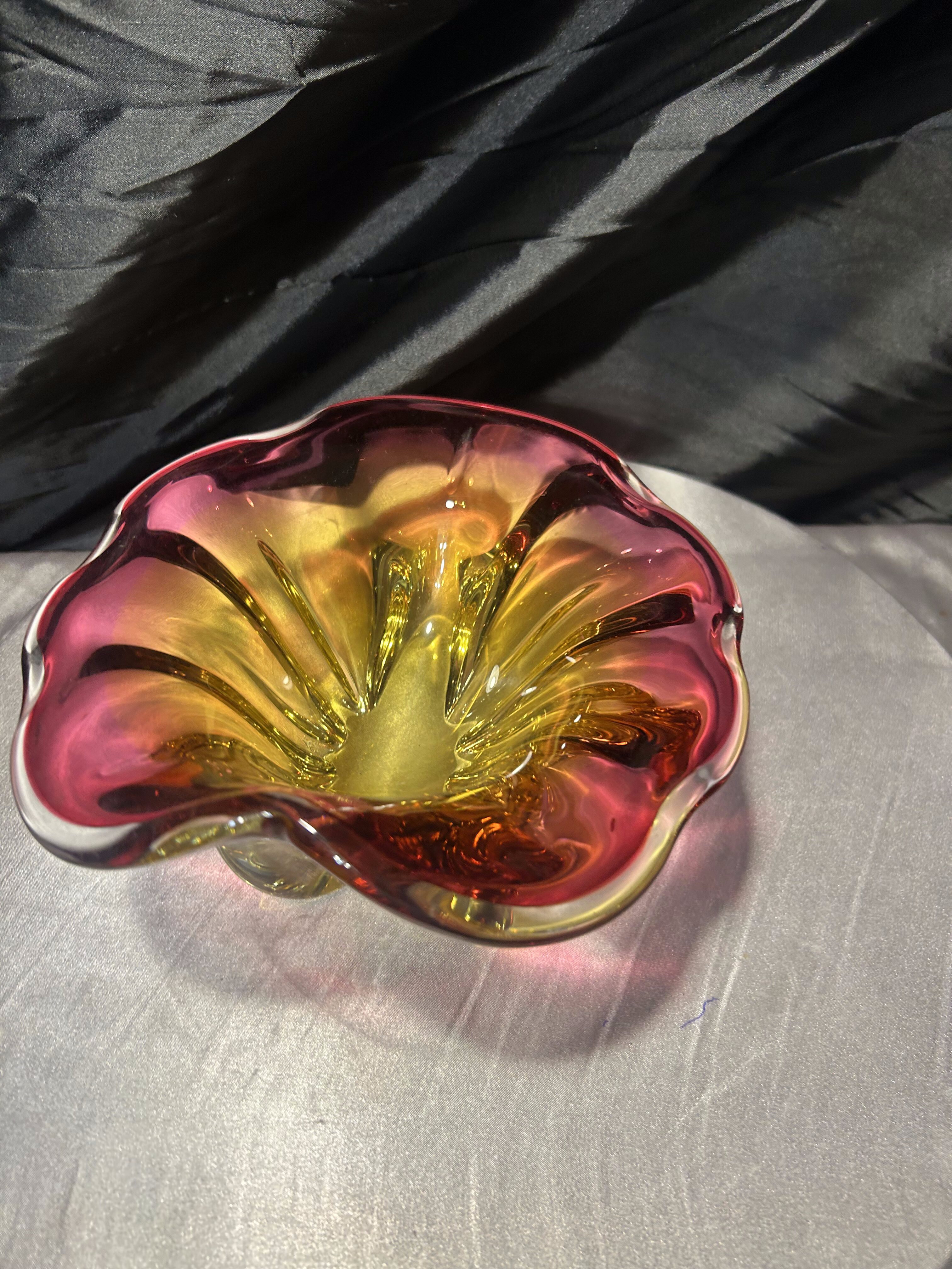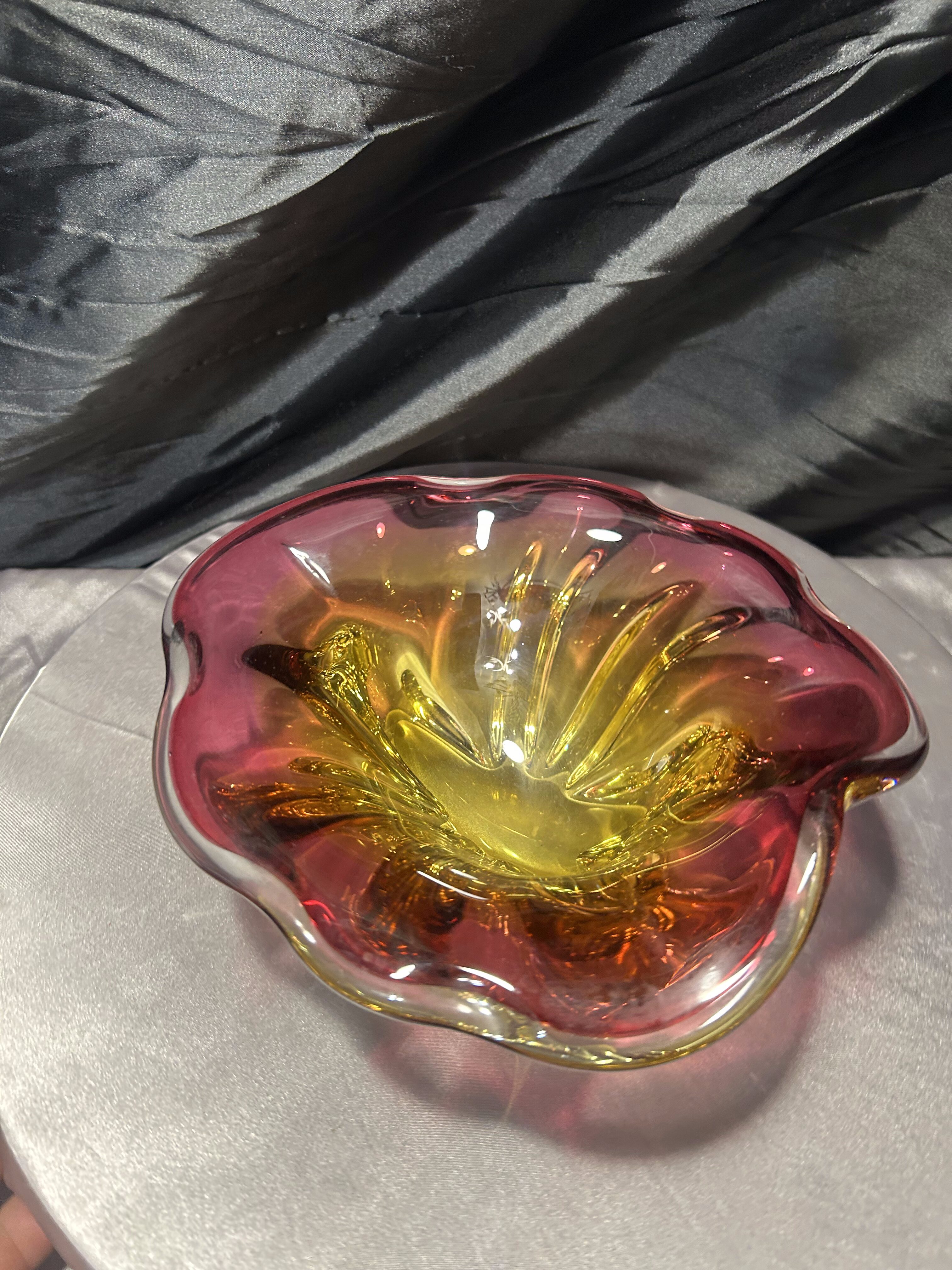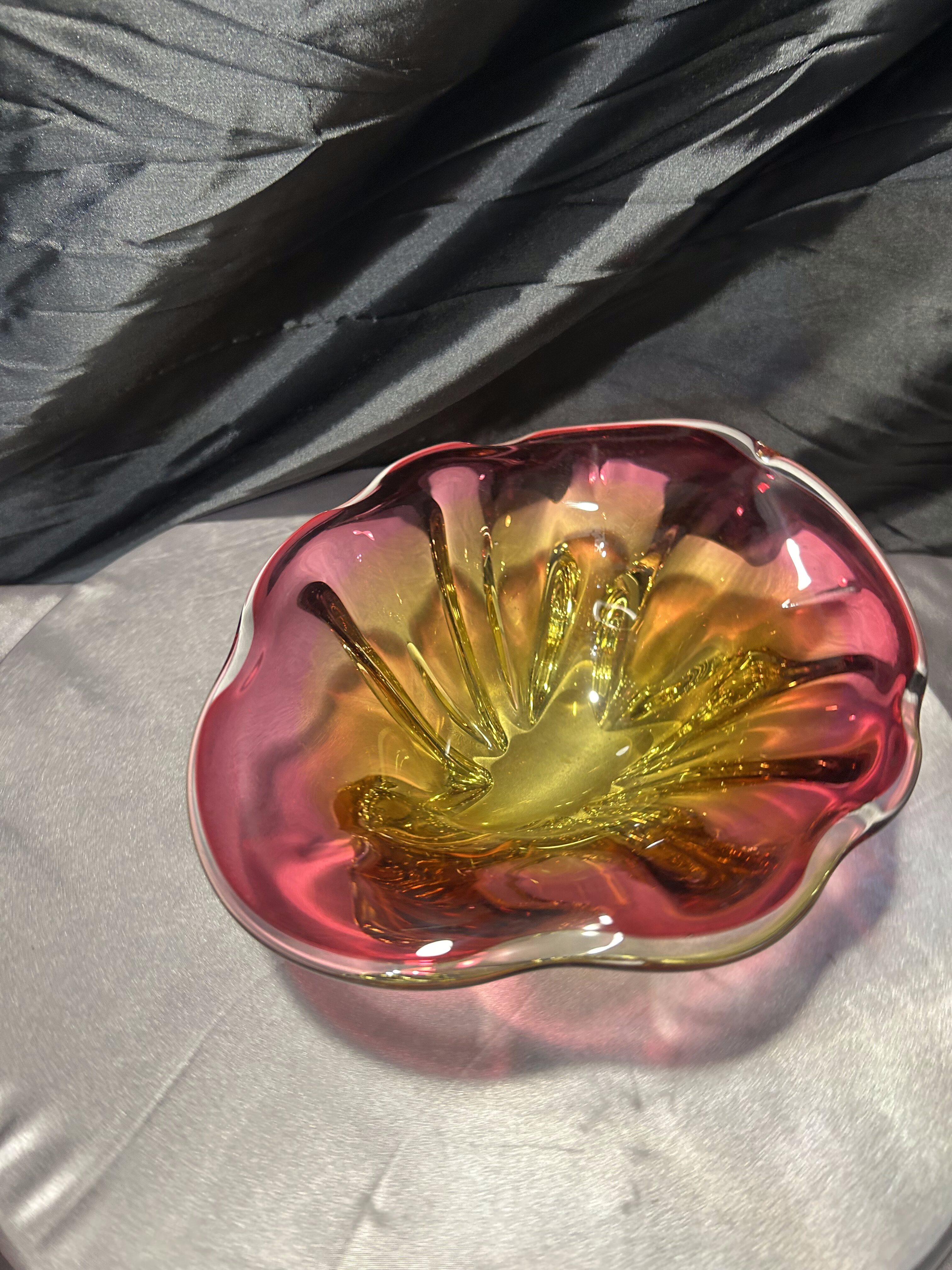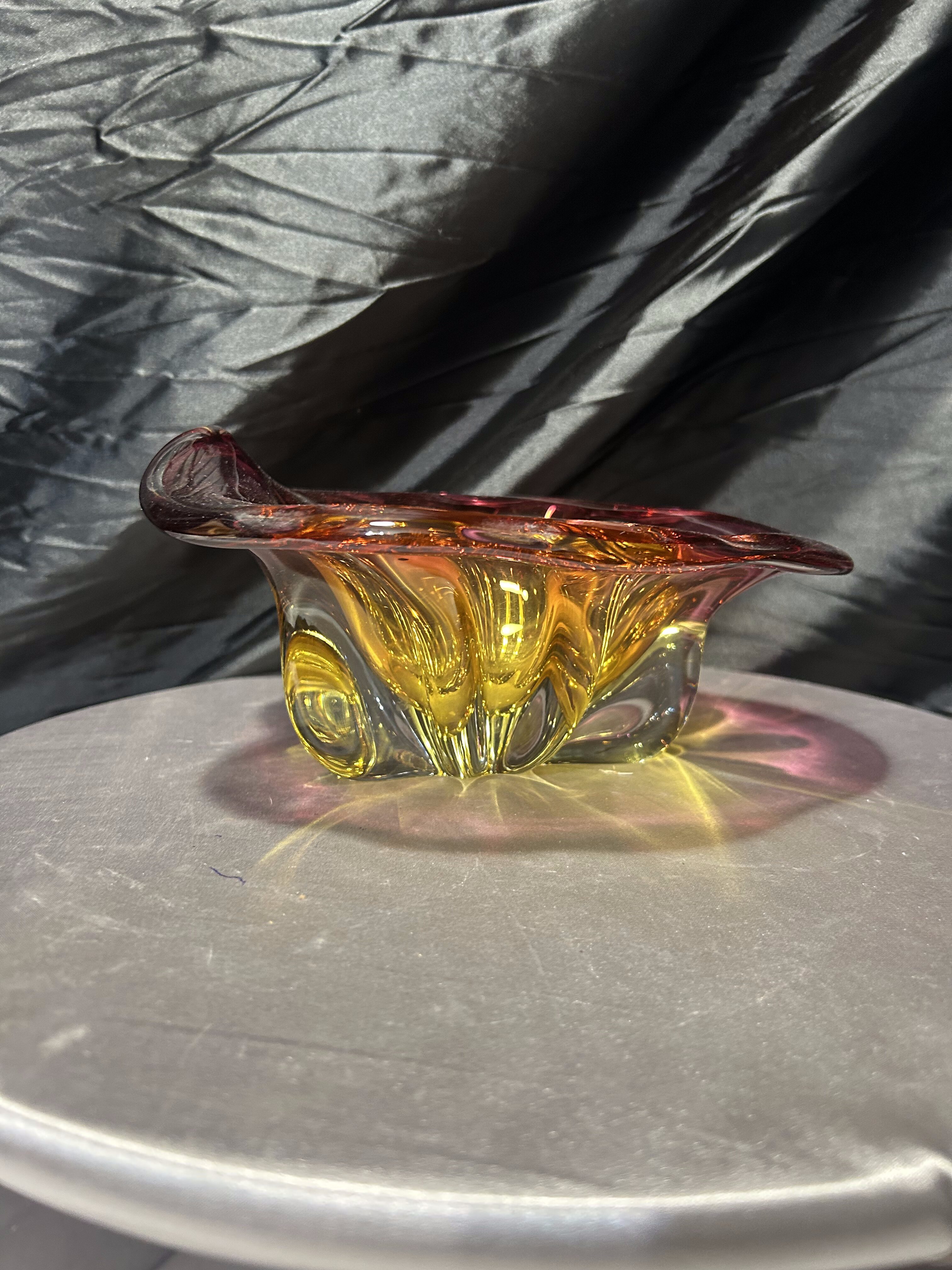 Oferuję wyjątkową misę artystyczną ze szkła Bohemia, zaprojektowaną w stylu charakterystycznym dla twórczości Józefa Hospodki – jednego z najbardziej rozpoznawalnych projektantów szkła w Czechosłowacji. Szkło Bohemia słynęło z ręcznej produkcji, intensywnych barw i tzw. „tłustego szkła”, czyli masywnego, ciężkiego szkła o dużej przejrzystości i wyrazistych załamaniach światła.
