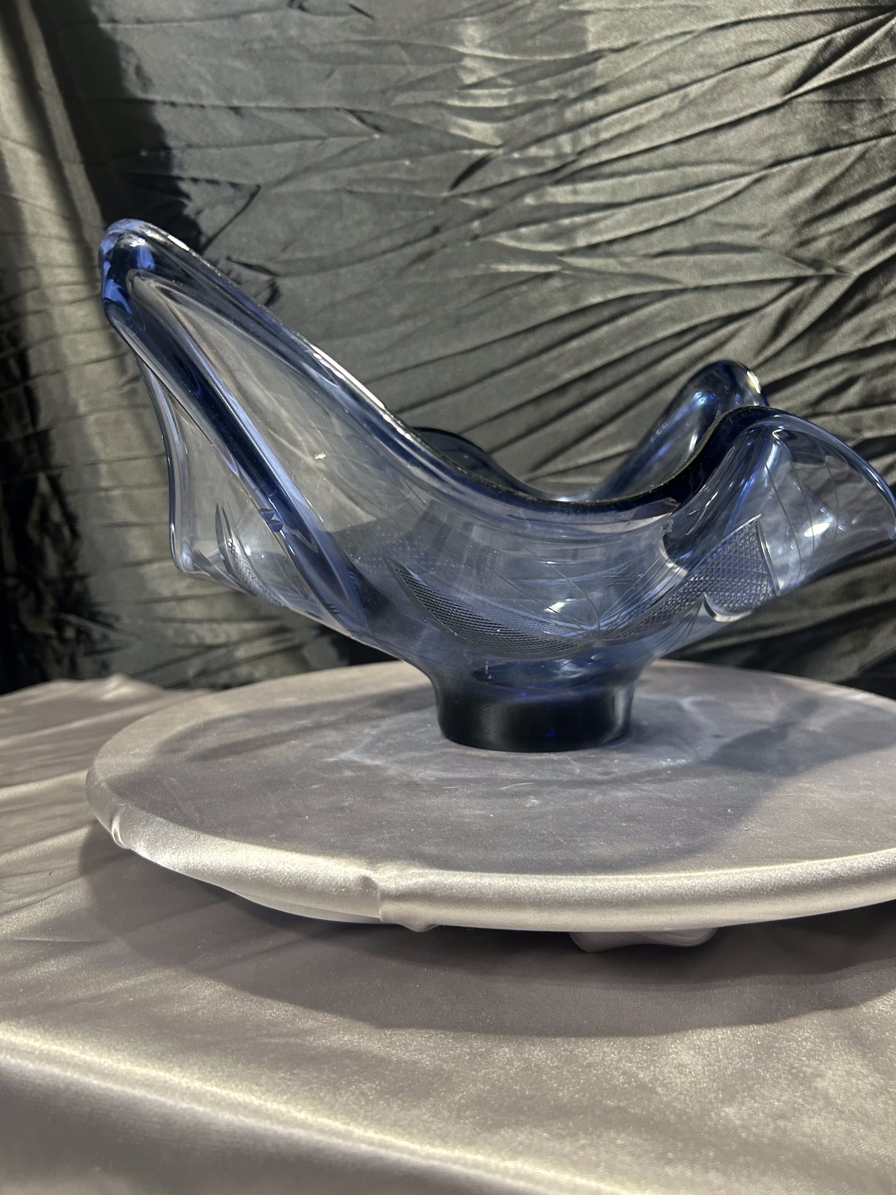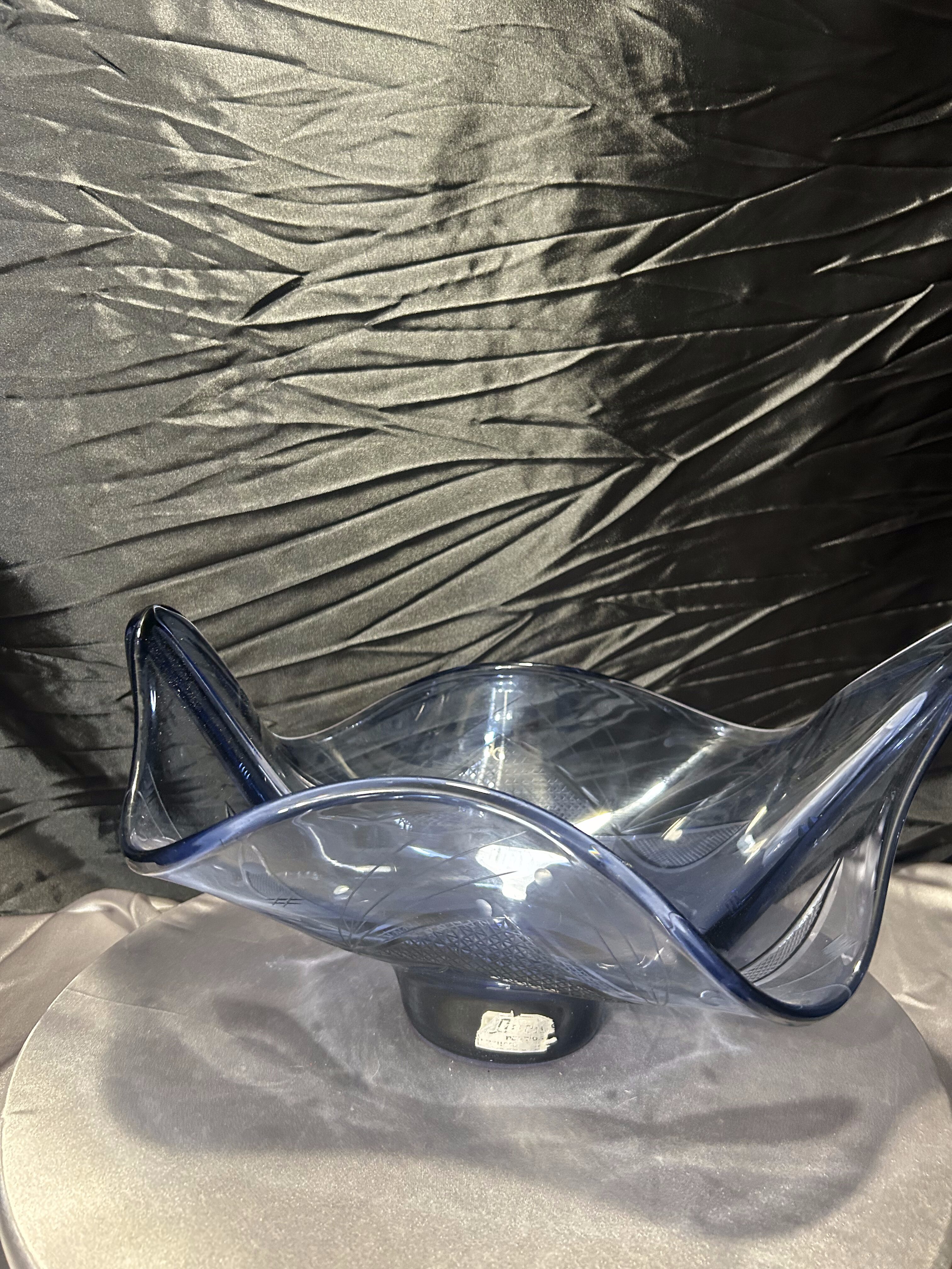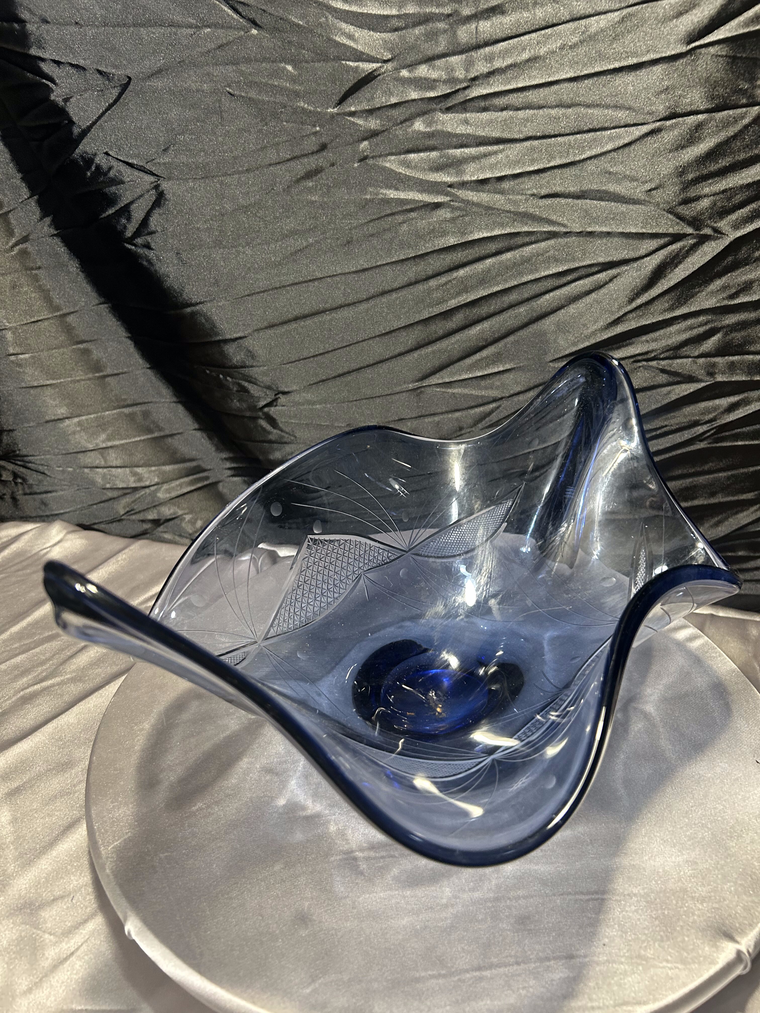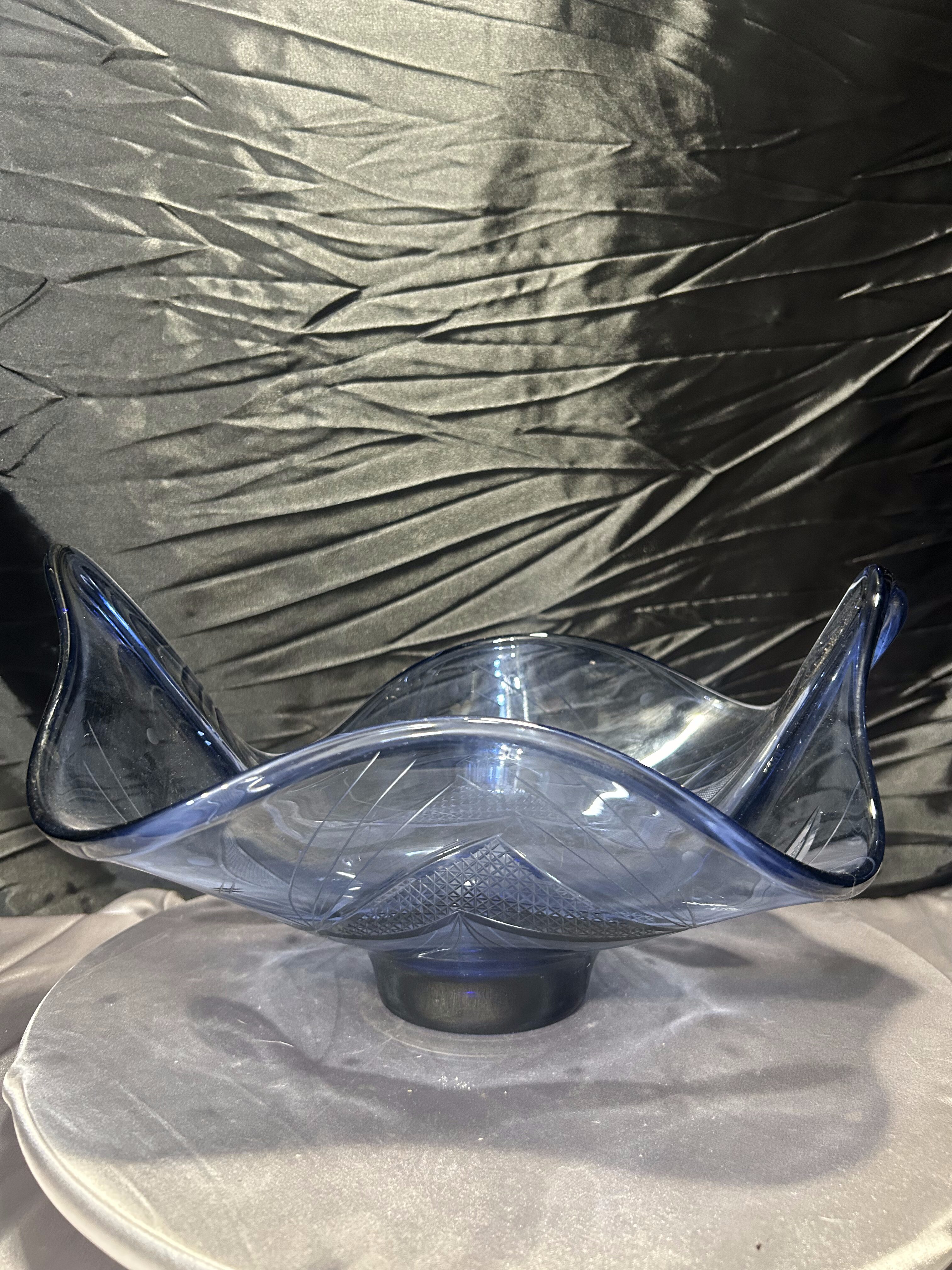 Elegancka misa dekoracyjna marki Erel, wykonana ze szkła w odcieniu subtelnego błękitu, o charakterystycznych, falujących brzegach. Zdobiona delikatnym grawerem geometrycznym, zachwyca lekkością formy i artystycznym wykończeniem. Powstała w drugiej połowie XX wieku, prawdopodobnie w Hiszpanii, stanowi przykład rzemieślniczego szkła dekoracyjnego łączącego funkcjonalność z walorami estetycznymi.