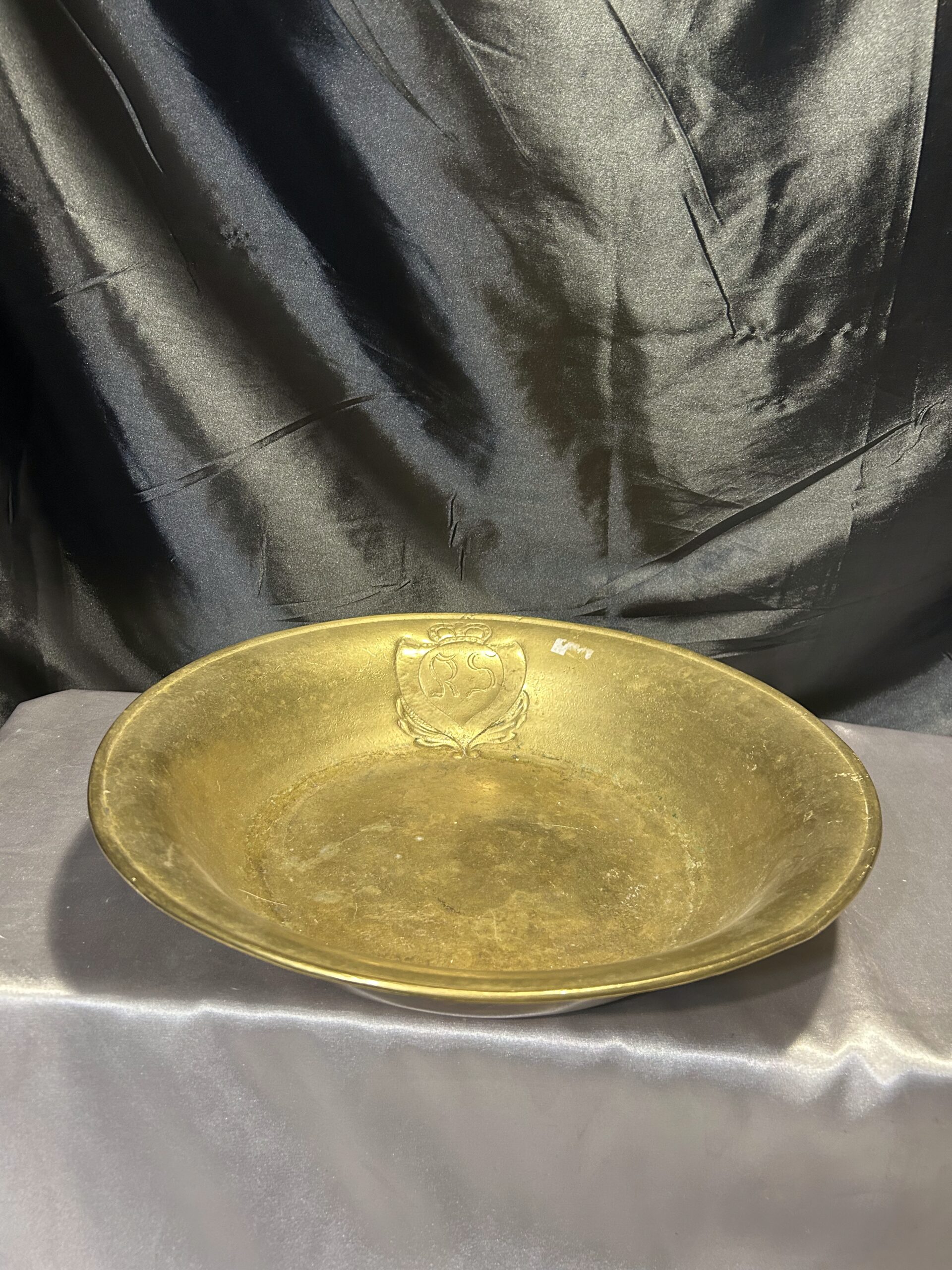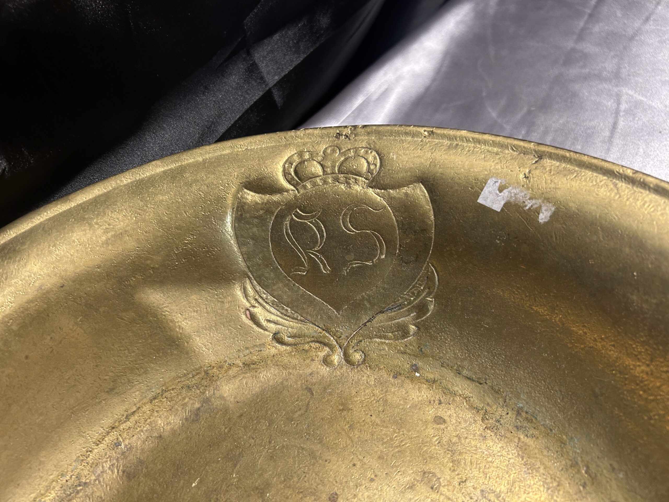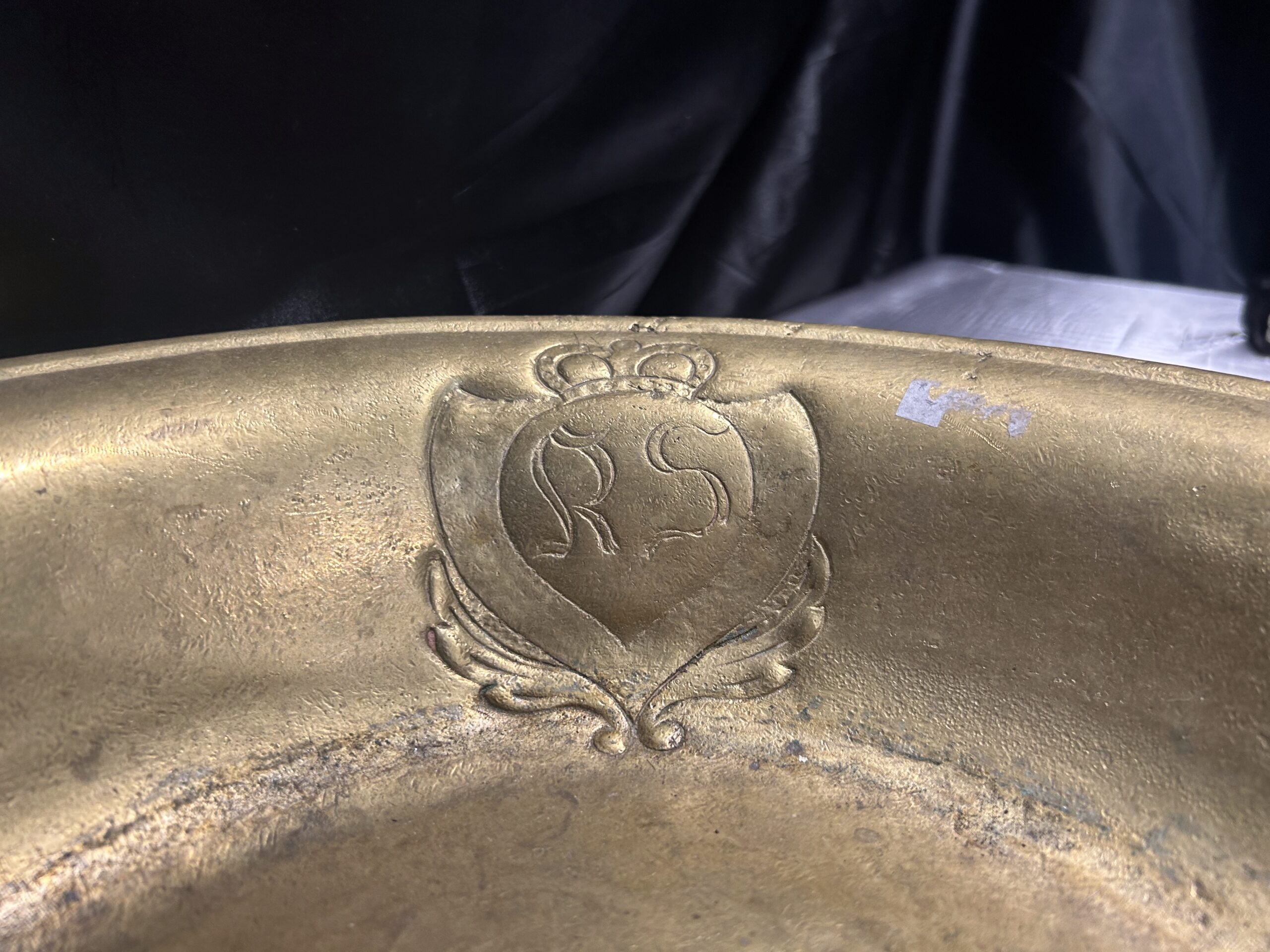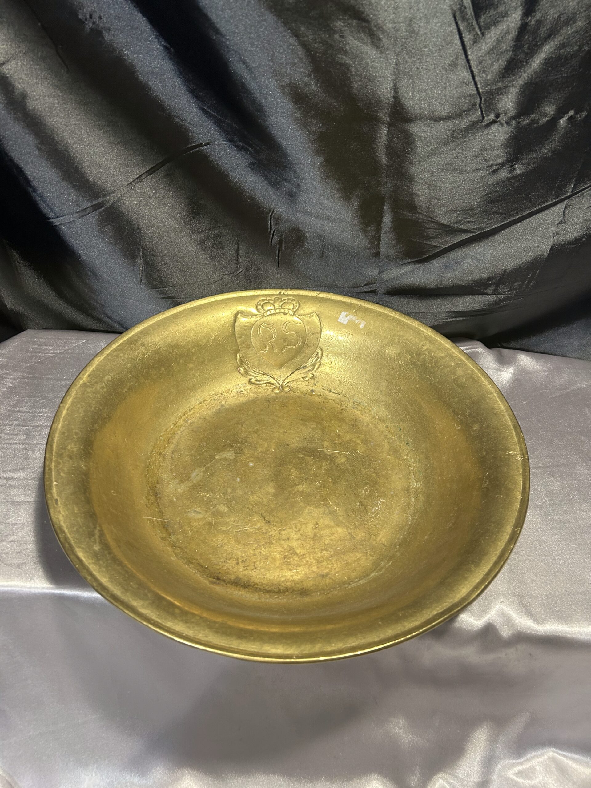 Wyjątkowa misa wykonana z mosiądzu, zdobiona eleganckim herbem i sygnowana inicjałami R S w herbie. To unikalna kolekcjonerska patera, która zachwyca precyzyjnym wykonaniem oraz artystycznym designem, stanowiąc doskonały dodatek do kolekcji antyków i elegancką ozdobę wnętrza.