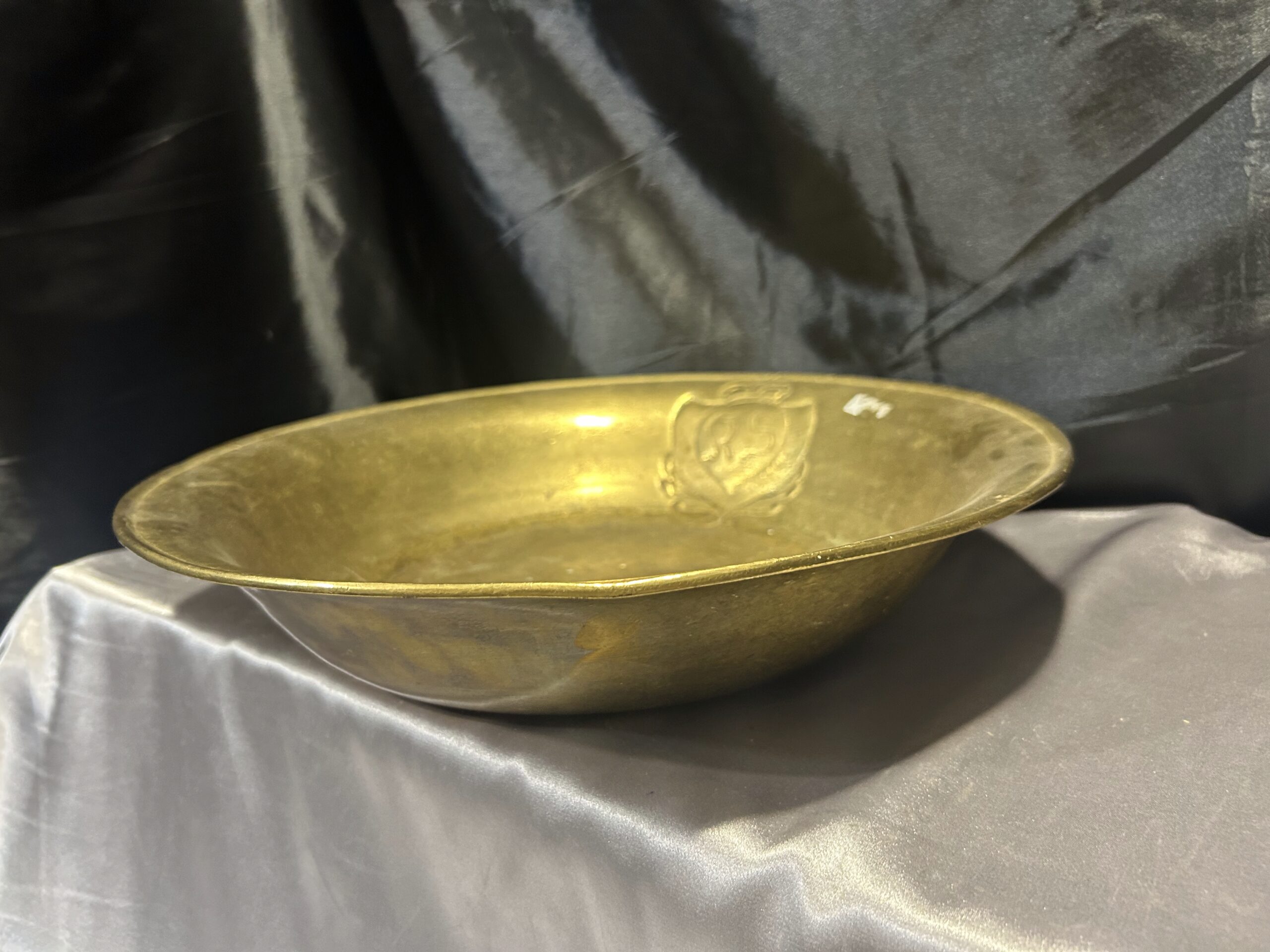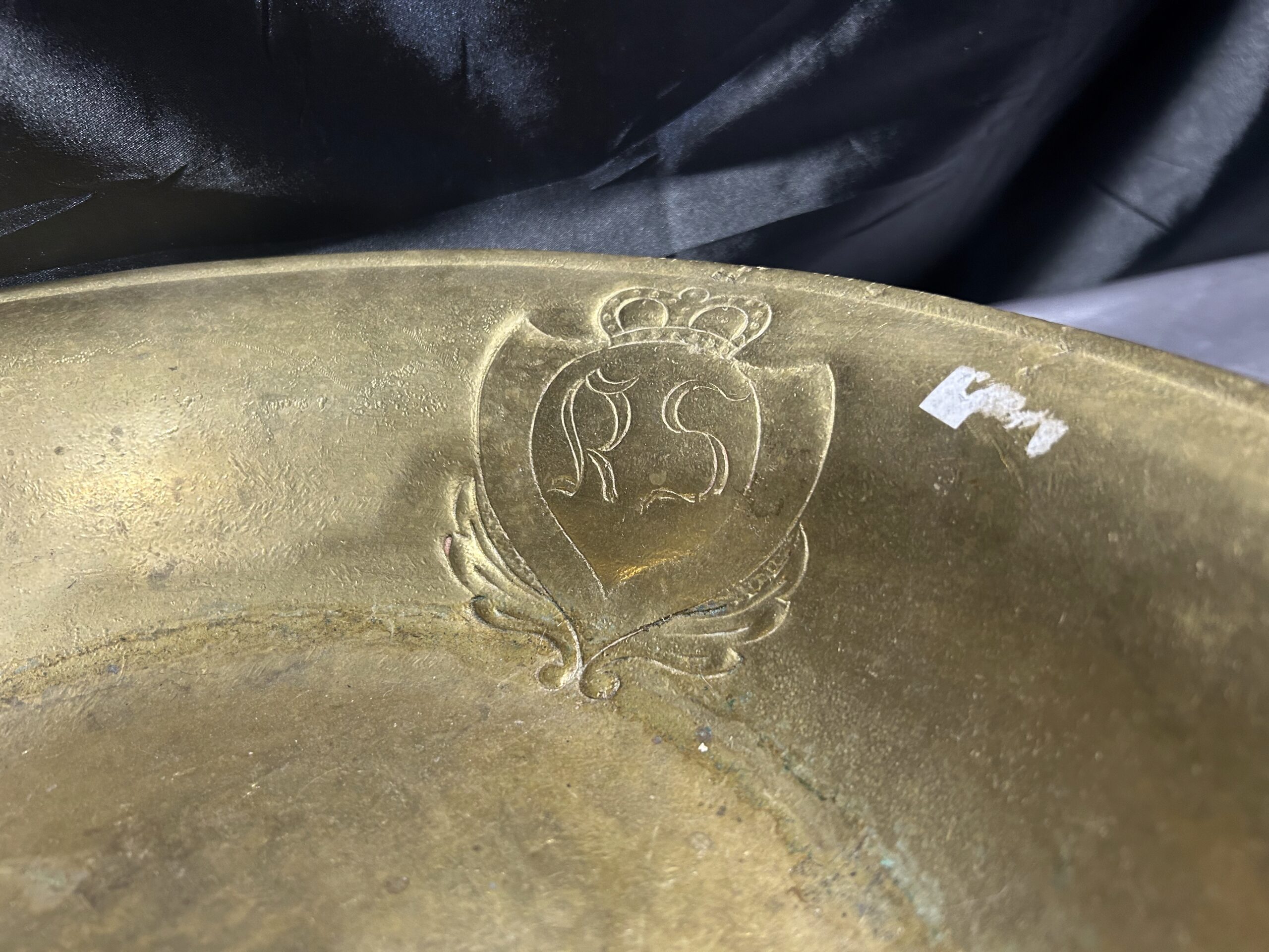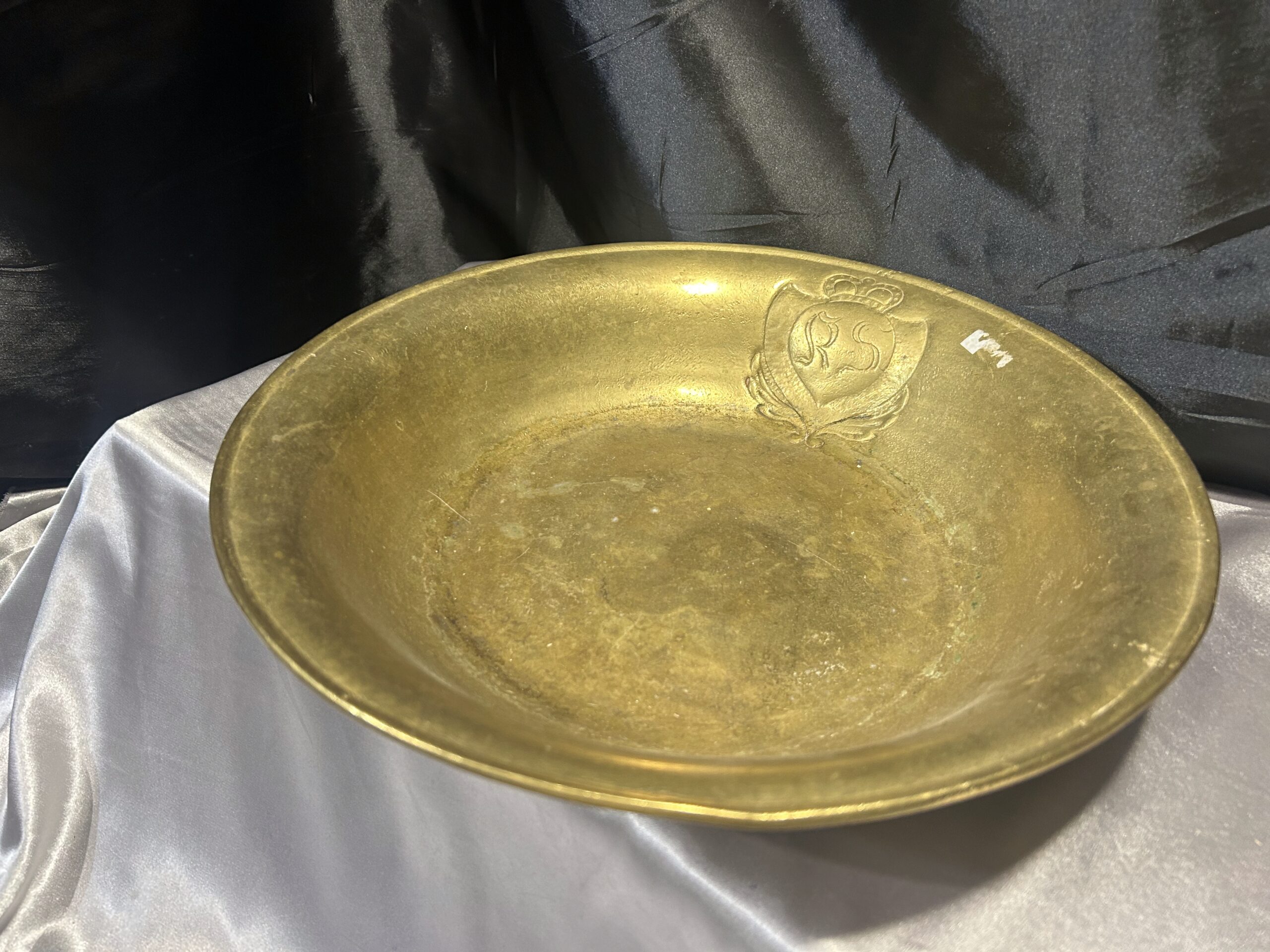 Wyjątkowa misa wykonana z mosiądzu, zdobiona eleganckim herbem i sygnowana inicjałami R S w herbie. To unikalna kolekcjonerska patera, która zachwyca precyzyjnym wykonaniem oraz artystycznym designem, stanowiąc doskonały dodatek do kolekcji antyków i elegancką ozdobę wnętrza.