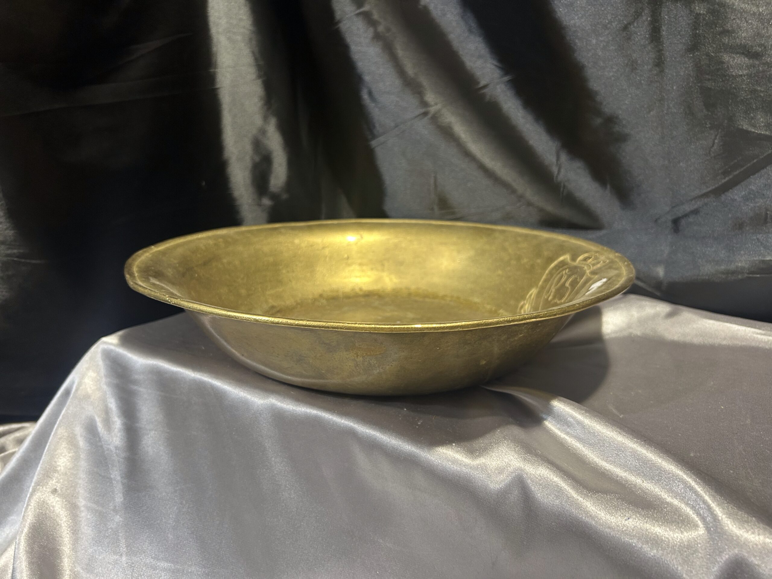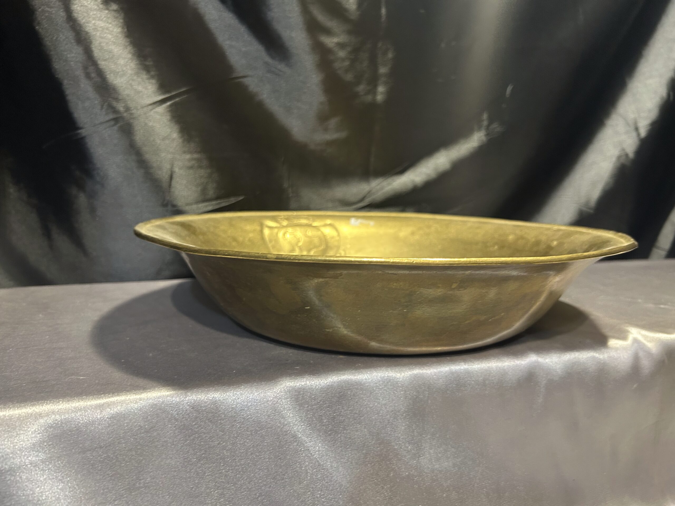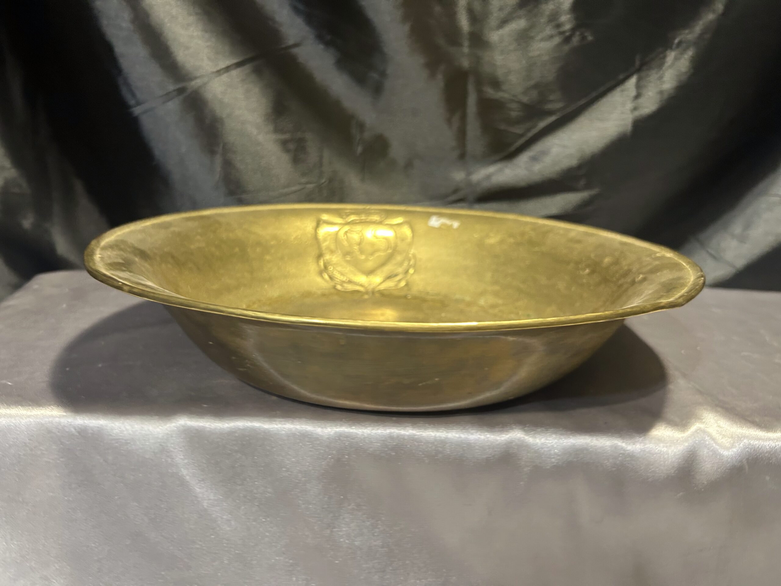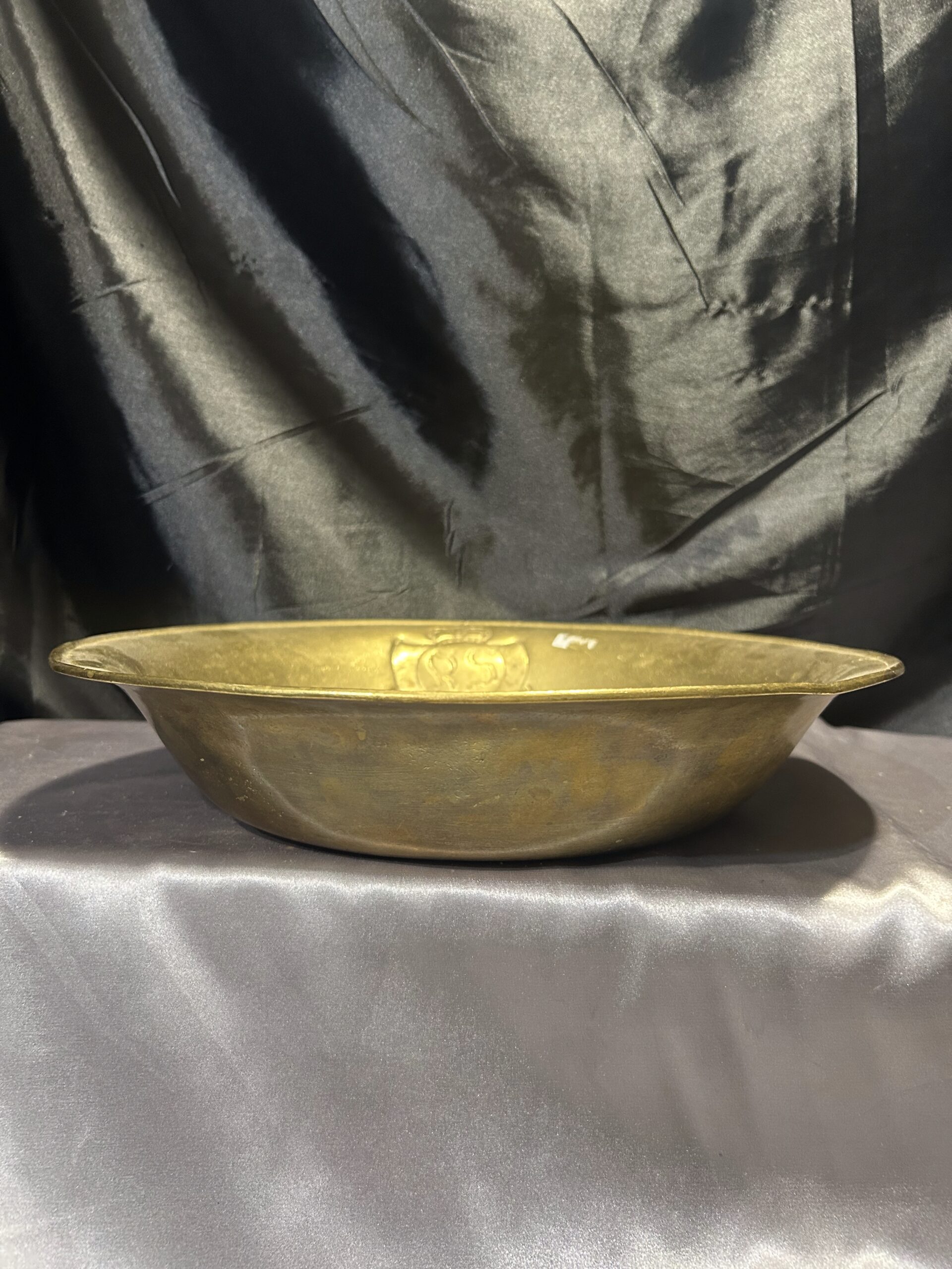 Wyjątkowa misa wykonana z mosiądzu, zdobiona eleganckim herbem i sygnowana inicjałami R S w herbie. To unikalna kolekcjonerska patera, która zachwyca precyzyjnym wykonaniem oraz artystycznym designem, stanowiąc doskonały dodatek do kolekcji antyków i elegancką ozdobę wnętrza.