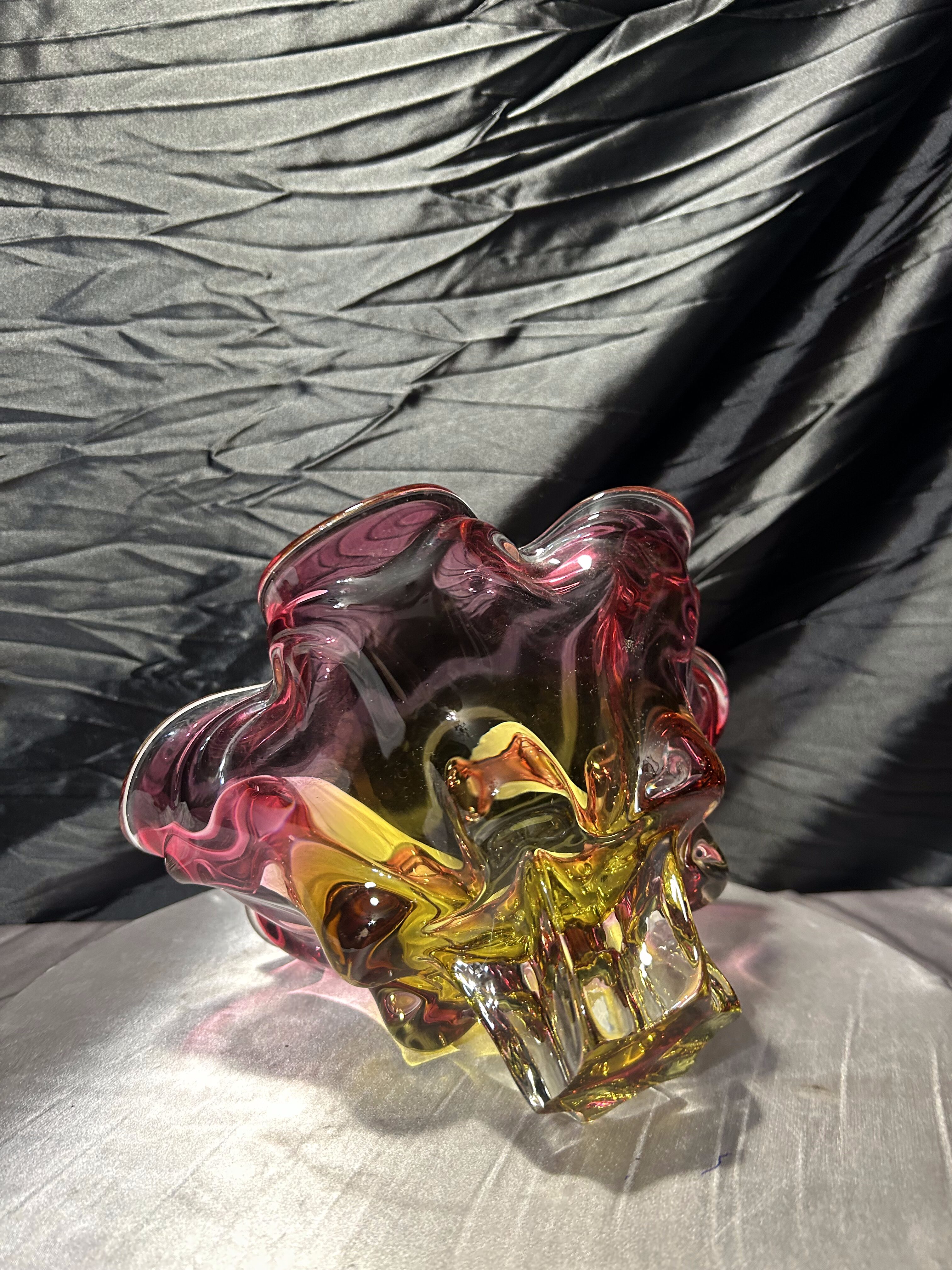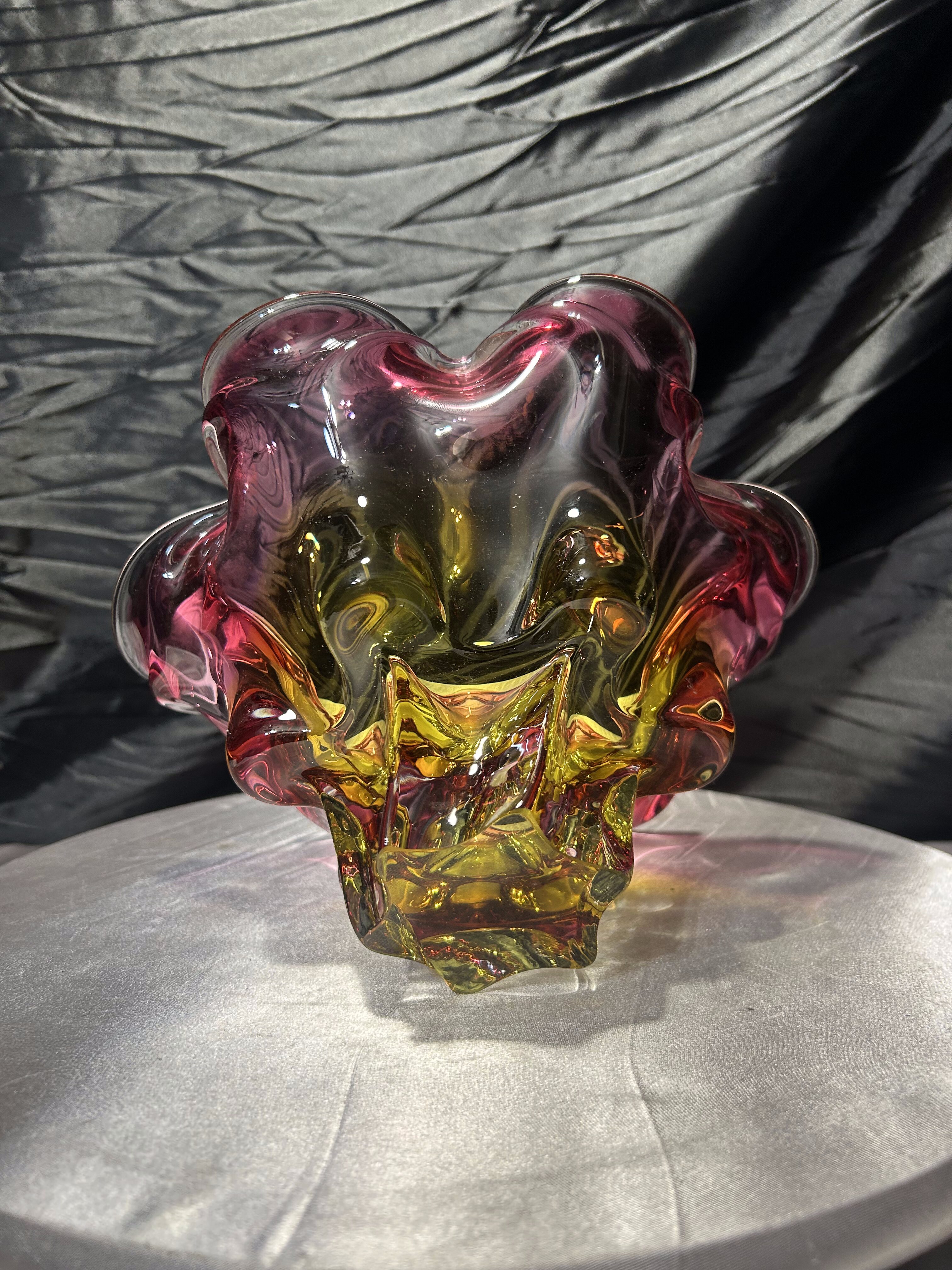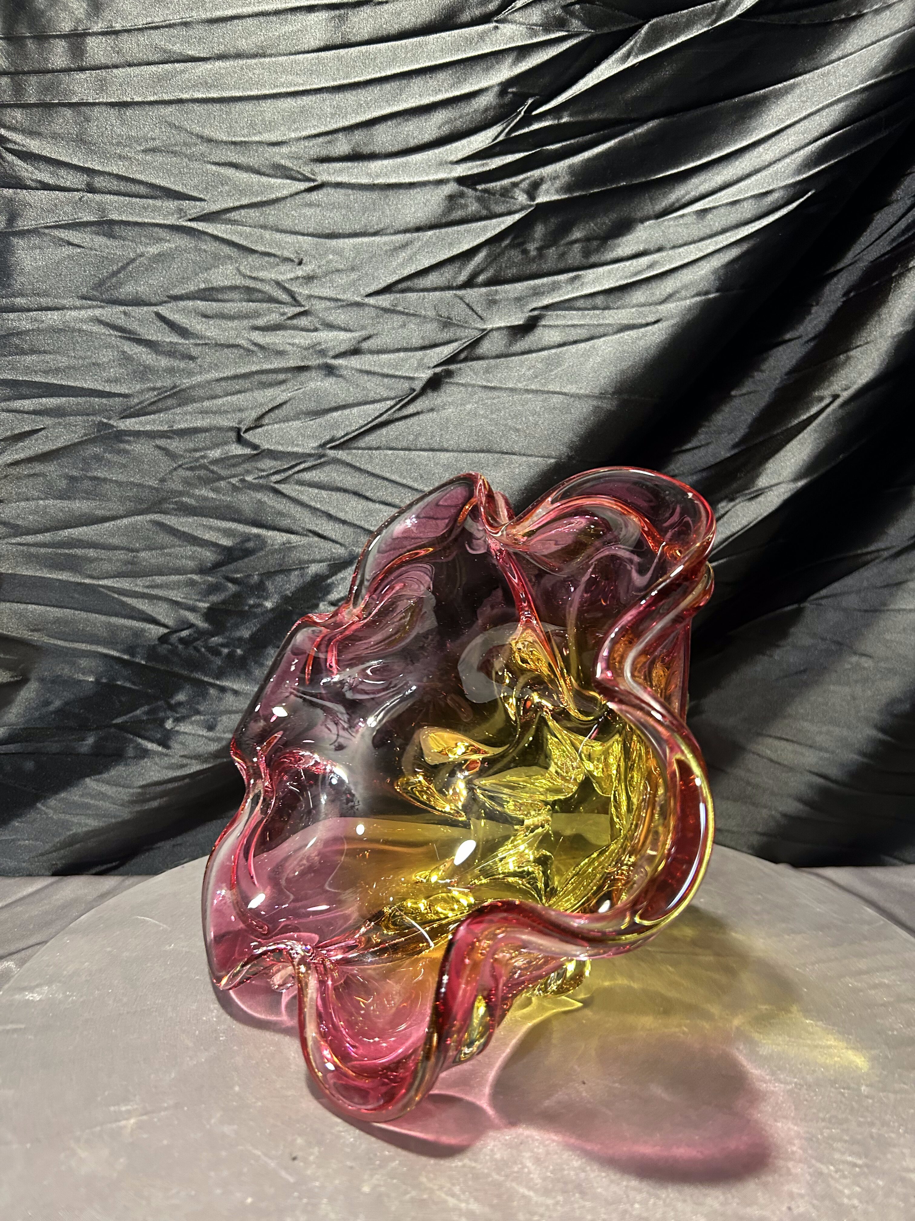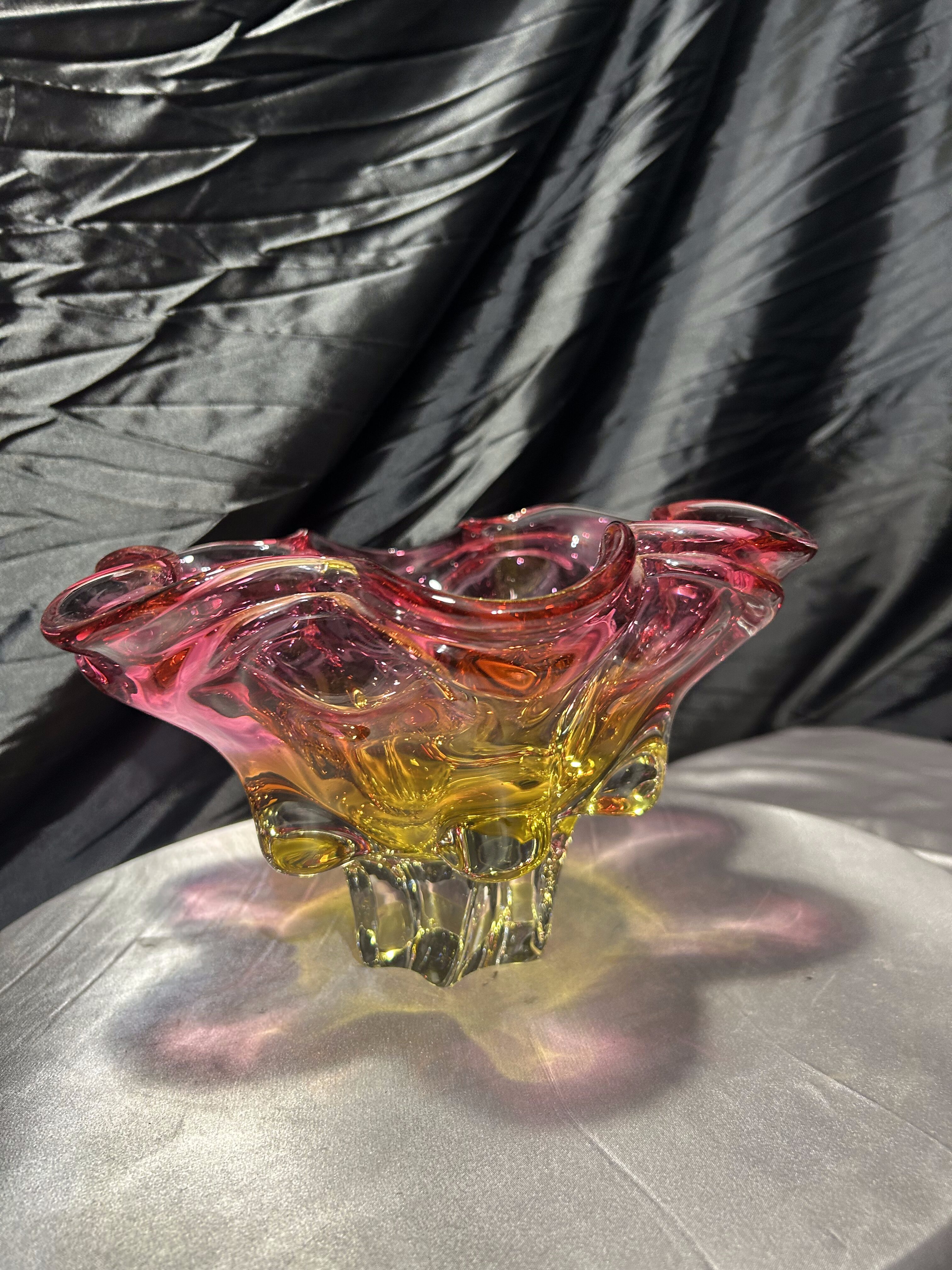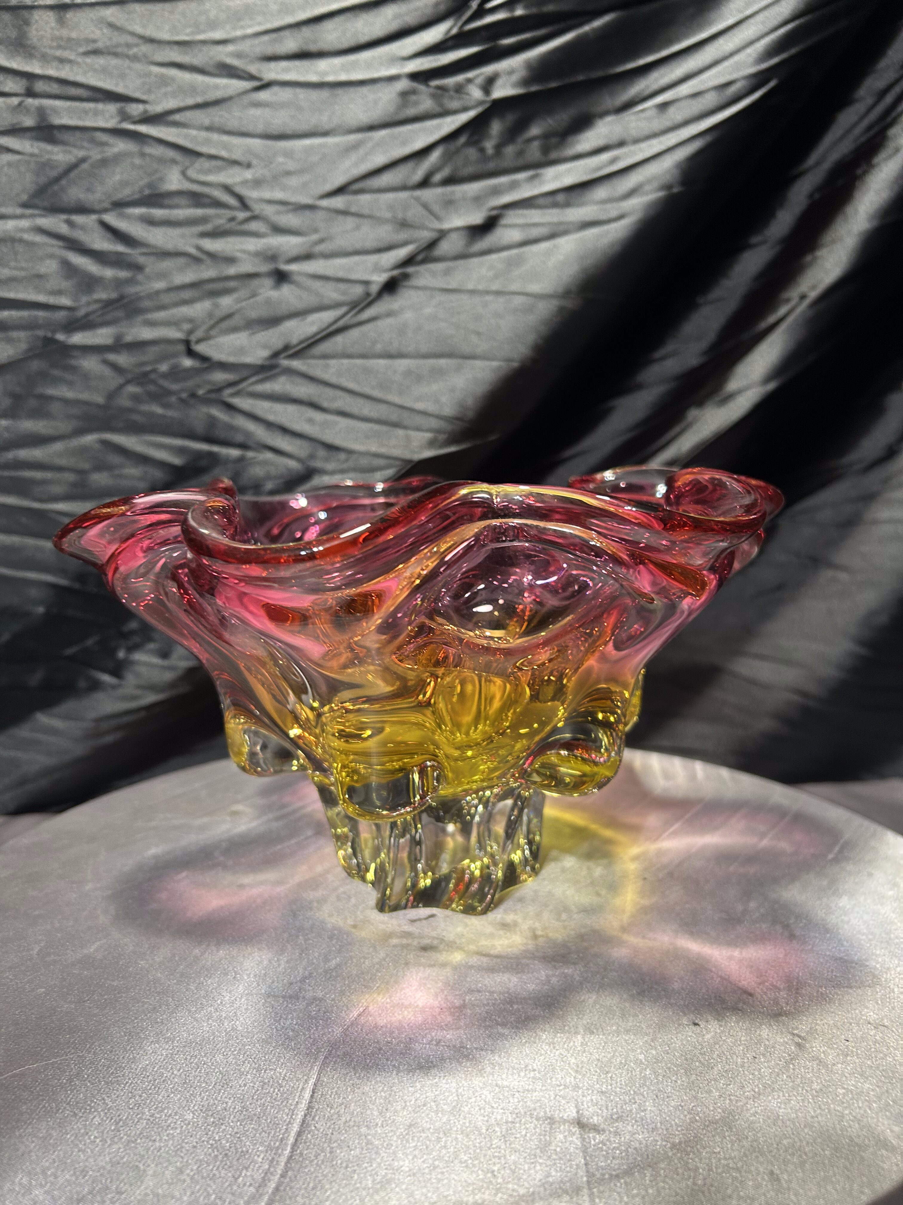 Bardzo duża, efektowna misa ze szkła artystycznego autorstwa Josefa (Józefa) Hospodki, jednego z czołowych projektantów czechosłowackiego szkła artystycznego XX wieku. Forma o wyraźnie falowanym, organicznym brzegu i intensywnym zestawieniu barw – odcieni różu, bursztynu i złota – jest charakterystyczna dla nurtu Bohemian Project.