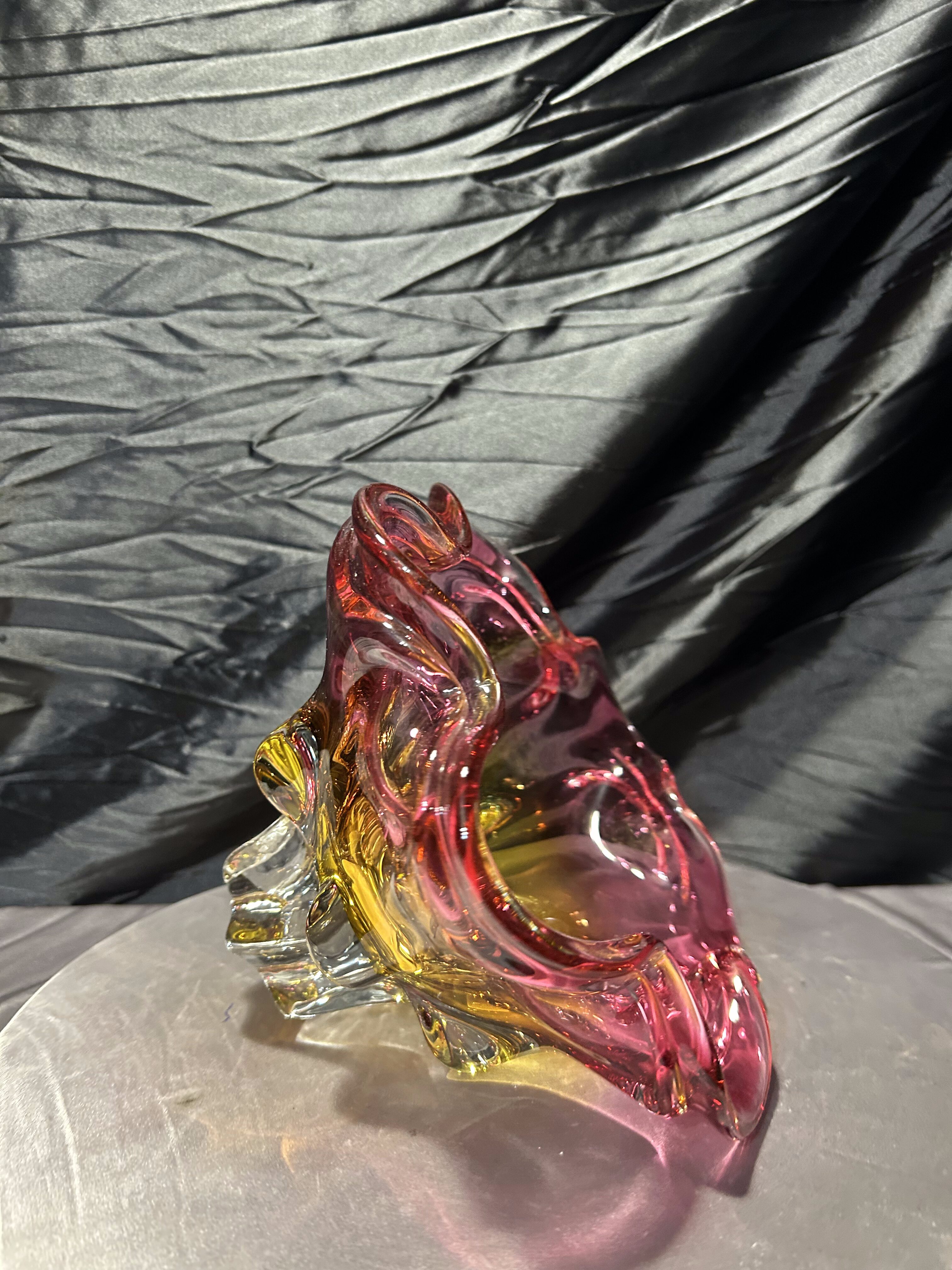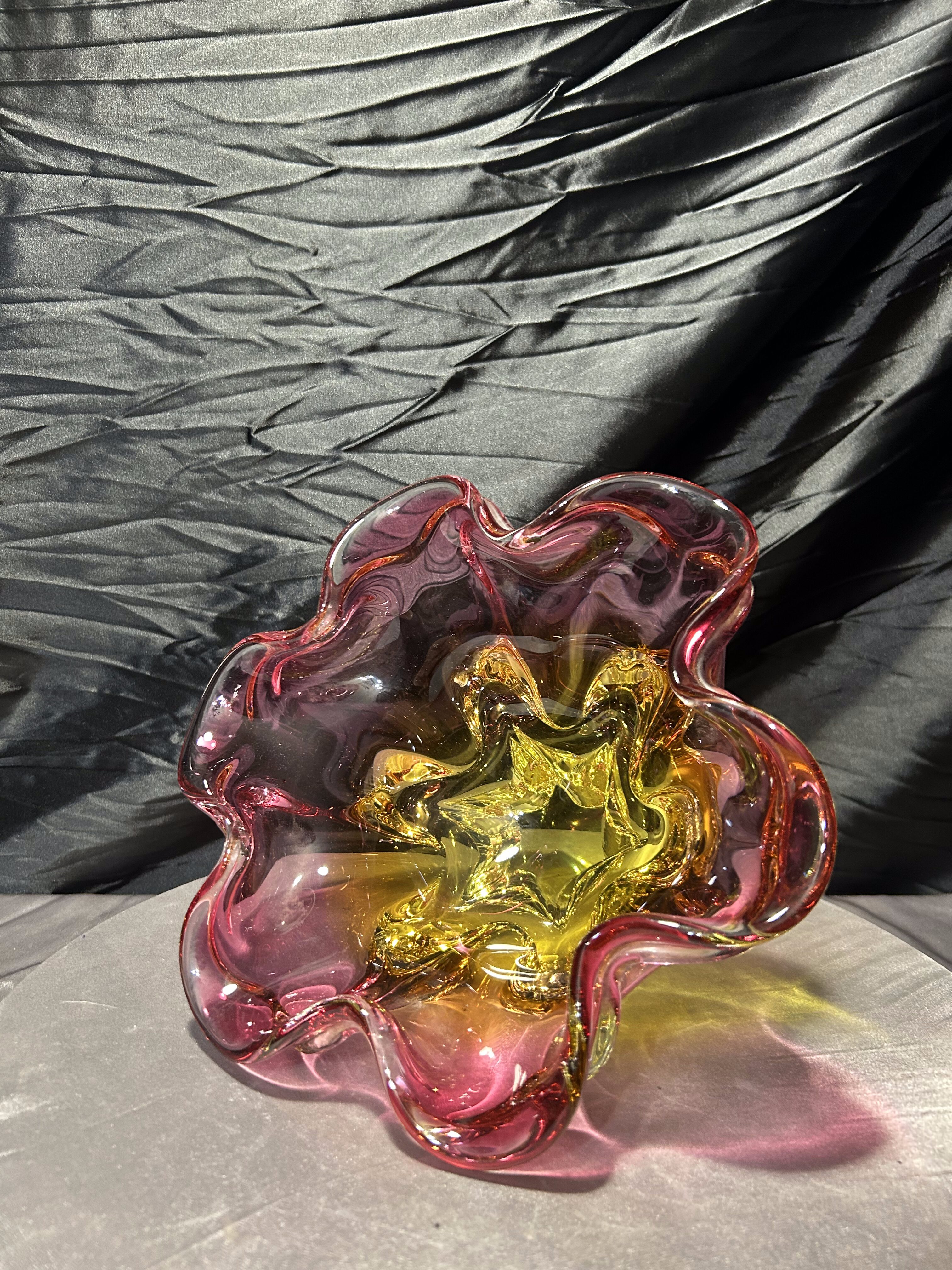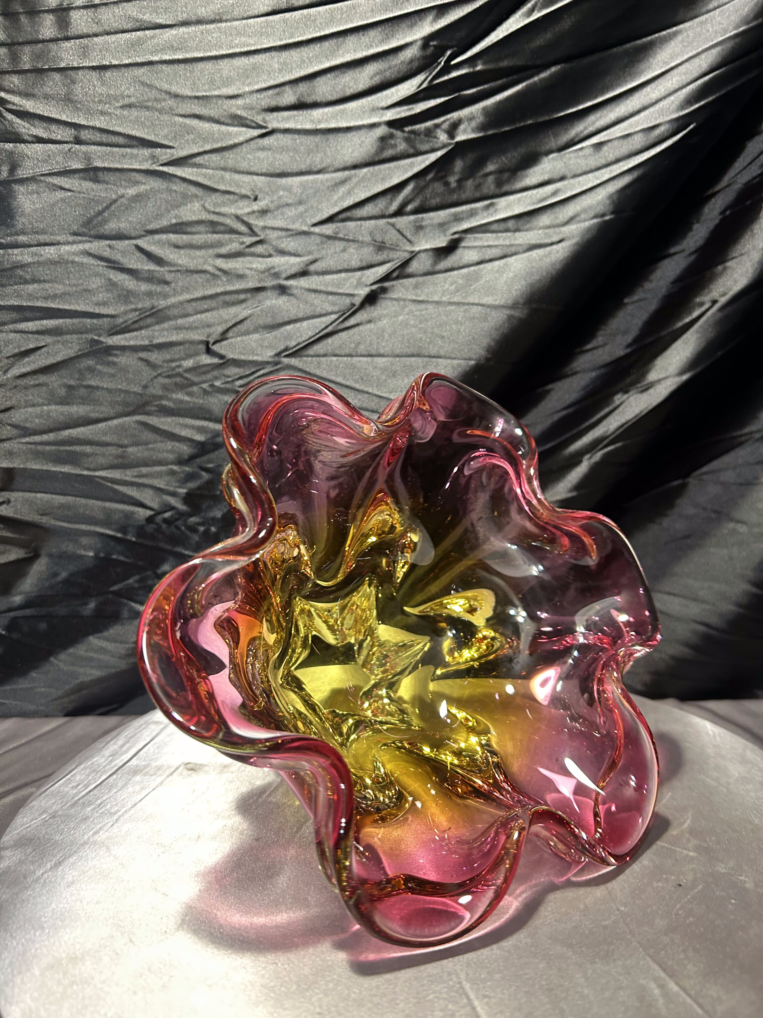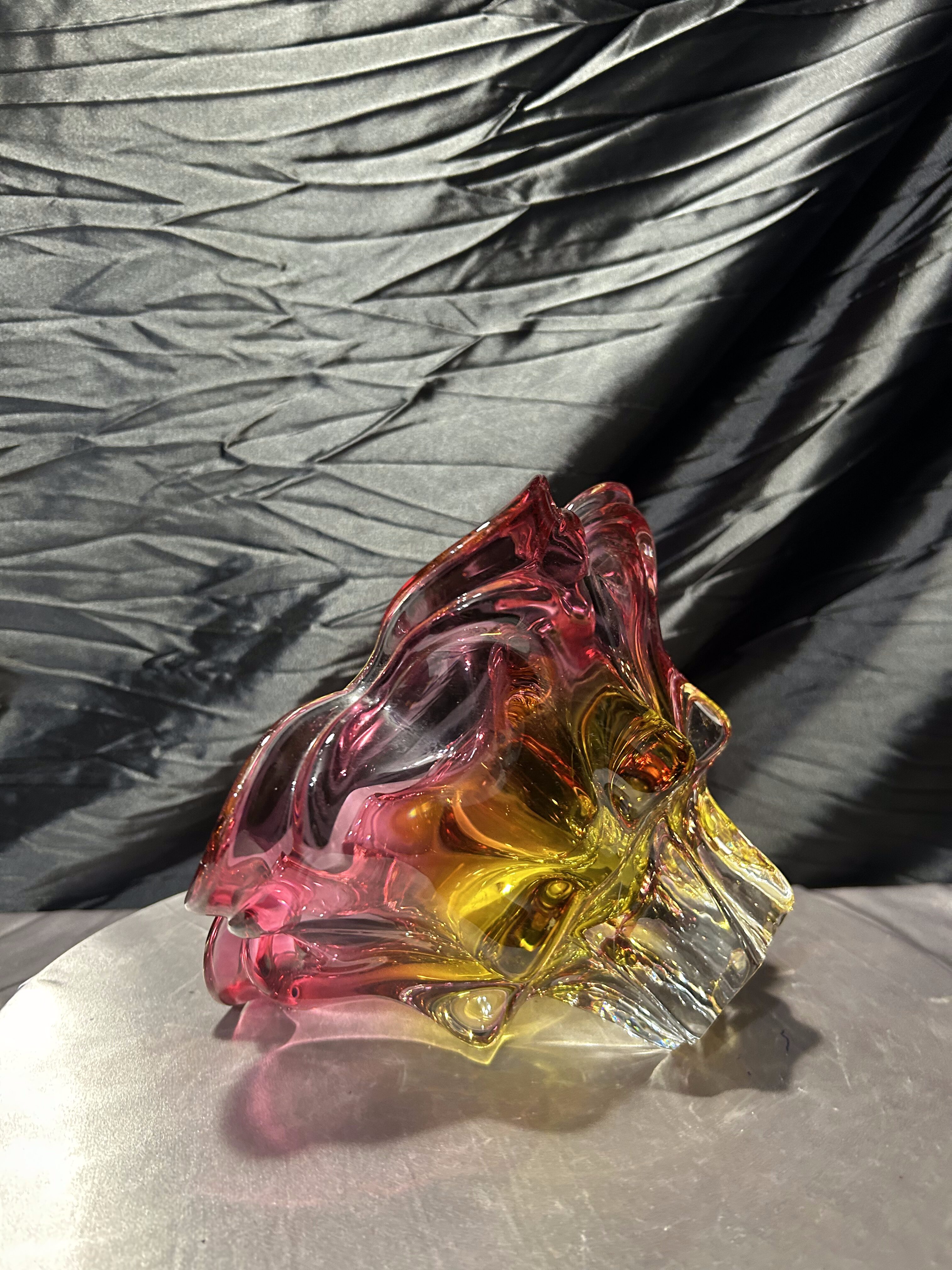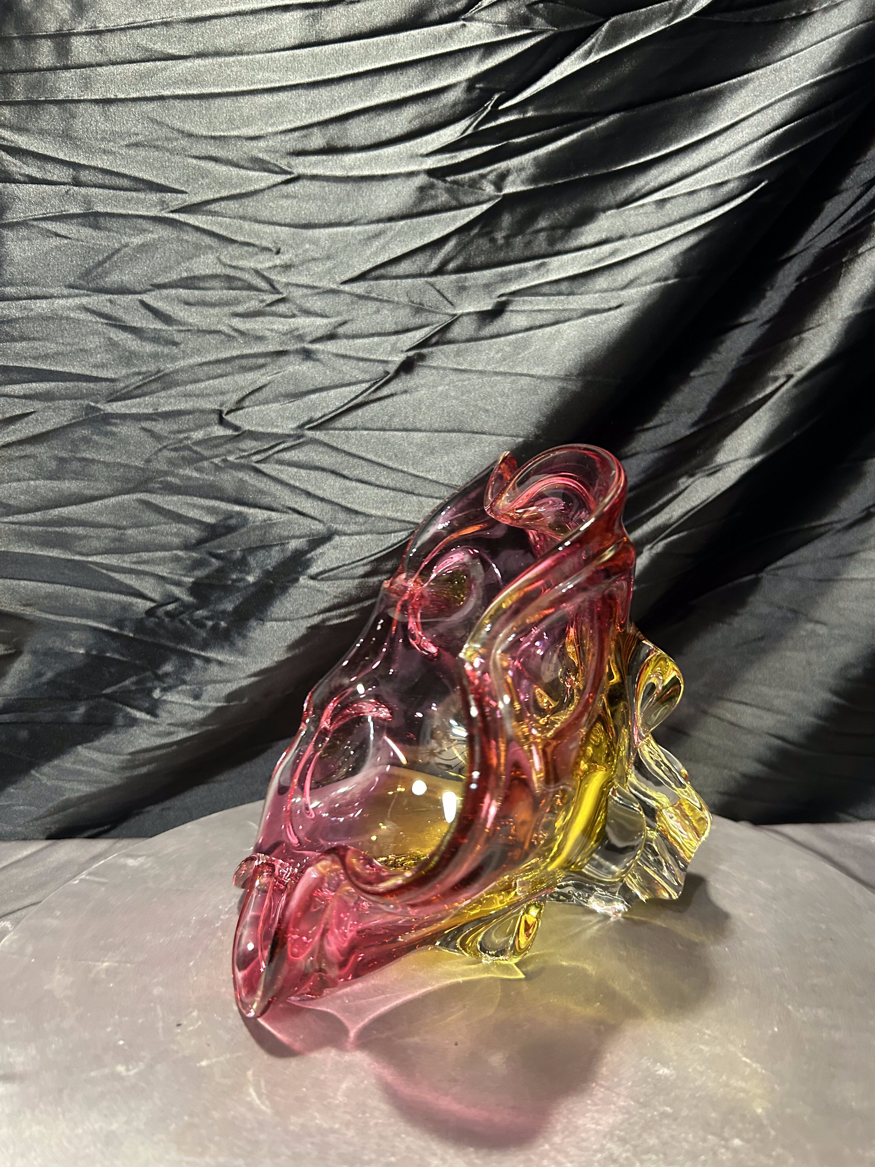 Bardzo duża, efektowna misa ze szkła artystycznego autorstwa Josefa (Józefa) Hospodki, jednego z czołowych projektantów czechosłowackiego szkła artystycznego XX wieku. Forma o wyraźnie falowanym, organicznym brzegu i intensywnym zestawieniu barw – odcieni różu, bursztynu i złota – jest charakterystyczna dla nurtu Bohemian Project.