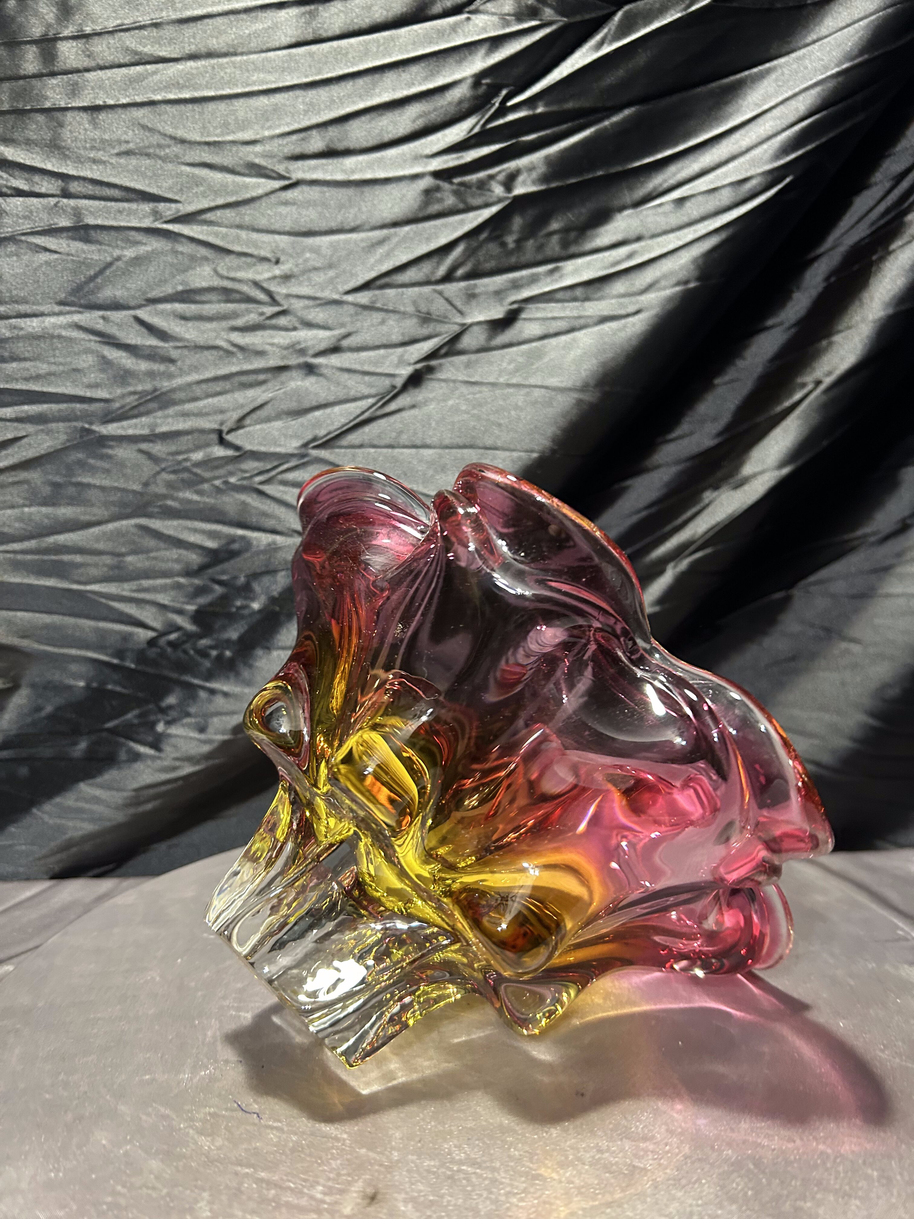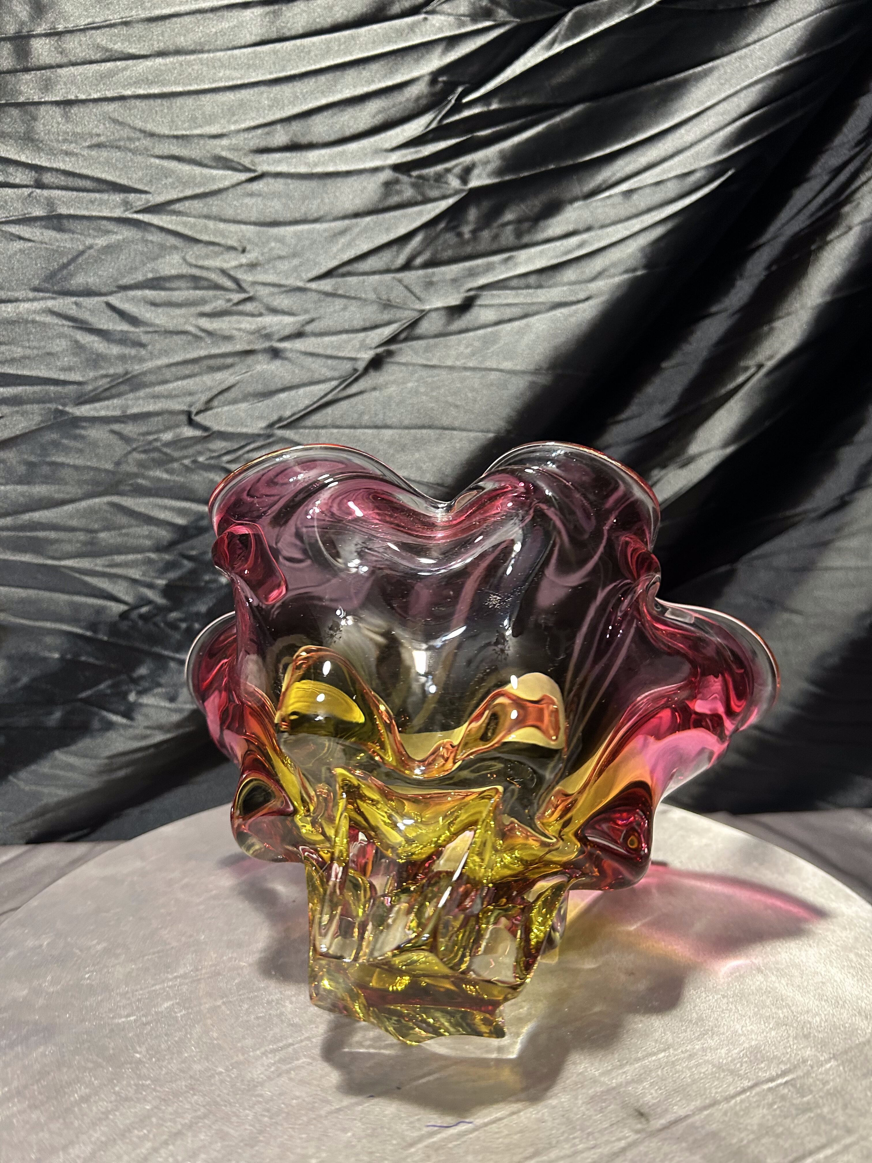To wyrazisty przykład czeskiej szkoły szkła artystycznego, który doskonale sprawdzi się jako centralny element dekoracyjny we wnętrzu lub w kolekcji designu XX wieku. Forma i kolorystyka przyciągają uwagę nawet bez dodatkowej aranżacji.