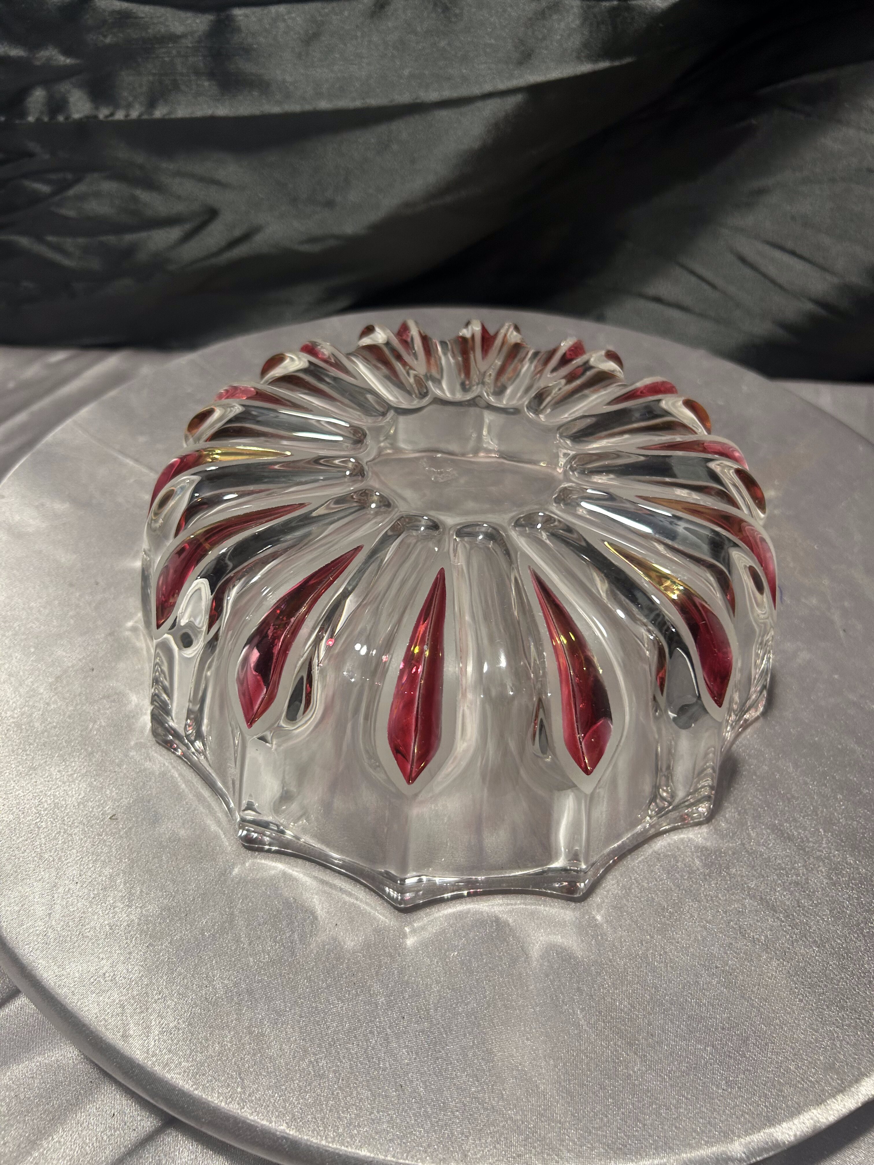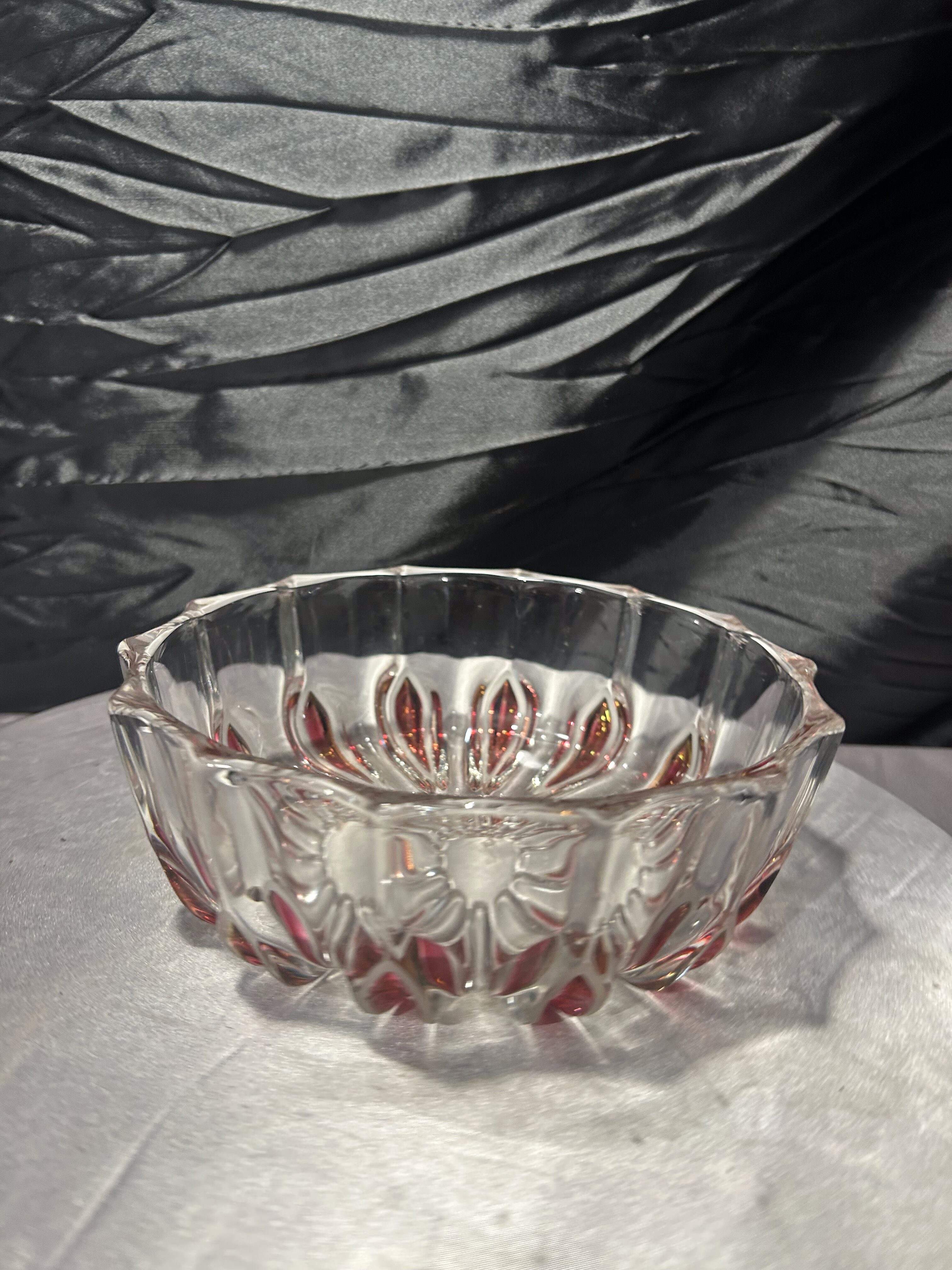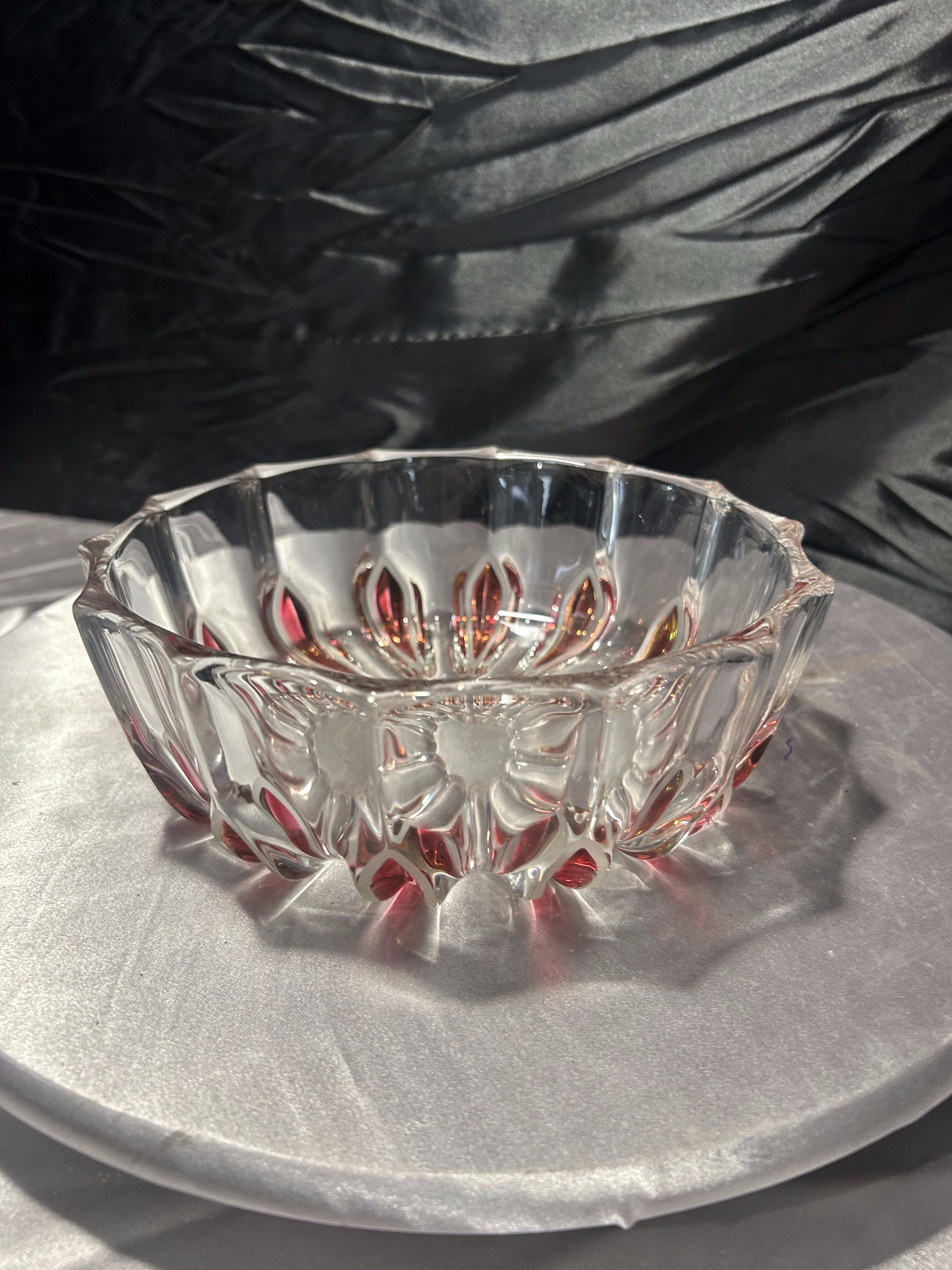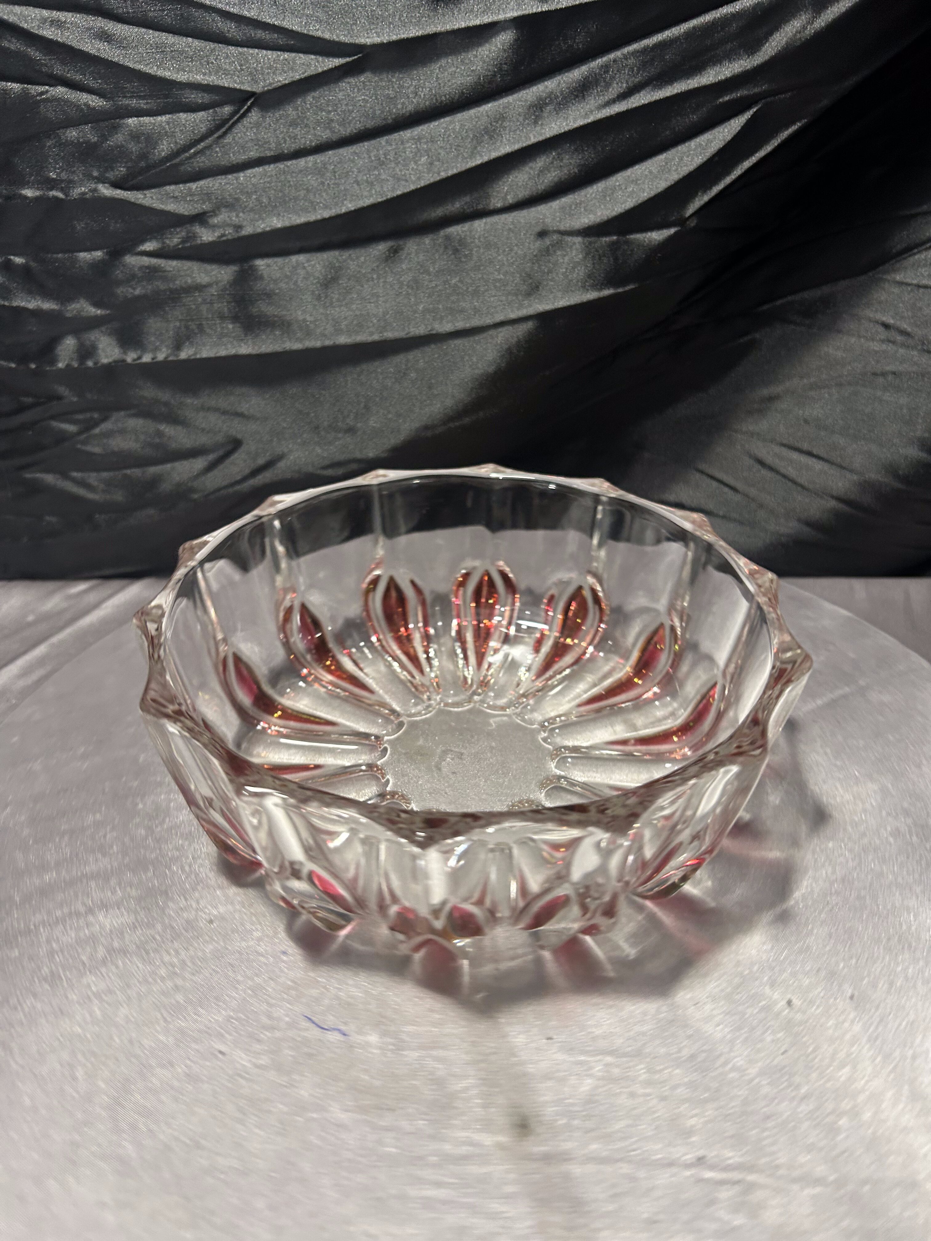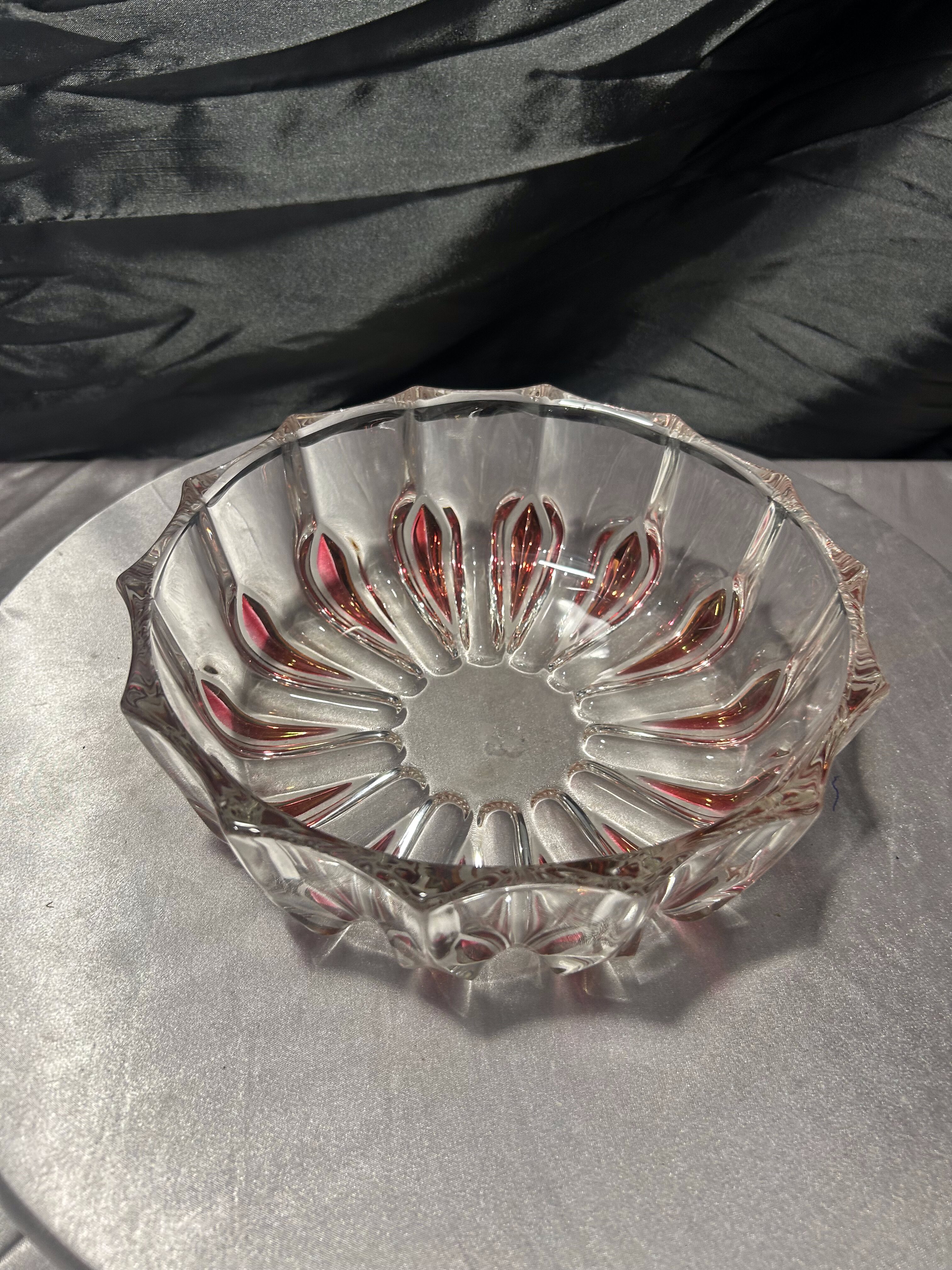 W niektórych elementach widoczny jest subtelny bordowy odcień, który pięknie podkreśla głębię szkła i tworzy ciekawy efekt świetlny. Misa doskonale odbija światło, prezentując się wyjątkowo dekoracyjnie zarówno na stole, jak i na komodzie czy witrynie.