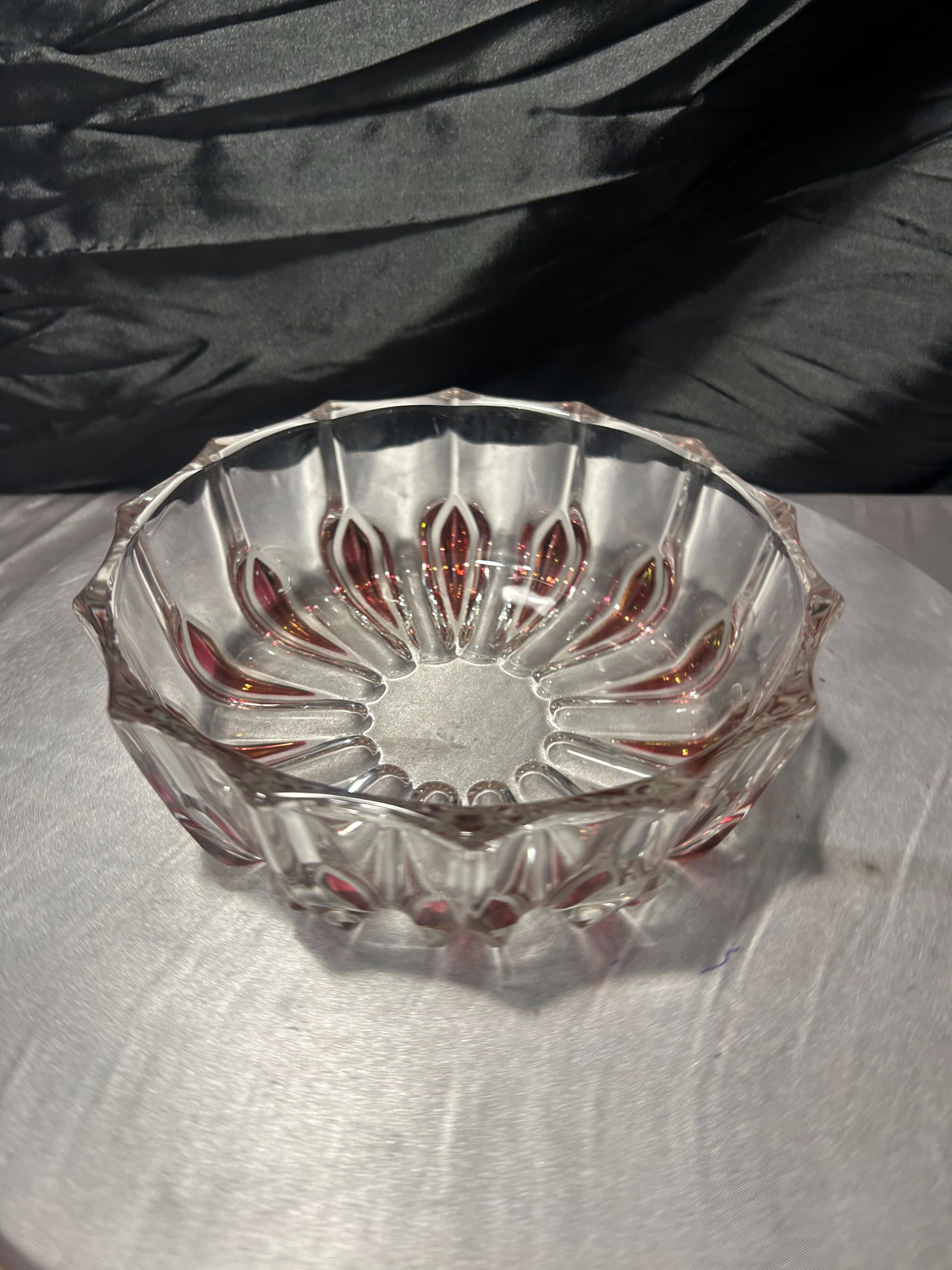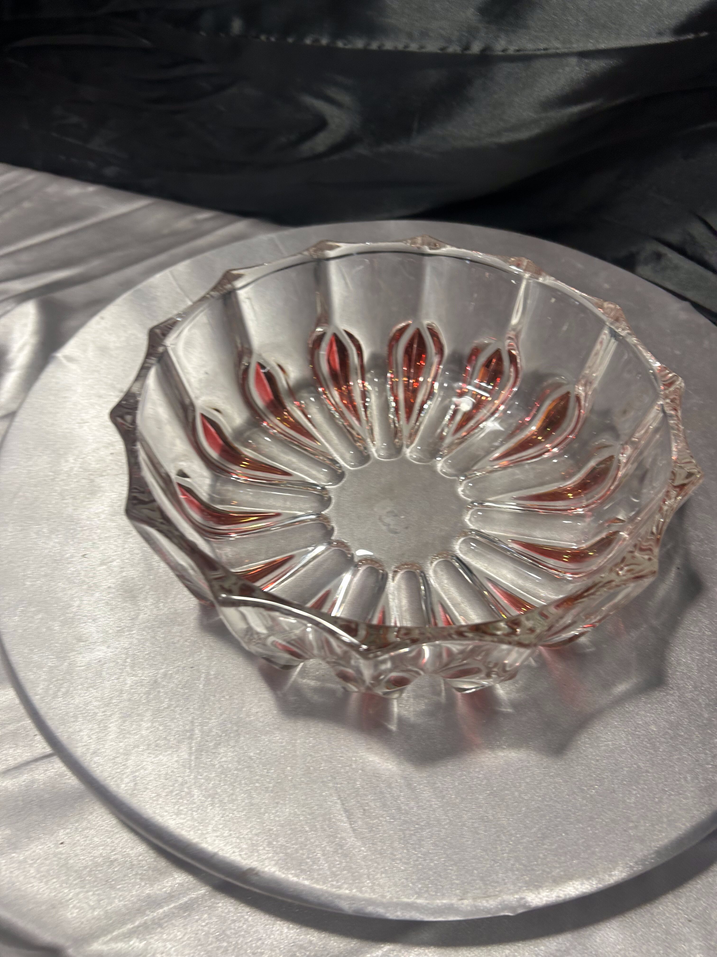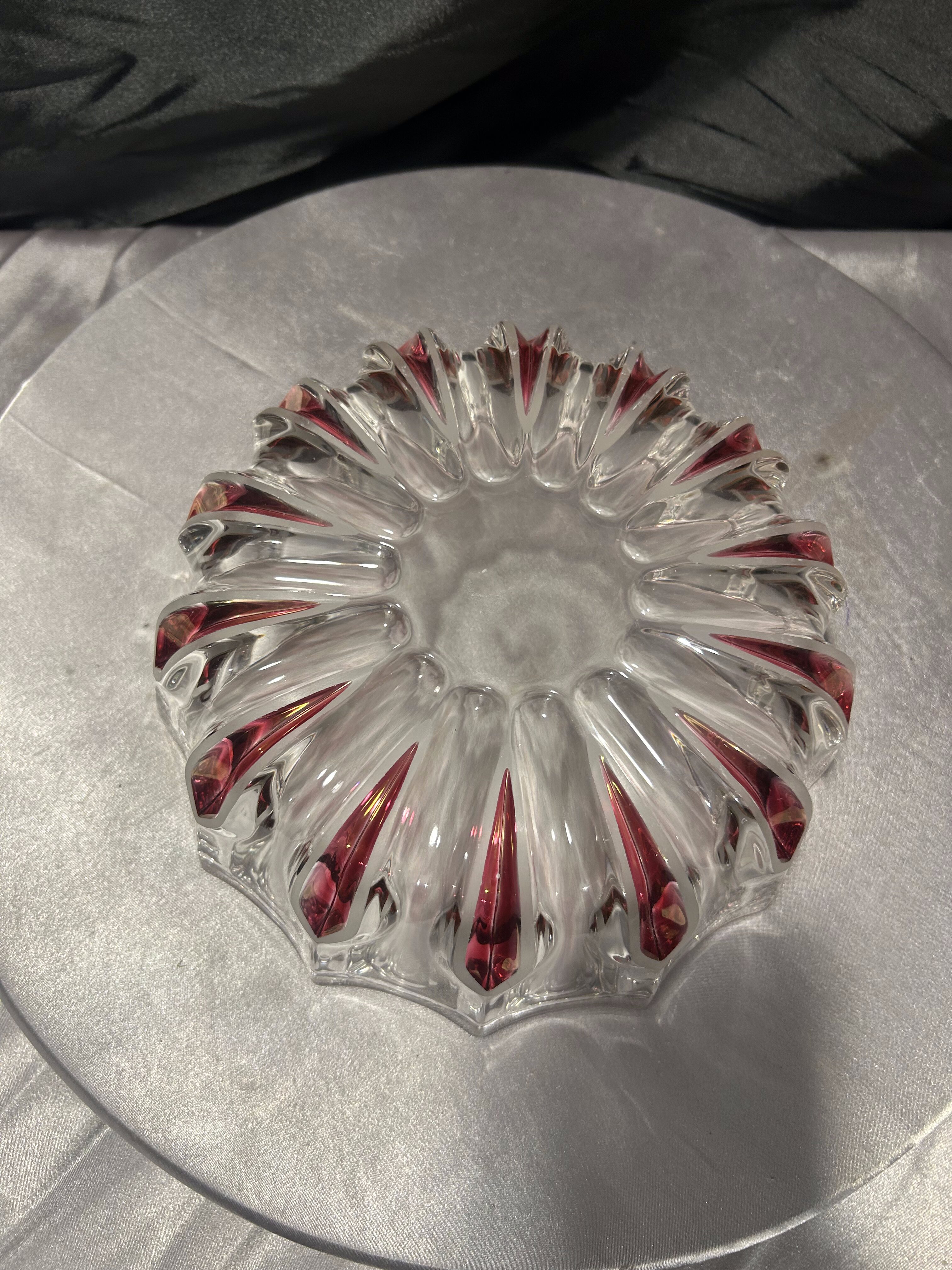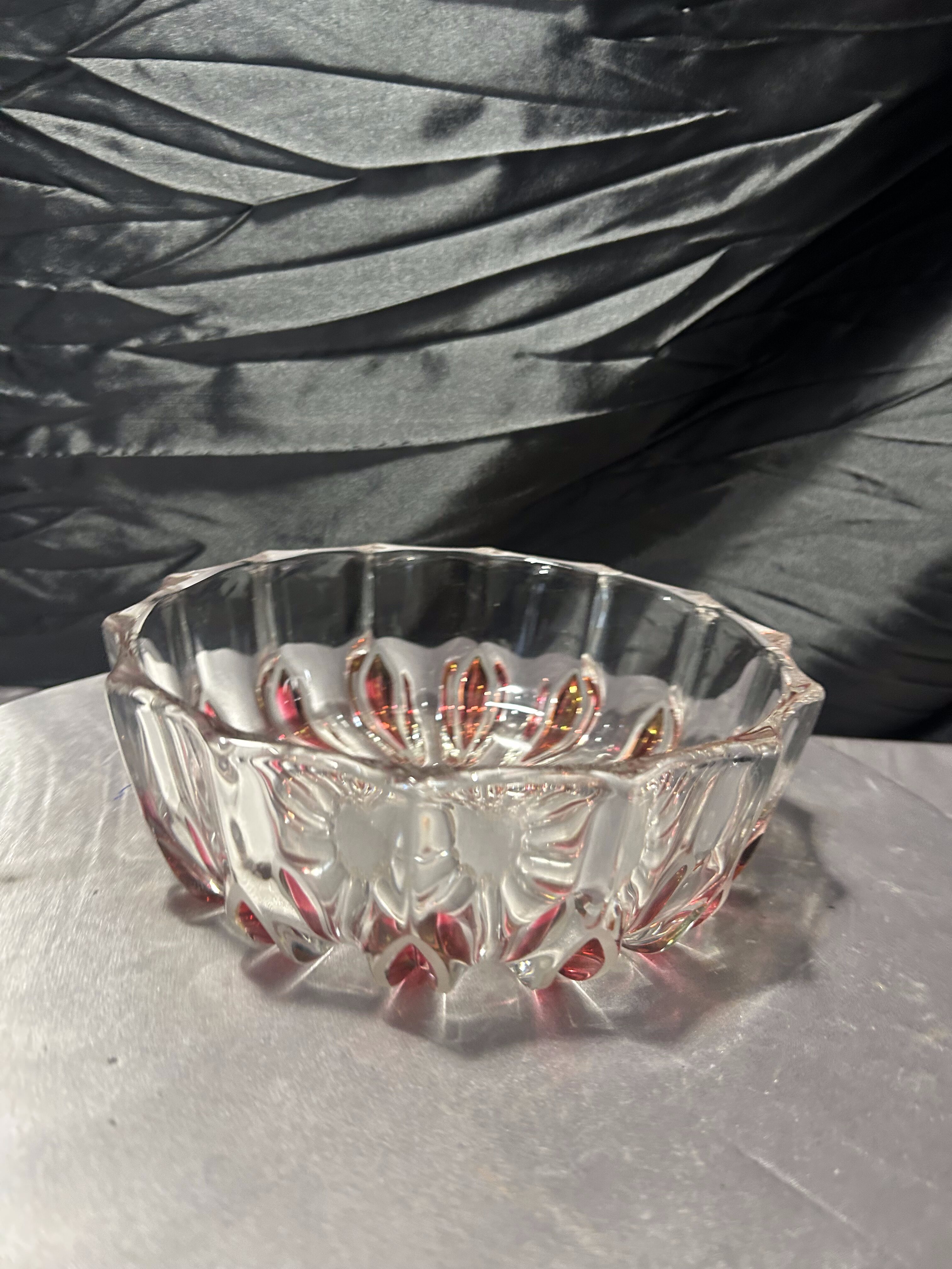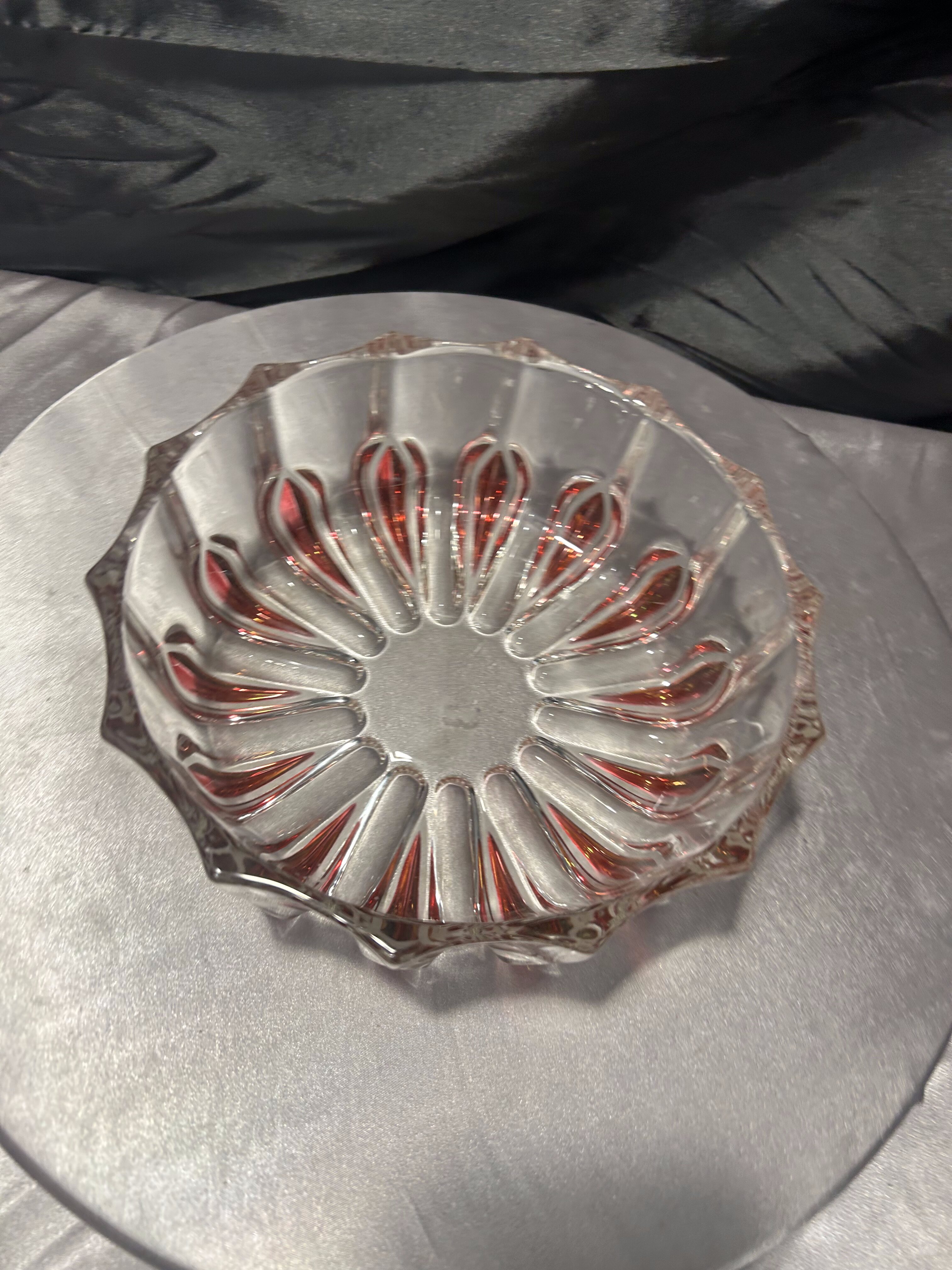 W niektórych elementach widoczny jest subtelny bordowy odcień, który pięknie podkreśla głębię szkła i tworzy ciekawy efekt świetlny. Misa doskonale odbija światło, prezentując się wyjątkowo dekoracyjnie zarówno na stole, jak i na komodzie czy witrynie.