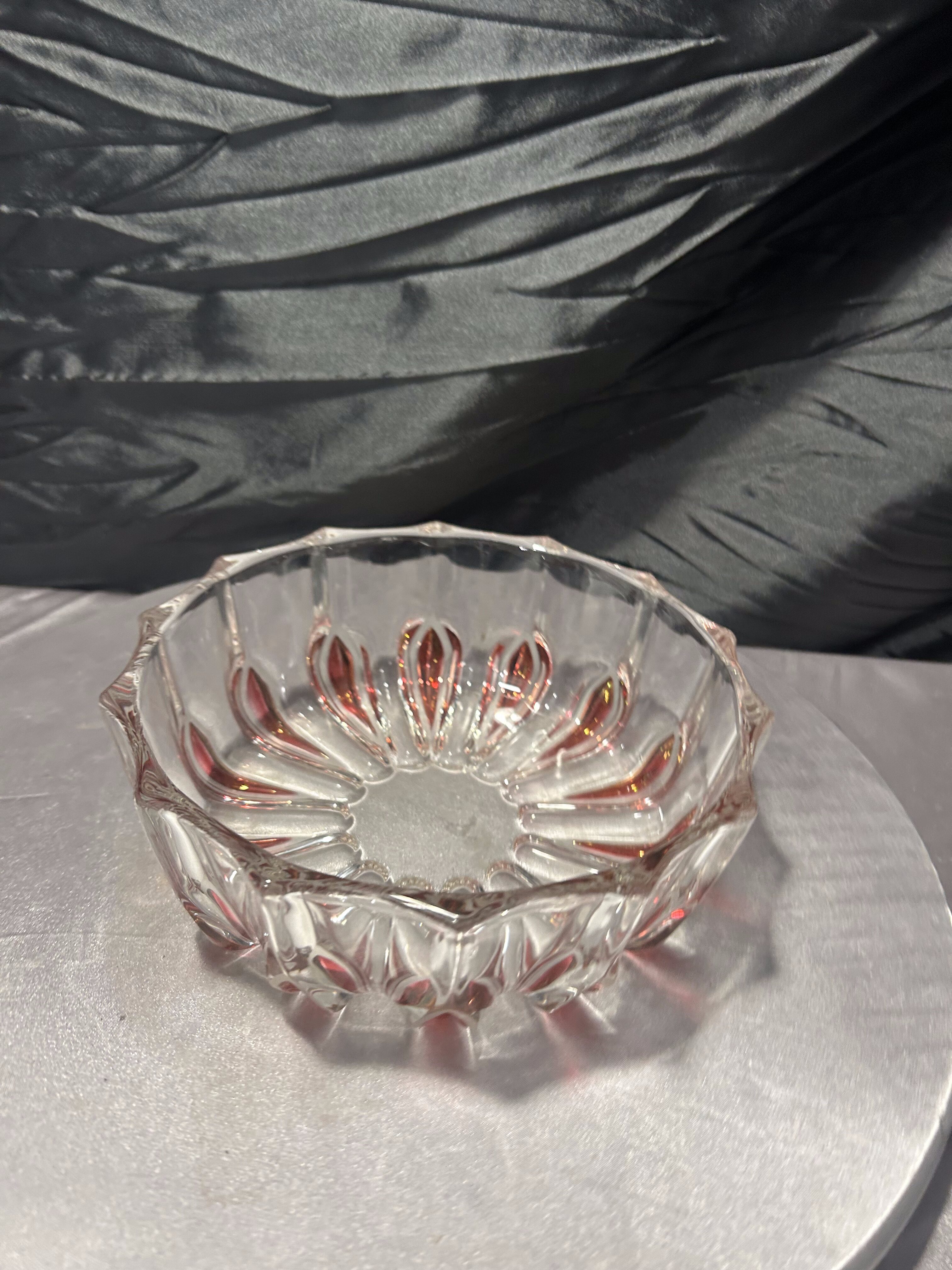 Efektowna misa wykonana ze szkła artystycznego, o wyraźnej, promienistej strukturze przypominającej kryształowy szlif. Dekoracyjne ryciny oraz falowany rant nadają jej elegancki, klasyczny charakter.
