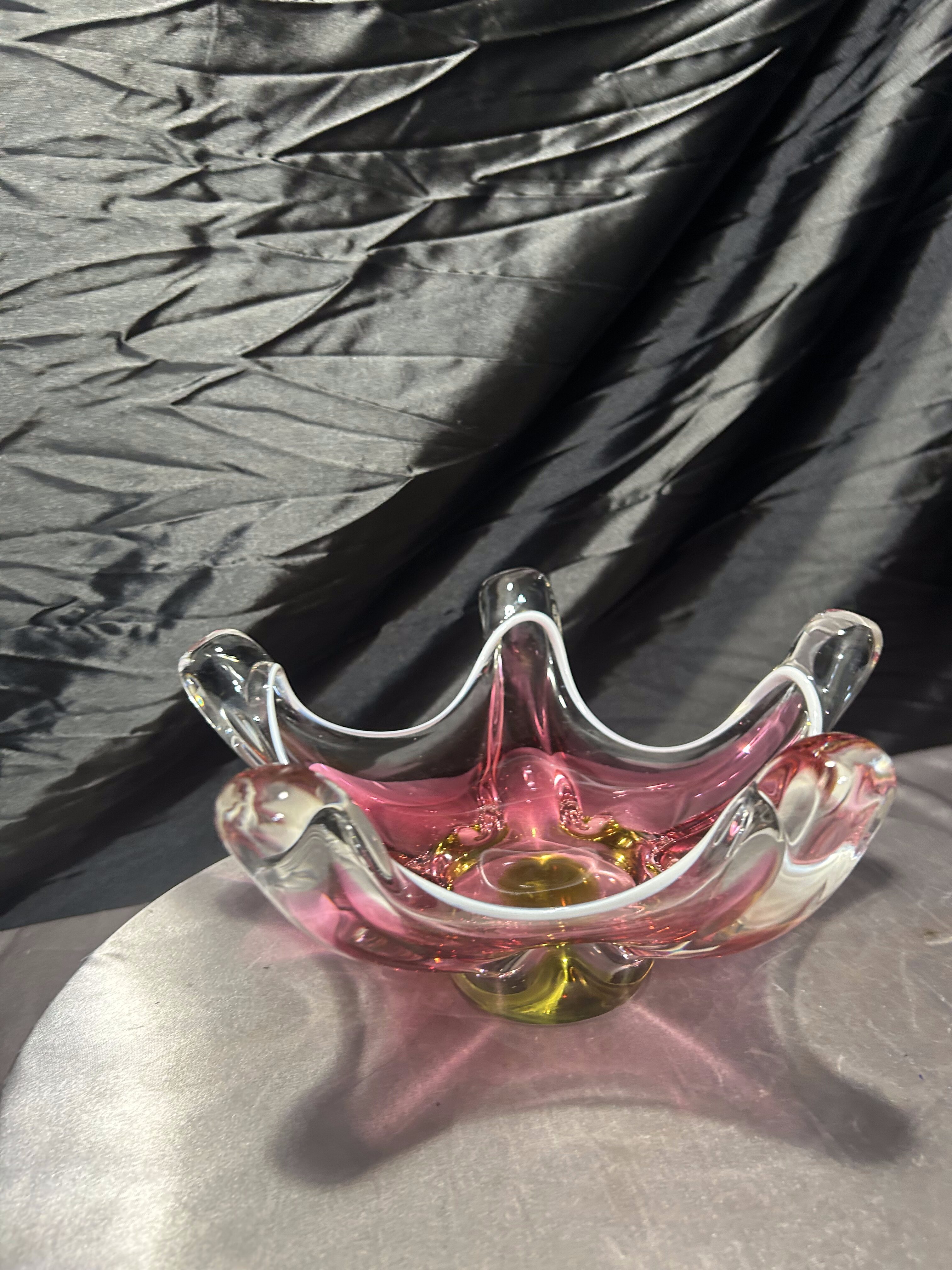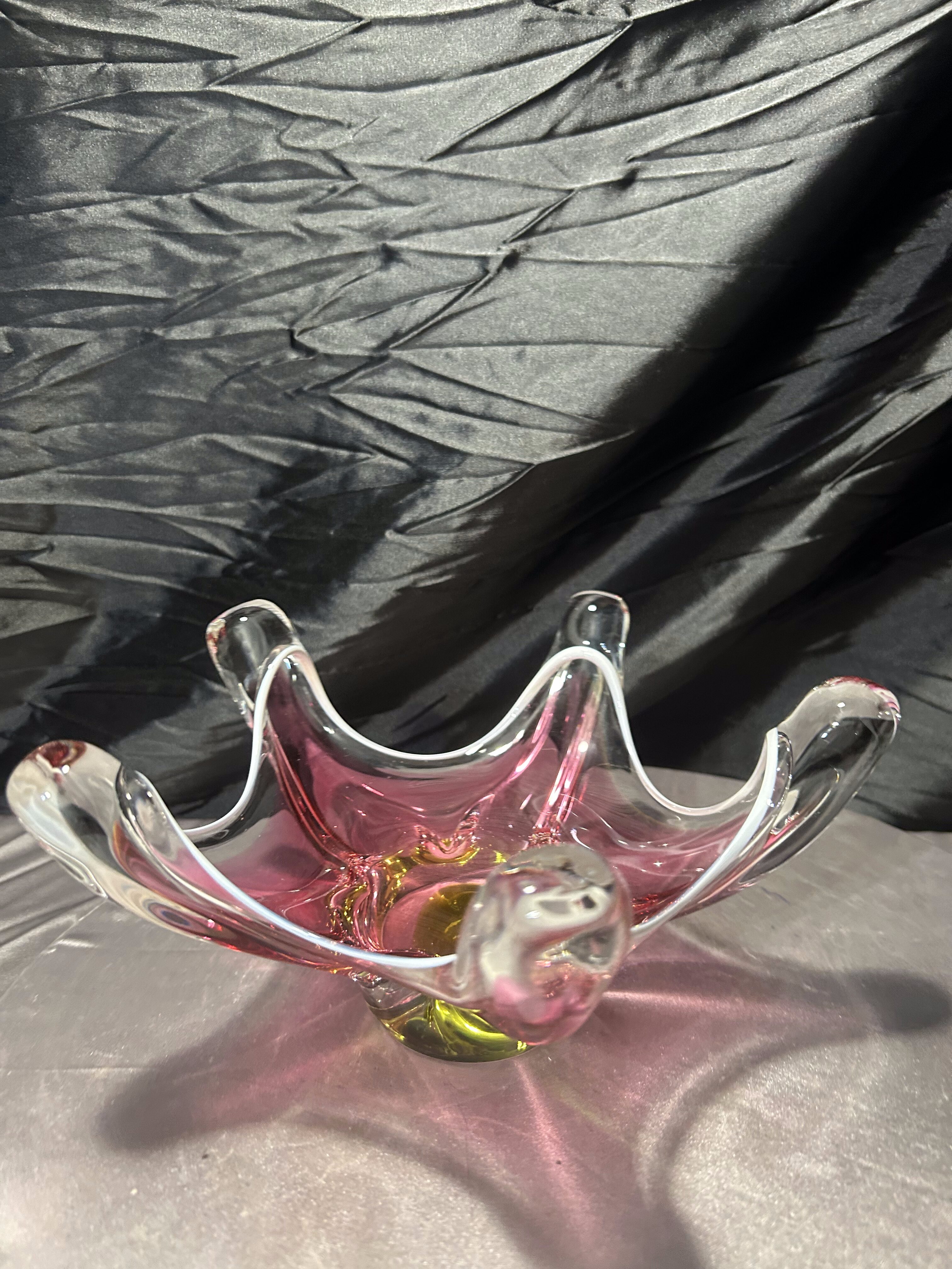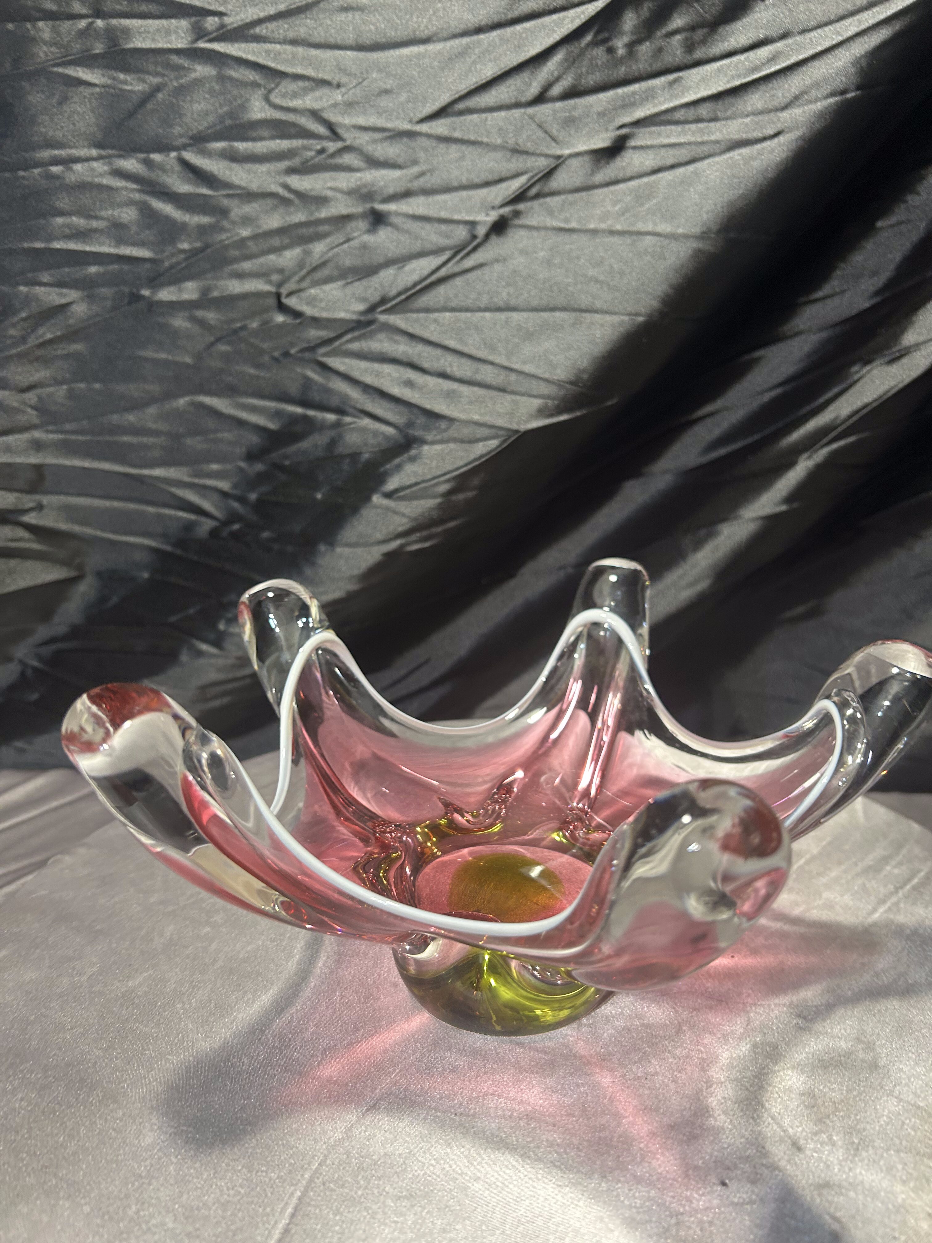 Efektowna misa ze szkła artystycznego Murano, wykonana ręcznie w charakterystycznej, rzeźbiarskiej formie przypominającej rozgwiazdę. Naczynie zachwyca dynamiczną linią, falującą krawędzią oraz klasycznym białym paskiem latticino, typowym dla wyrobów muranowskich.