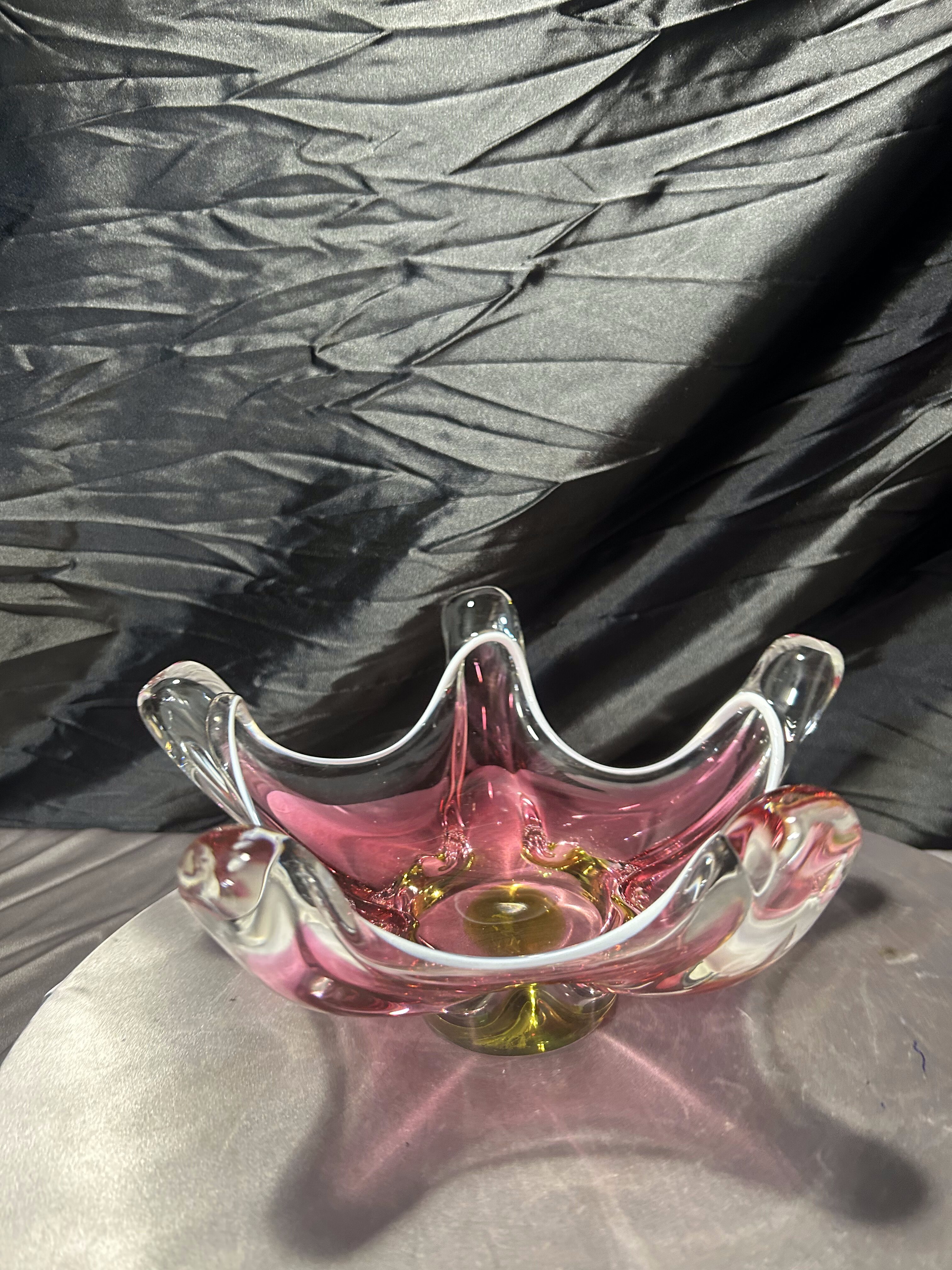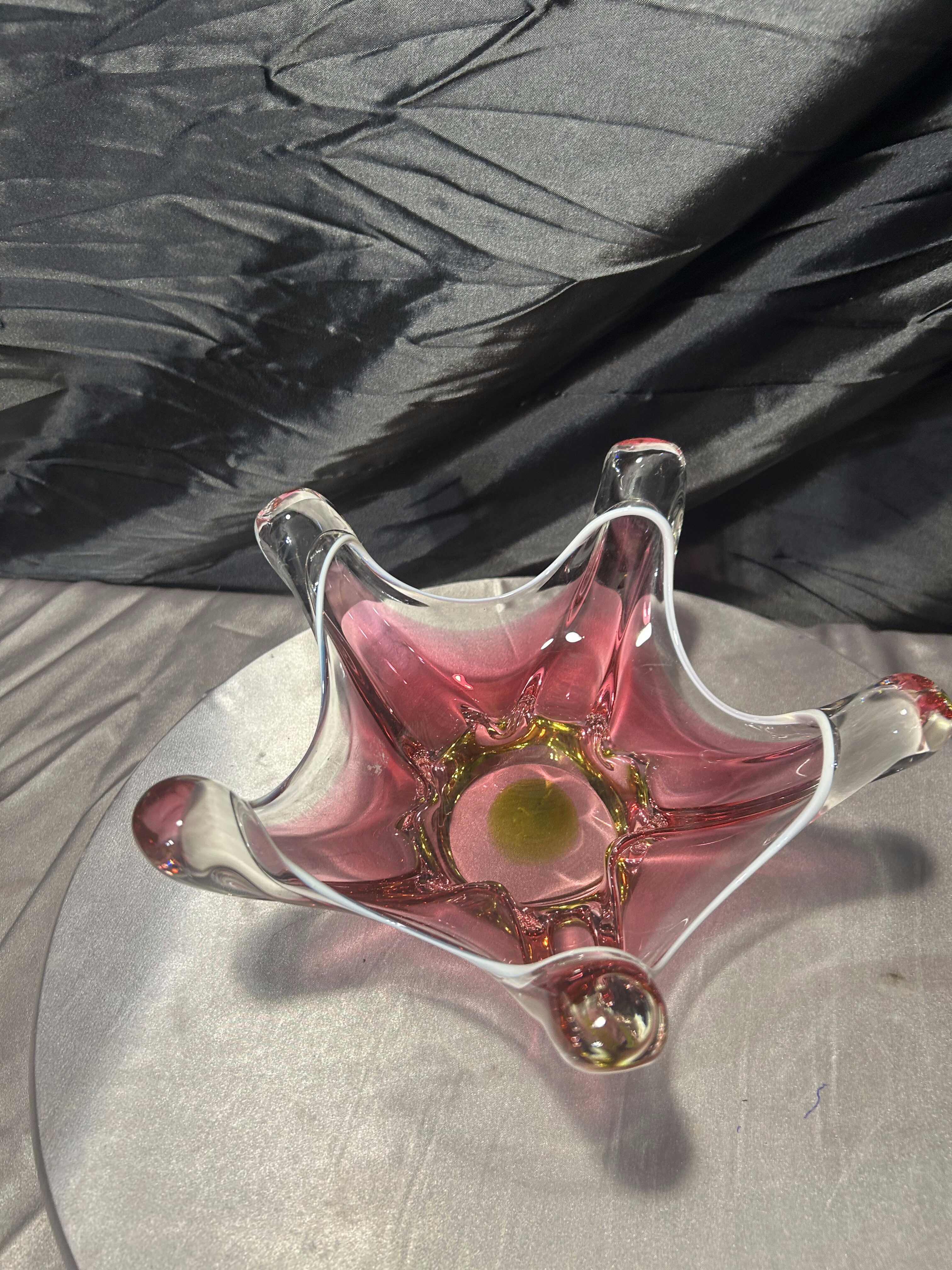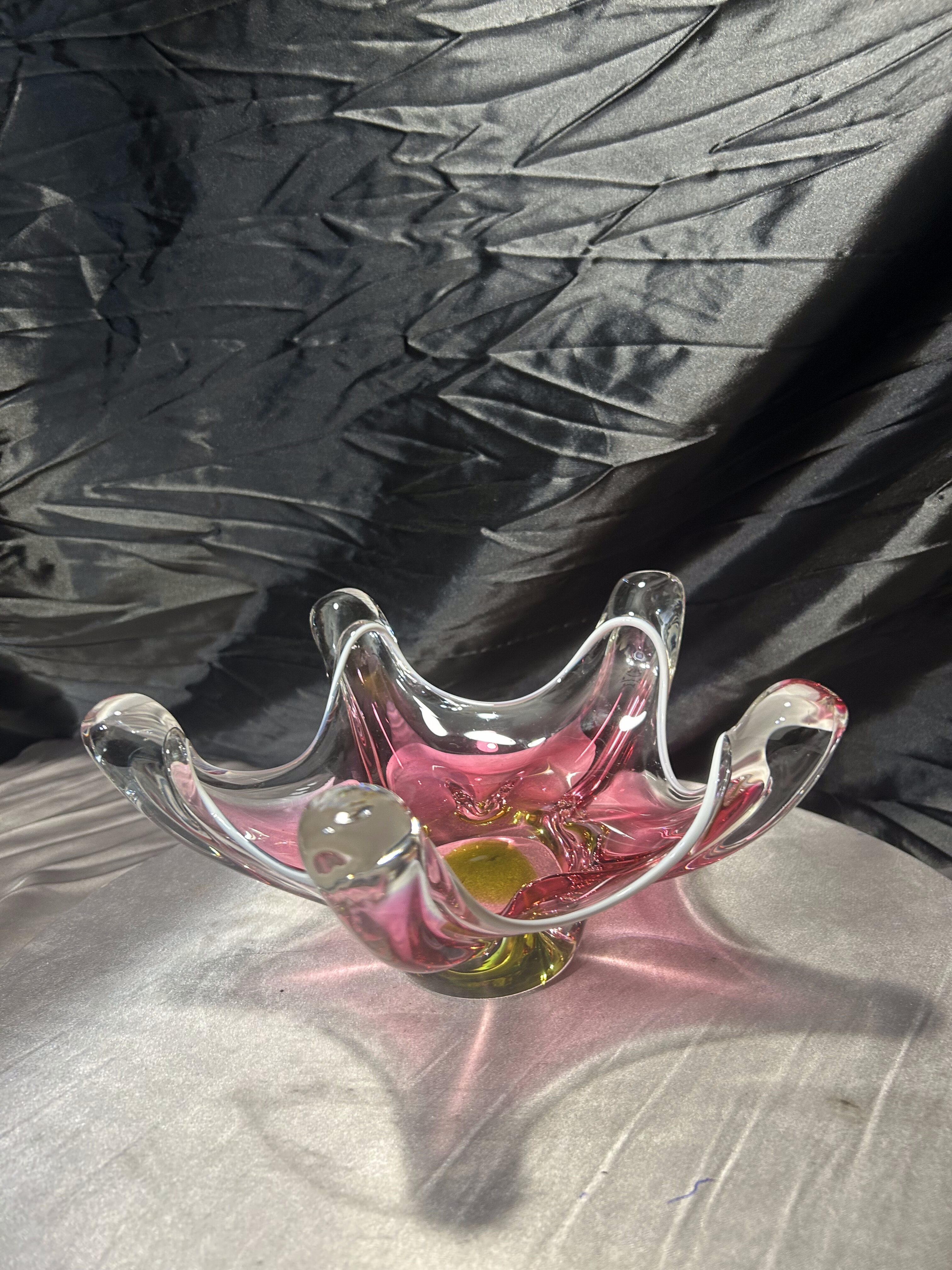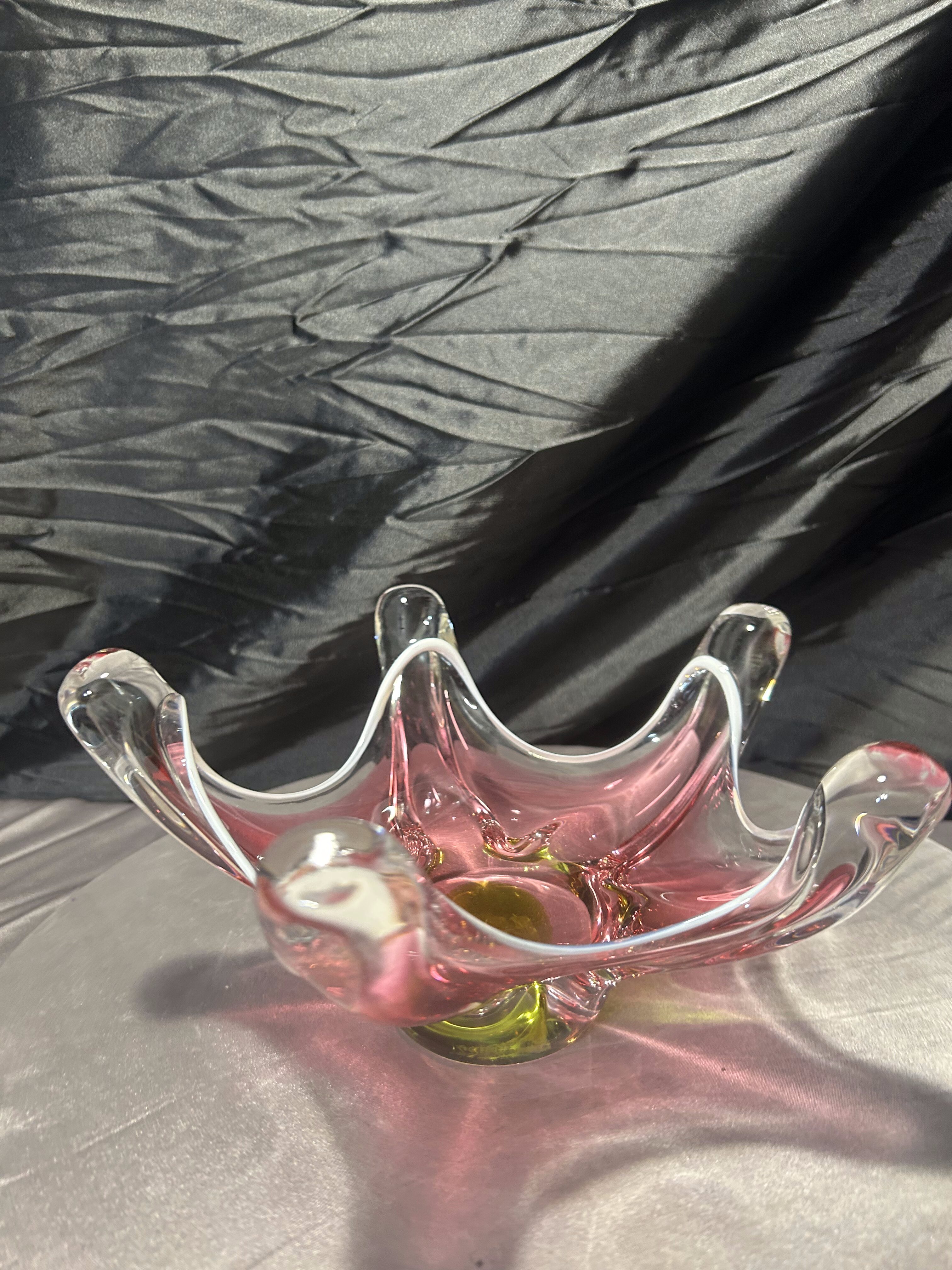 Efektowna misa ze szkła artystycznego Murano, wykonana ręcznie w charakterystycznej, rzeźbiarskiej formie przypominającej rozgwiazdę. Naczynie zachwyca dynamiczną linią, falującą krawędzią oraz klasycznym białym paskiem latticino, typowym dla wyrobów muranowskich.