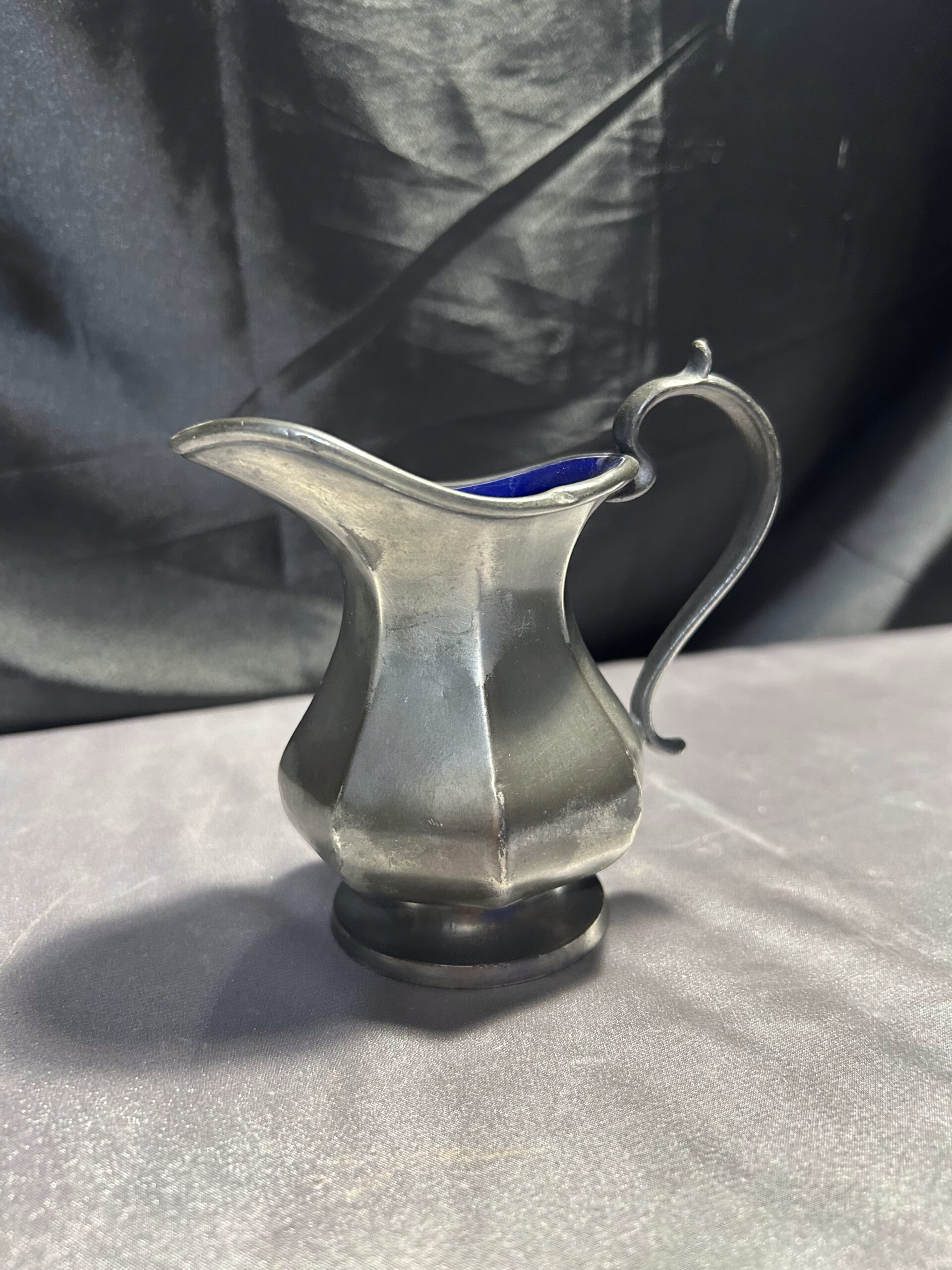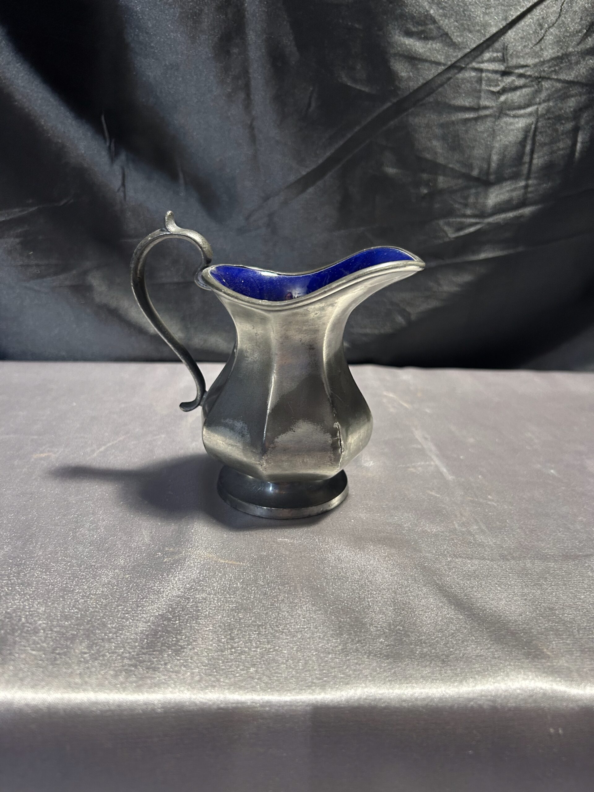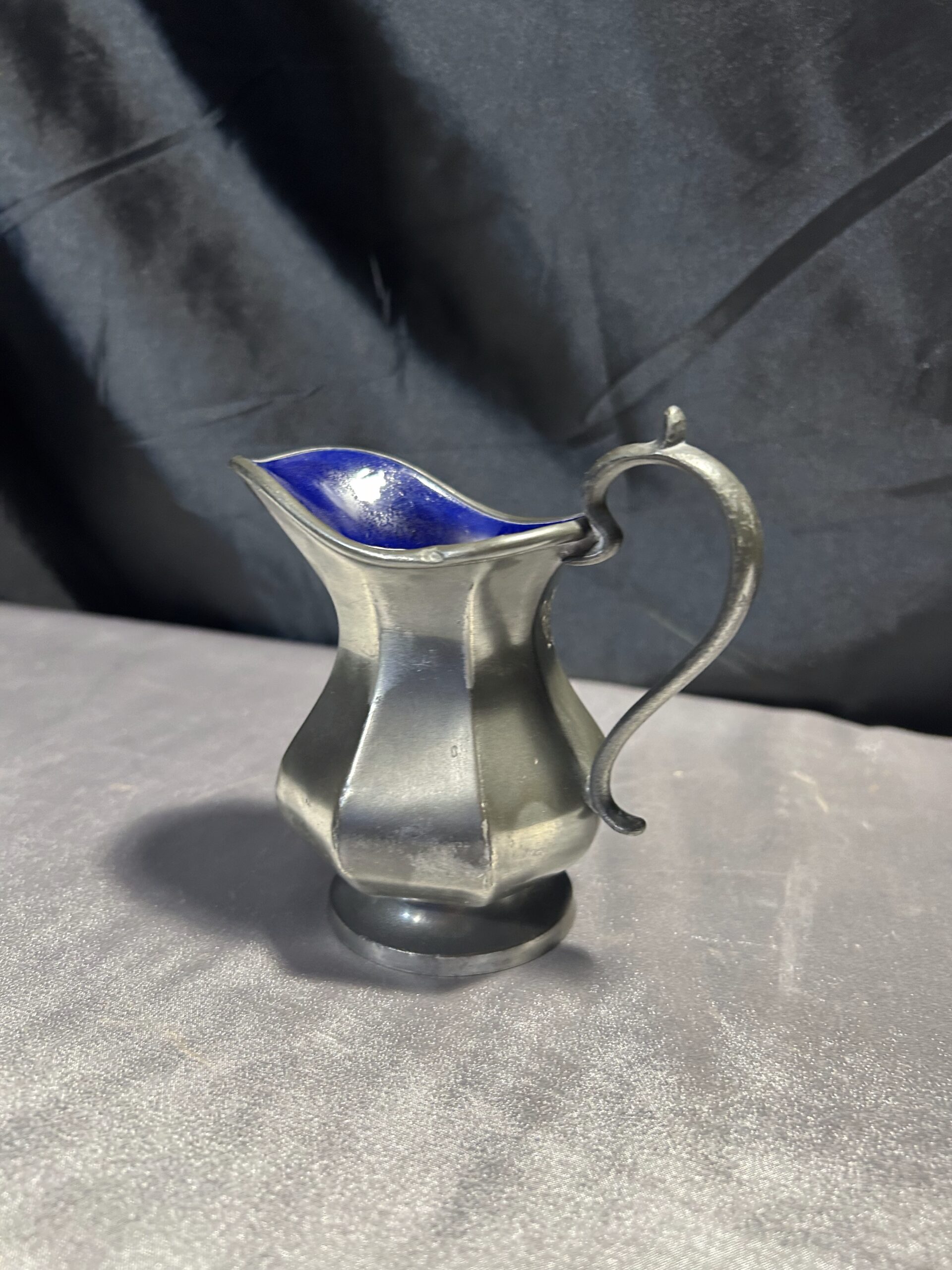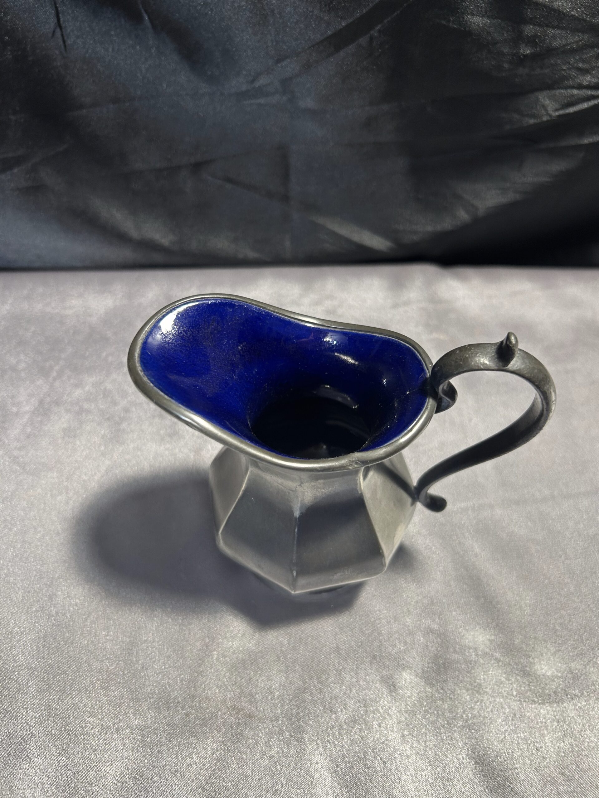 Ten elegancki mlecznik to doskonały dodatek do klasycznej zastawy stołowej. Połączenie srebrnego wykończenia na zewnątrz i granatowej, błyszczącej powłoki w środku nadaje mu wyjątkowego charakteru. Sygnatura BROADHEAD & ATKIN IELD 5696 podkreśla jego wysoką jakość i wartość kolekcjonerską.