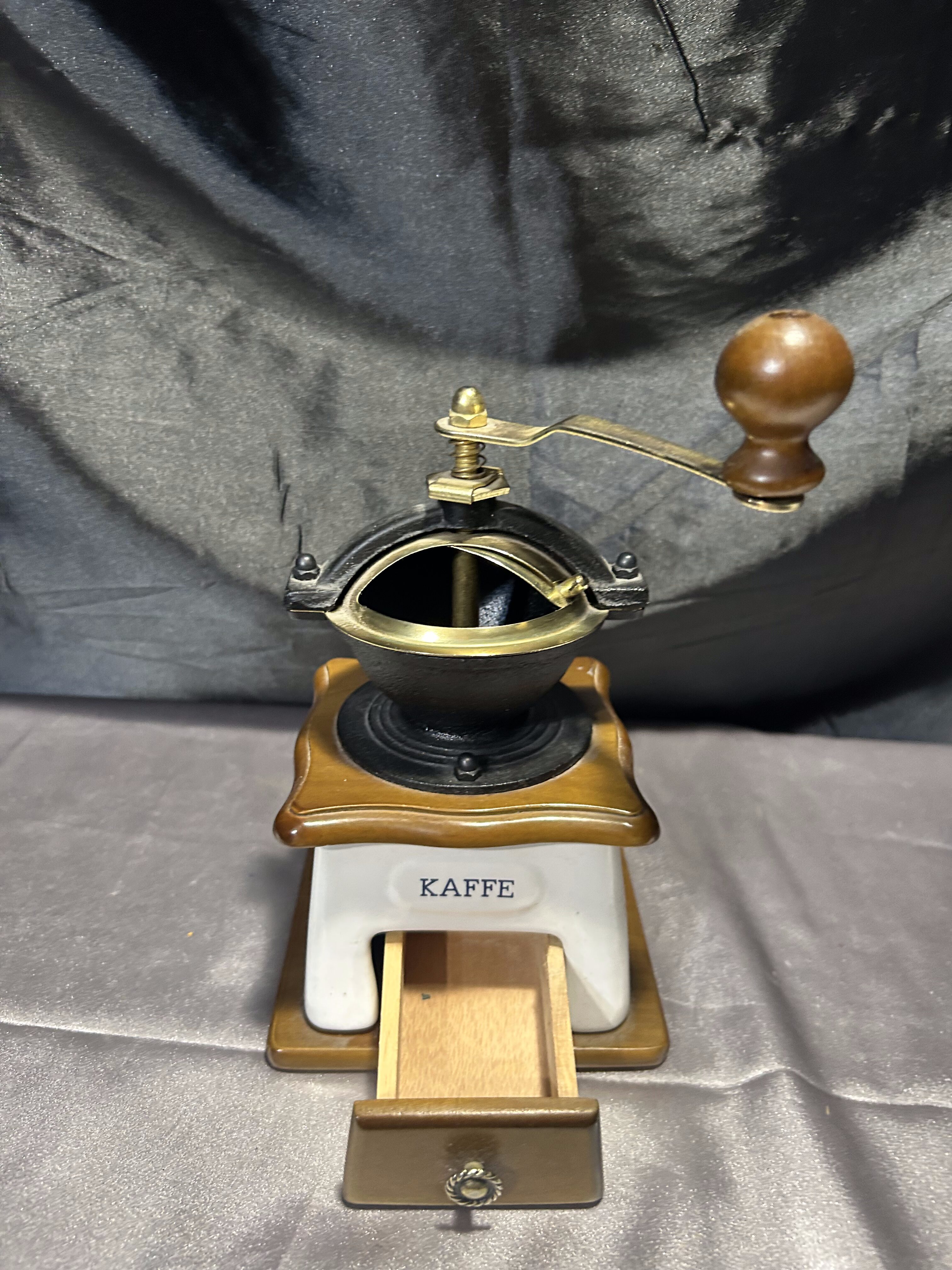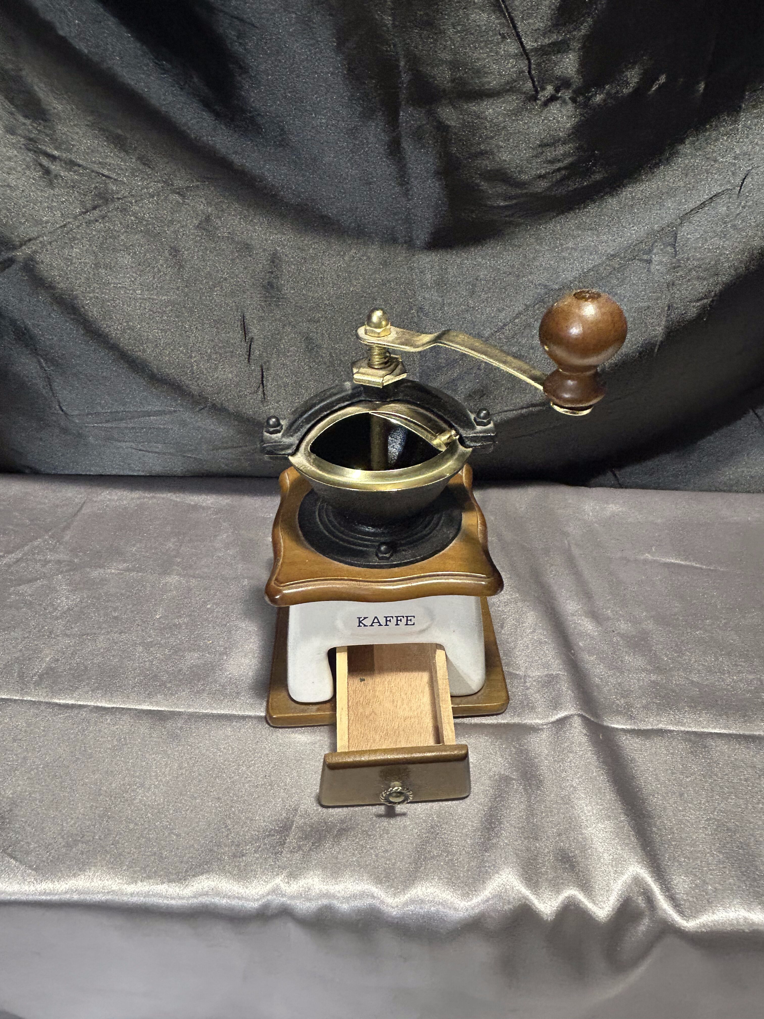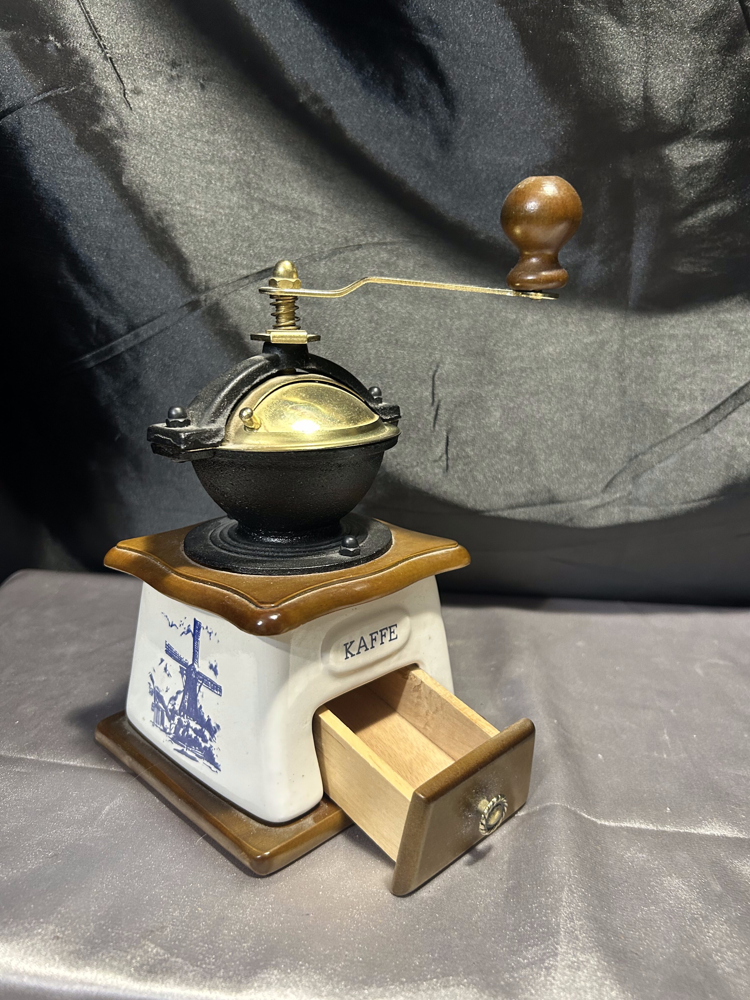 Drewniany młynek do kawy – Z szufladką – Sygnowany – Styl vintage