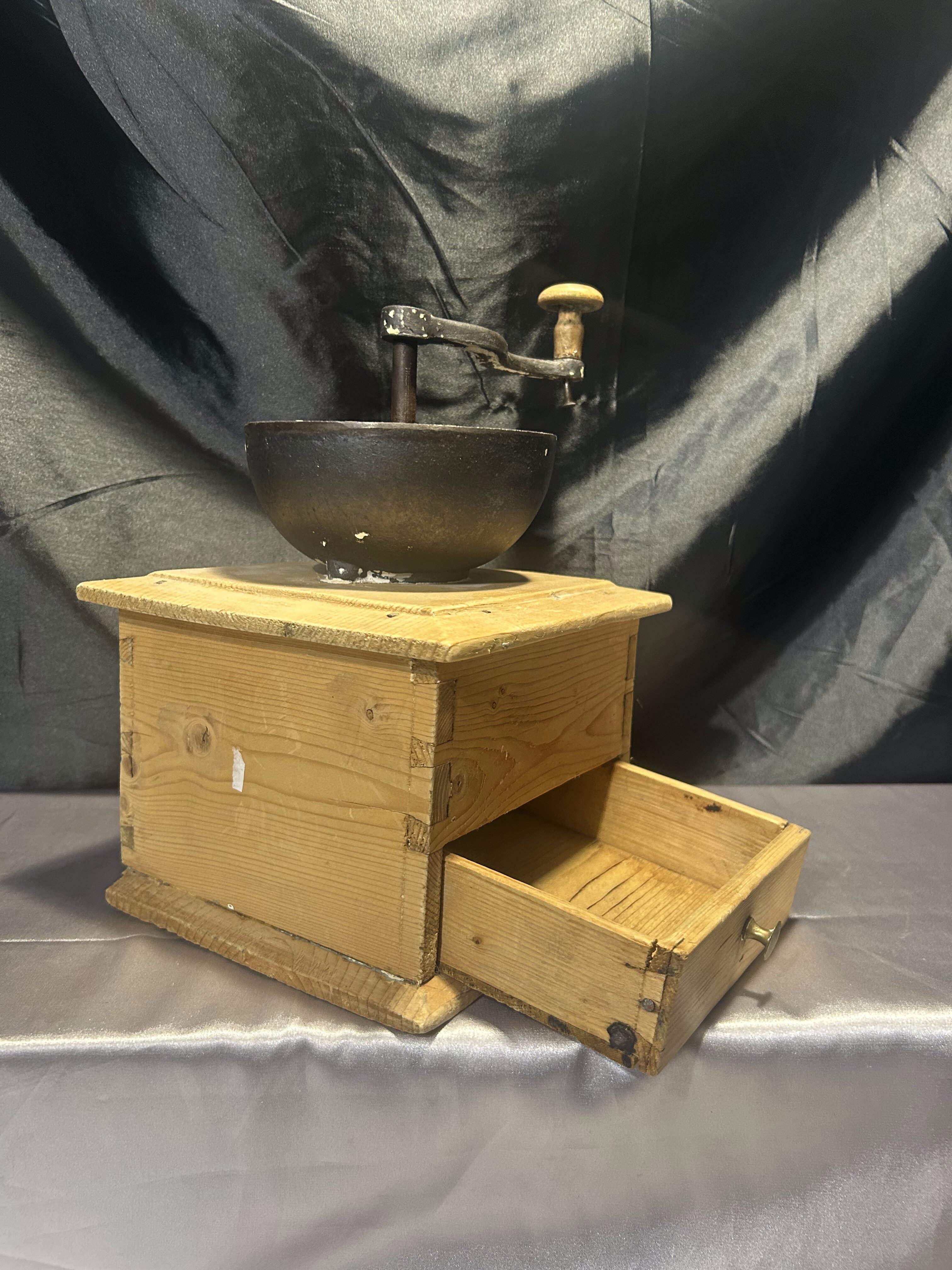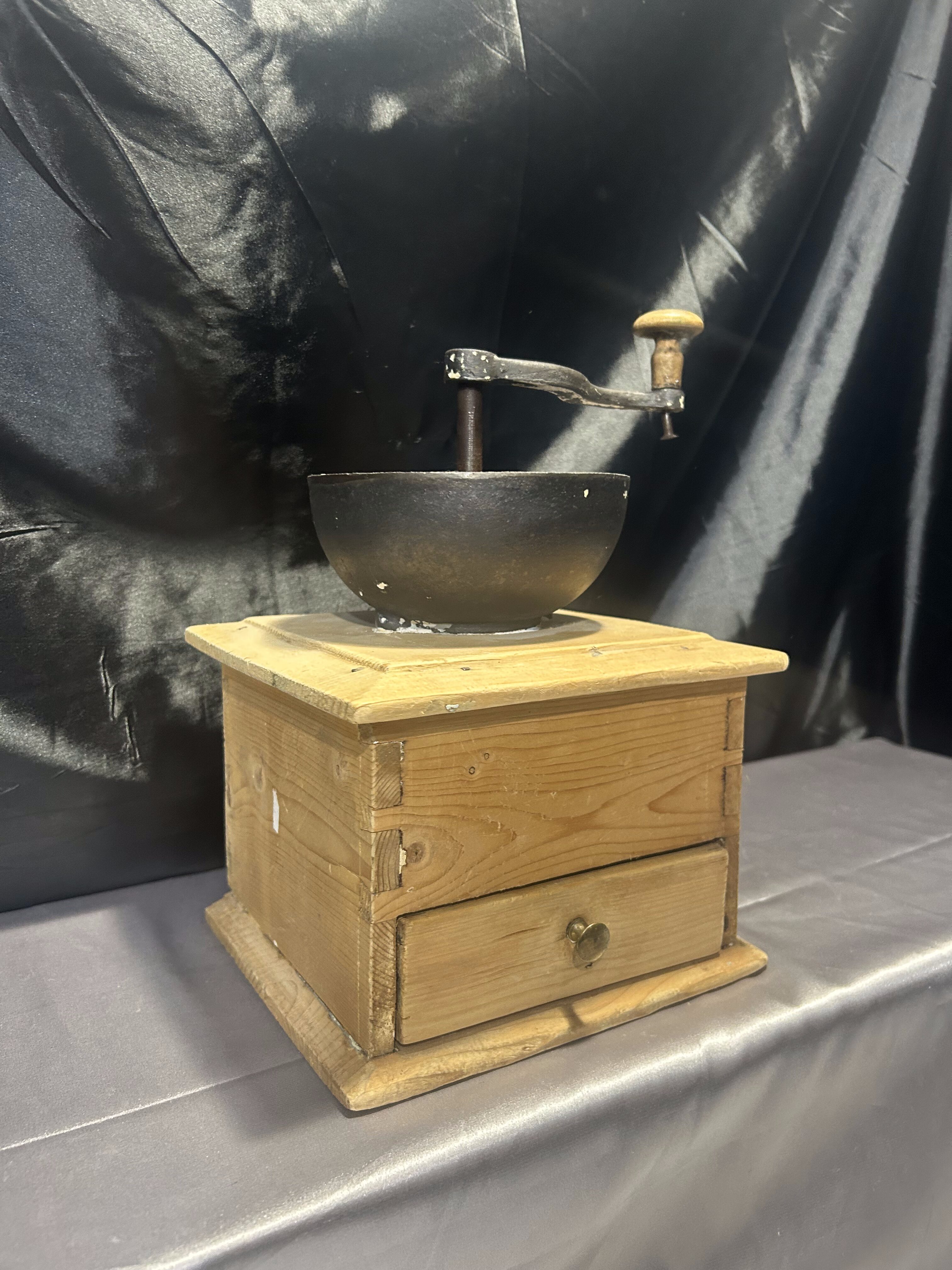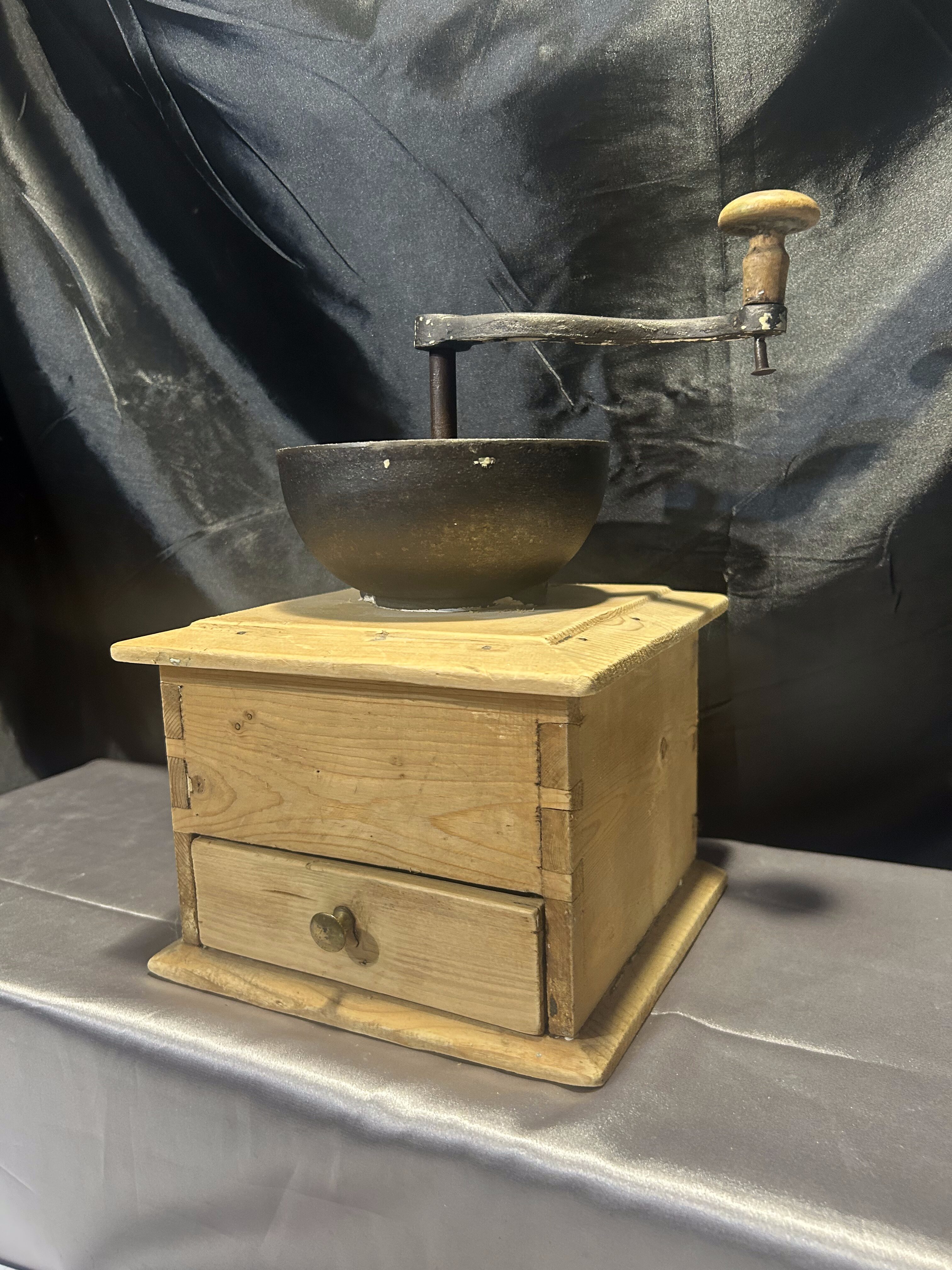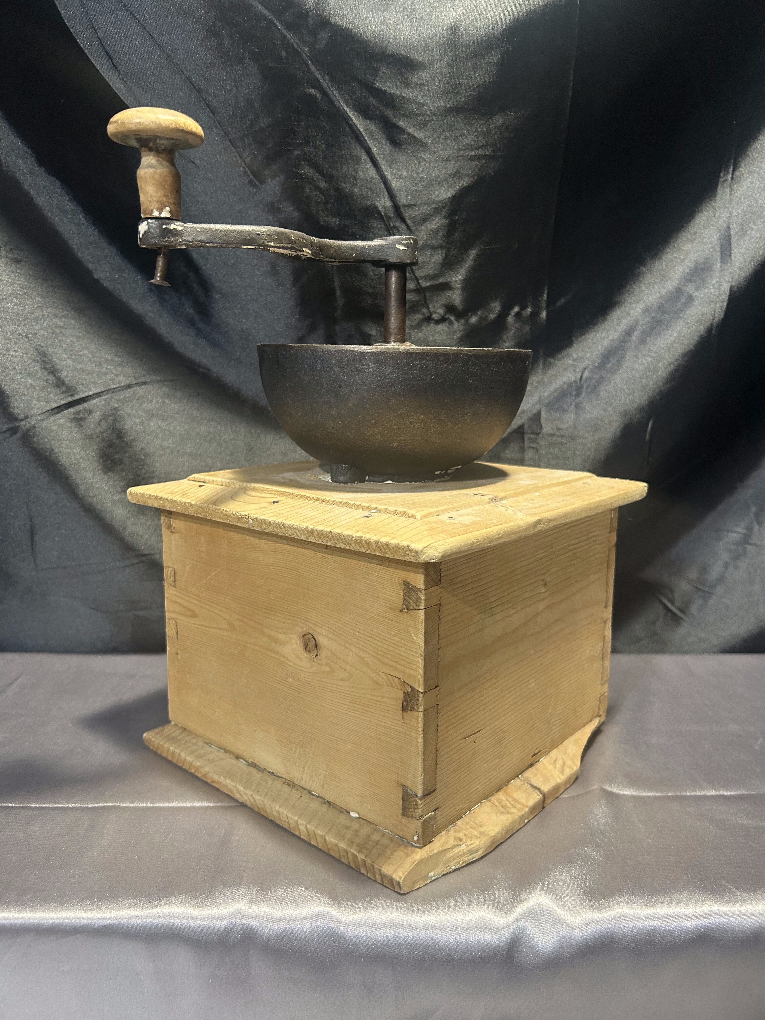 Na sprzedaż okazały, stary młynek do kawy wykonany z drewna, o imponujących rozmiarach i solidnej konstrukcji. Wyposażony w klasyczną szufladkę na zmielone ziarna oraz elegancki, dekoracyjny uchwyt. To wyjątkowy egzemplarz, który zachwyca swoim rozmiarem, wagą i autentycznym charakterem dawnych przedmiotów użytkowych.