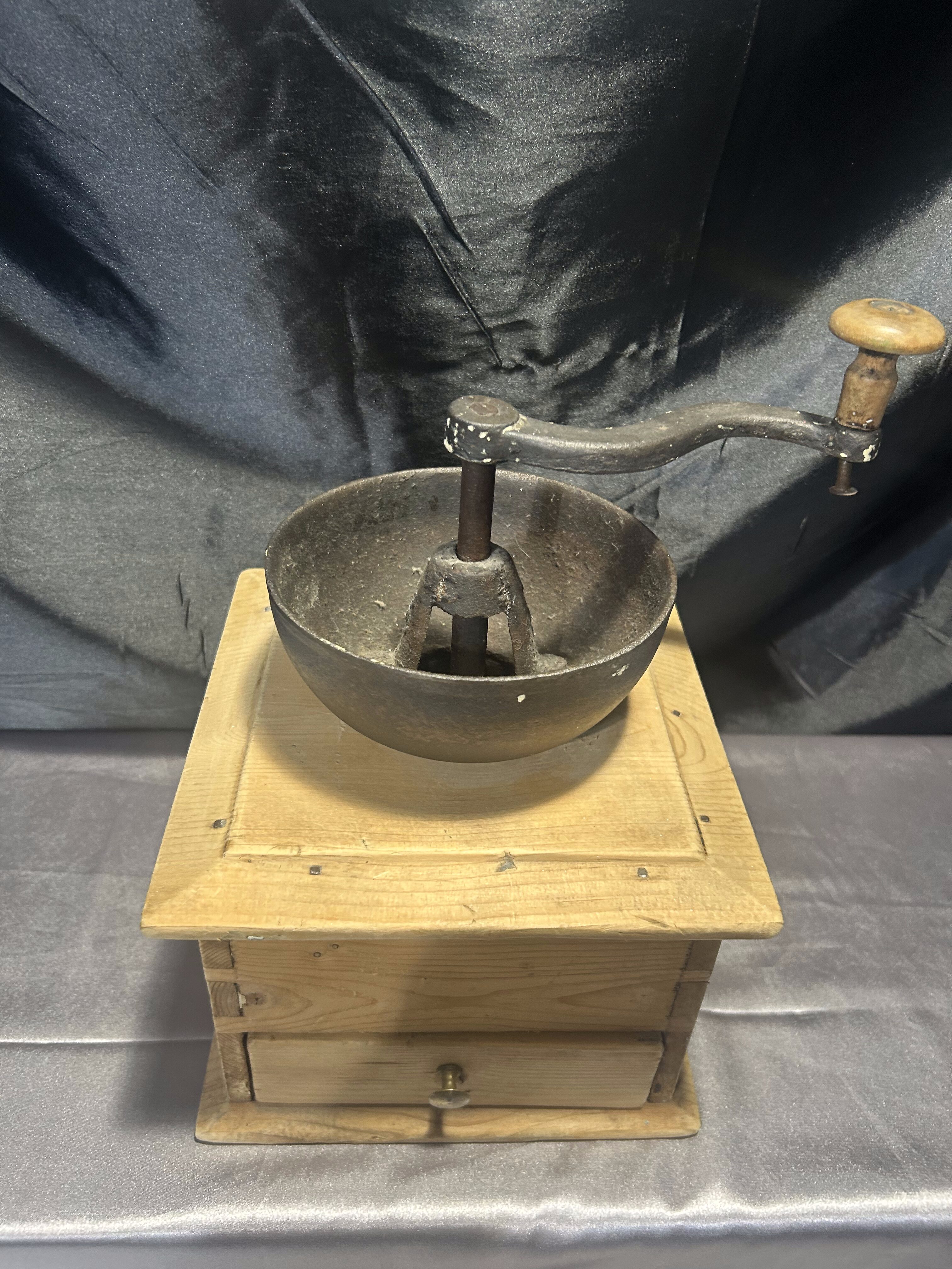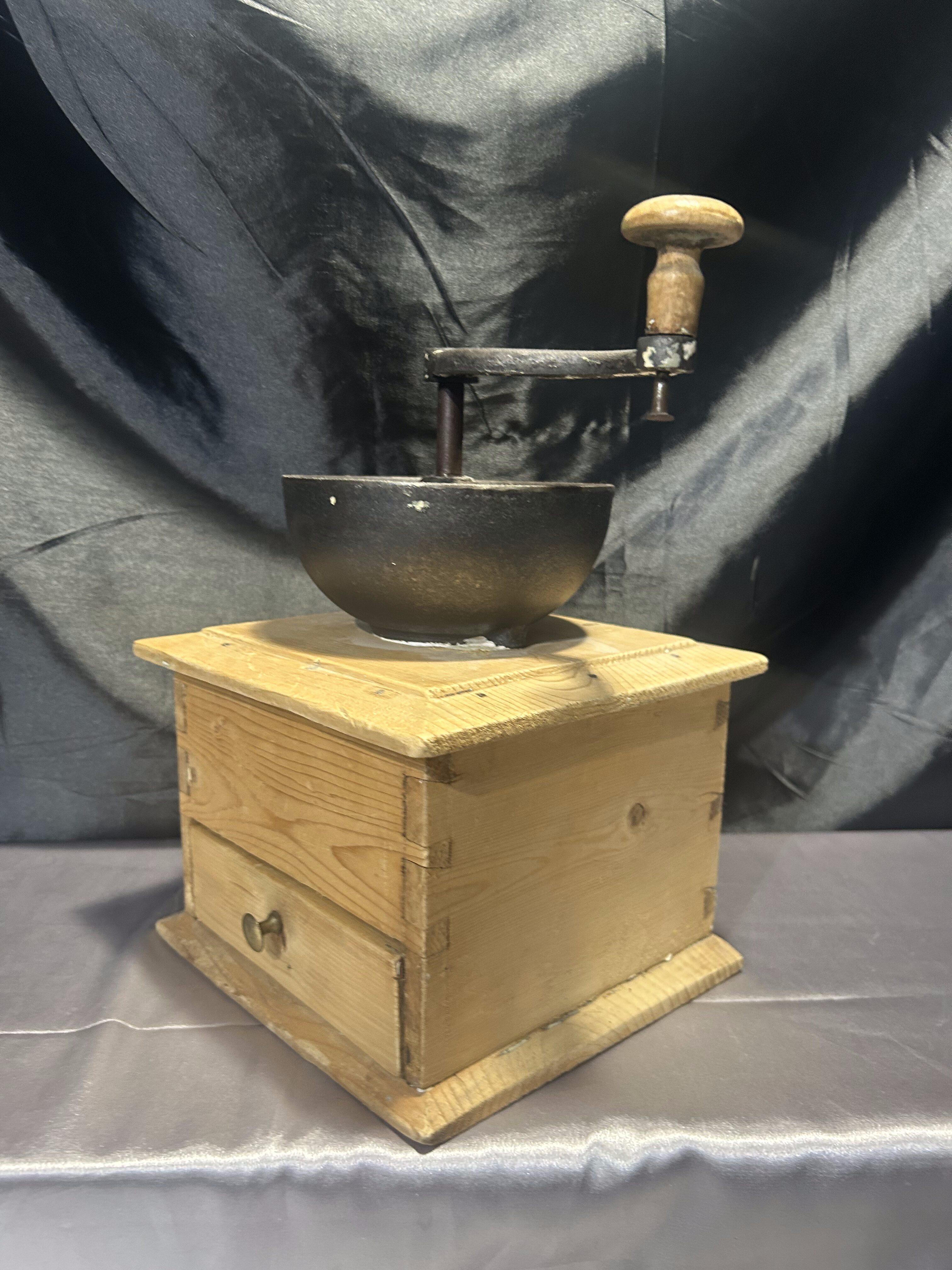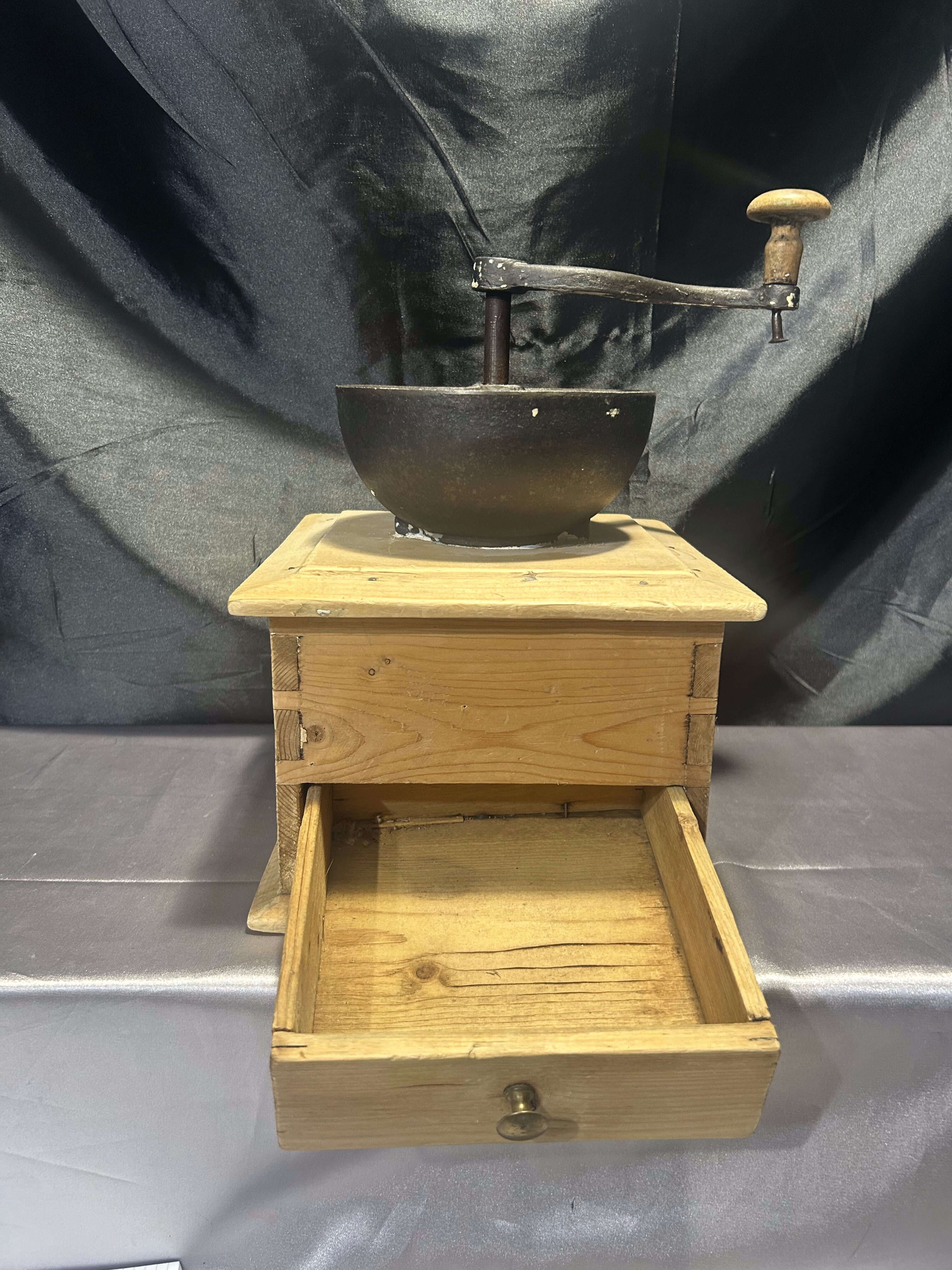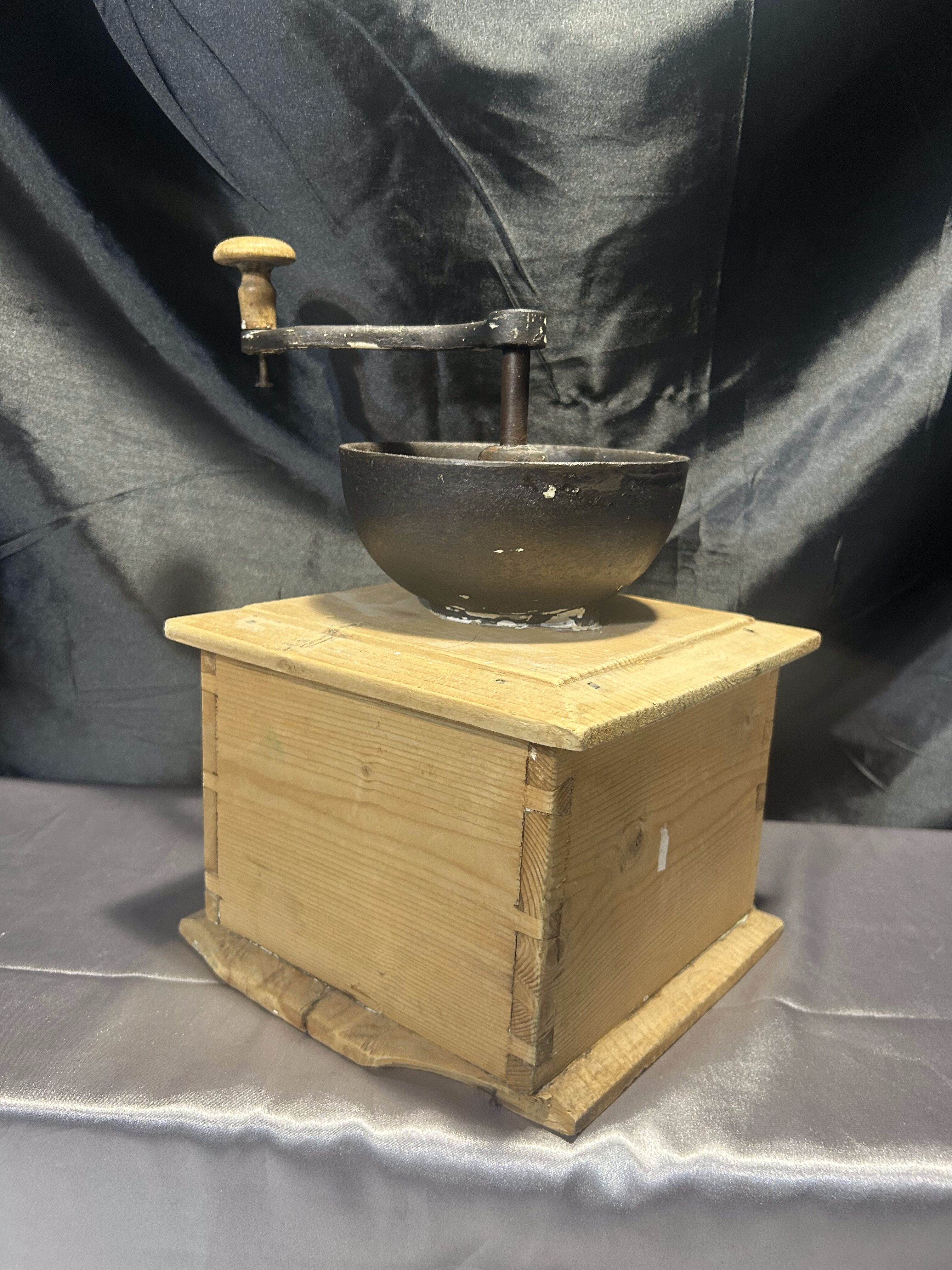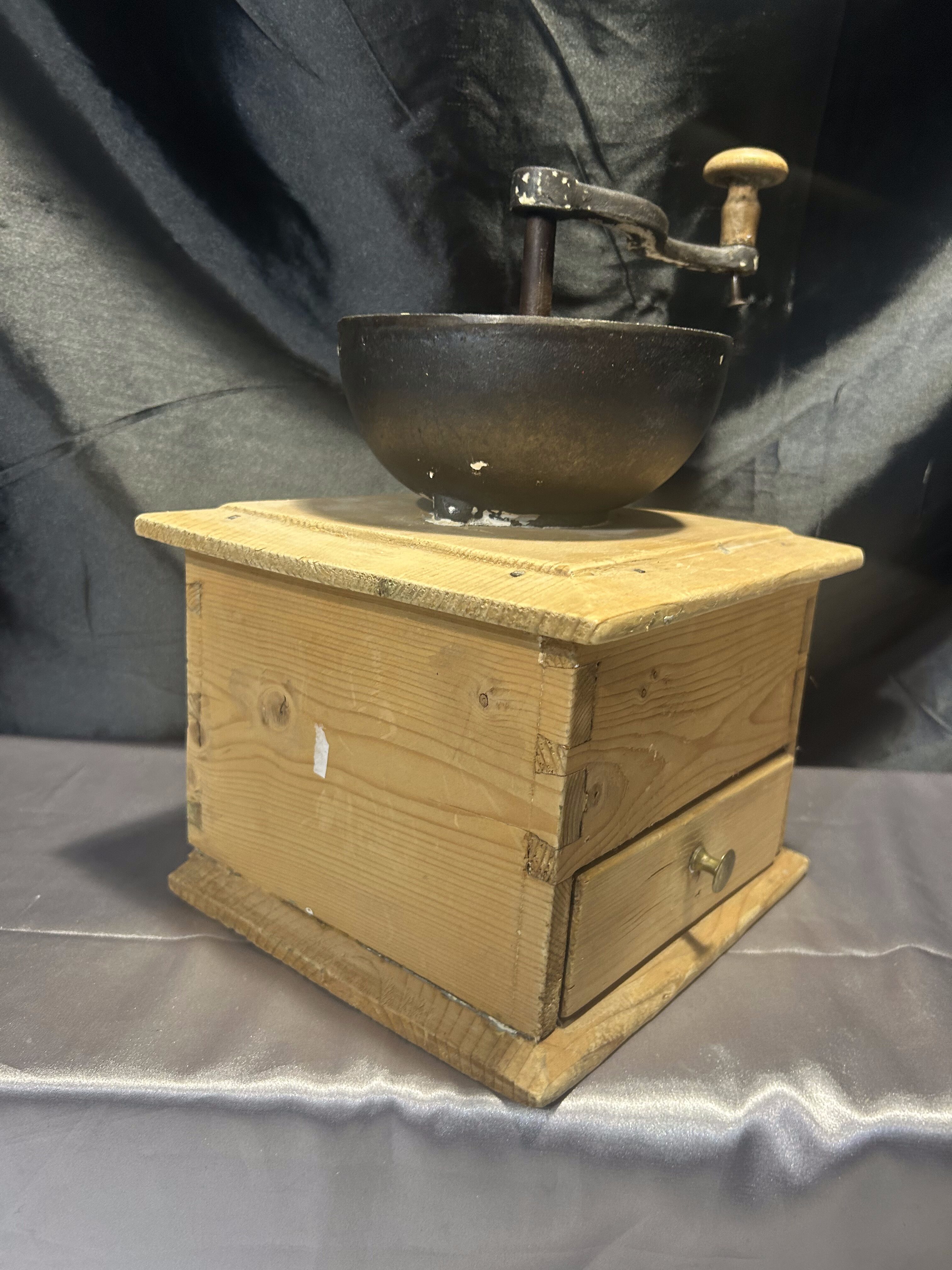 Na sprzedaż okazały, stary młynek do kawy wykonany z drewna, o imponujących rozmiarach i solidnej konstrukcji. Wyposażony w klasyczną szufladkę na zmielone ziarna oraz elegancki, dekoracyjny uchwyt. To wyjątkowy egzemplarz, który zachwyca swoim rozmiarem, wagą i autentycznym charakterem dawnych przedmiotów użytkowych.
