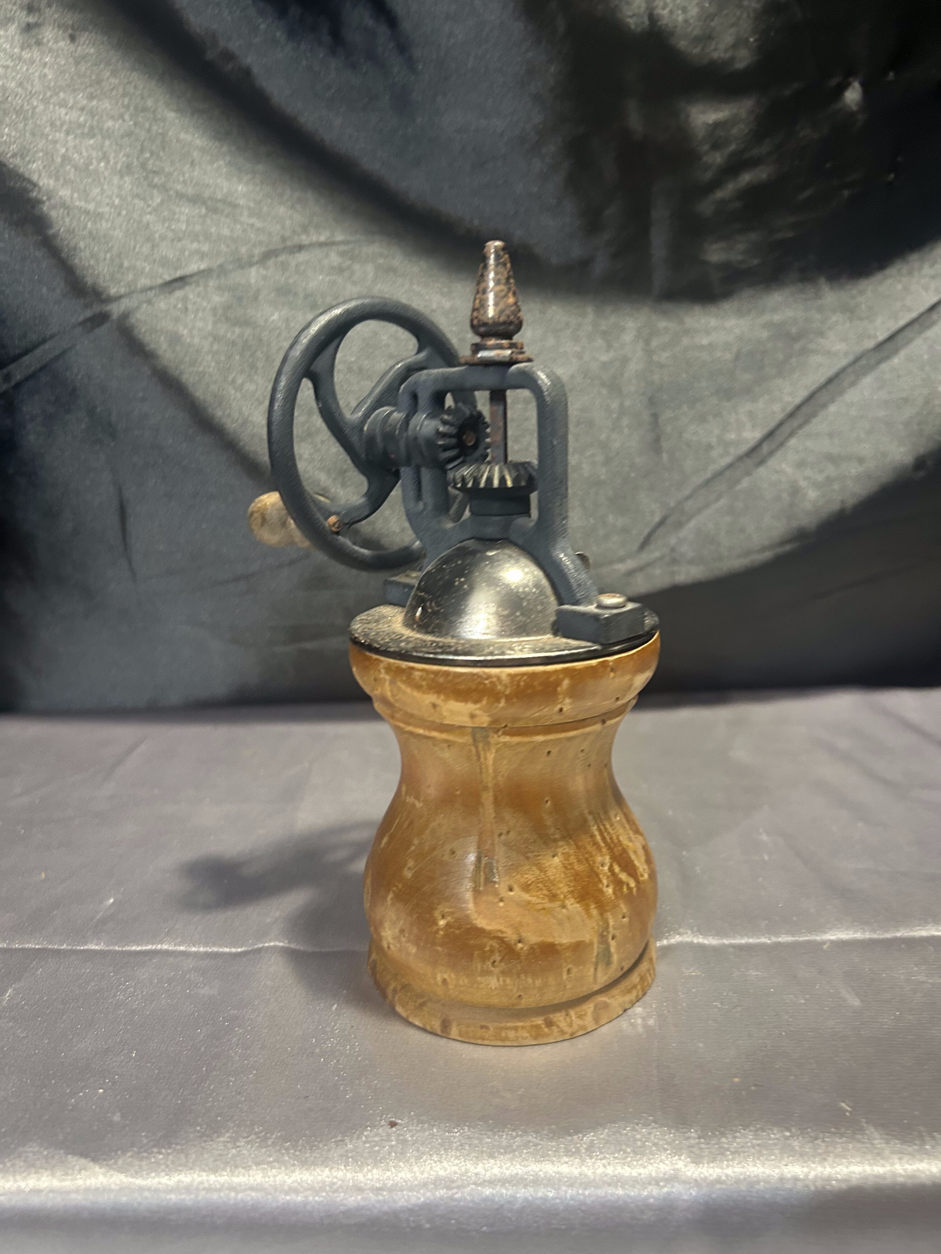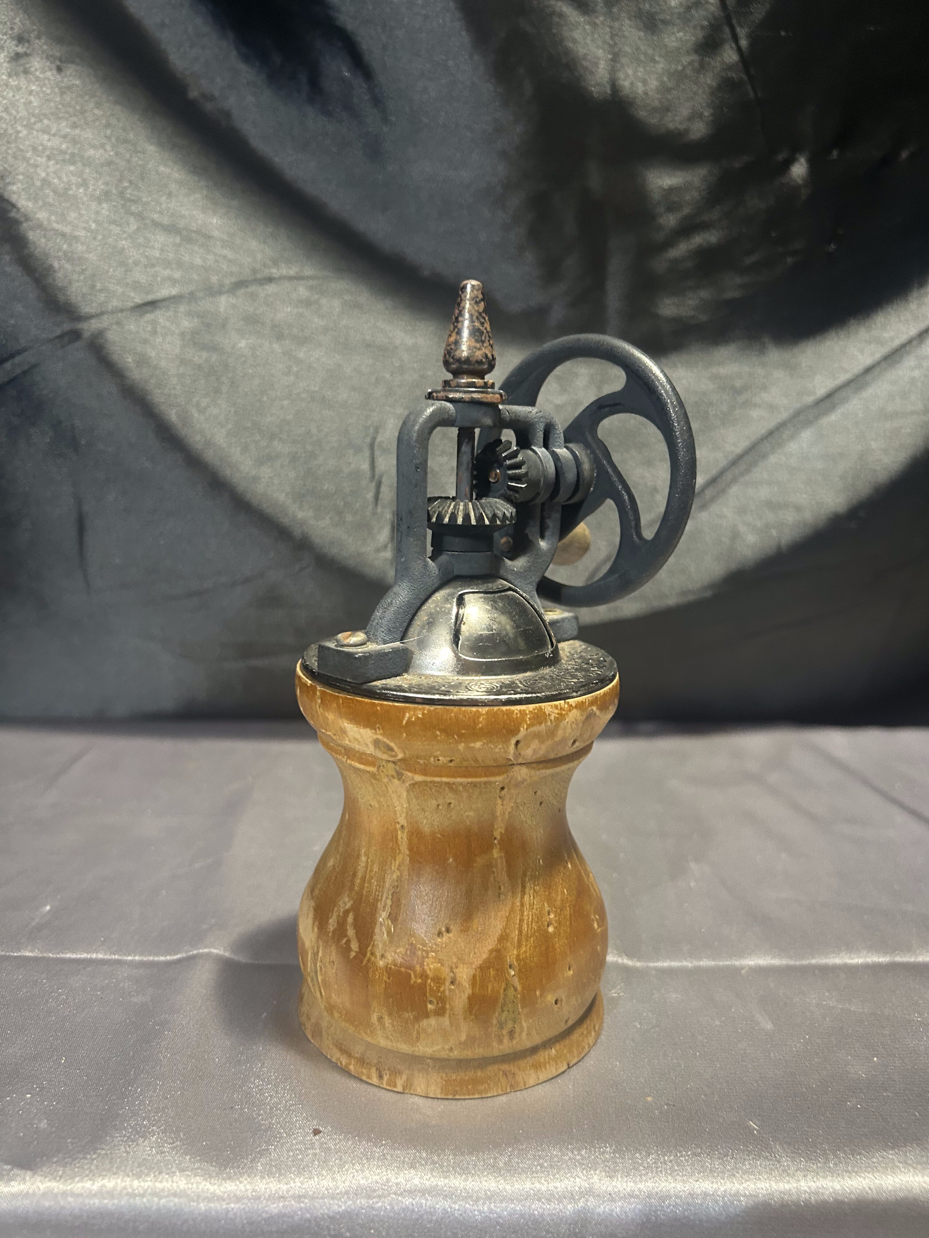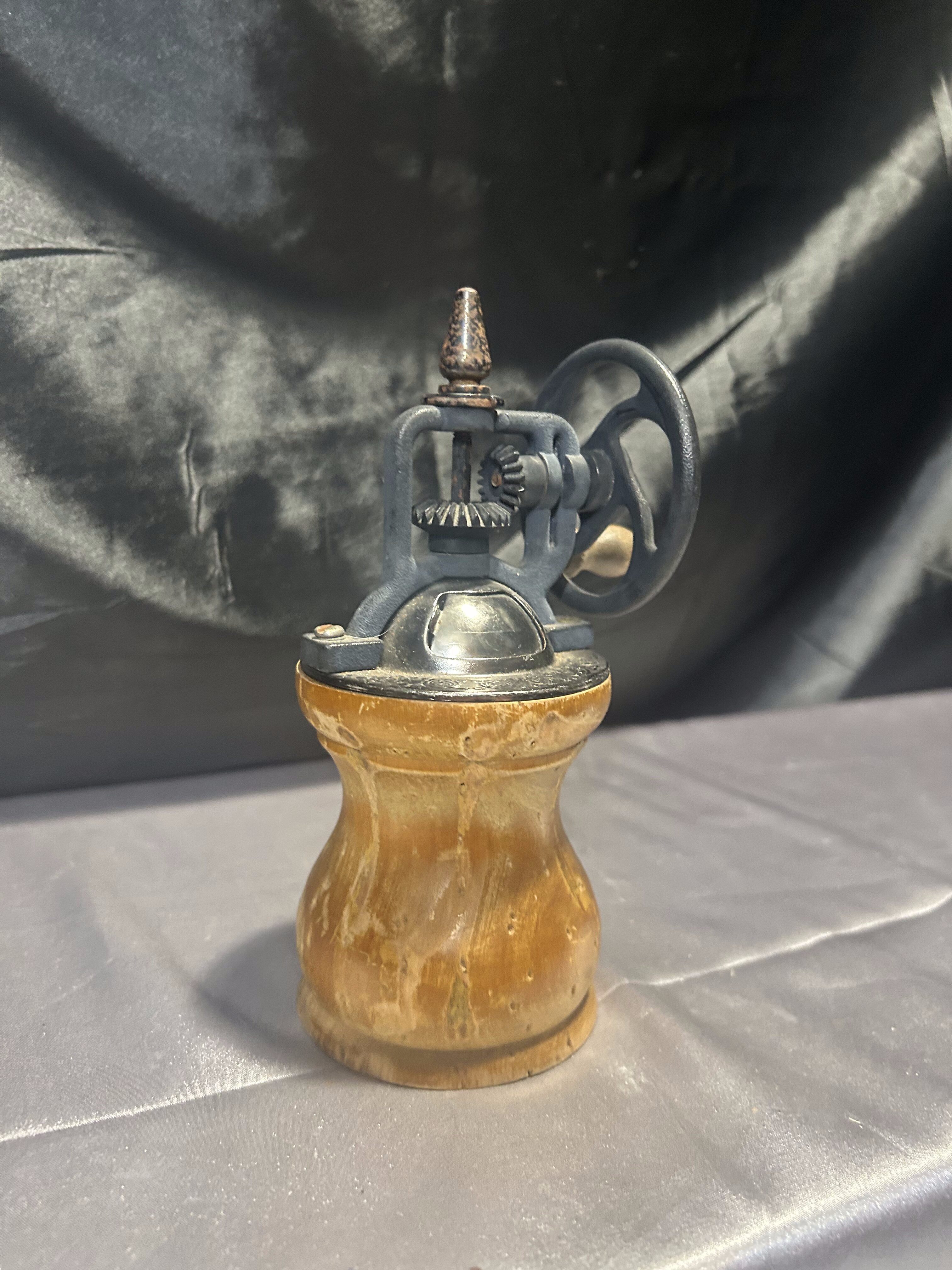 Na sprzedaż dekoracyjny młynek do pieprzu wykonany z drewna z metalowymi akcentami, wyposażony w charakterystyczny kołowrotek z boku. Stylowy i funkcjonalny, stanowi niebanalny element kuchennego wyposażenia, który łączy w sobie klimat dawnych lat z praktycznym zastosowaniem.