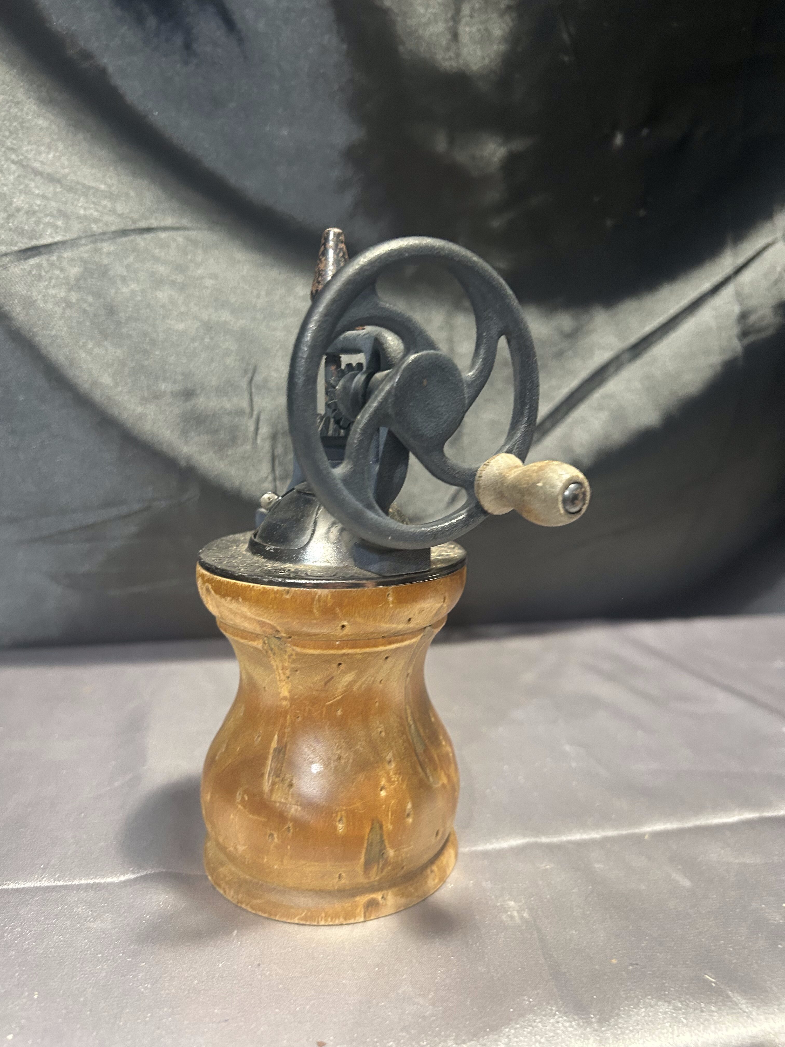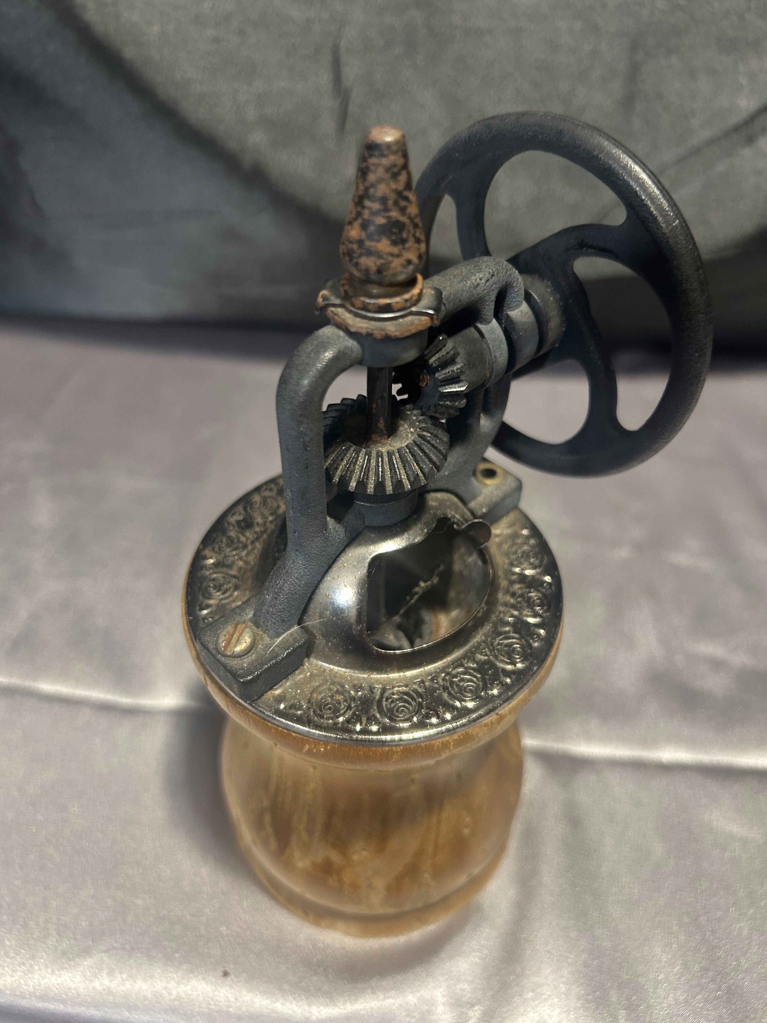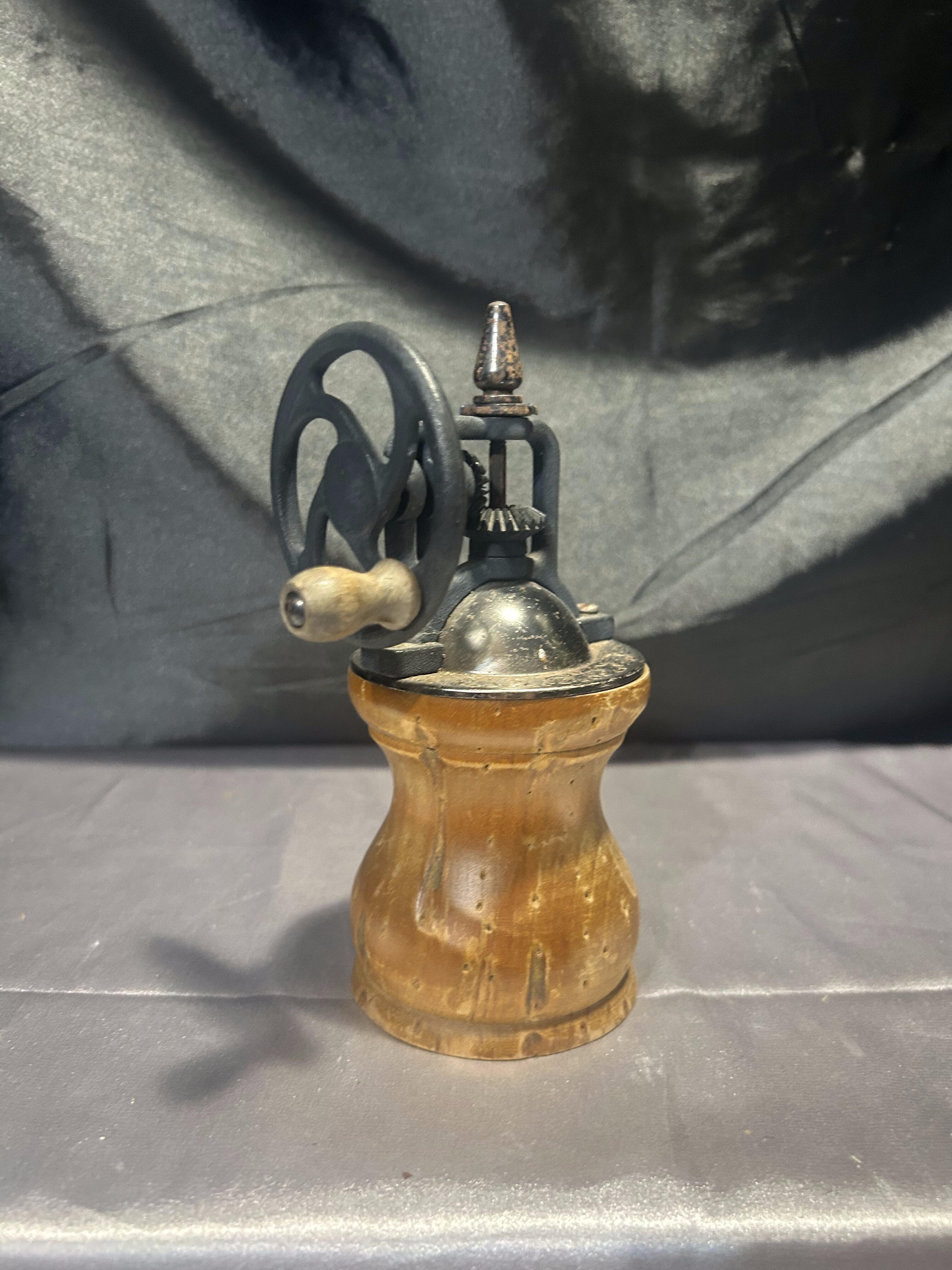Na sprzedaż dekoracyjny młynek do pieprzu wykonany z drewna z metalowymi akcentami, wyposażony w charakterystyczny kołowrotek z boku. Stylowy i funkcjonalny, stanowi niebanalny element kuchennego wyposażenia, który łączy w sobie klimat dawnych lat z praktycznym zastosowaniem.