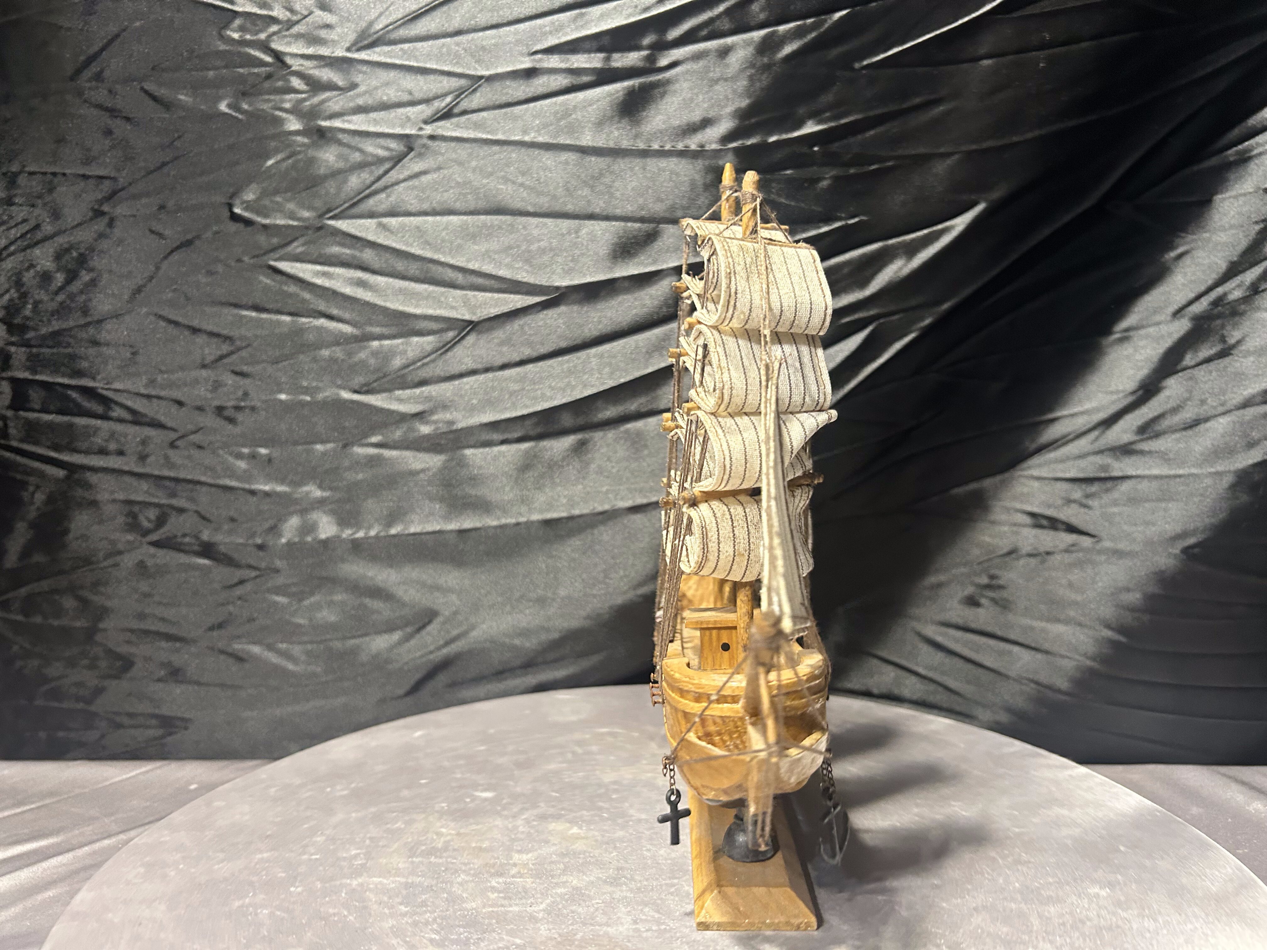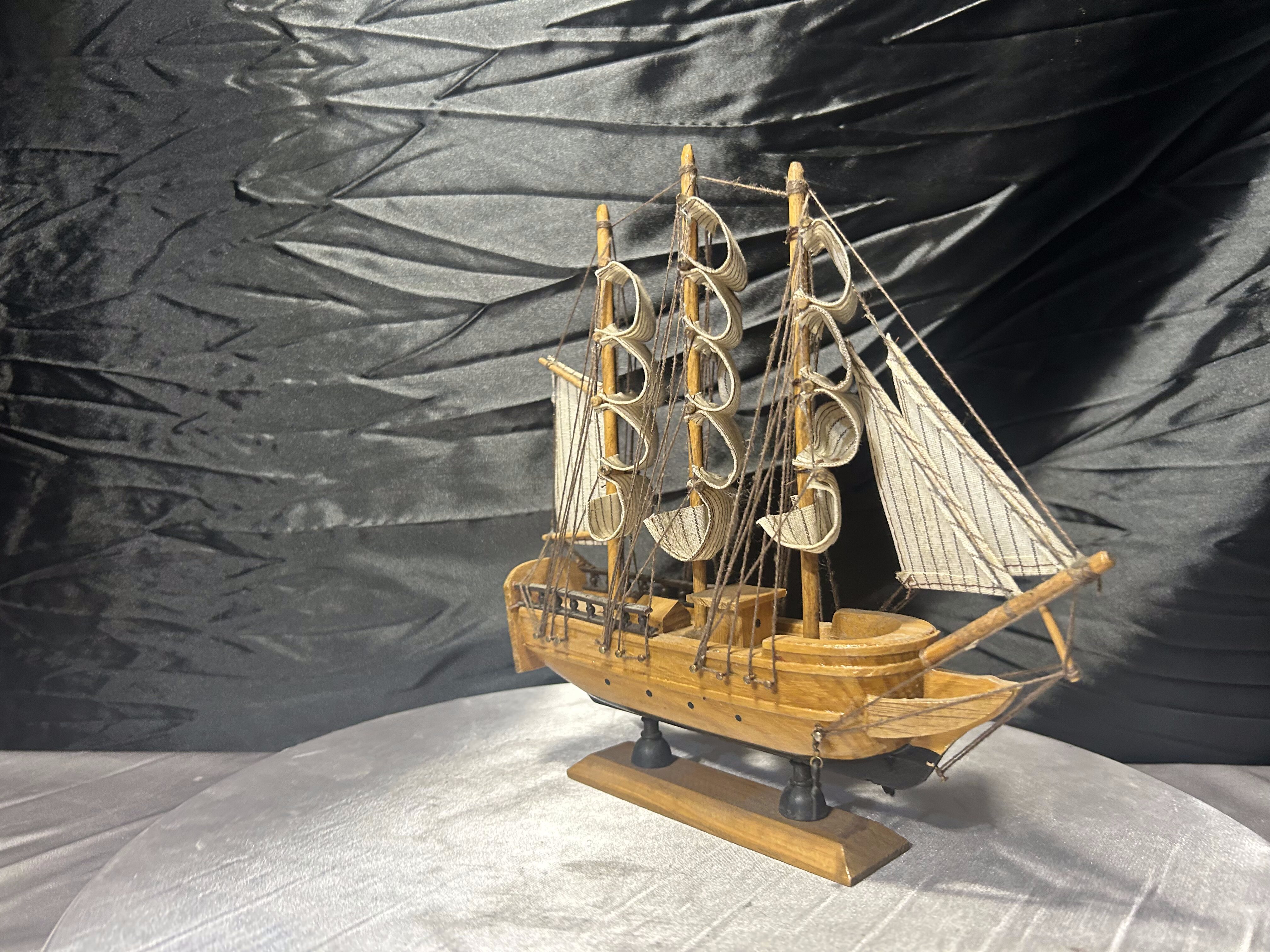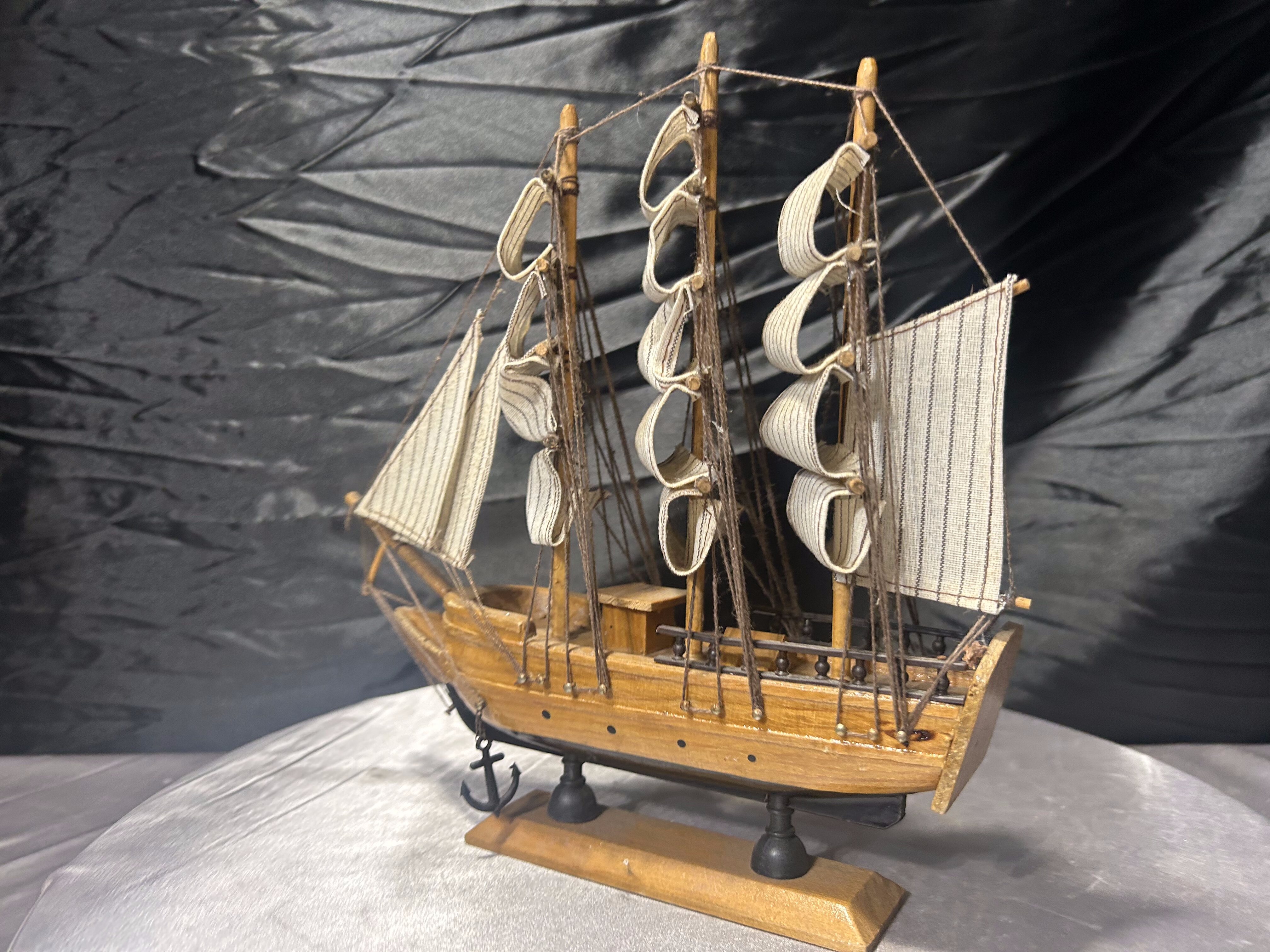 Dekoracyjny model statku żaglowego wykonany z drewna, z żaglami z materiału. Starannie dopracowane detale, masztowanie oraz proporcje nadają mu elegancki, klasyczny charakter. To przedmiot, który od razu buduje marynistyczny klimat wnętrza i przyciąga wzrok jako centralna dekoracja.
