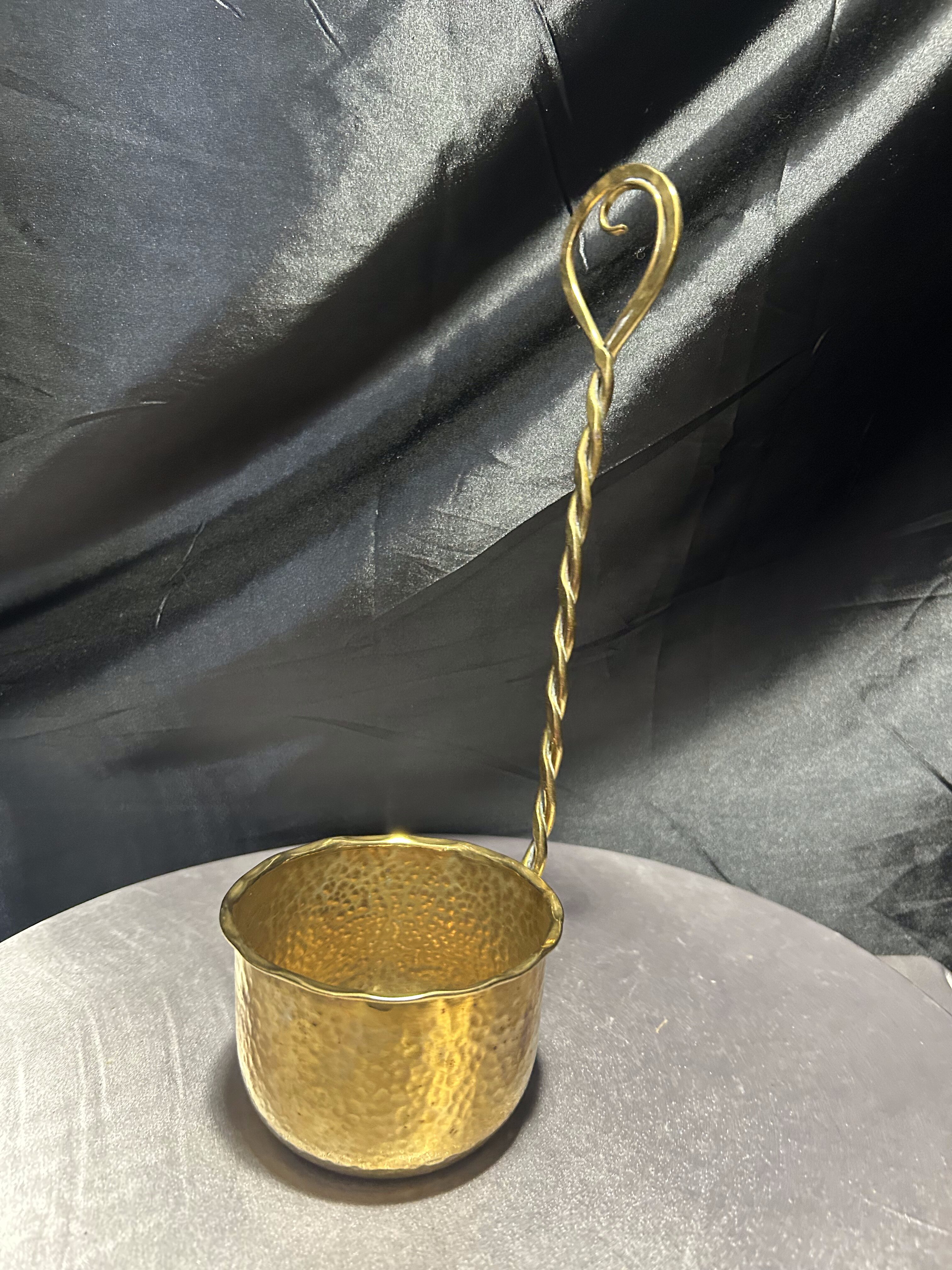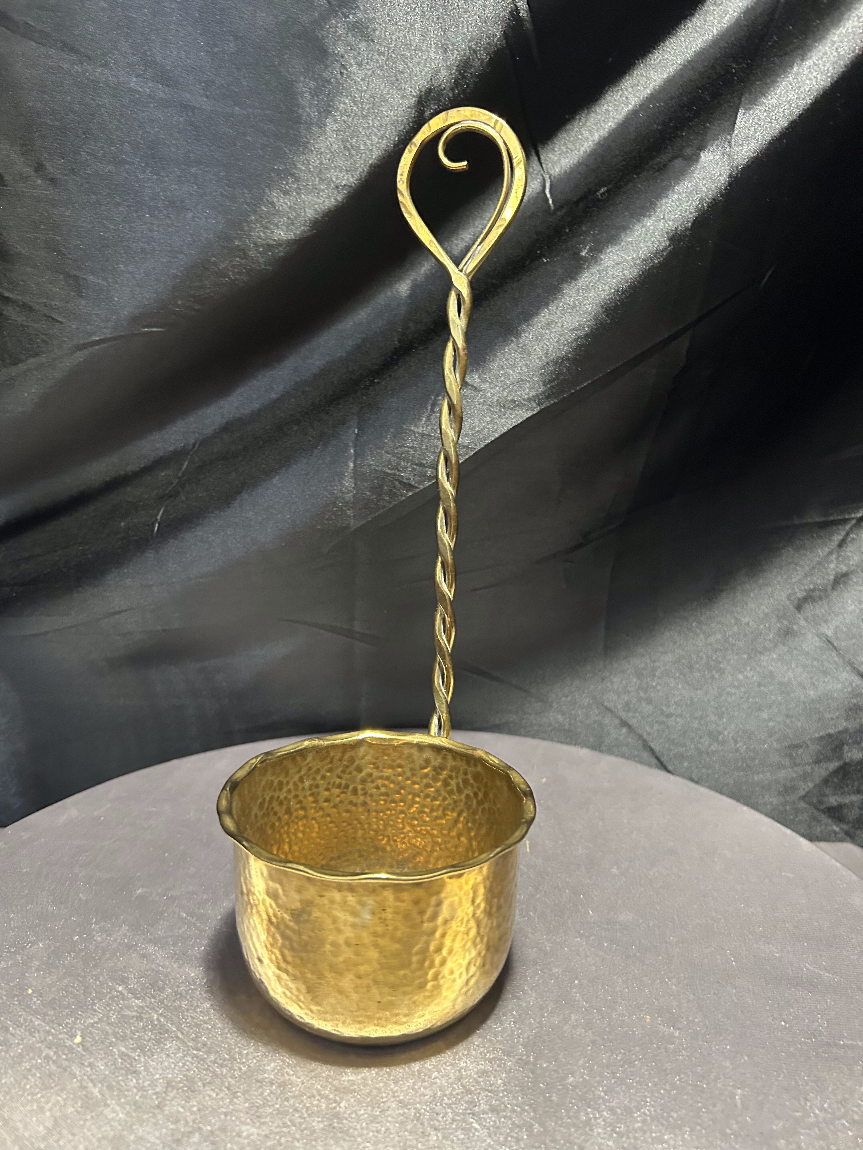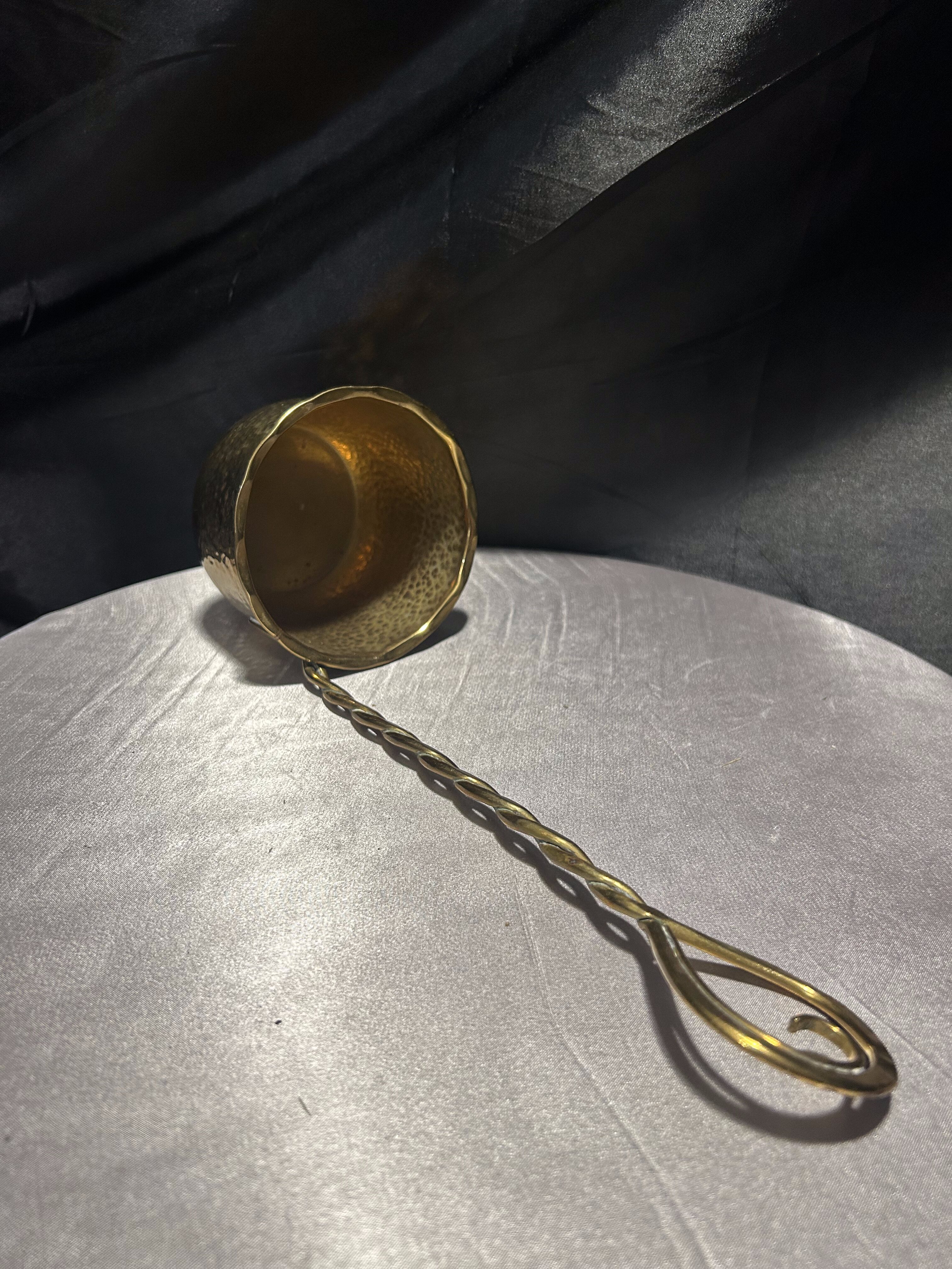 Piękna chochla wykonana w całości z mosiądzu, która zachwyca swoim rzeźbiarskim wykończeniem i subtelnym połyskiem. Rękojeść w formie skręconej spirali zakończona dekoracyjnym sercowatym uchwytem nadaje jej wyjątkowego, rustykalnego uroku. Misa chochli ma młotkowaną strukturę, która efektownie odbija światło, nadając całości elegancki charakter.