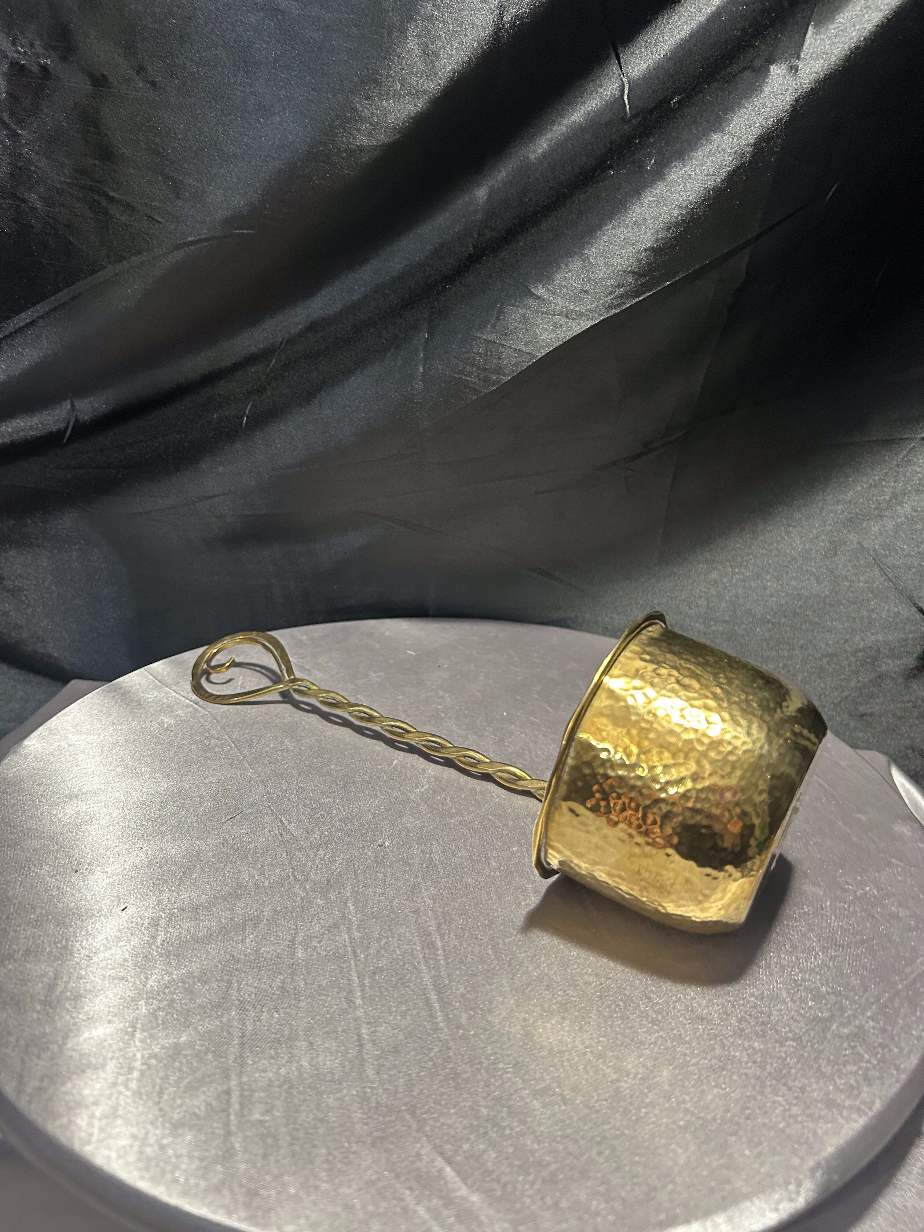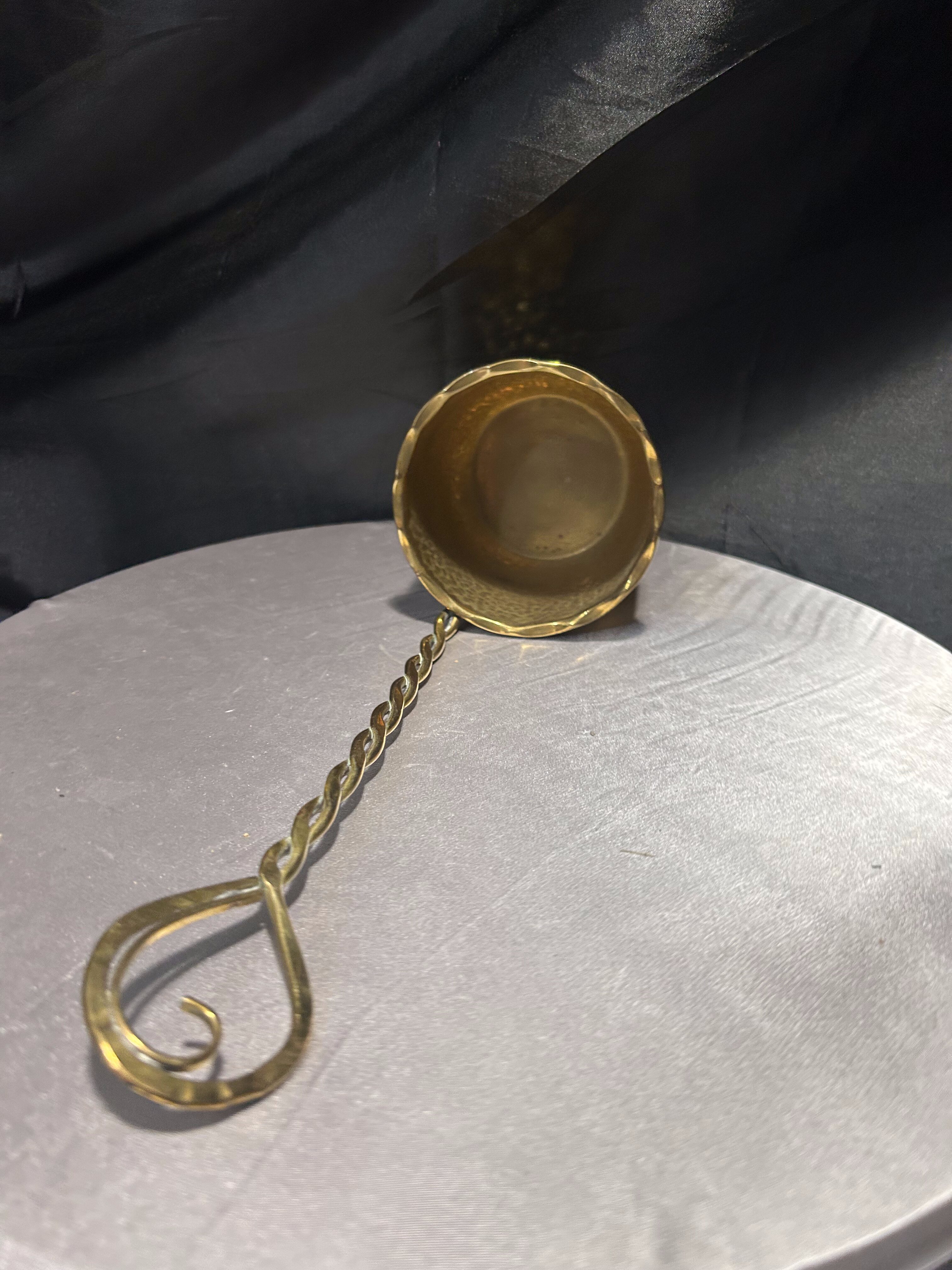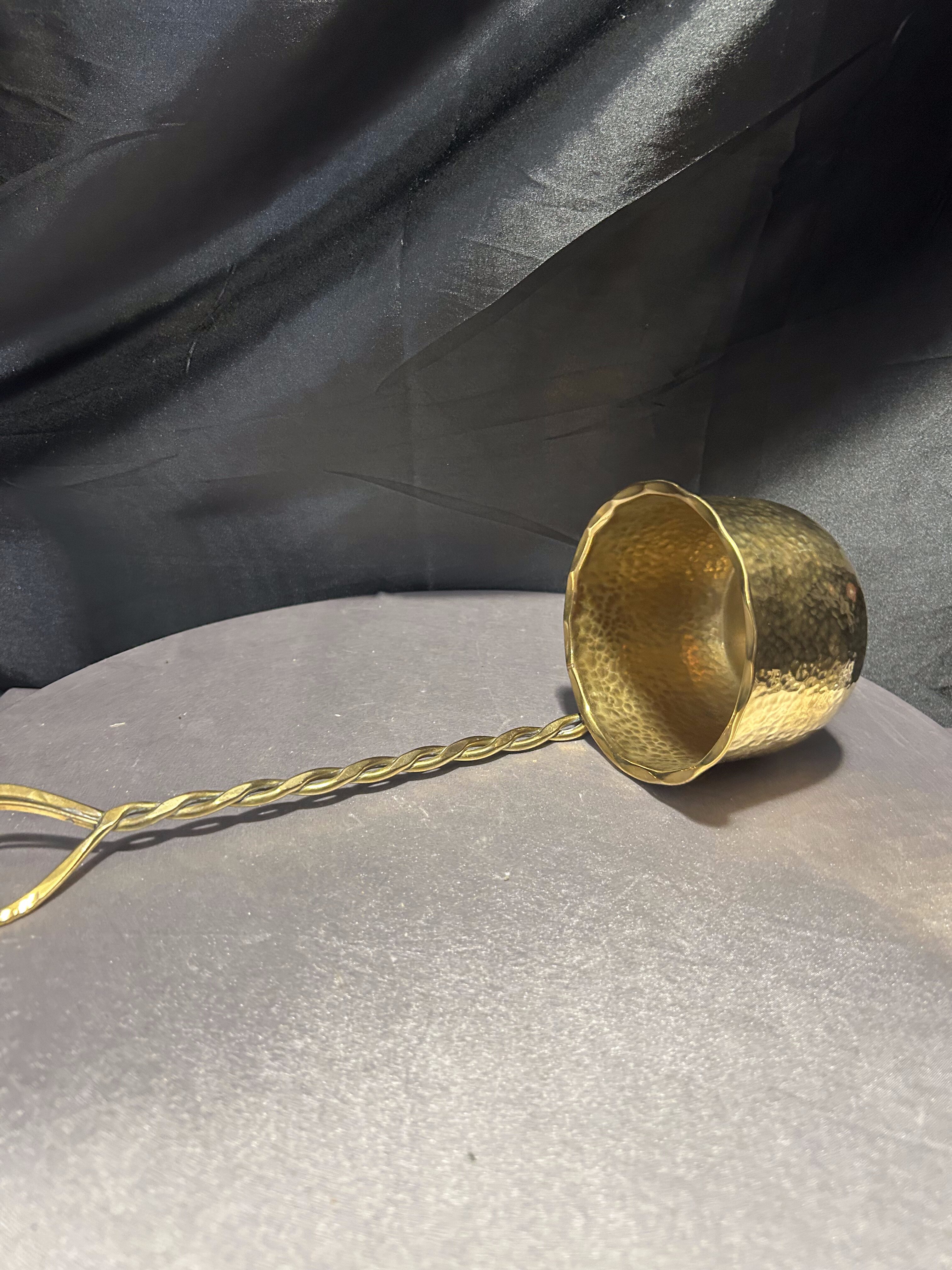 Piękna chochla wykonana w całości z mosiądzu, która zachwyca swoim rzeźbiarskim wykończeniem i subtelnym połyskiem. Rękojeść w formie skręconej spirali zakończona dekoracyjnym sercowatym uchwytem nadaje jej wyjątkowego, rustykalnego uroku. Misa chochli ma młotkowaną strukturę, która efektownie odbija światło, nadając całości elegancki charakter.