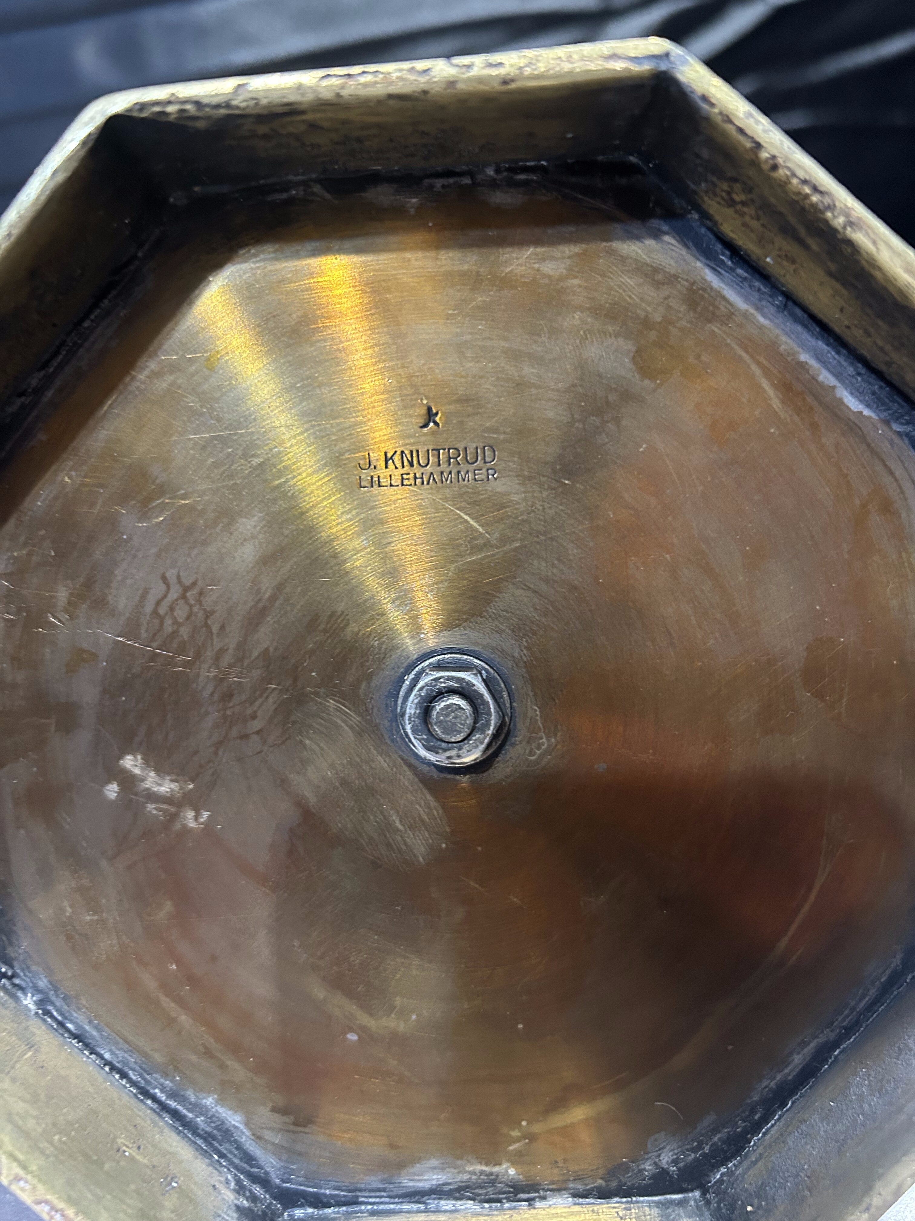 Elegancka menora wykonana z mosiądzu, siedmioramienny świecznik żydowski o wyjątkowej symbolice i tradycyjnym charakterze. Pochodzi z renomowanej pracowni J. Knutrud z Lillehammer w Norwegii, co podkreśla jej autentyczność i wysoką jakość wykonania. Stabilna, ciężka podstawa ozdobiona reliefami dodaje całości dostojności i sprawia, że świecznik prezentuje się niezwykle okazale. Doskonały element kolekcjonerski, dekoracyjny lub liturgiczny.