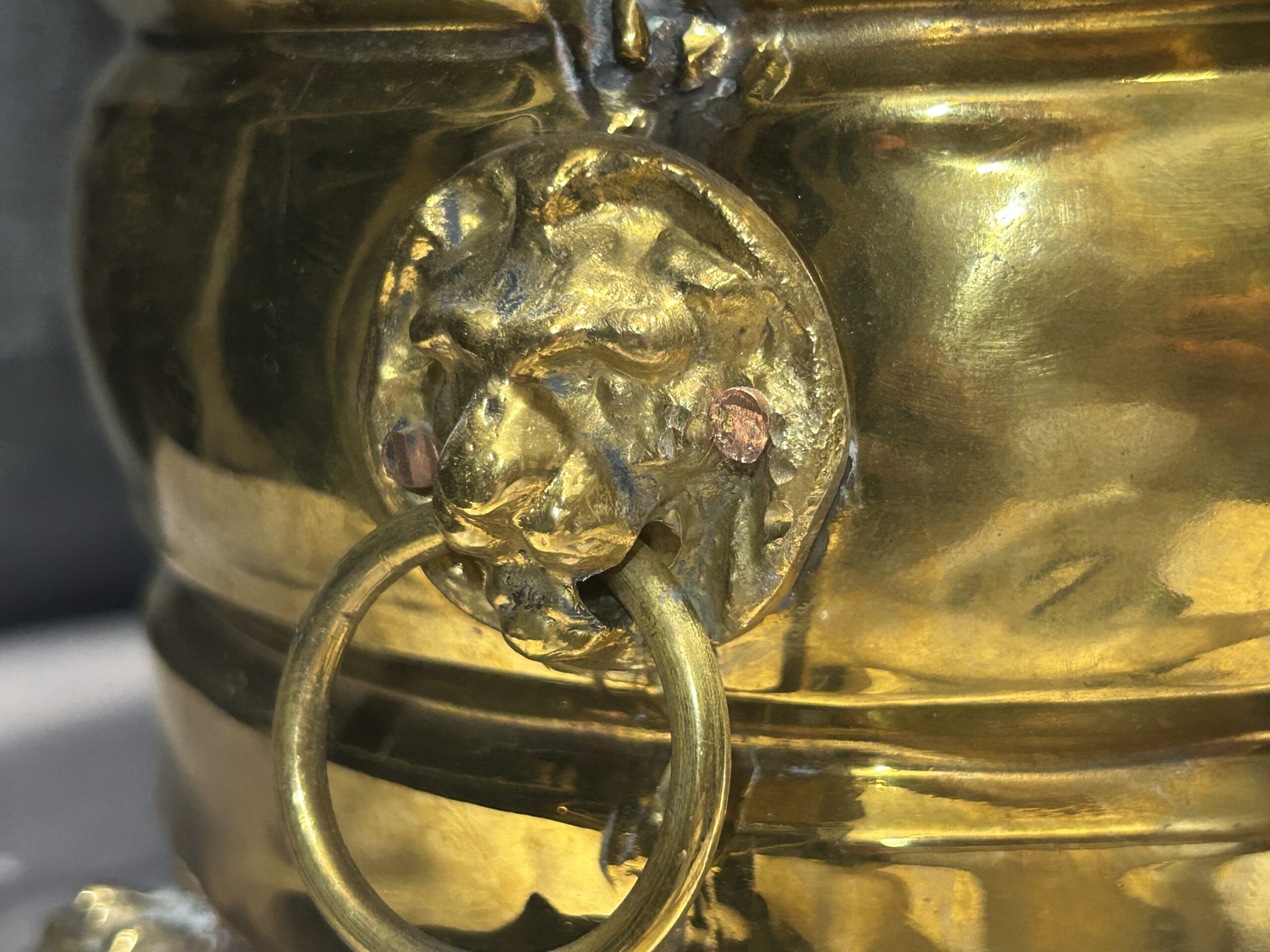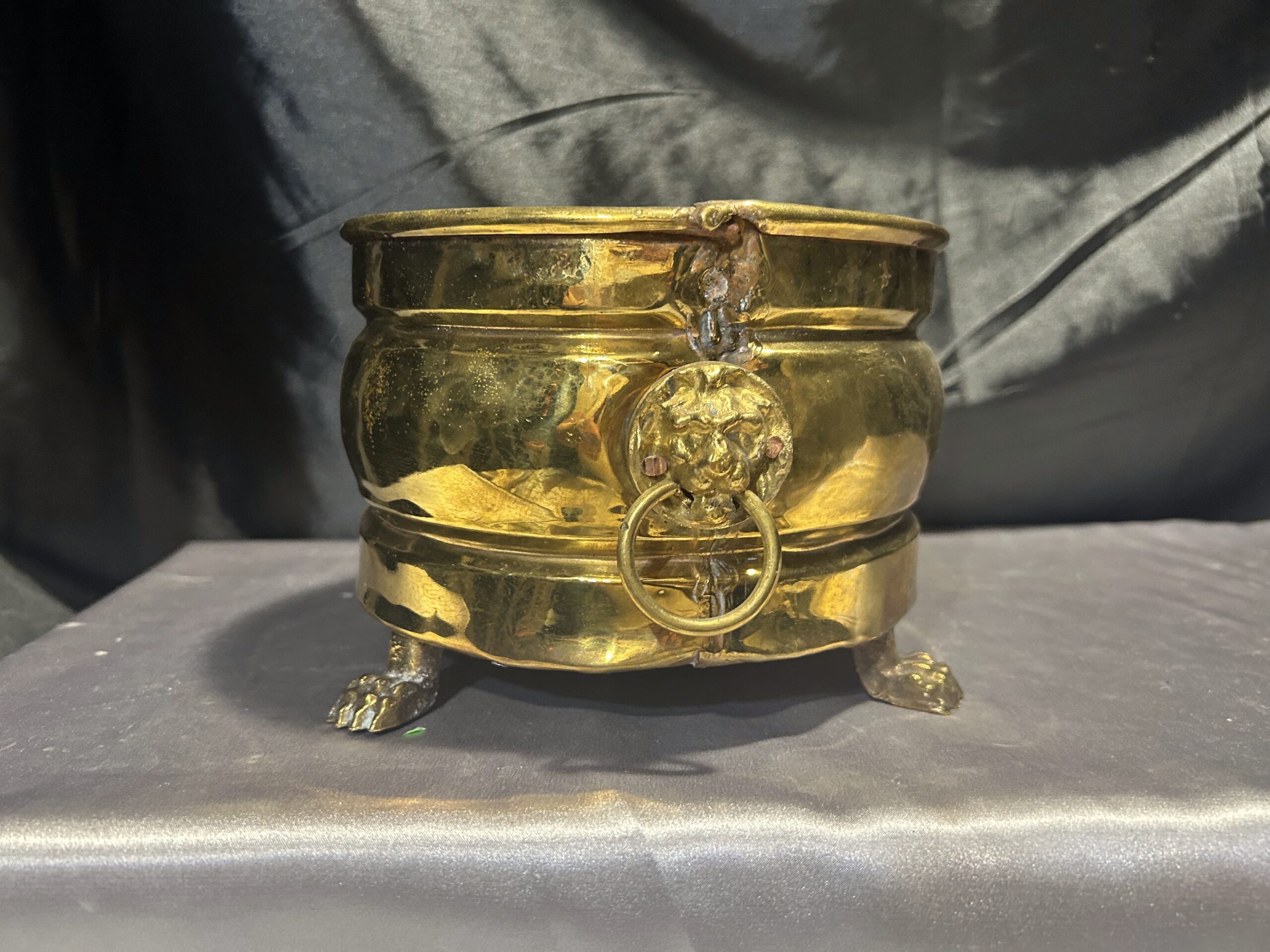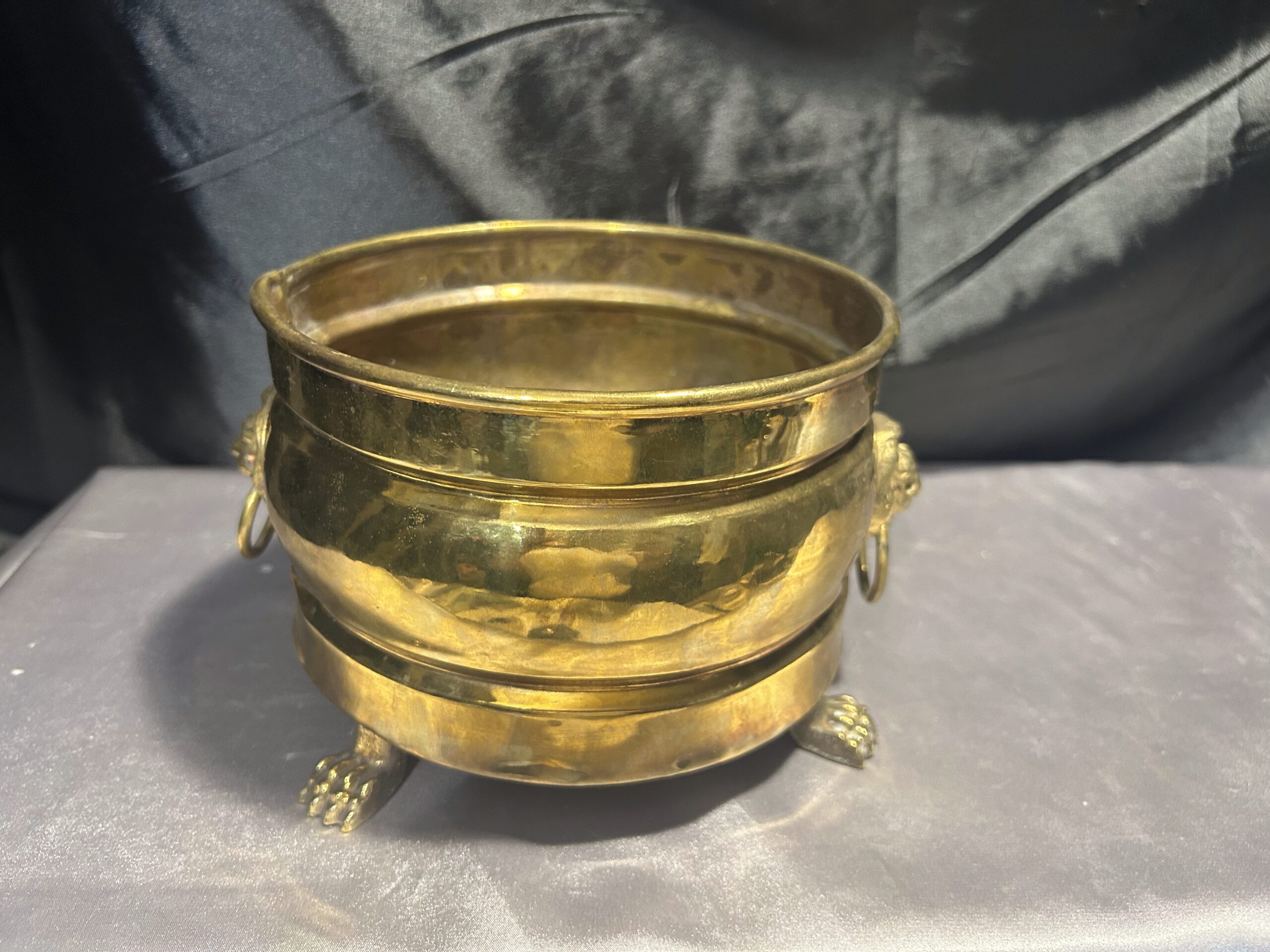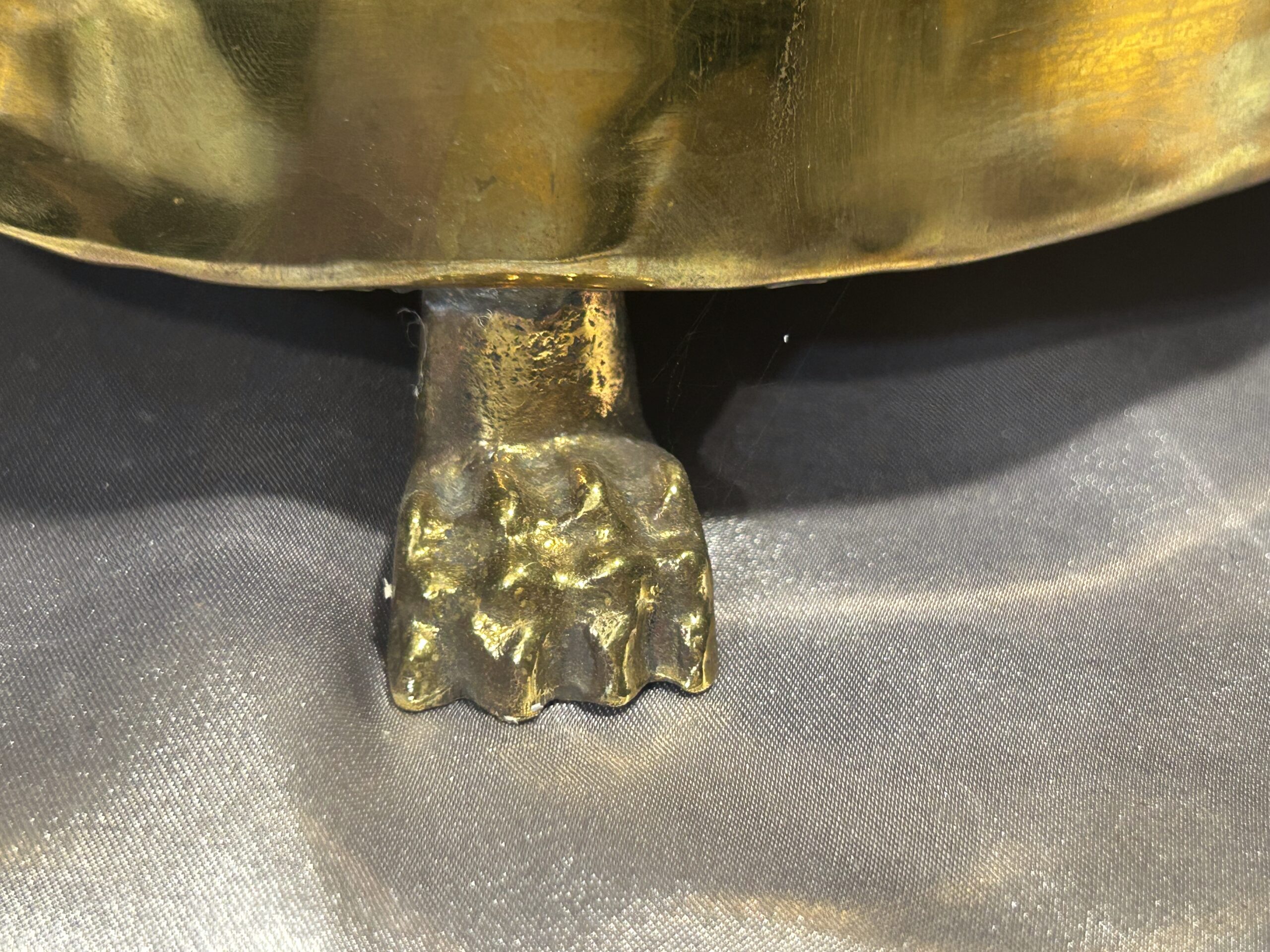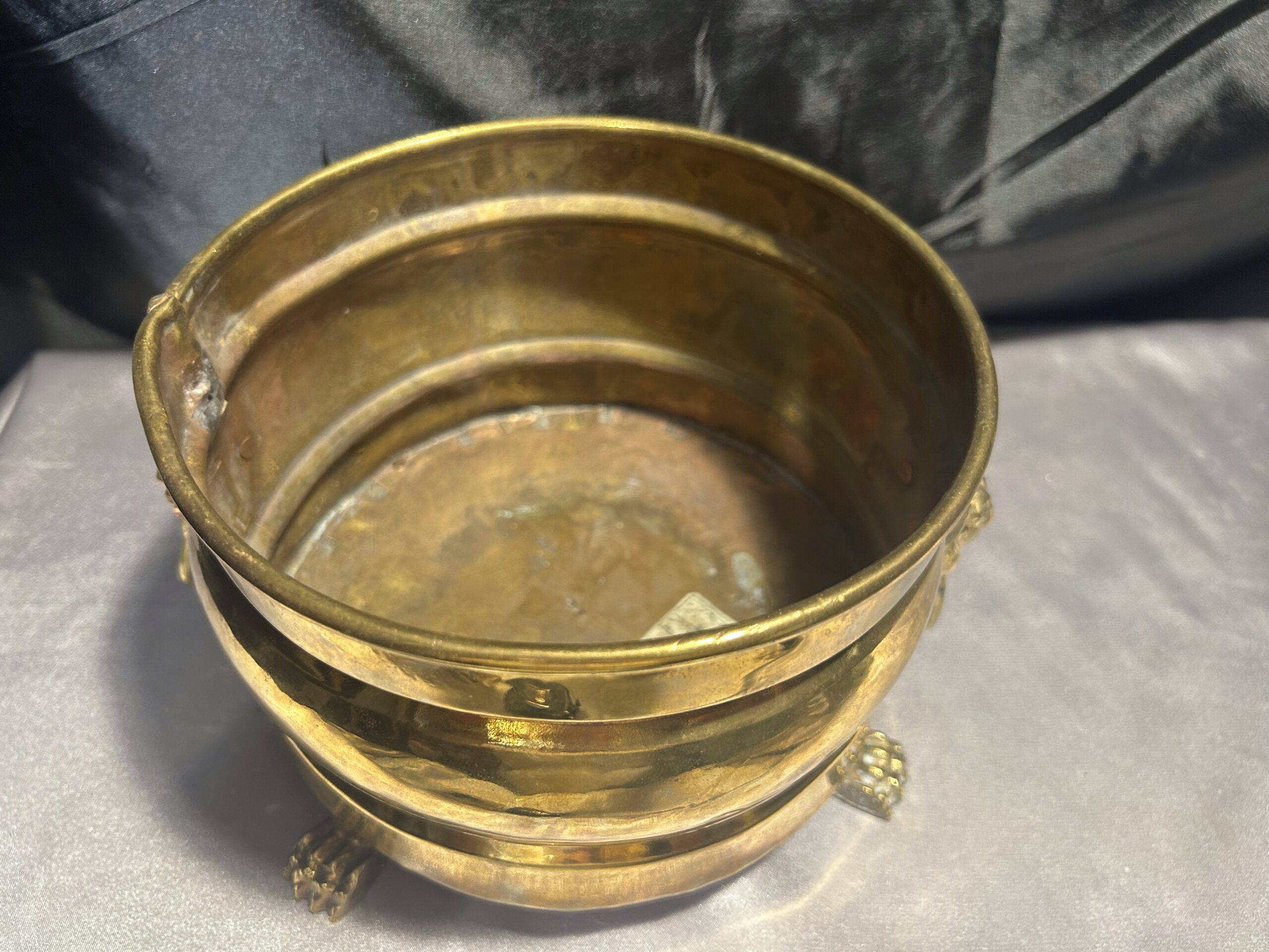 Mosiężna misa – patera lub kwietnik na lwich nogach z lwimi głowami