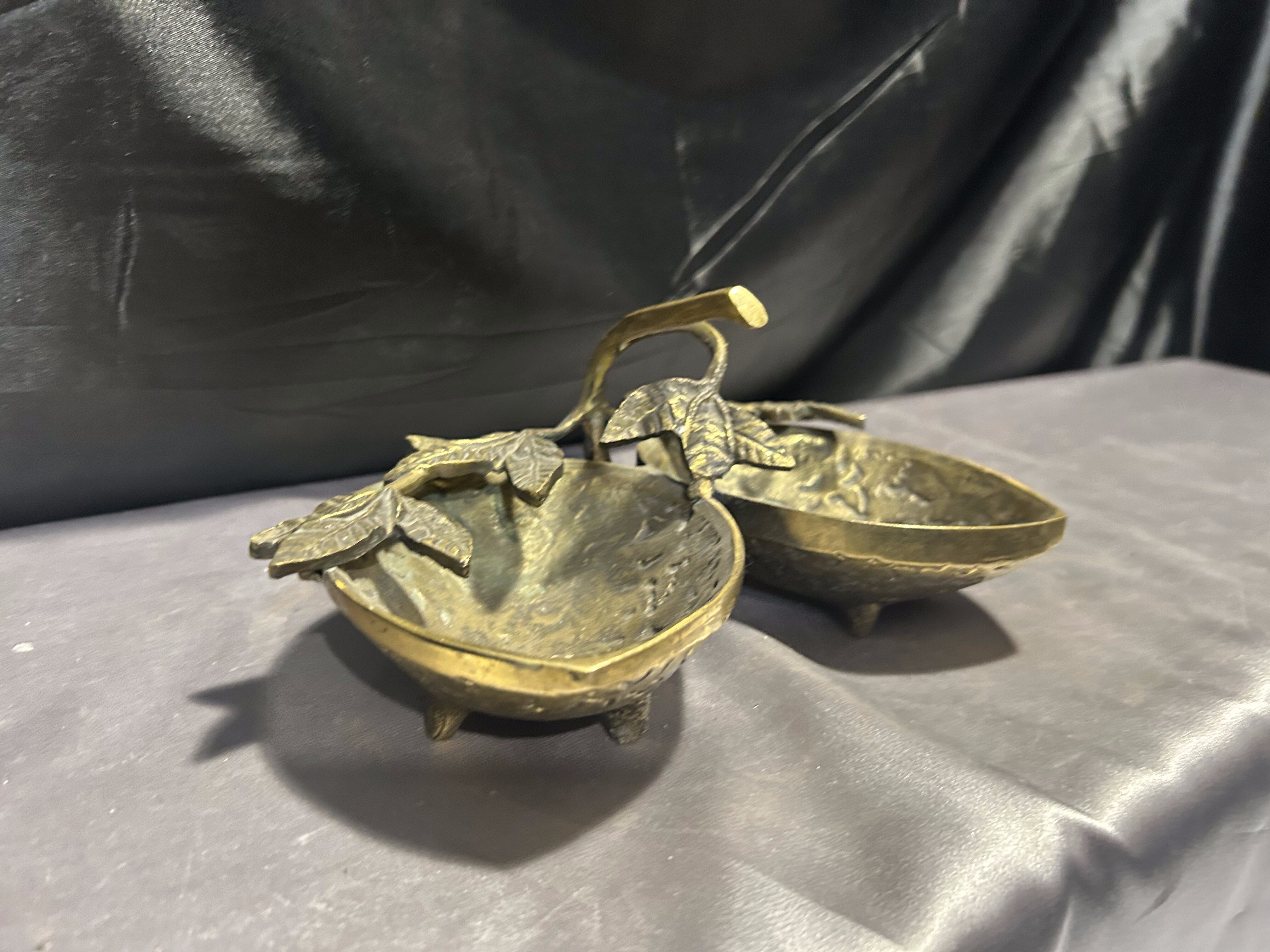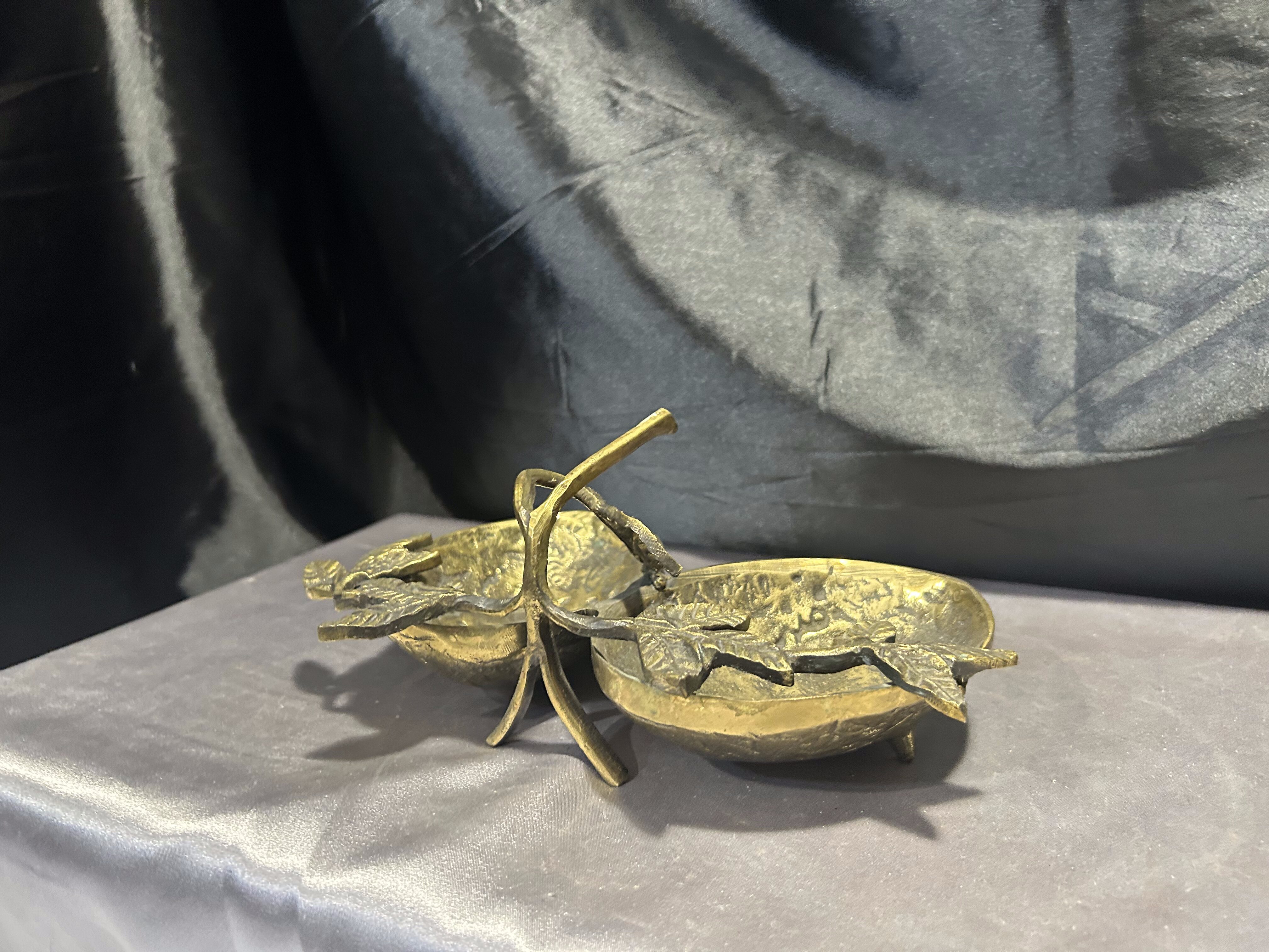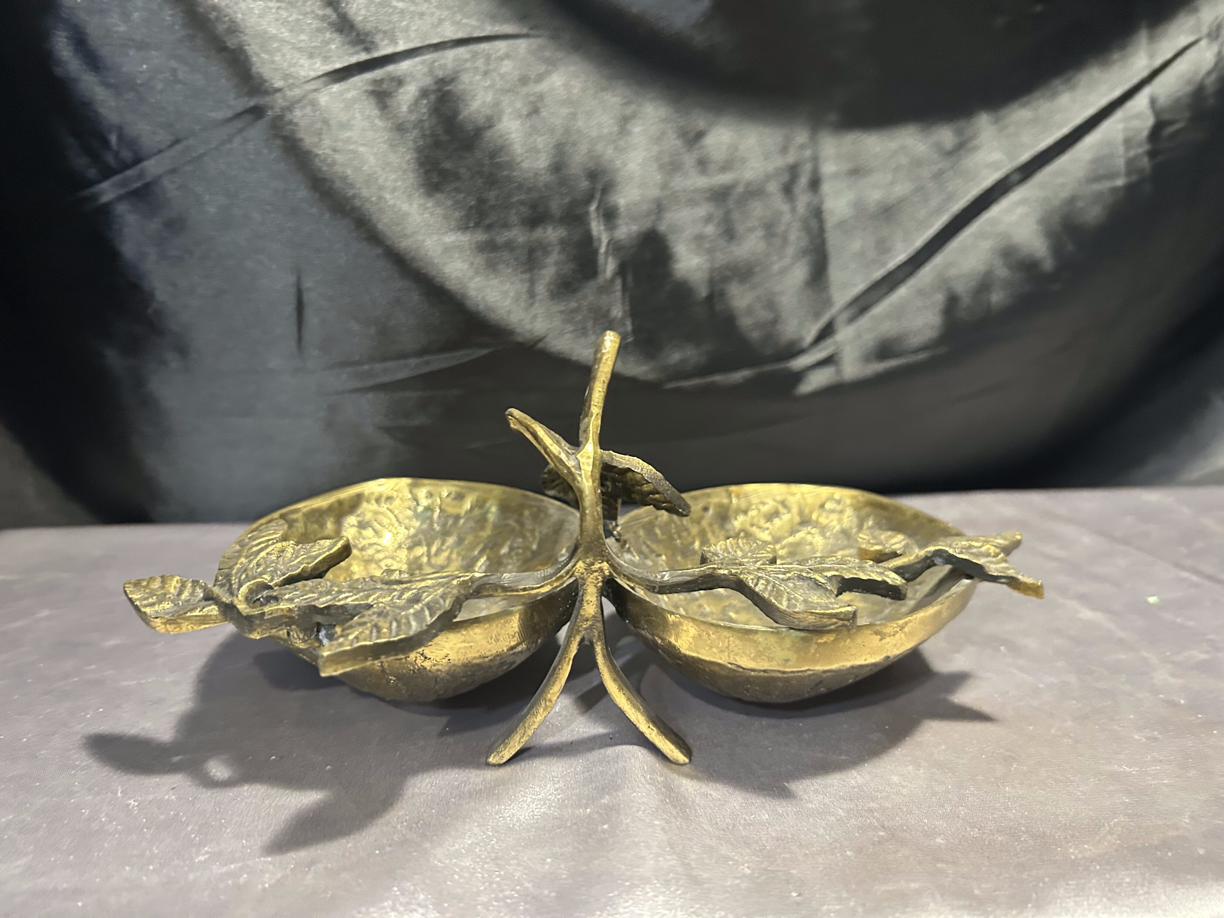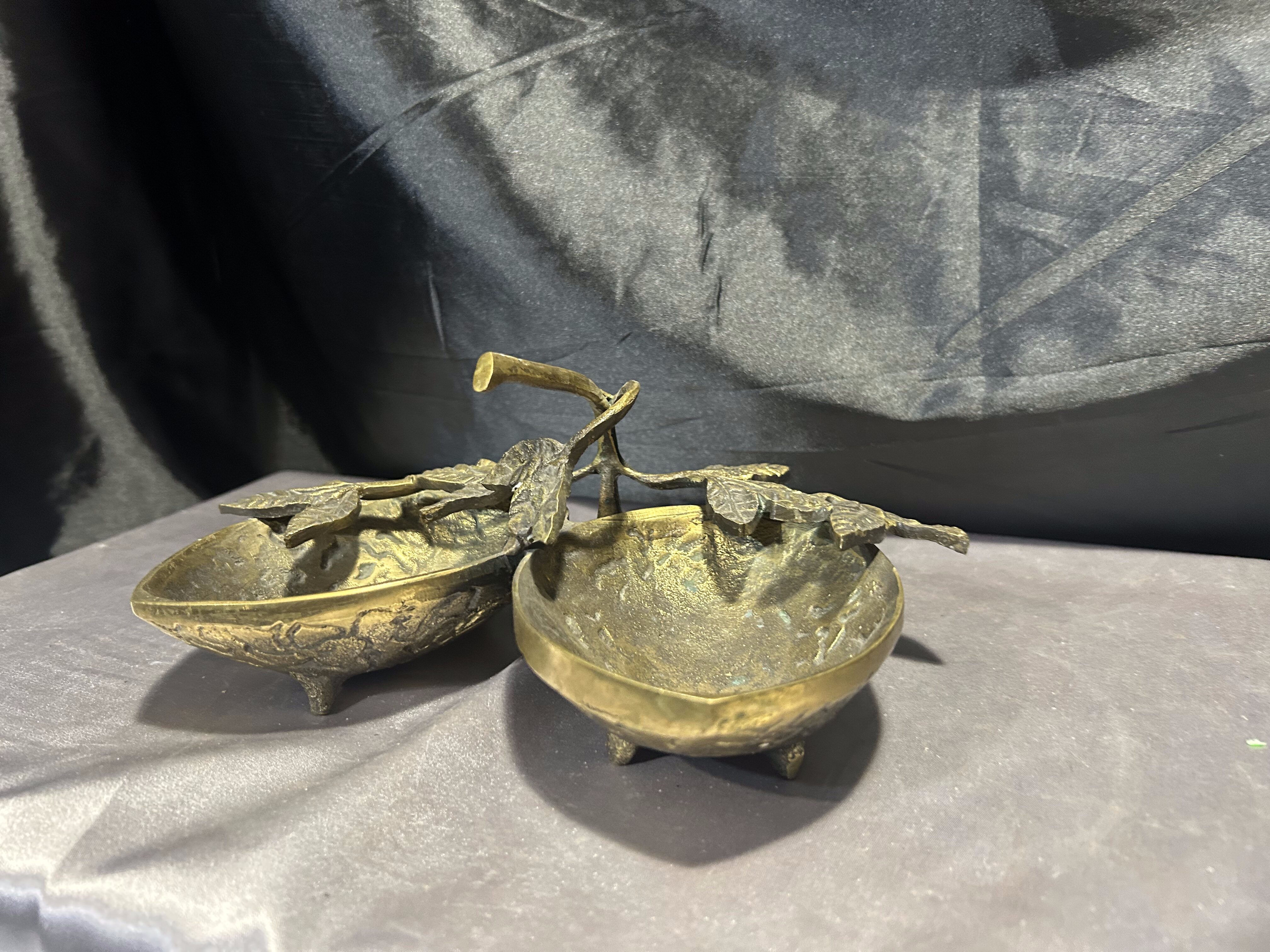Na sprzedaż unikatowa mosiężna misa patera, której forma nawiązuje do dwóch skorupek orzecha włoskiego, połączonych ozdobnymi liśćmi. Starannie wykonana, pełna detali i o solidnej konstrukcji, stanowi niezwykłą ozdobę wnętrza, łącząc funkcjonalność z eleganckim wyglądem.