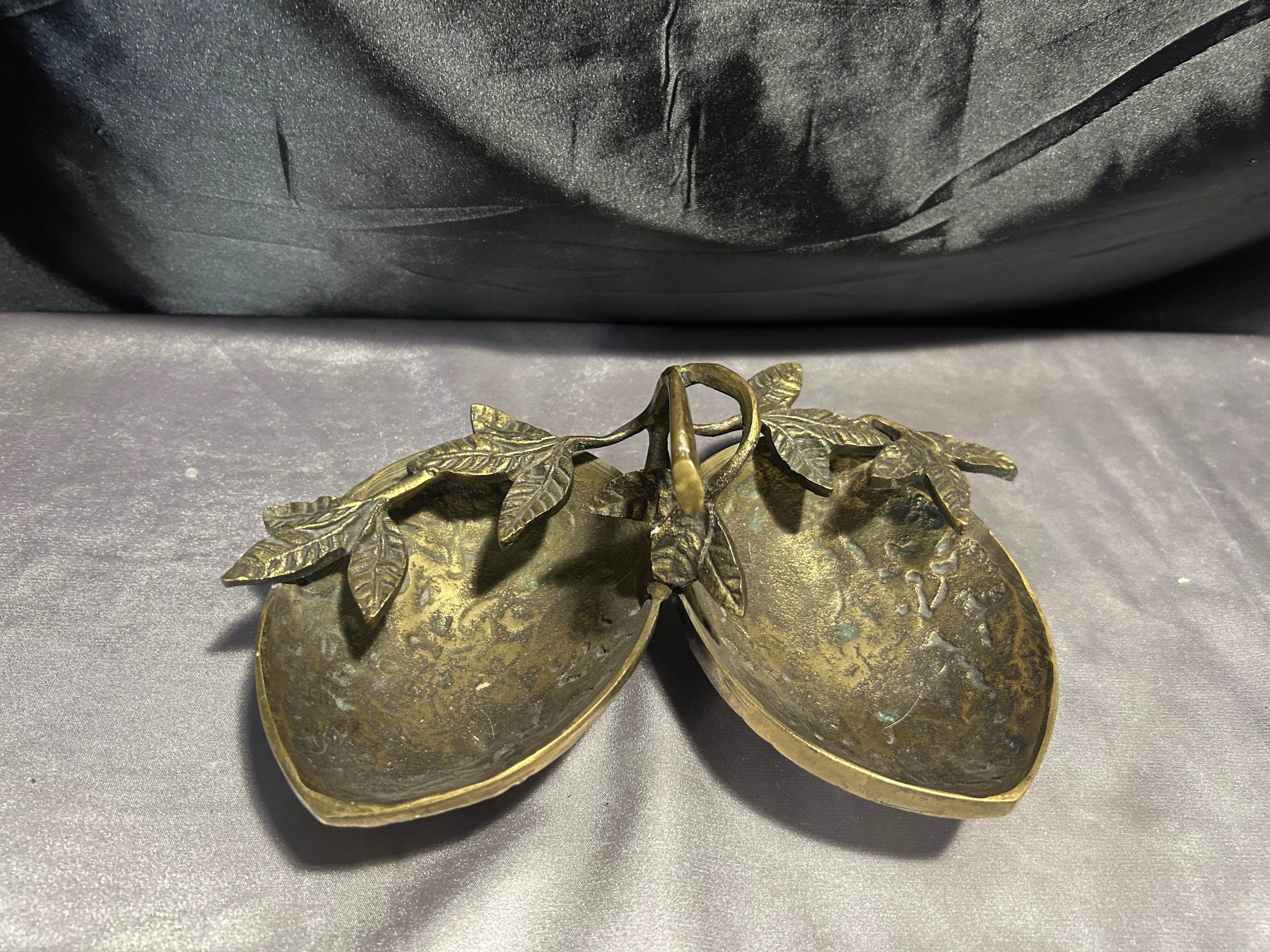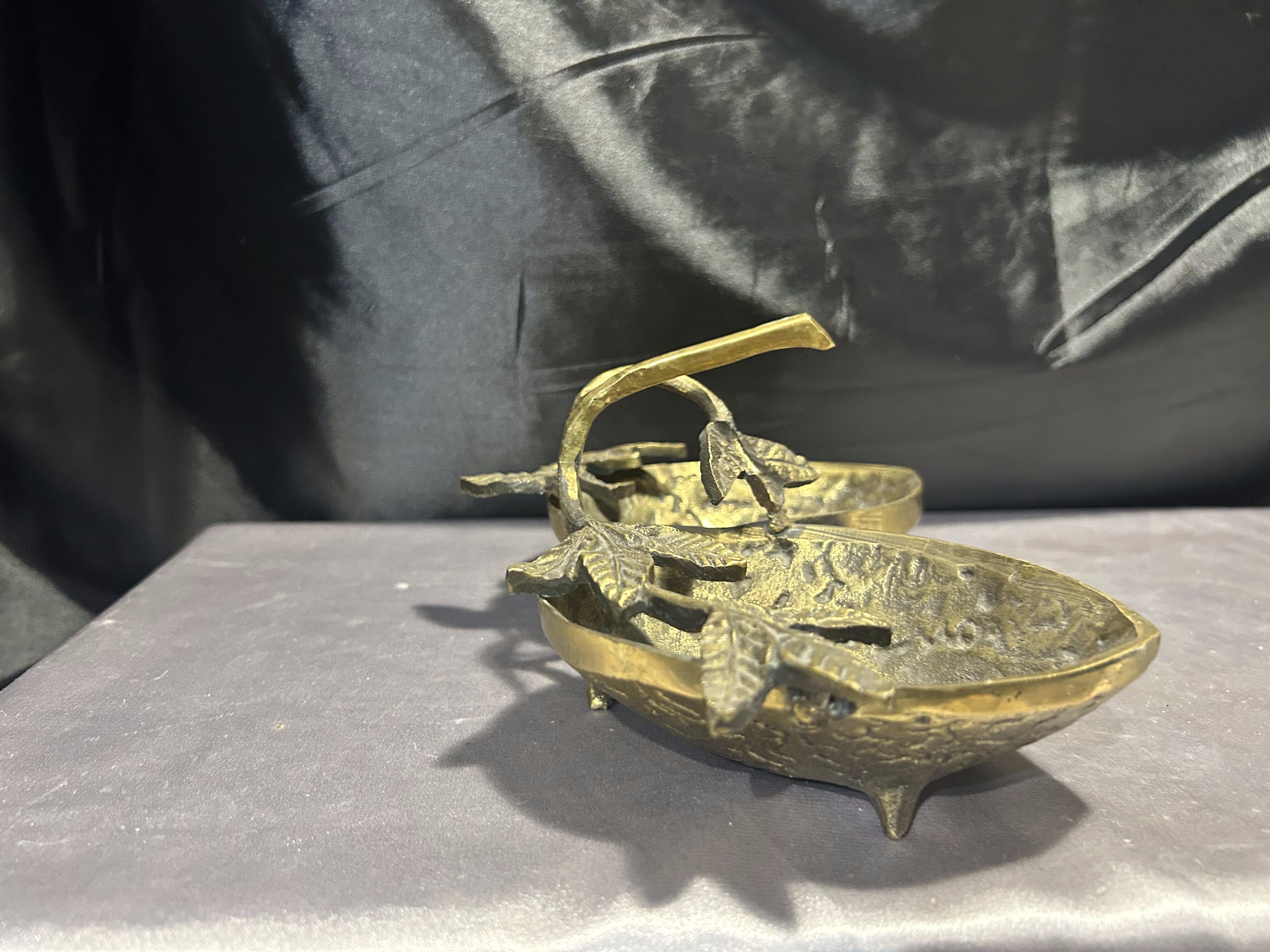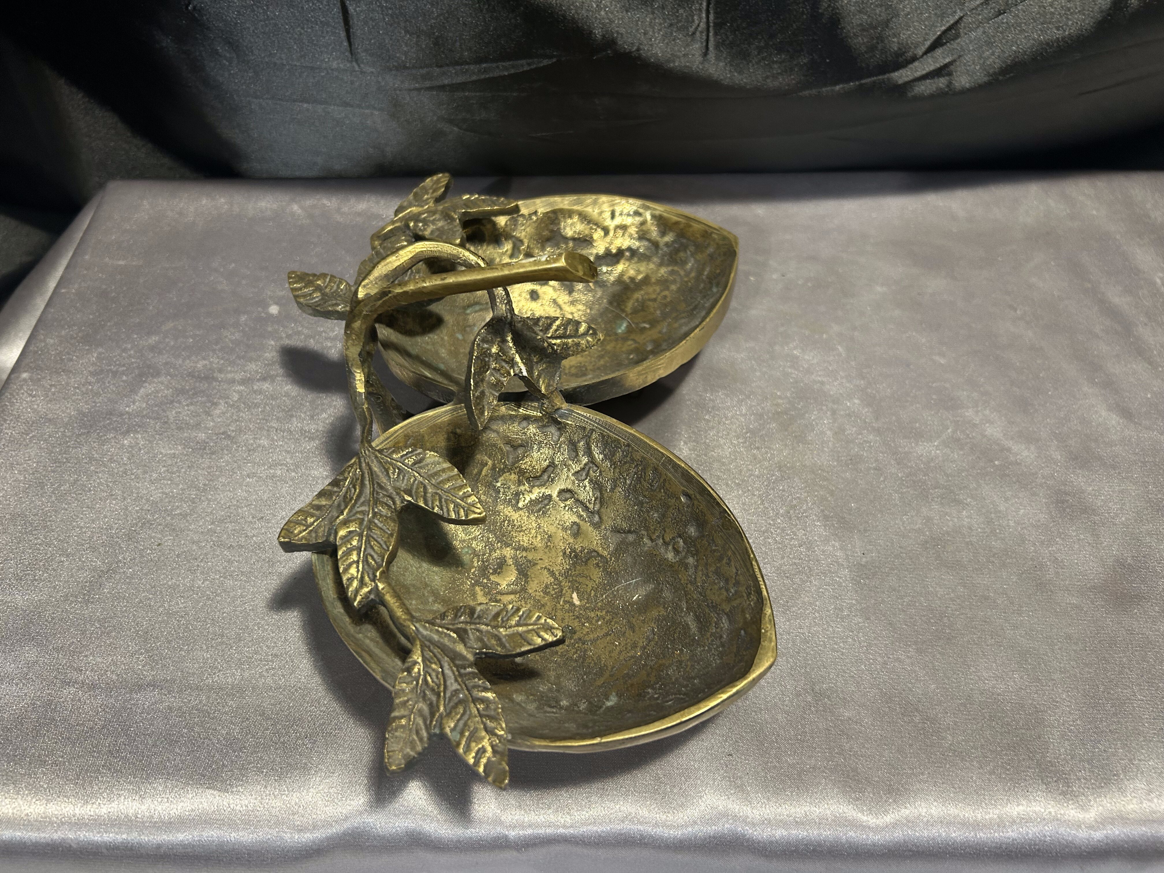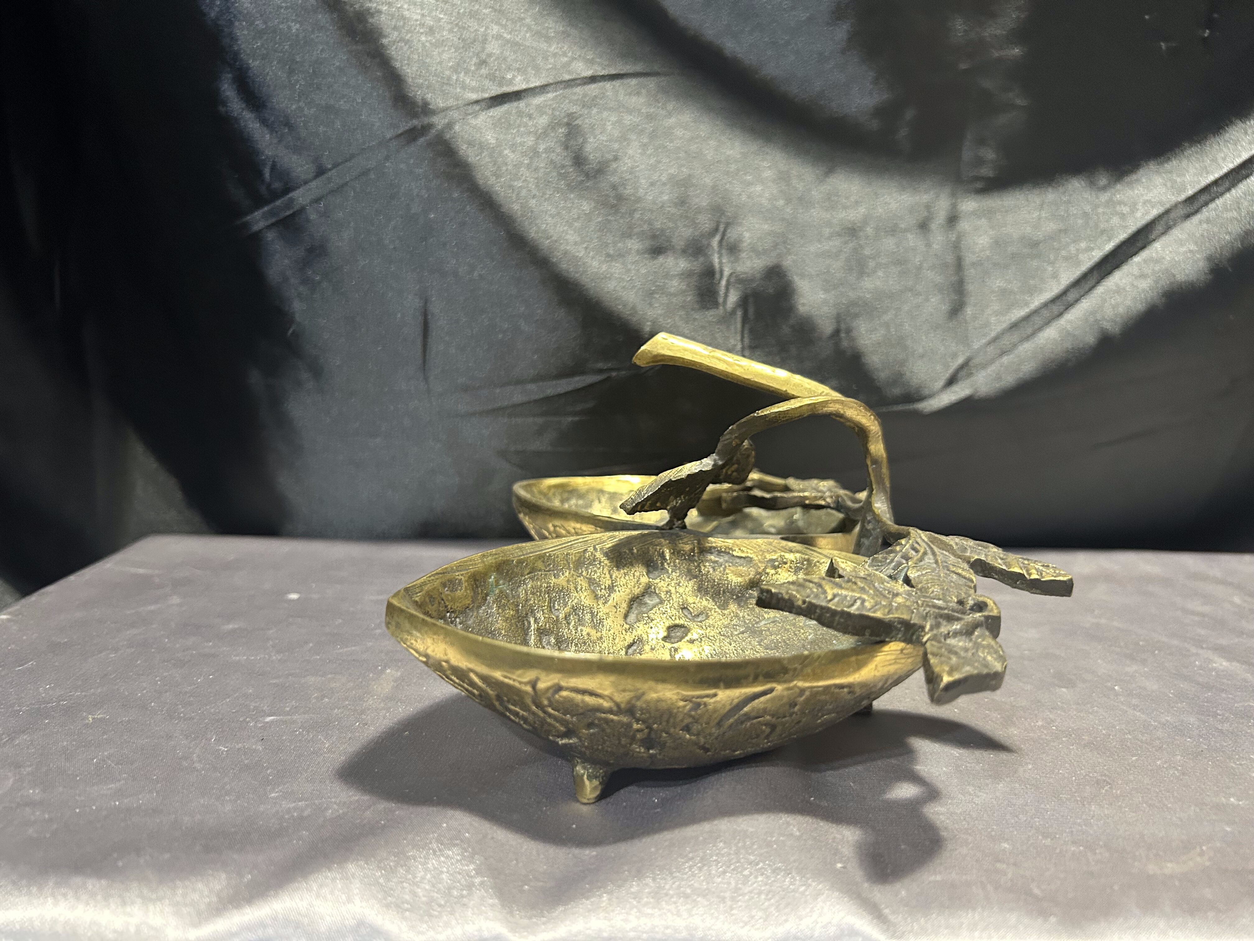 Na sprzedaż unikatowa mosiężna misa patera, której forma nawiązuje do dwóch skorupek orzecha włoskiego, połączonych ozdobnymi liśćmi. Starannie wykonana, pełna detali i o solidnej konstrukcji, stanowi niezwykłą ozdobę wnętrza, łącząc funkcjonalność z eleganckim wyglądem.