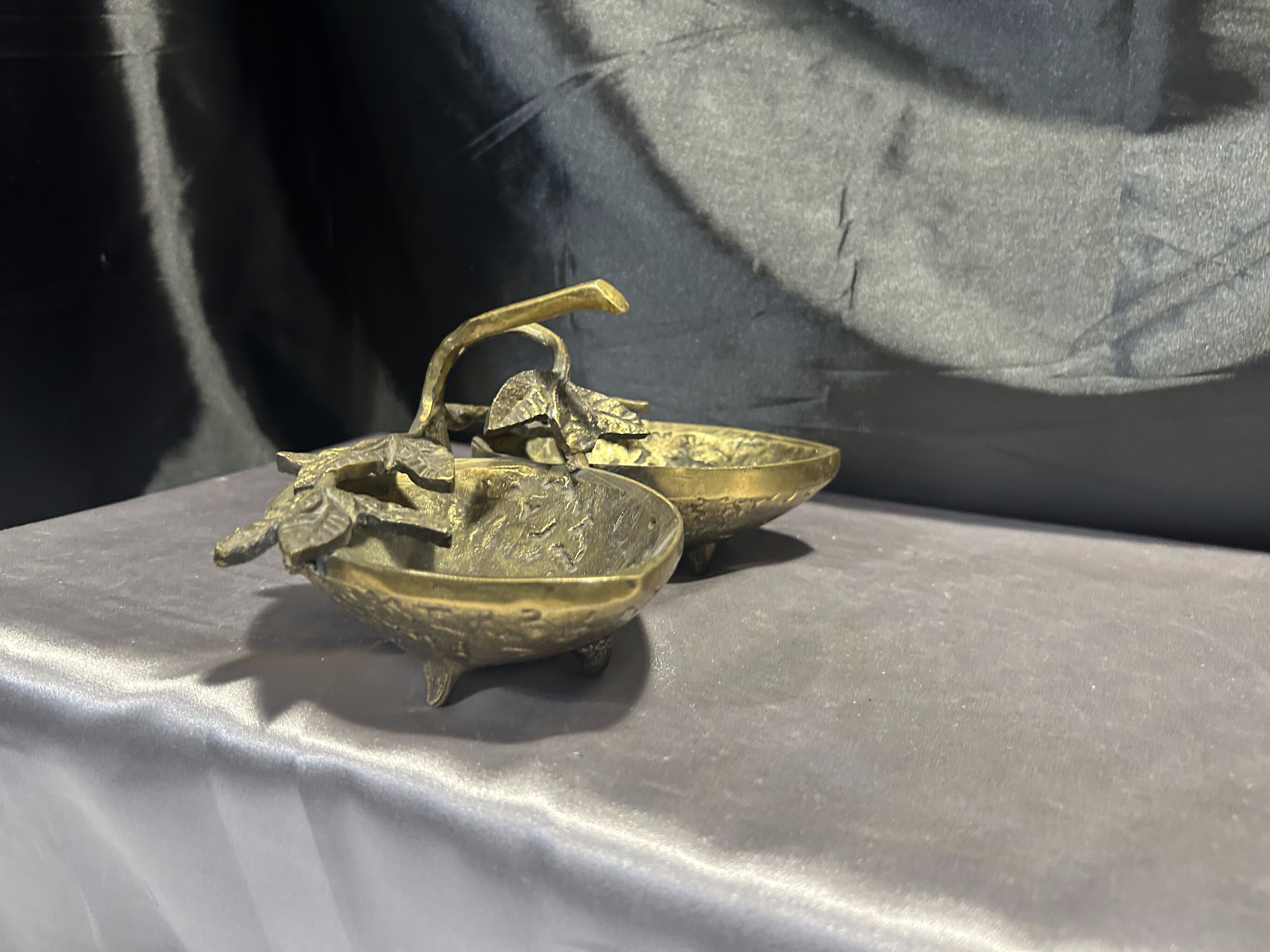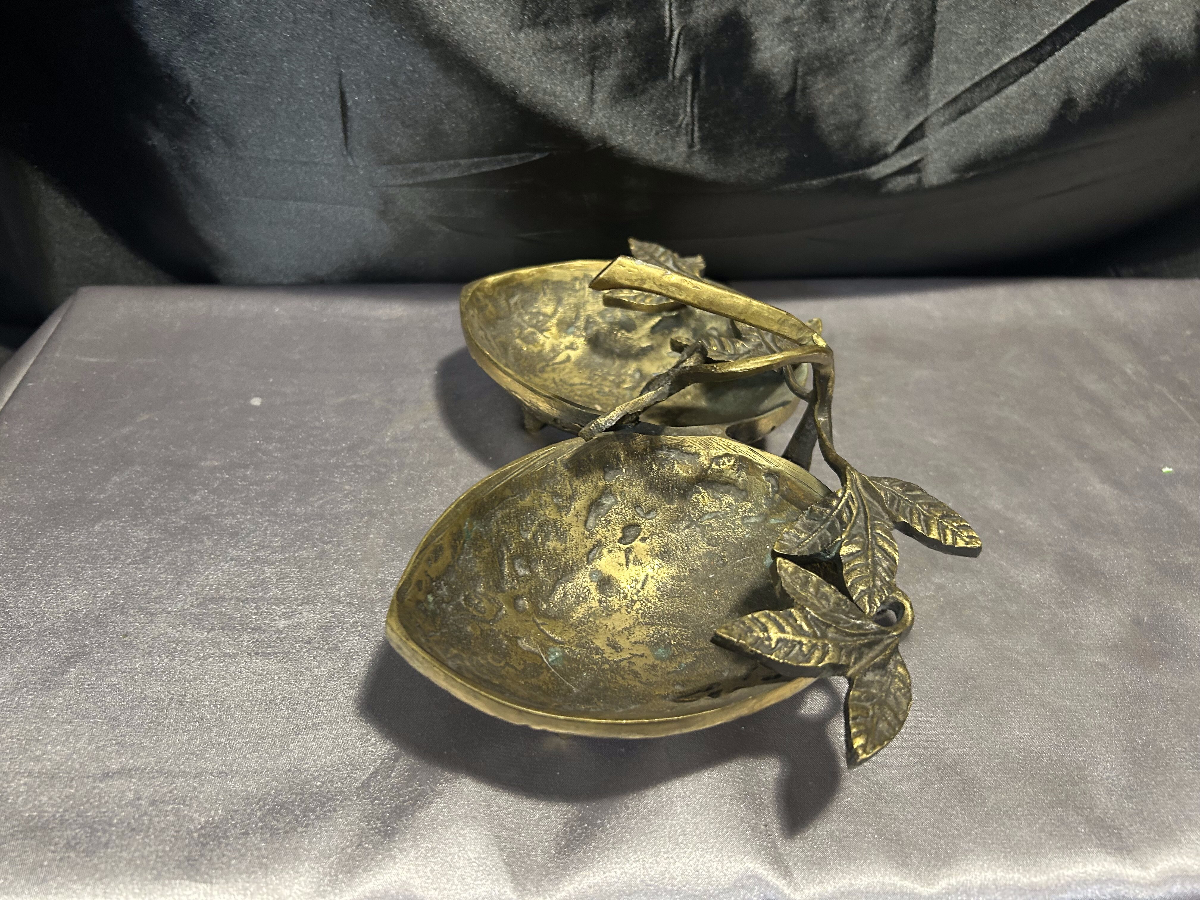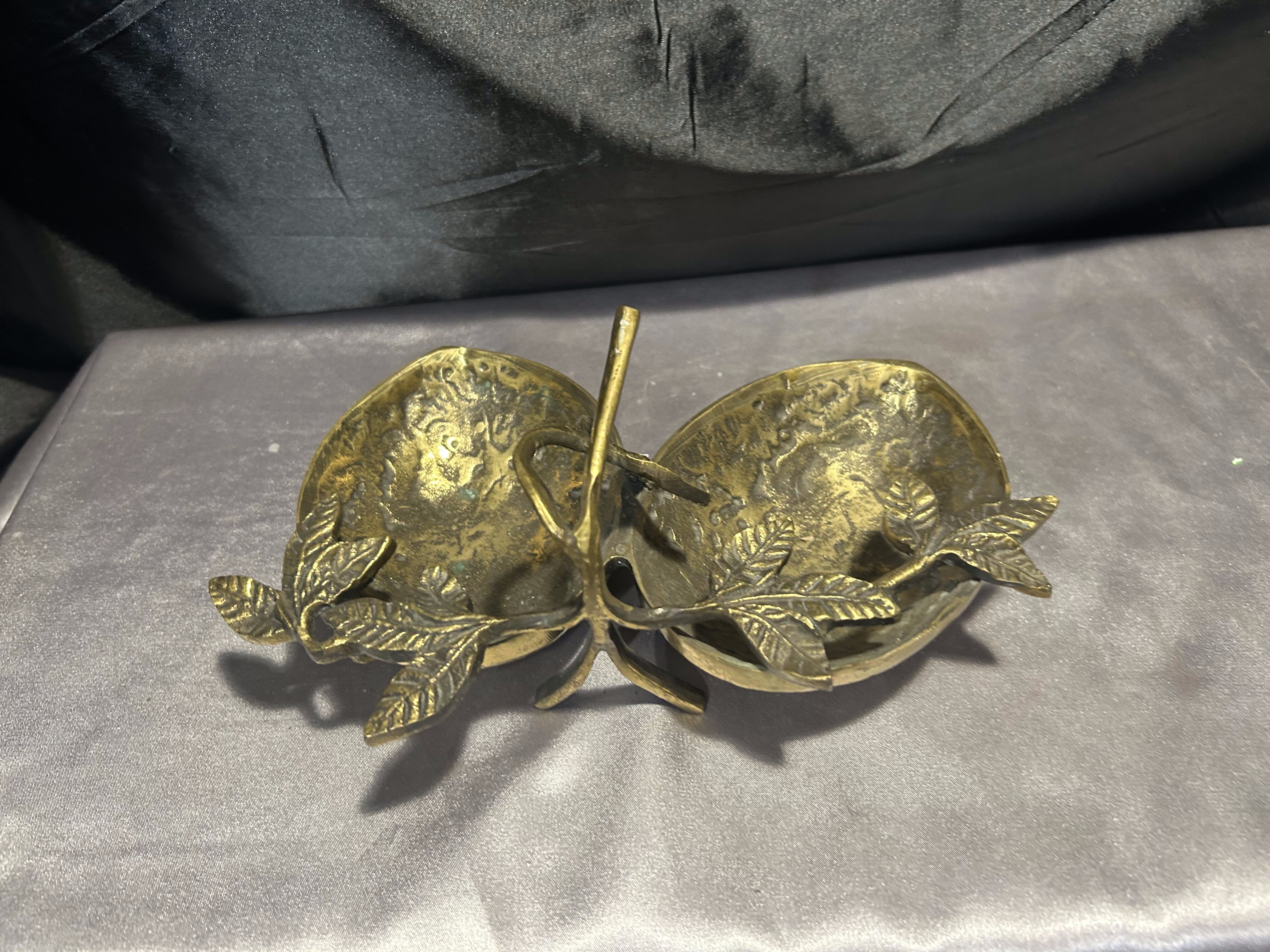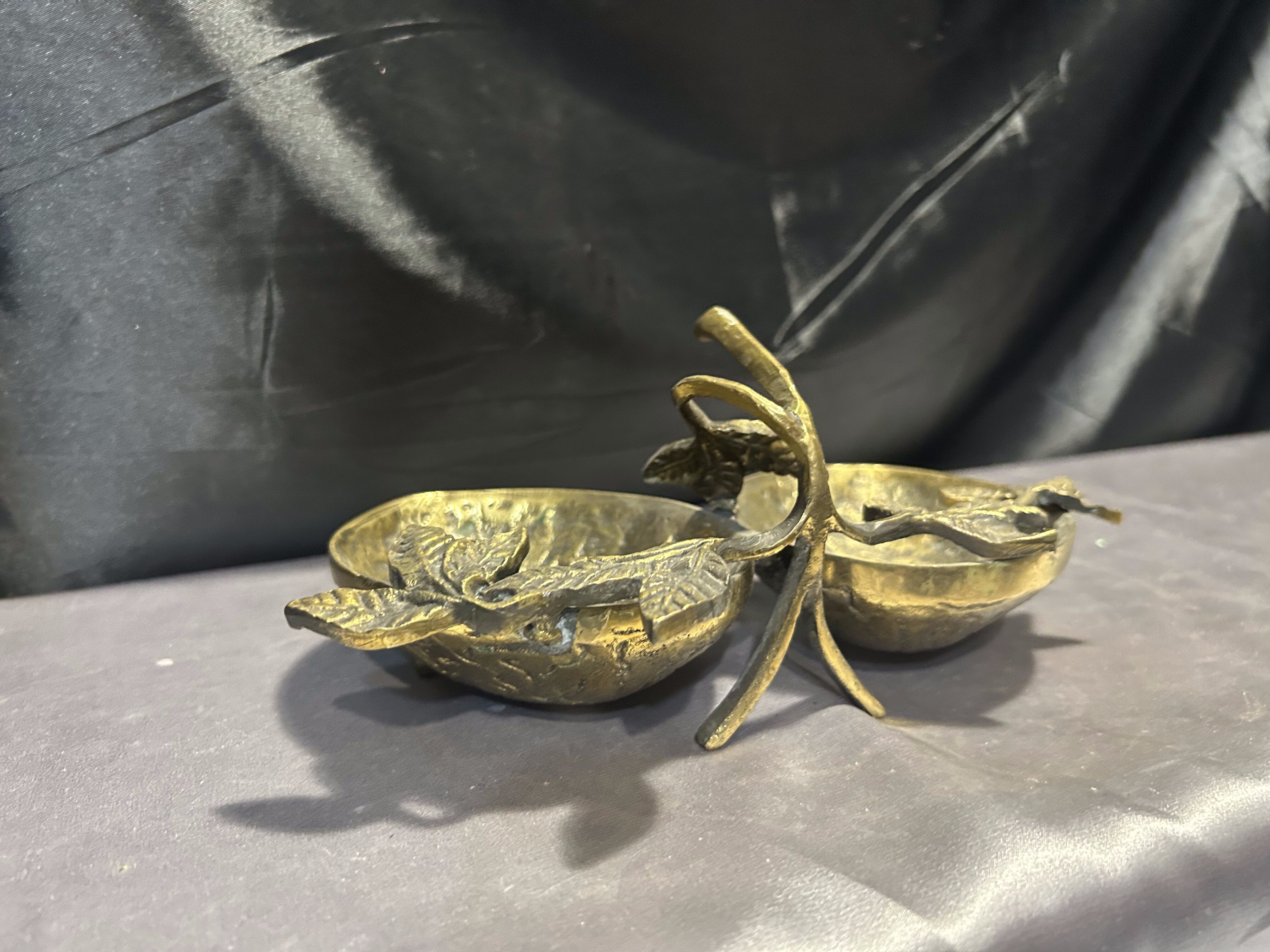 Na sprzedaż unikatowa mosiężna misa patera, której forma nawiązuje do dwóch skorupek orzecha włoskiego, połączonych ozdobnymi liśćmi. Starannie wykonana, pełna detali i o solidnej konstrukcji, stanowi niezwykłą ozdobę wnętrza, łącząc funkcjonalność z eleganckim wyglądem.
