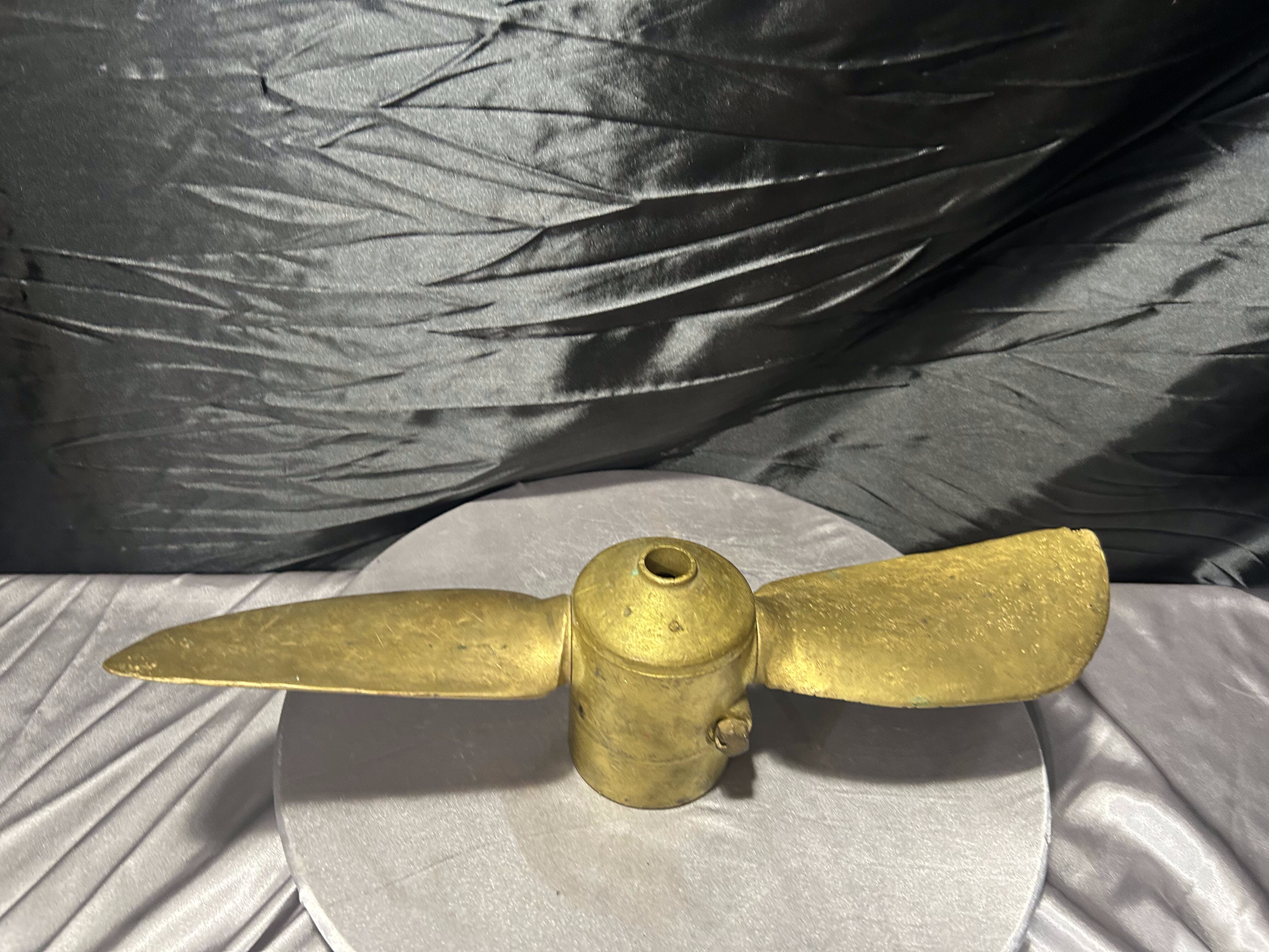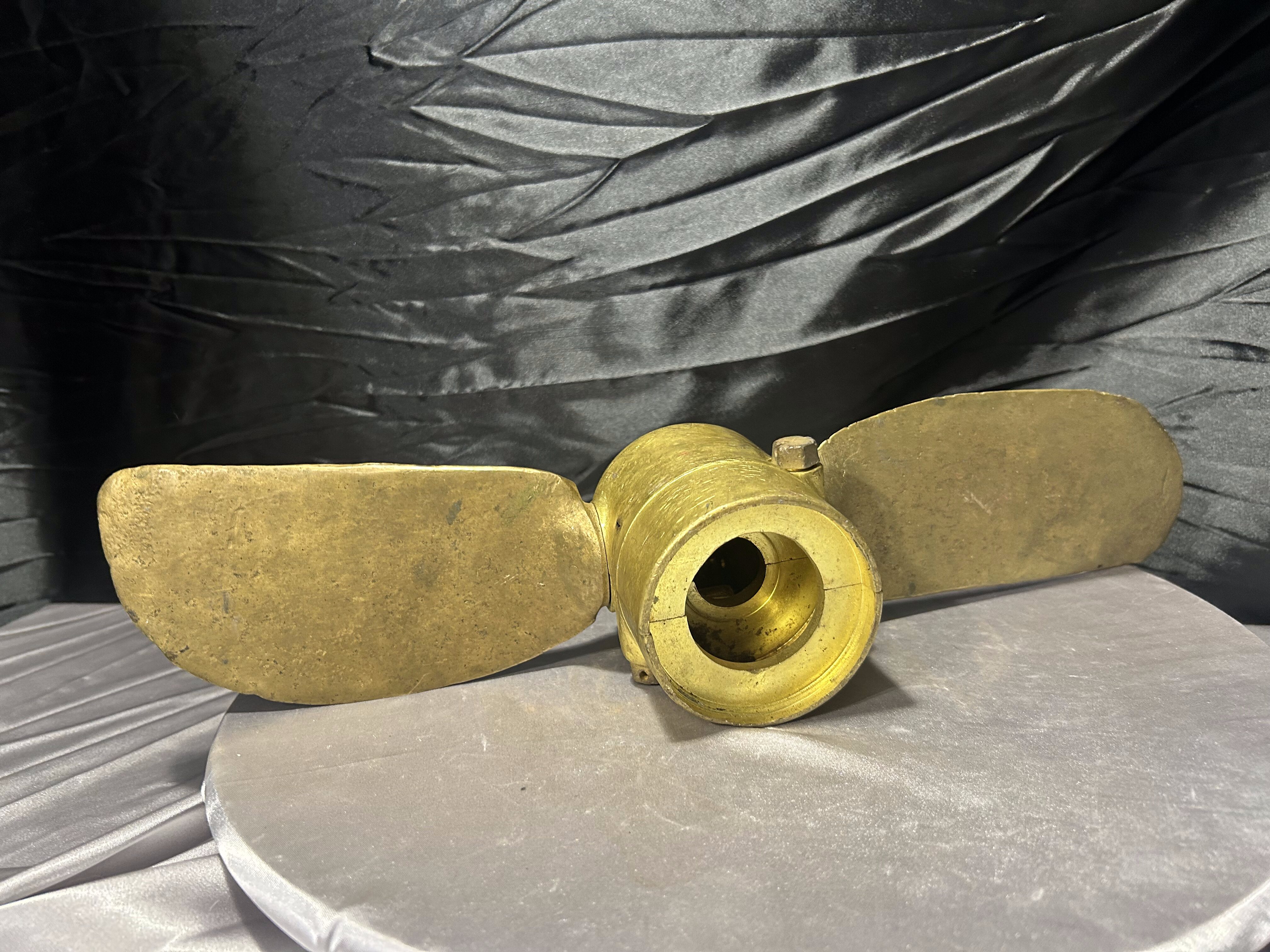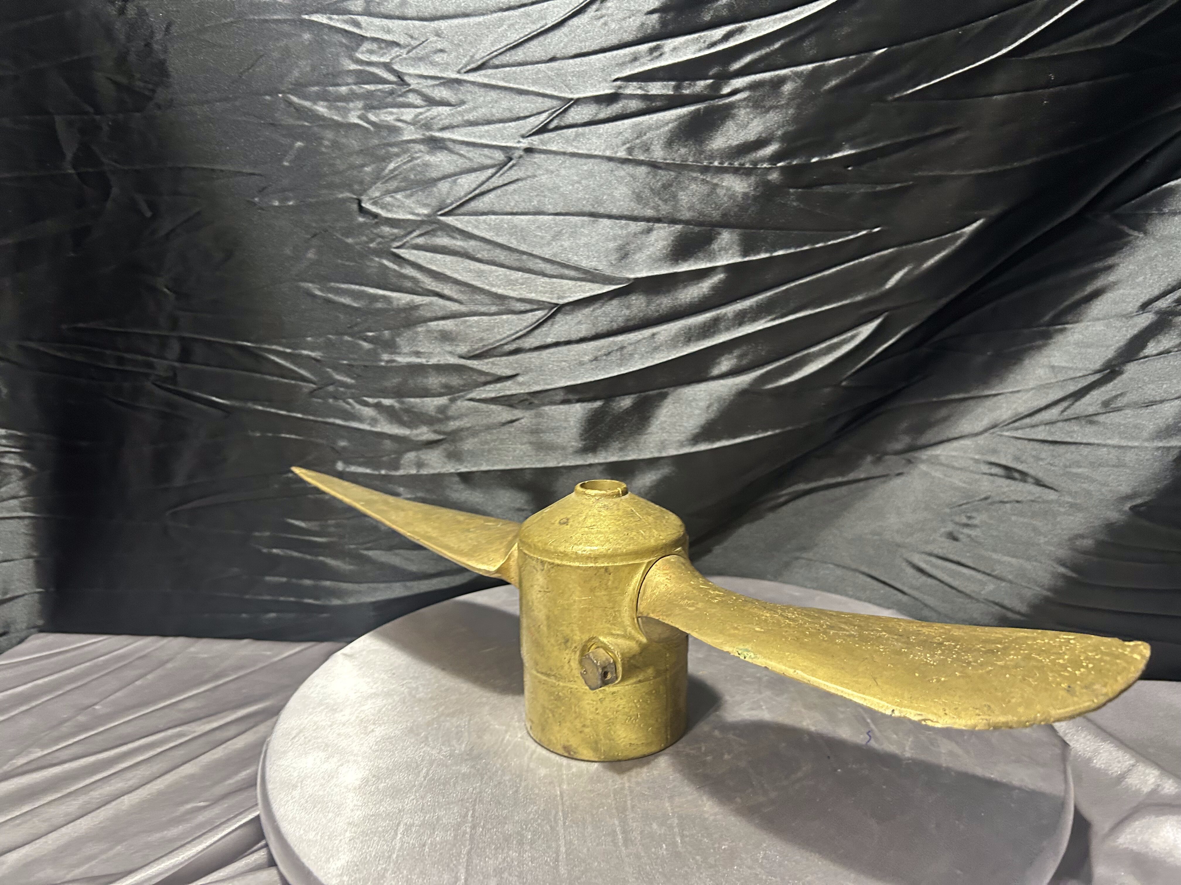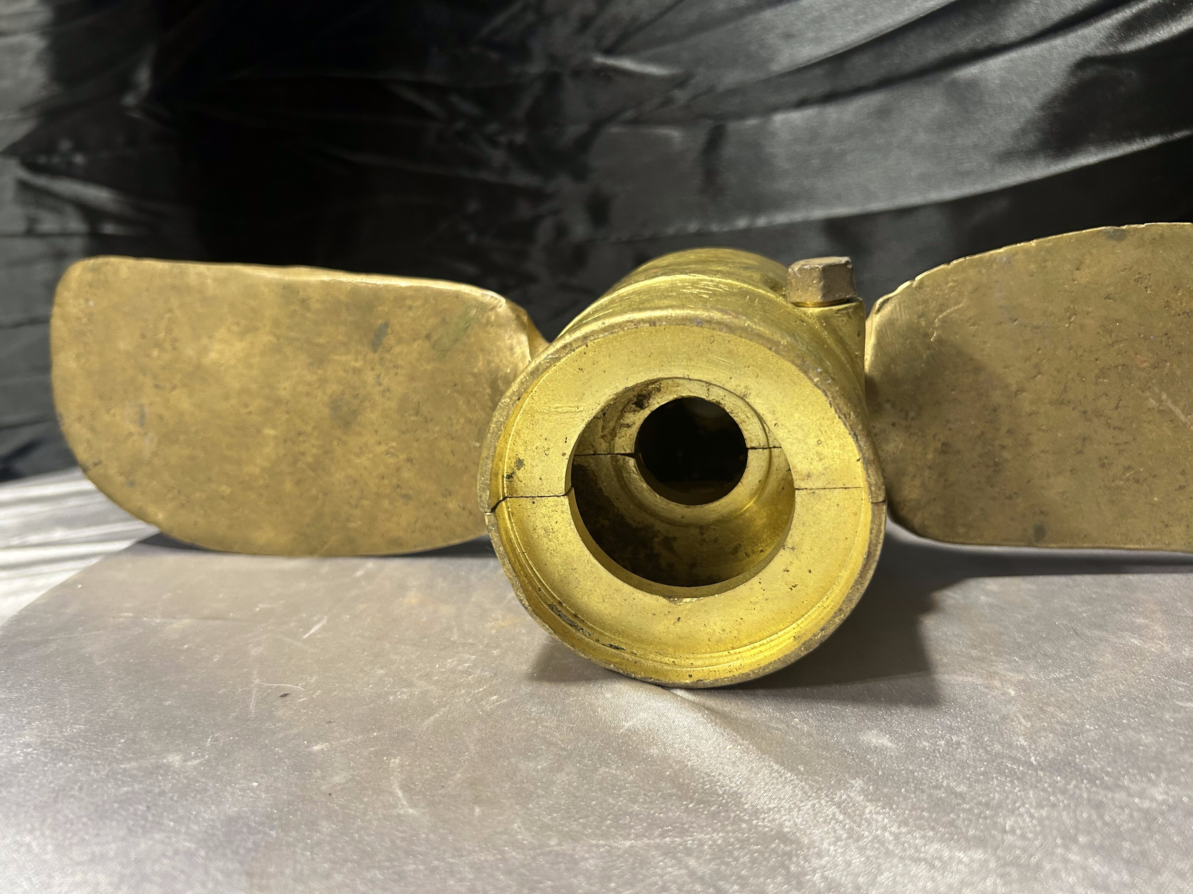 Masywna śruba okrętowa wykonana z litego mosiądzu, o klasycznej, dwupłatowej formie. Śruba posiada dwie solidne łopaty oraz piastę z widoczną śrubą dociskową, charakterystyczną dla oryginalnych elementów technicznych stosowanych w jednostkach pływających. To autentyczny, ciężki element o wyraźnie marynistycznym charakterze, idealny jako dekoracja lub eksponat kolekcjonerski.