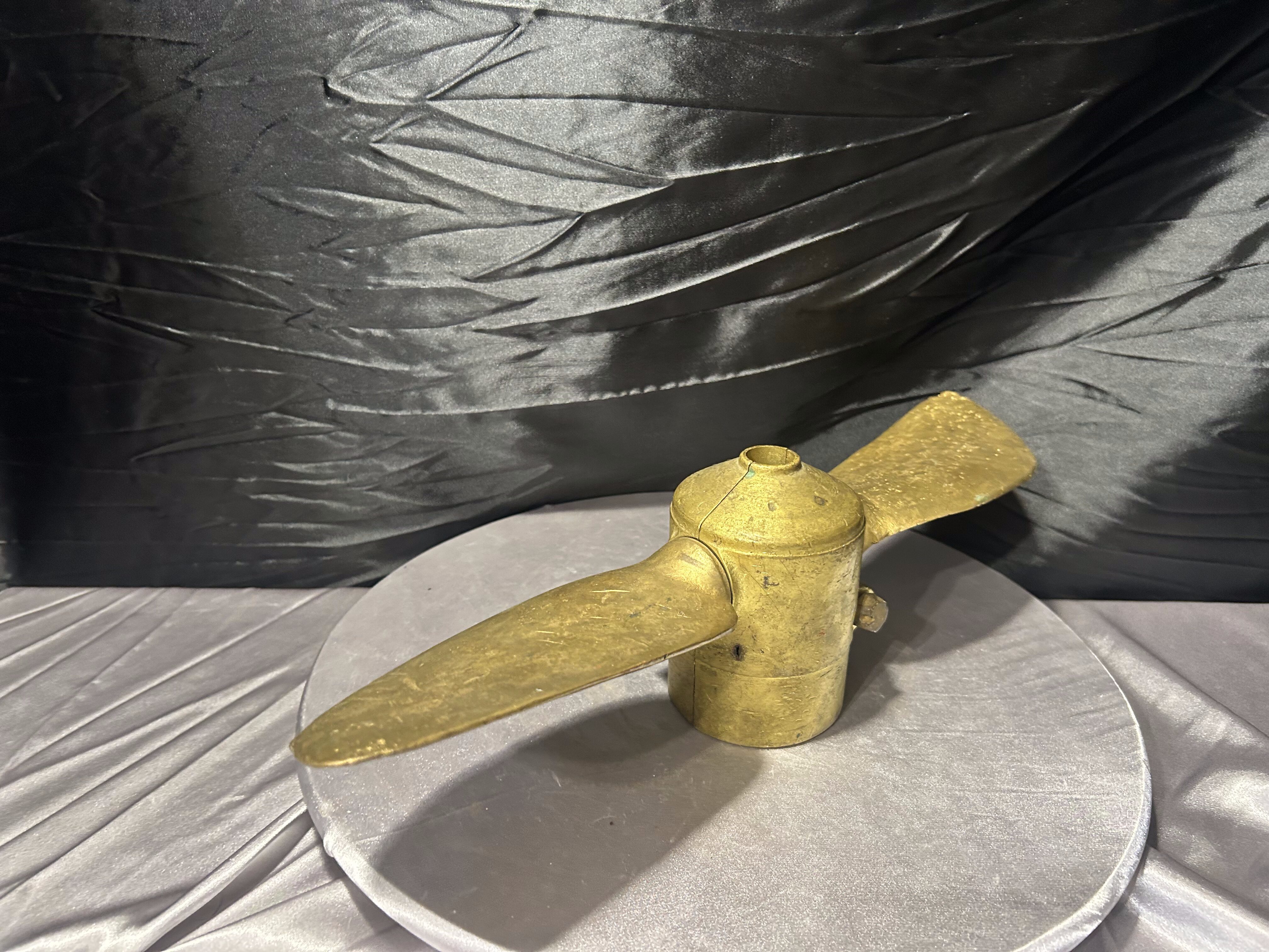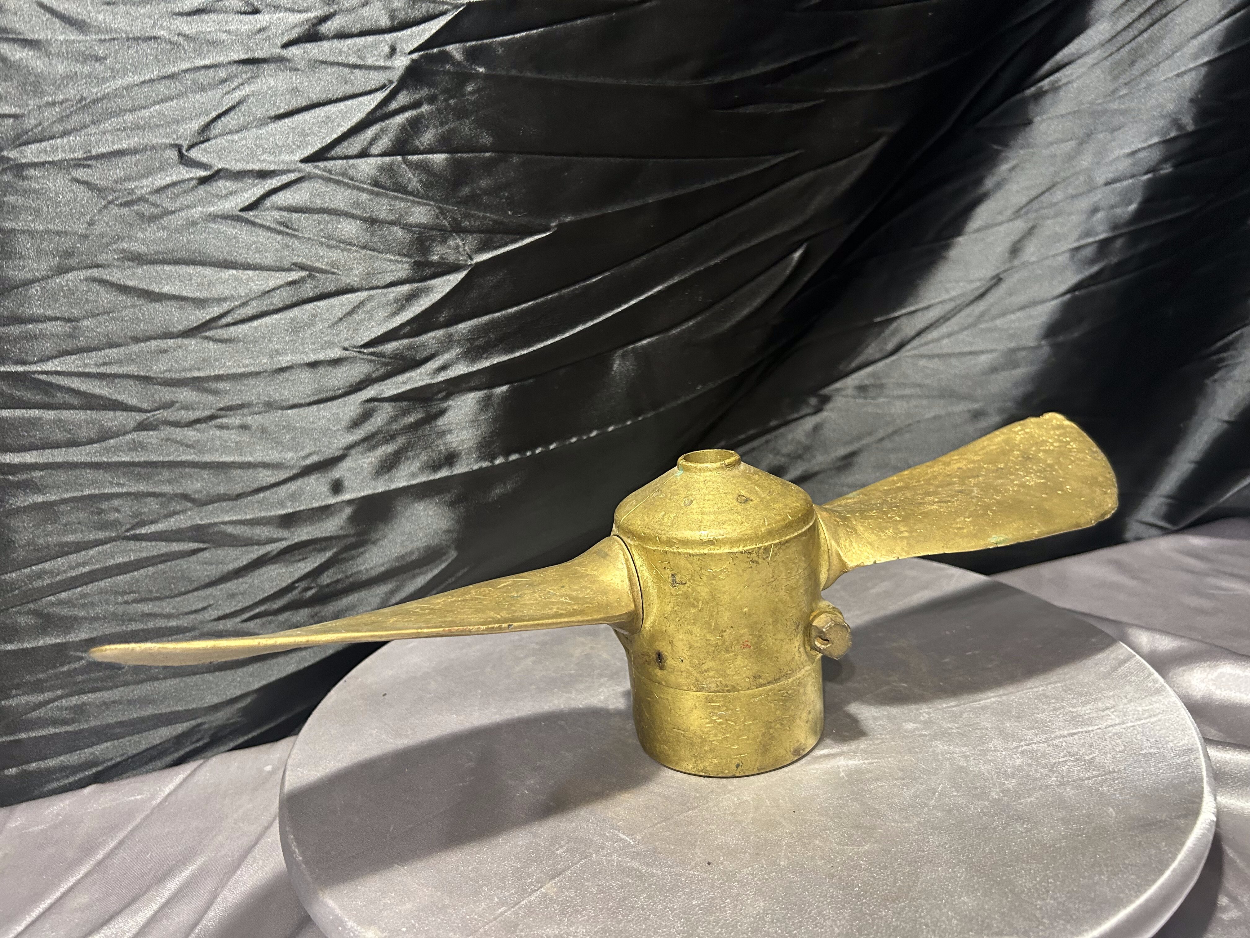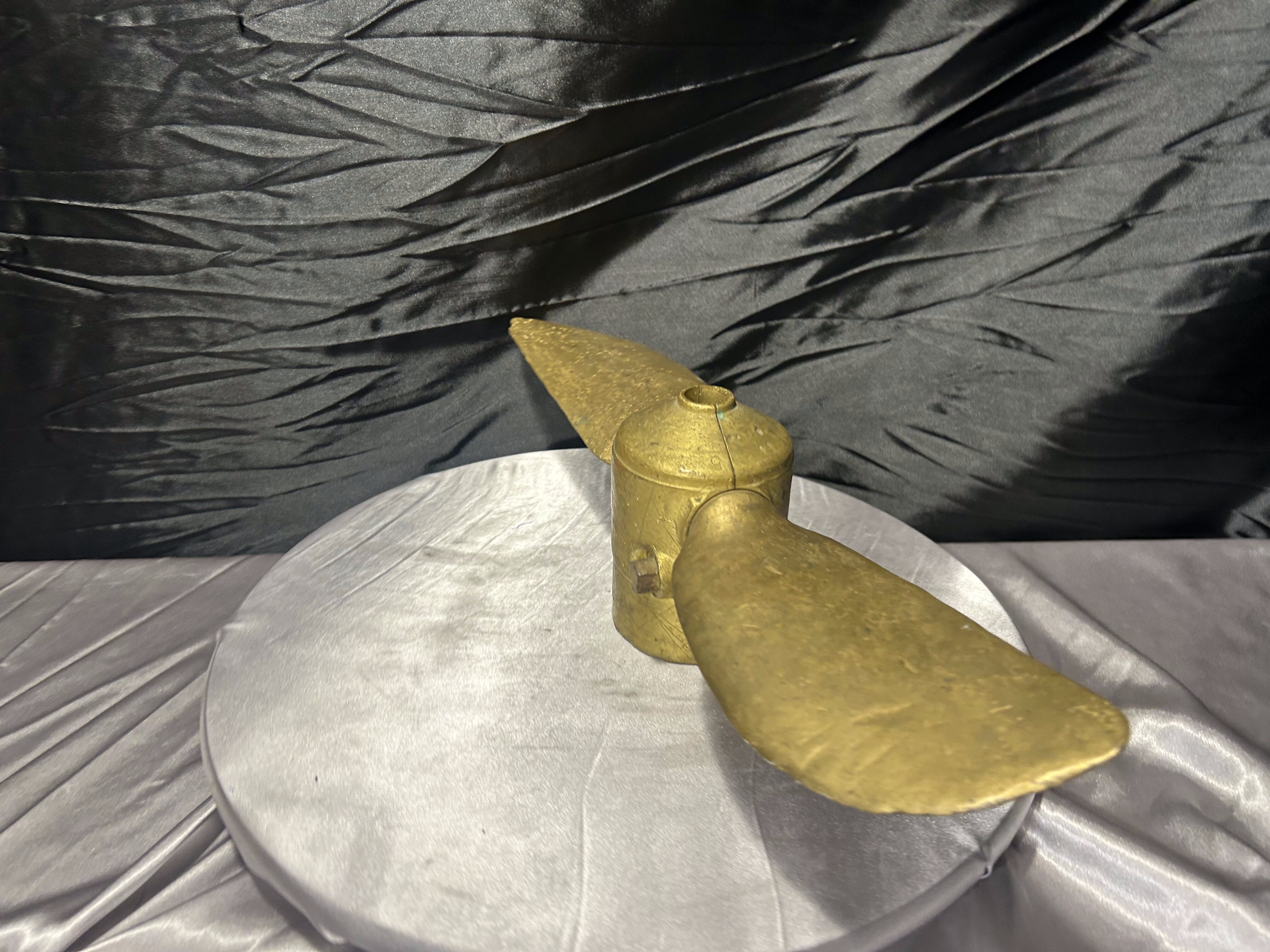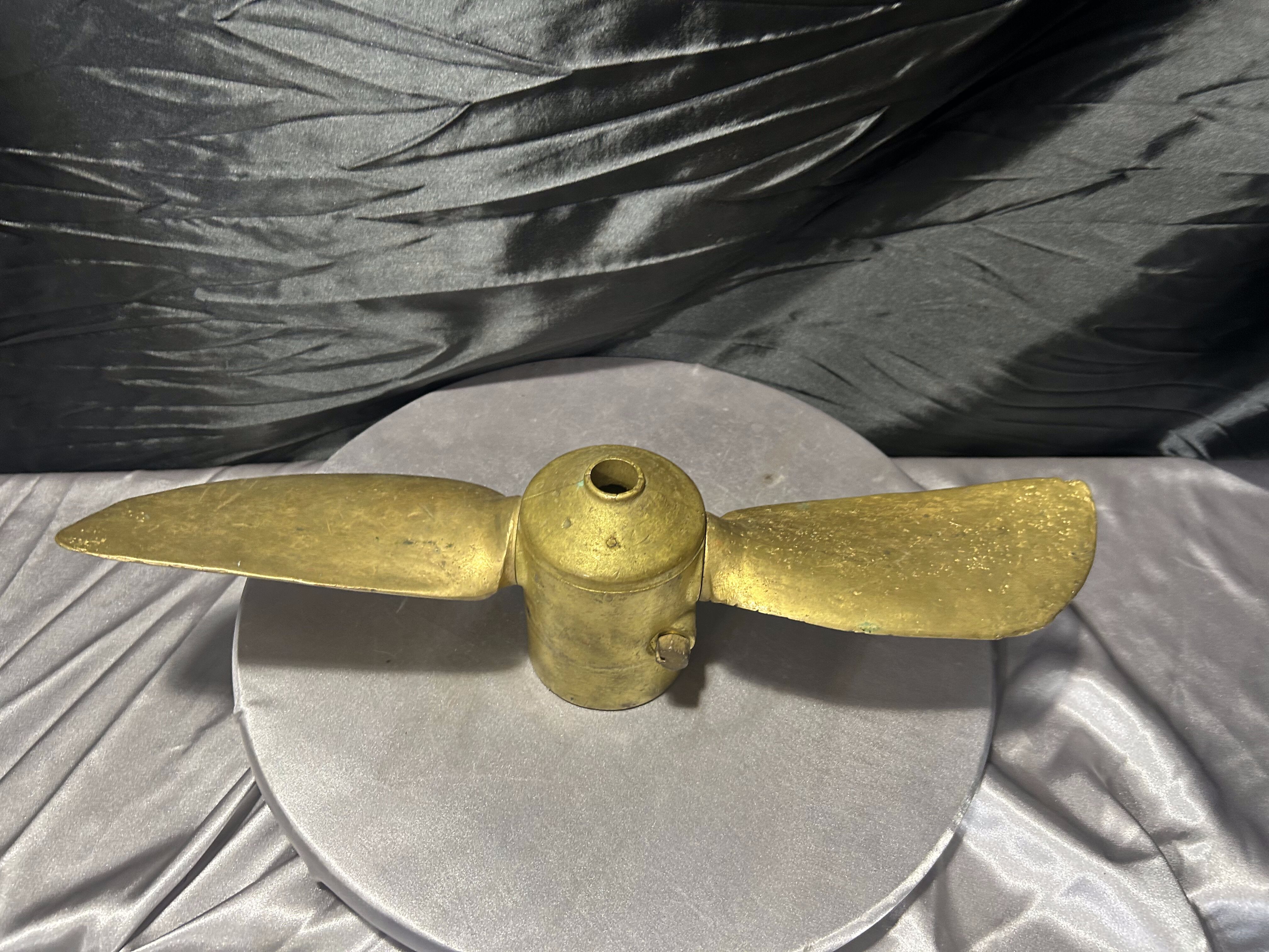 Masywna śruba okrętowa wykonana z litego mosiądzu, o klasycznej, dwupłatowej formie. Śruba posiada dwie solidne łopaty oraz piastę z widoczną śrubą dociskową, charakterystyczną dla oryginalnych elementów technicznych stosowanych w jednostkach pływających. To autentyczny, ciężki element o wyraźnie marynistycznym charakterze, idealny jako dekoracja lub eksponat kolekcjonerski.
