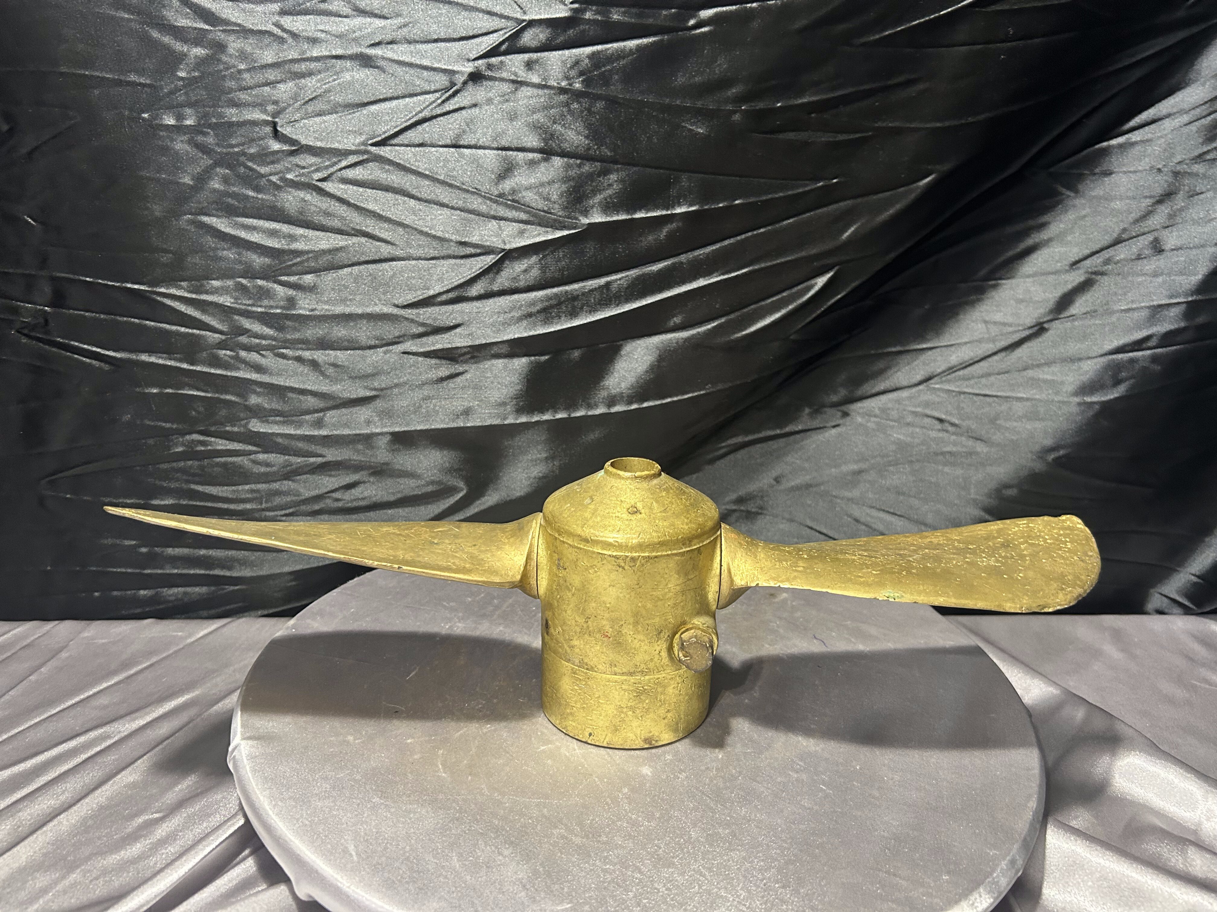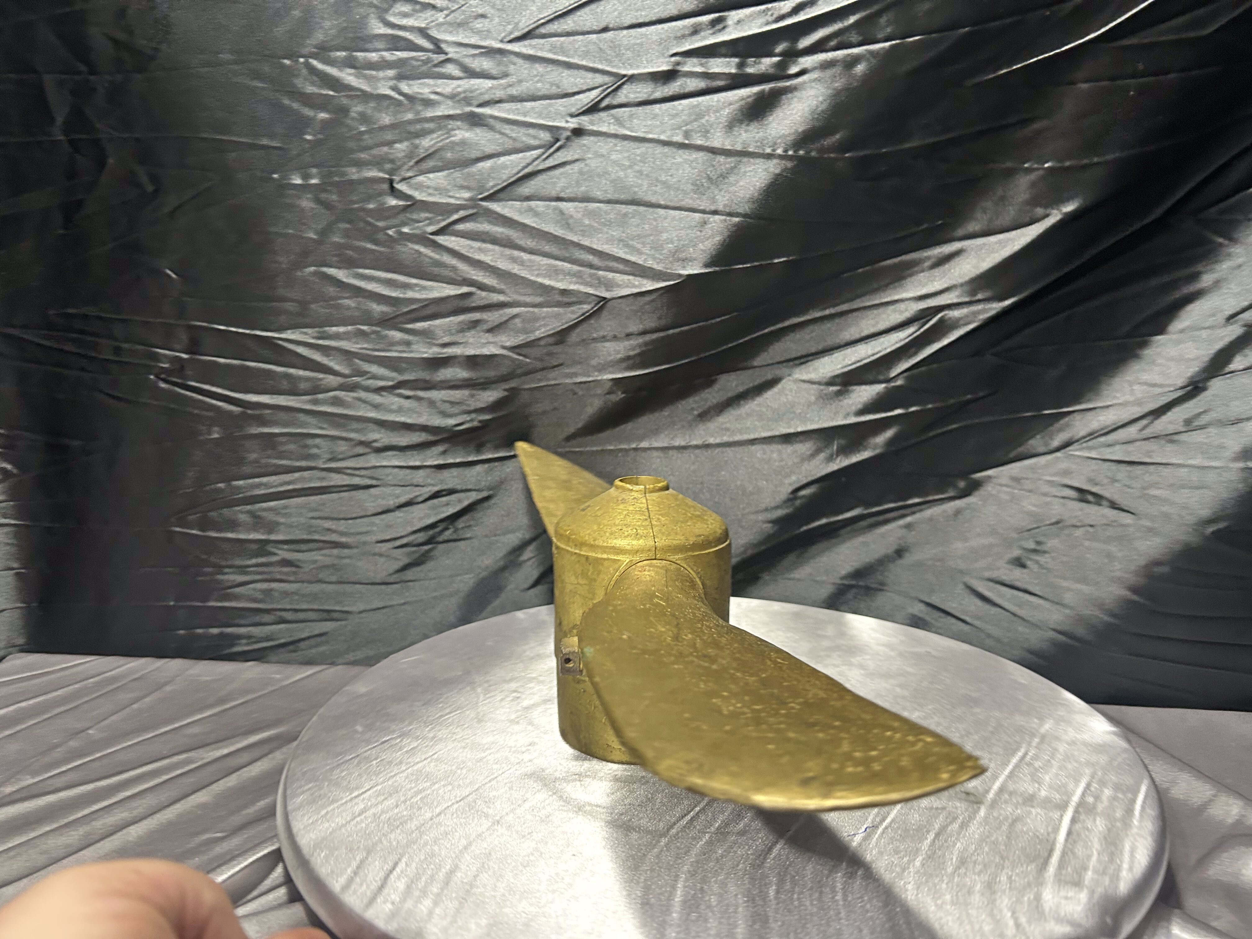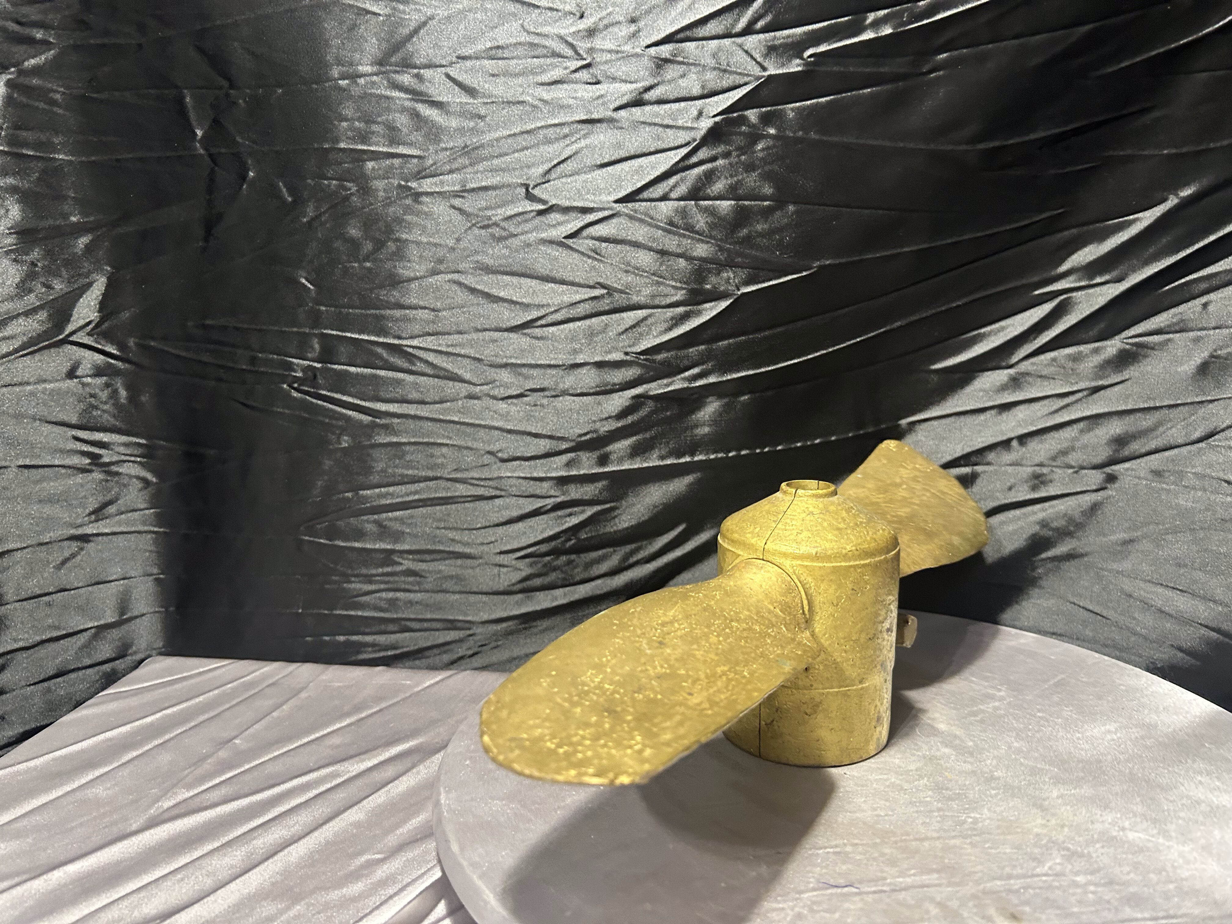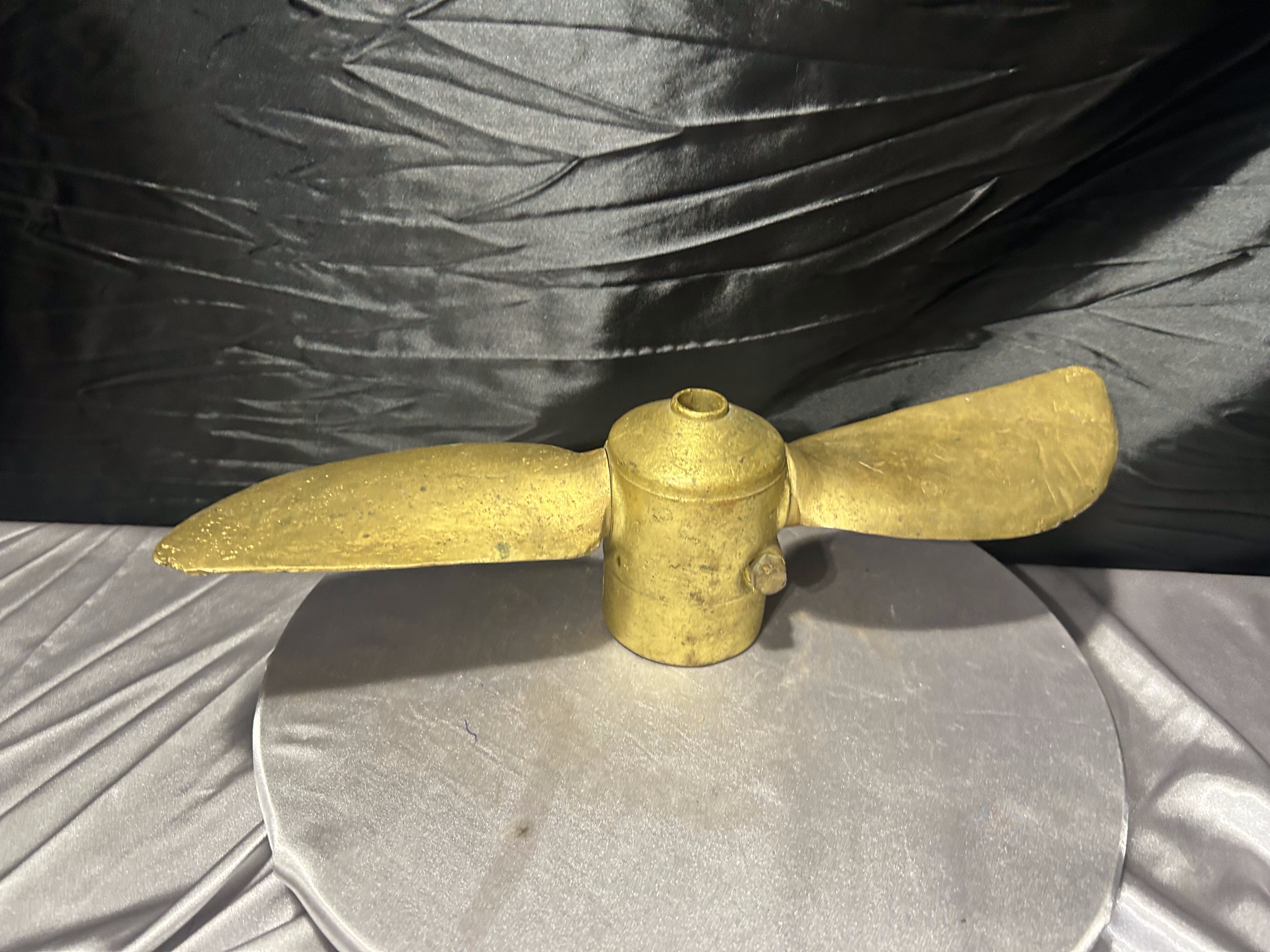 Masywna śruba okrętowa wykonana z litego mosiądzu, o klasycznej, dwupłatowej formie. Śruba posiada dwie solidne łopaty oraz piastę z widoczną śrubą dociskową, charakterystyczną dla oryginalnych elementów technicznych stosowanych w jednostkach pływających. To autentyczny, ciężki element o wyraźnie marynistycznym charakterze, idealny jako dekoracja lub eksponat kolekcjonerski.